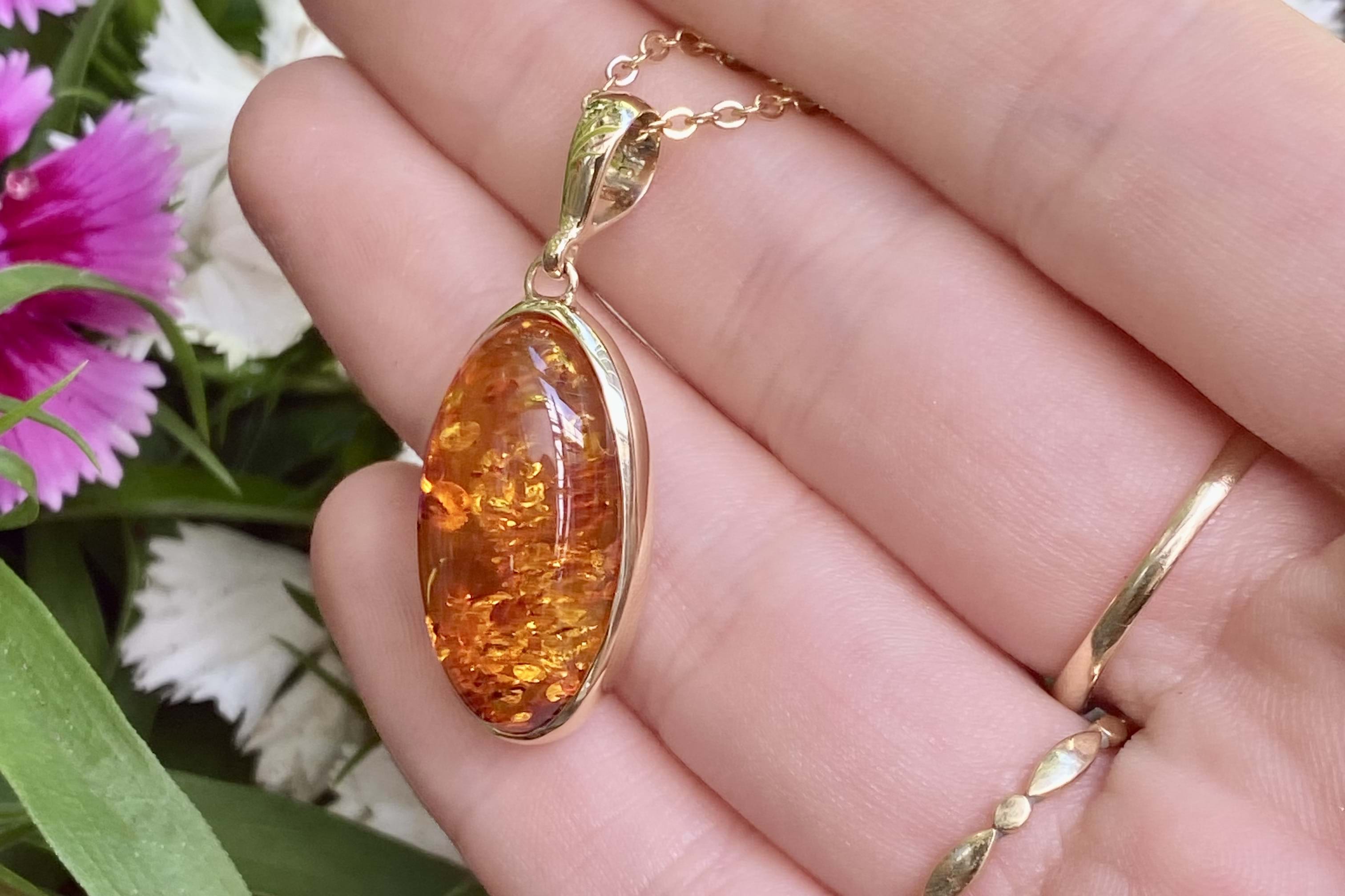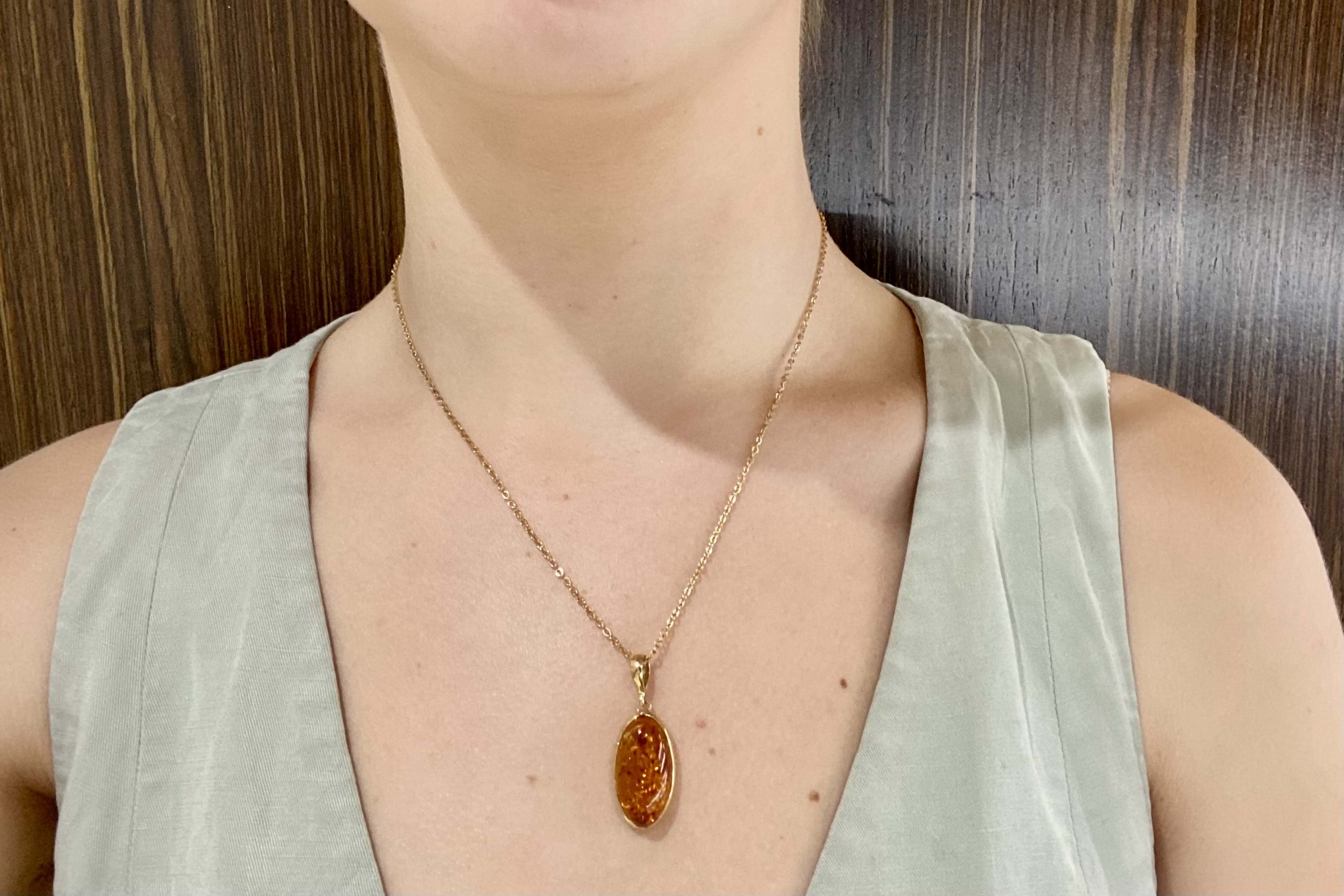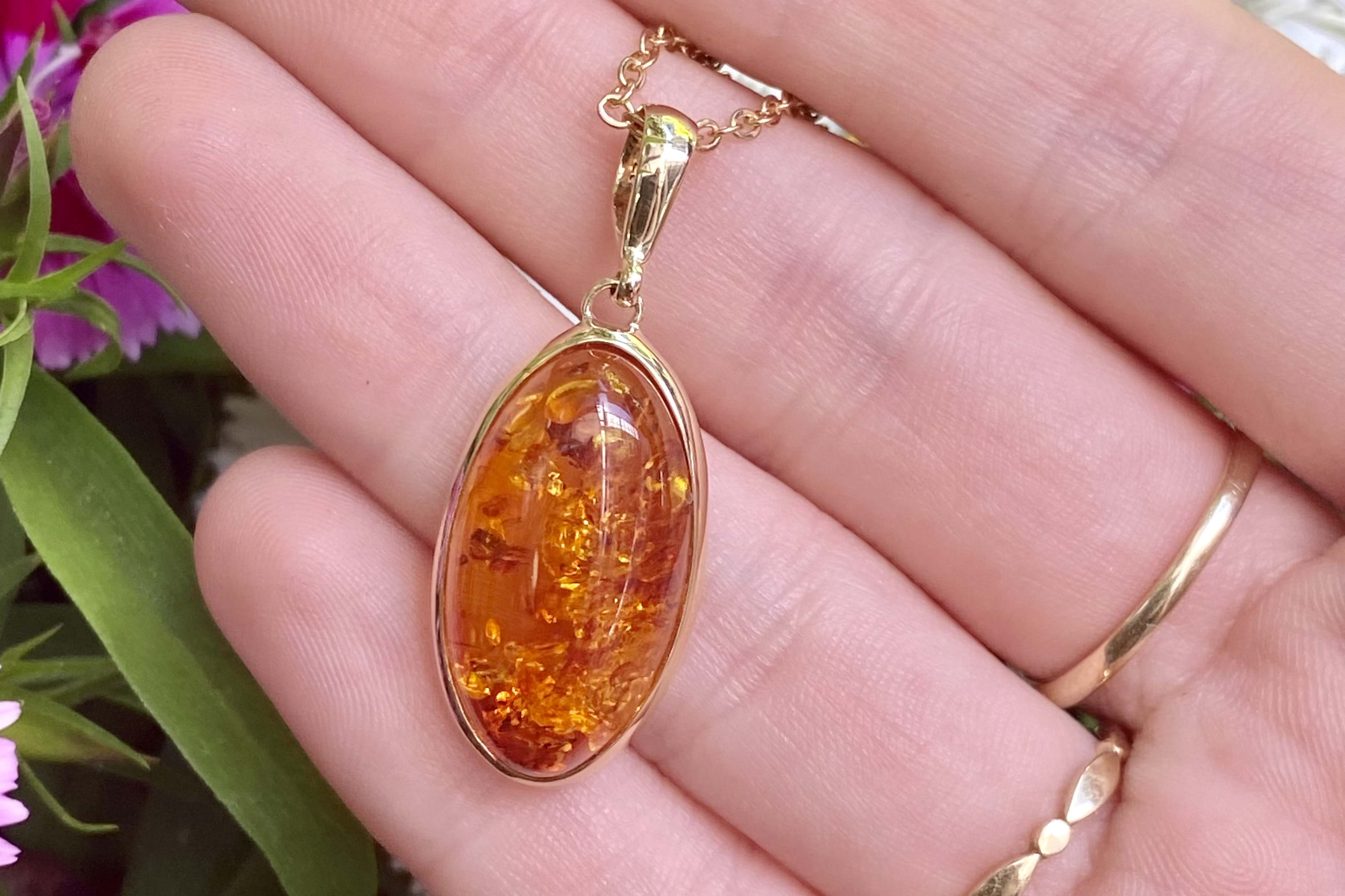 A stunning baltic amber pendant, set in 9ct yellow gold, measuring 23.6x13.6mm. Bezel set with a plain bale. Chains available for separate purchase.