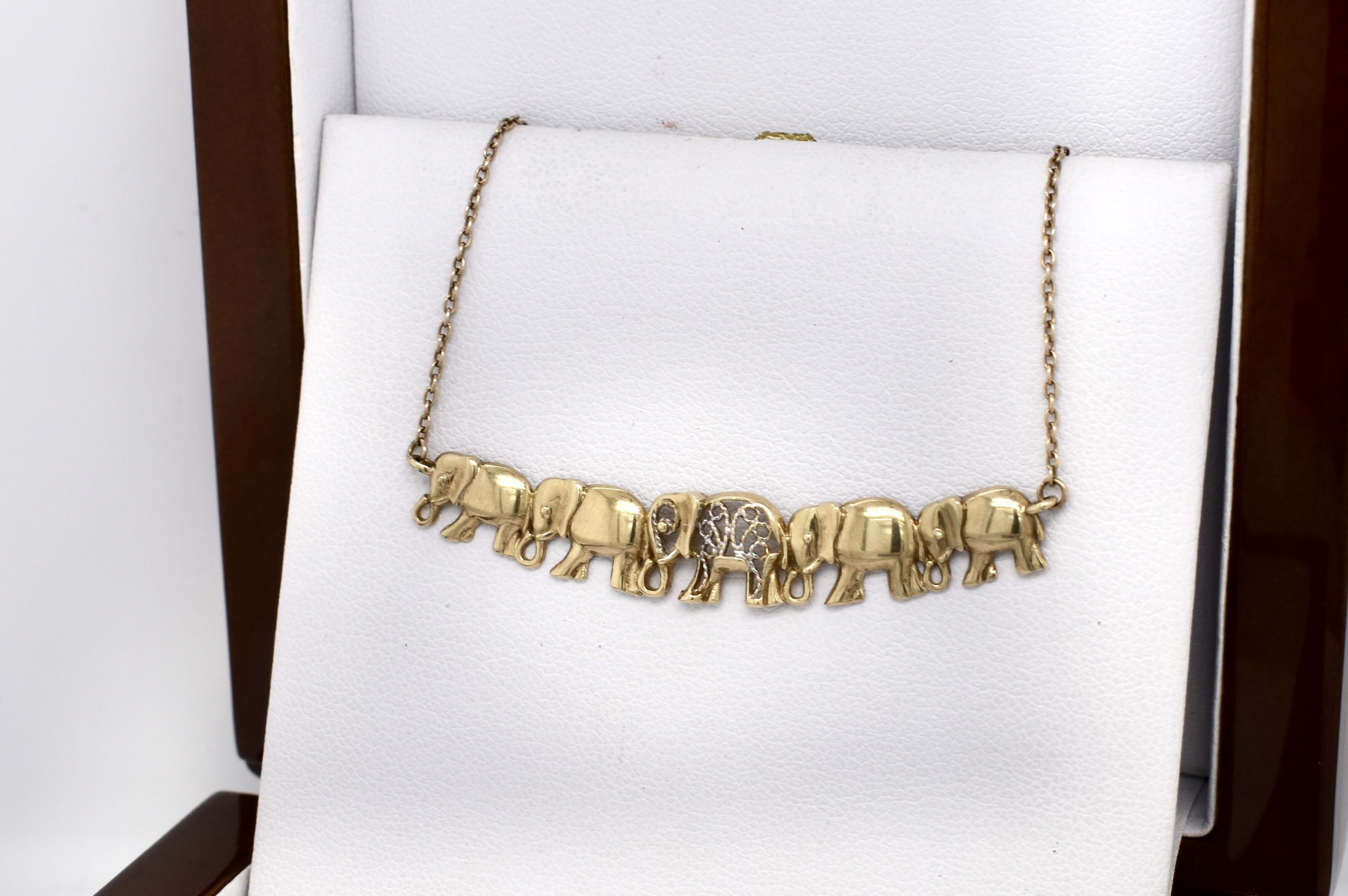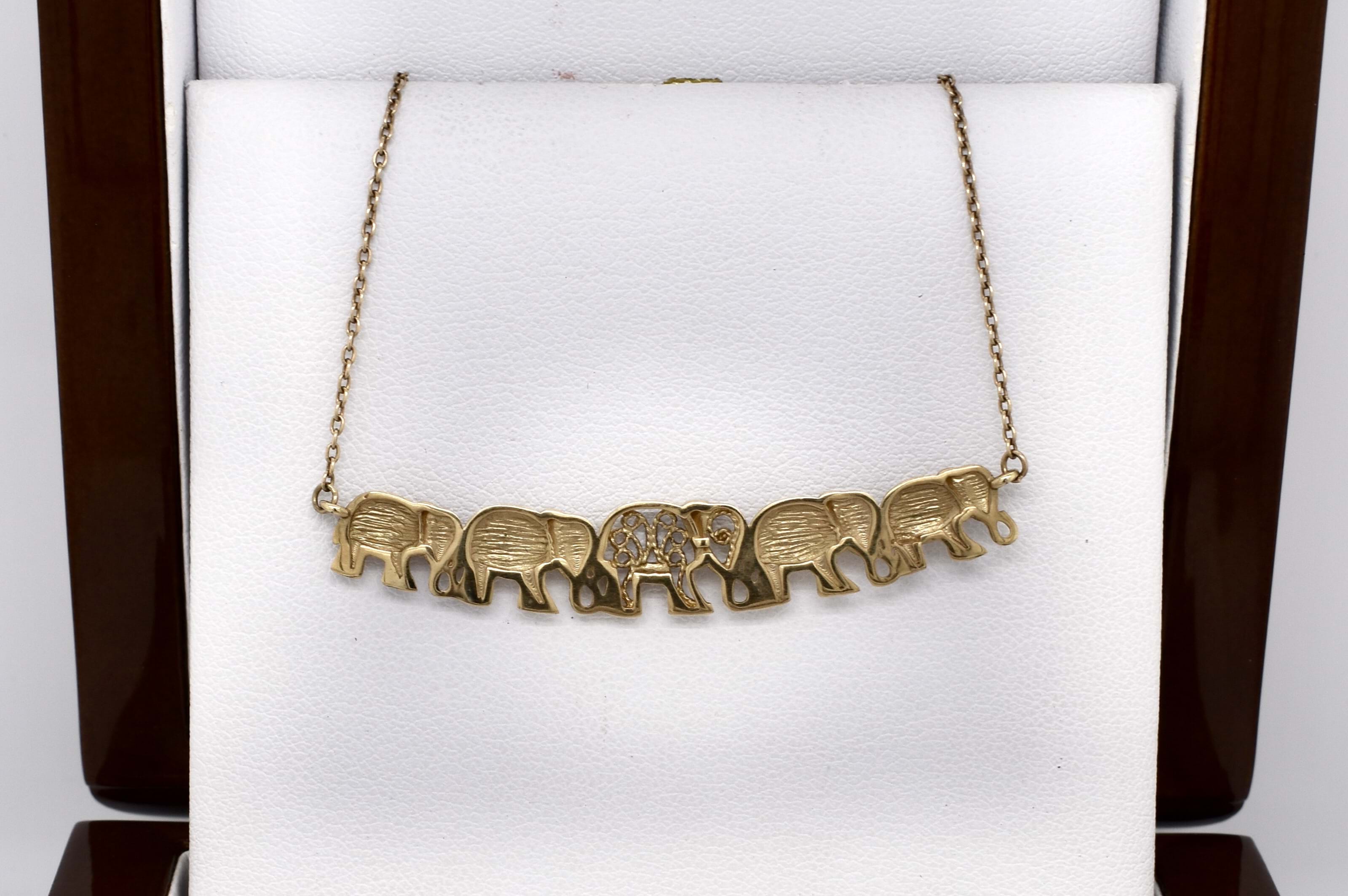 Beautiful secondhand 9ct yellow gold necklet, consisting of 5 elephants in a row, graduating along a 46cm 9ct yellow gold chain.