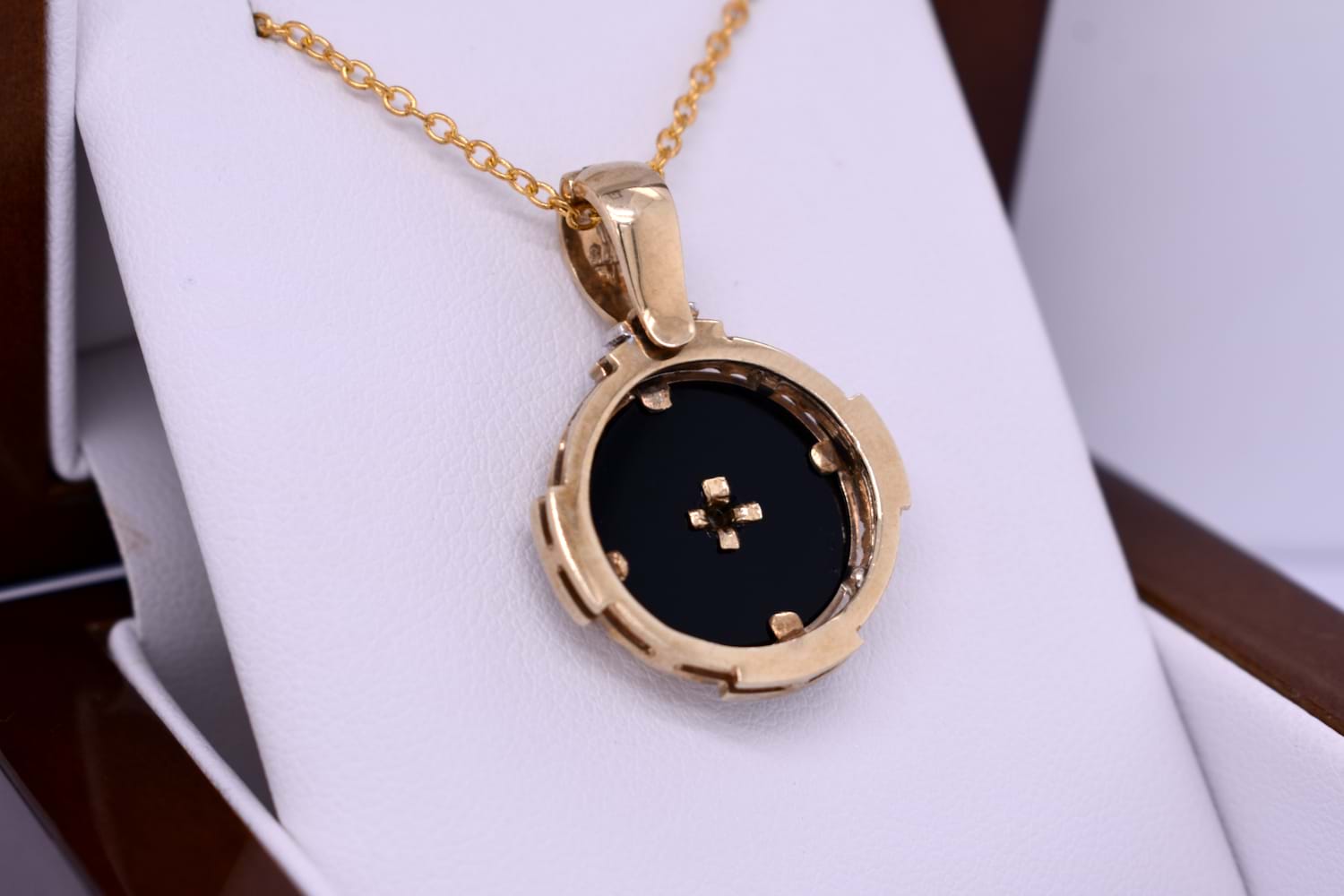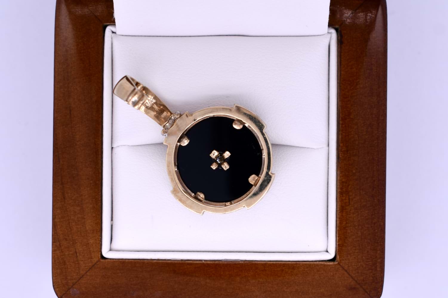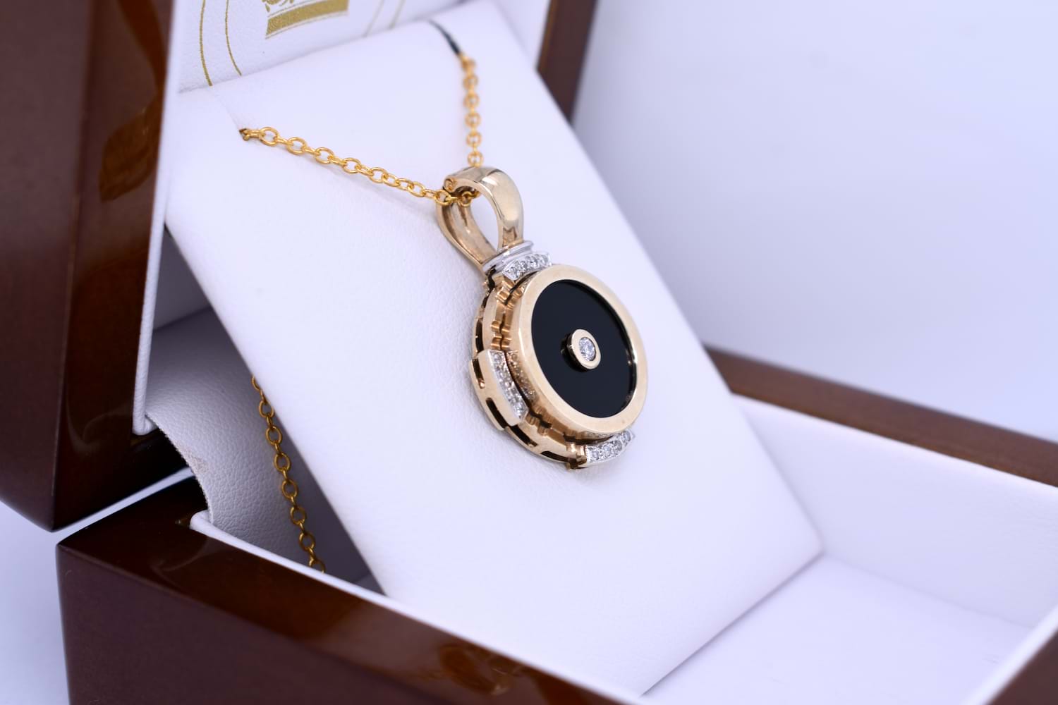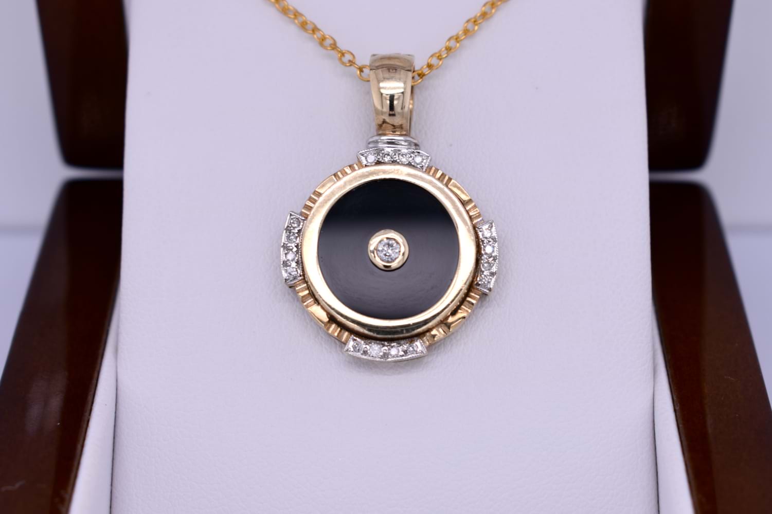 This pretty enhancer pendant is made in 9ct yellow gold and features a disc of onyx measuring 14.90mm, with a 0.07ct round brilliant diamond bezel set in its cenre. The onyx is framed with a grooved scalloped outer surround, accented with 16 additional diamonds in four sections, all set into rhodium plated grain settings. Finished with a hinged enhancer bale. Total diamond weight 0.23ct IP2. Total weight 5.77 grams. Chains are available for separate purchase. Independent valuation supplied.