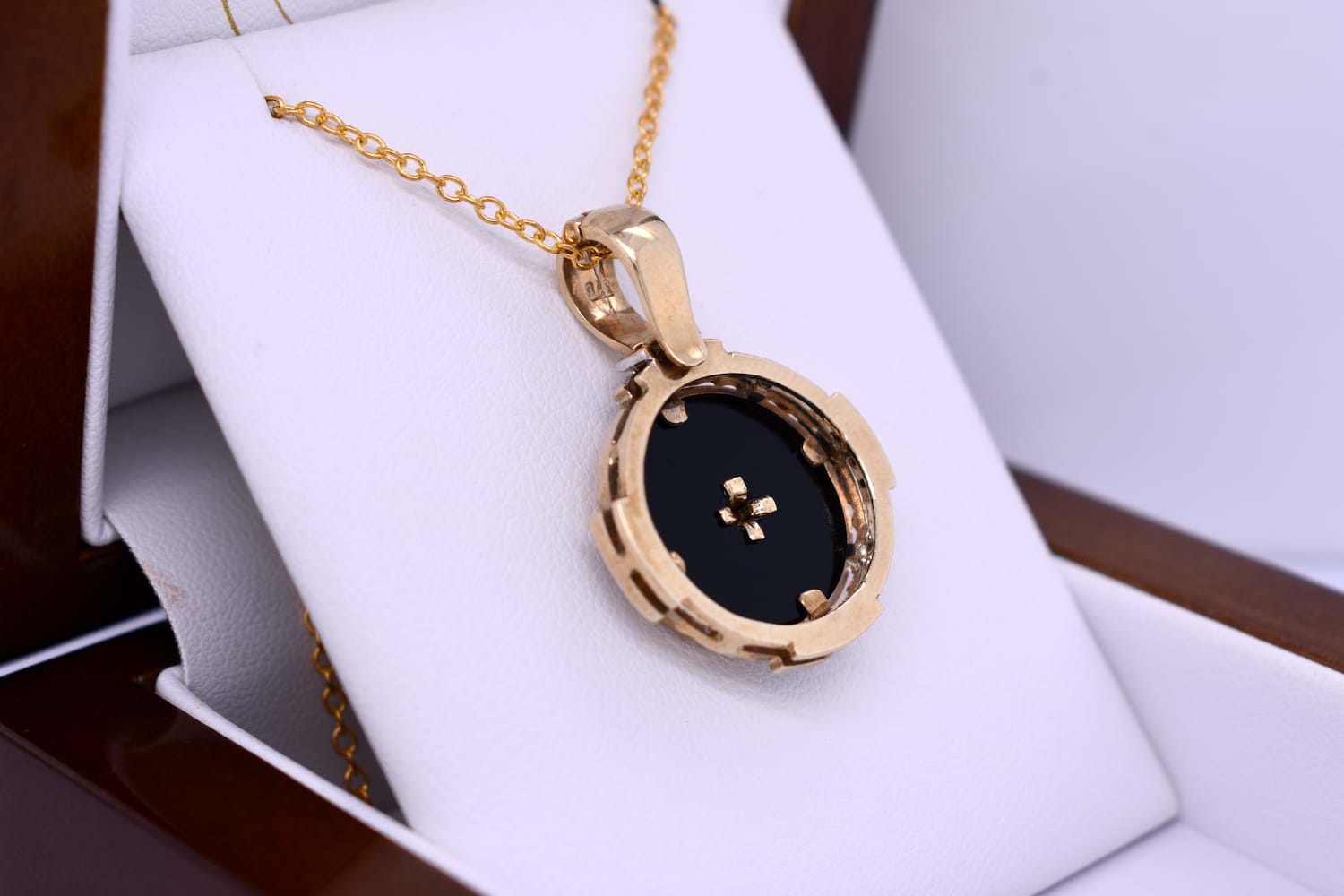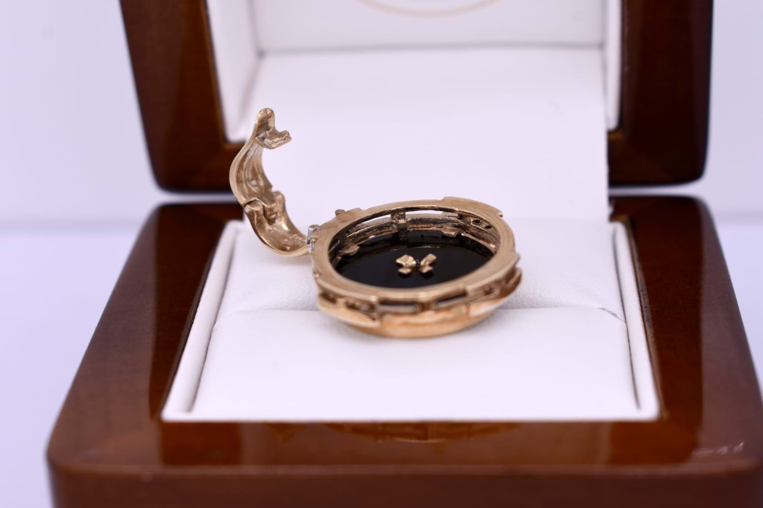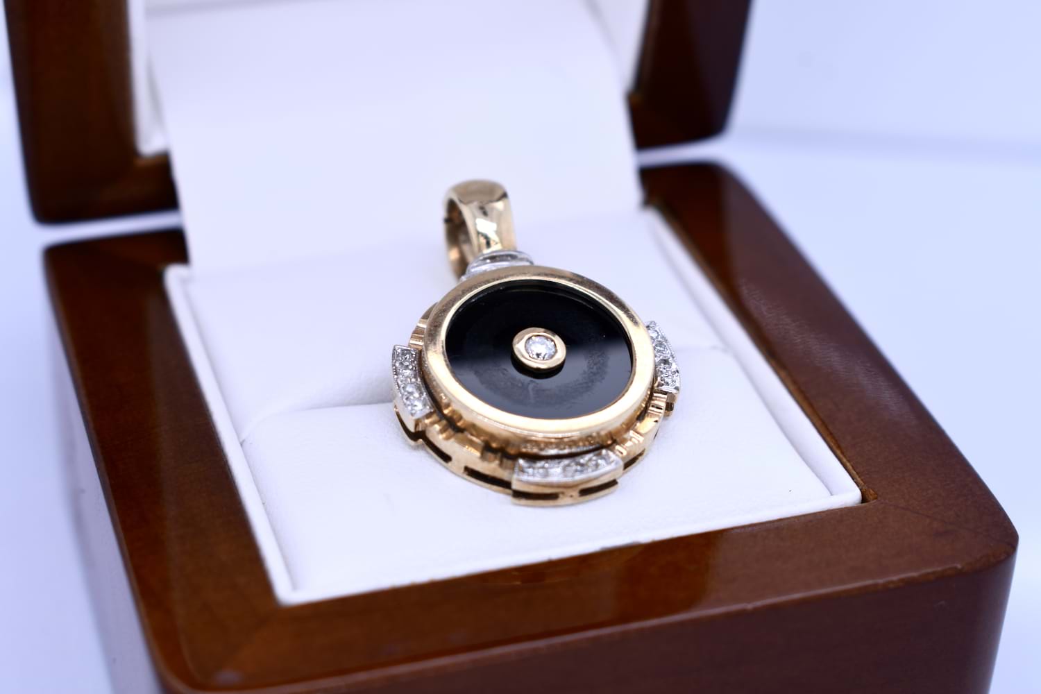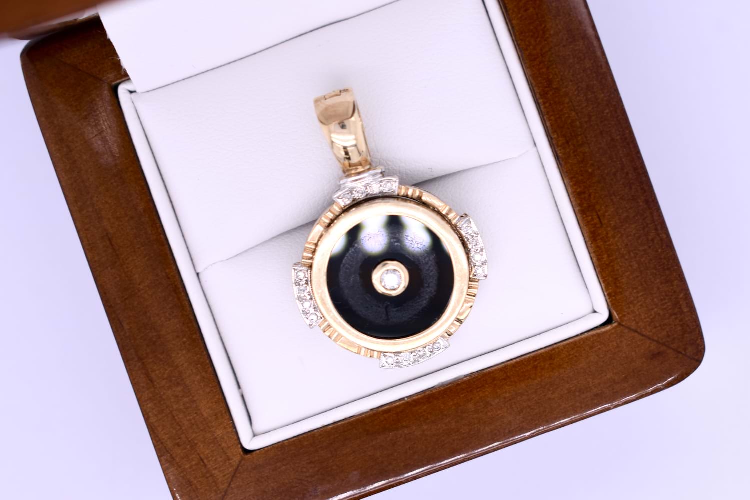 This pretty enhancer pendant is made in 9ct yellow gold and features a disc of onyx measuring 14.90mm, with a 0.07ct round brilliant diamond bezel set in its cenre. The onyx is framed with a grooved scalloped outer surround, accented with 16 additional diamonds in four sections, all set into rhodium plated grain settings. Finished with a hinged enhancer bale. Total diamond weight 0.23ct IP2. Total weight 5.77 grams. Chains are available for separate purchase. Independent valuation supplied.