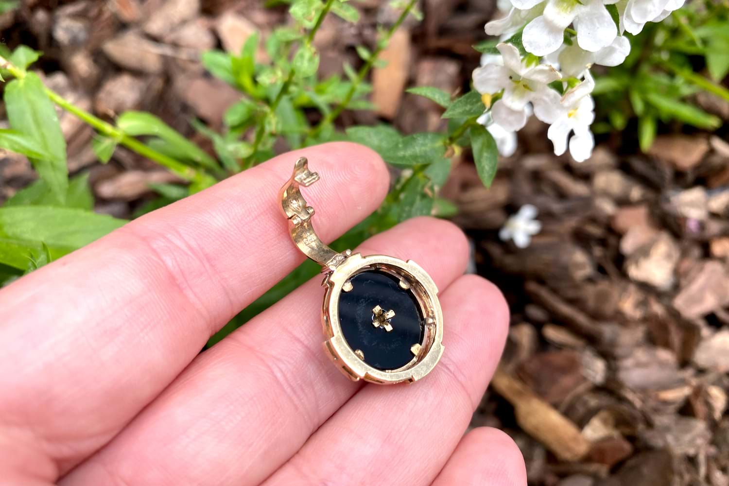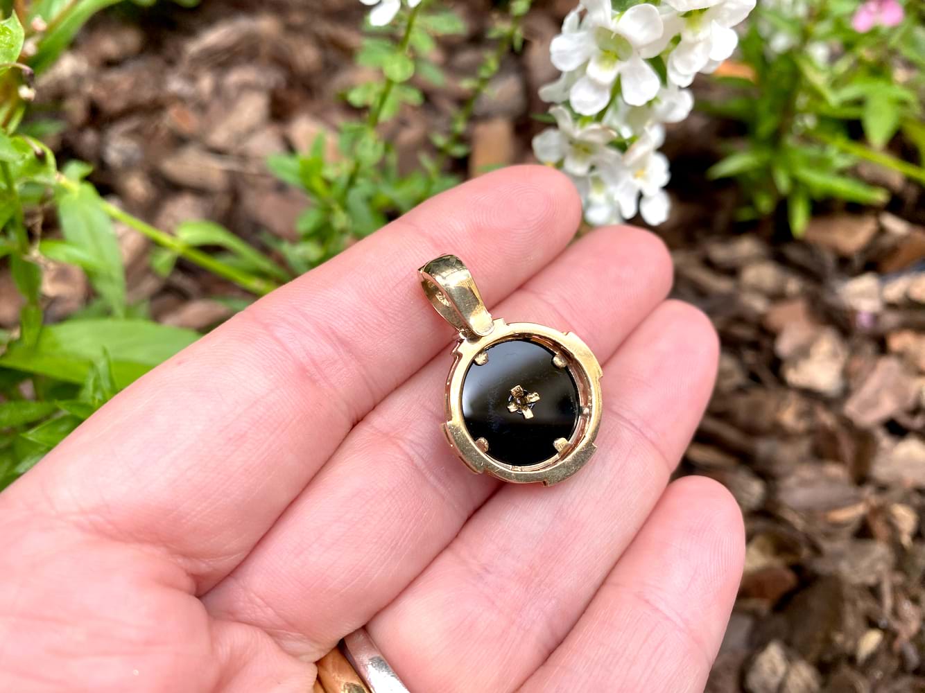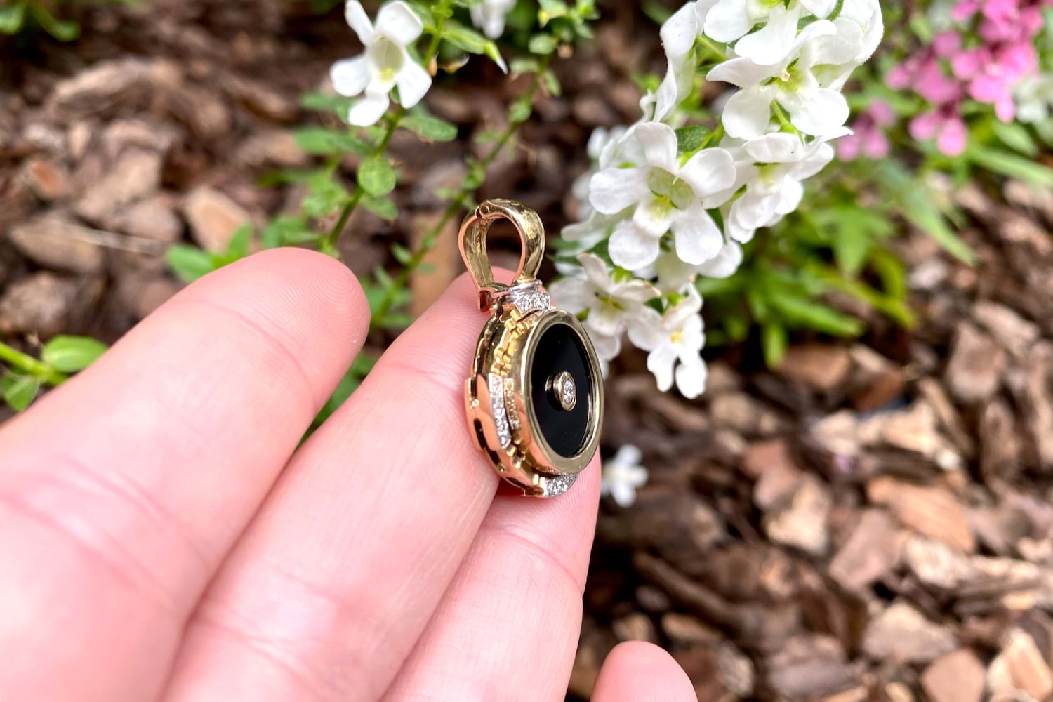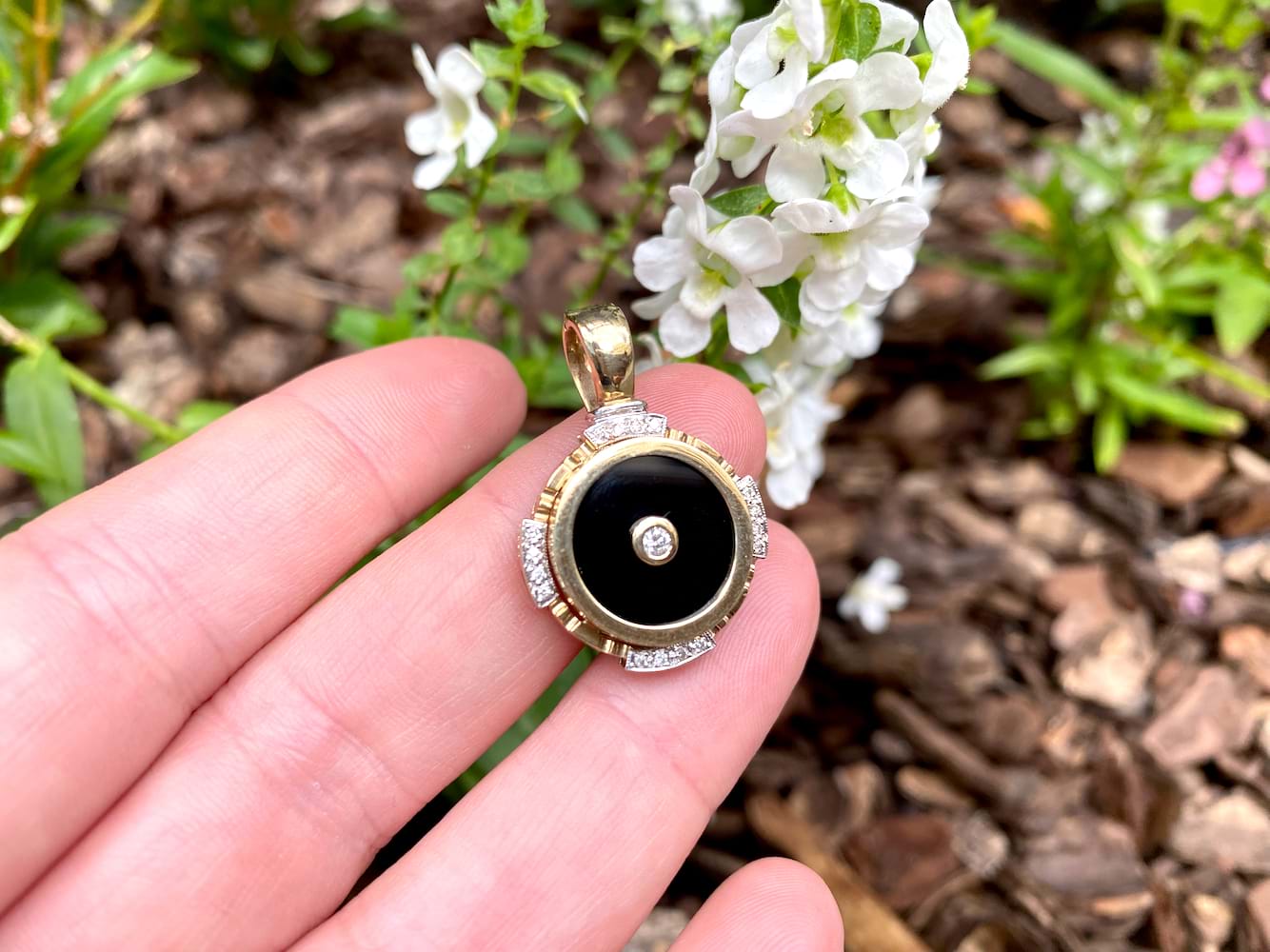 This pretty enhancer pendant is made in 9ct yellow gold and features a disc of onyx measuring 14.90mm, with a 0.07ct round brilliant diamond bezel set in its cenre. The onyx is framed with a grooved scalloped outer surround, accented with 16 additional diamonds in four sections, all set into rhodium plated grain settings. Finished with a hinged enhancer bale. Total diamond weight 0.23ct IP2. Total weight 5.77 grams. Chains are available for separate purchase. Independent valuation supplied.
