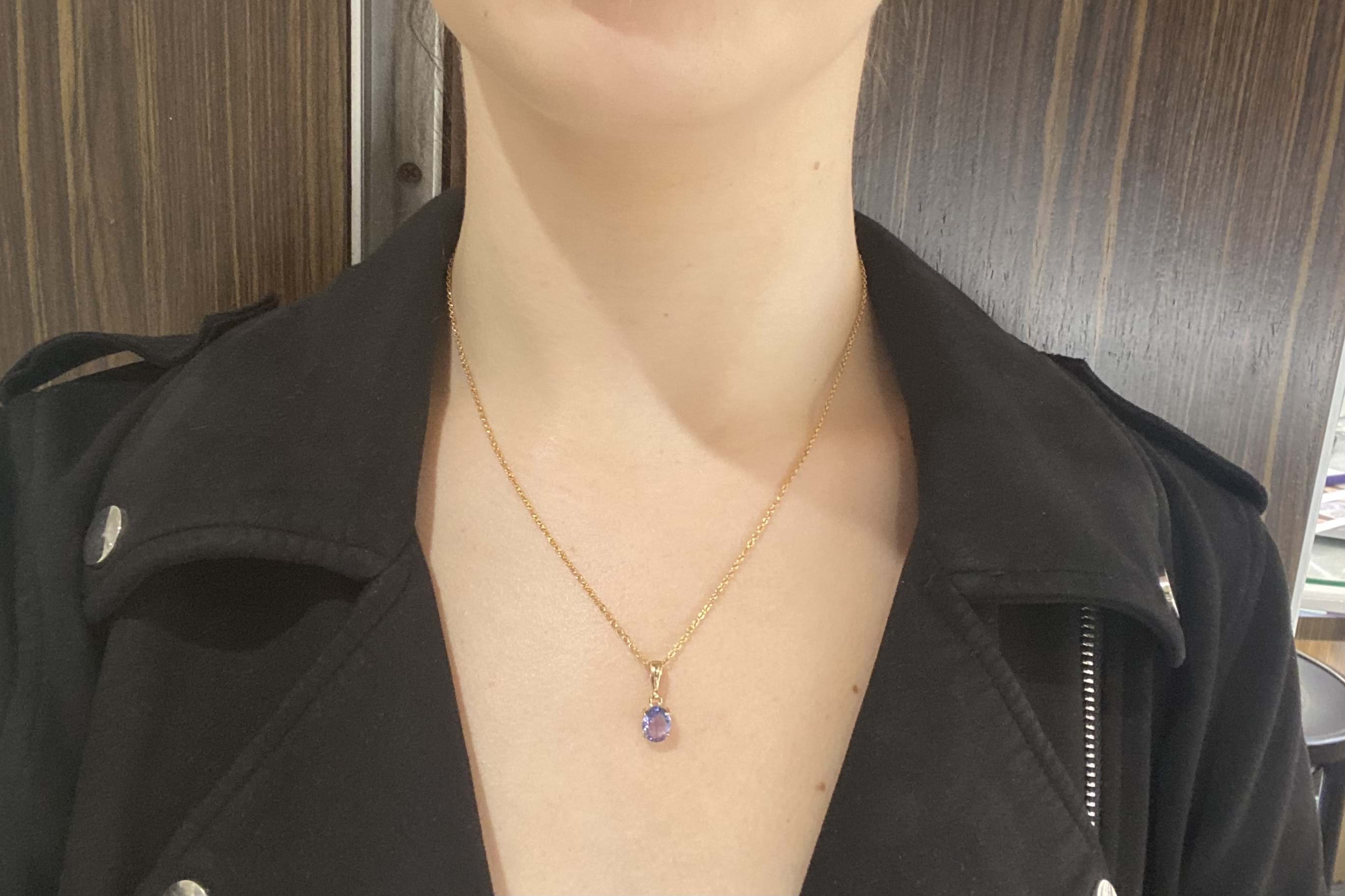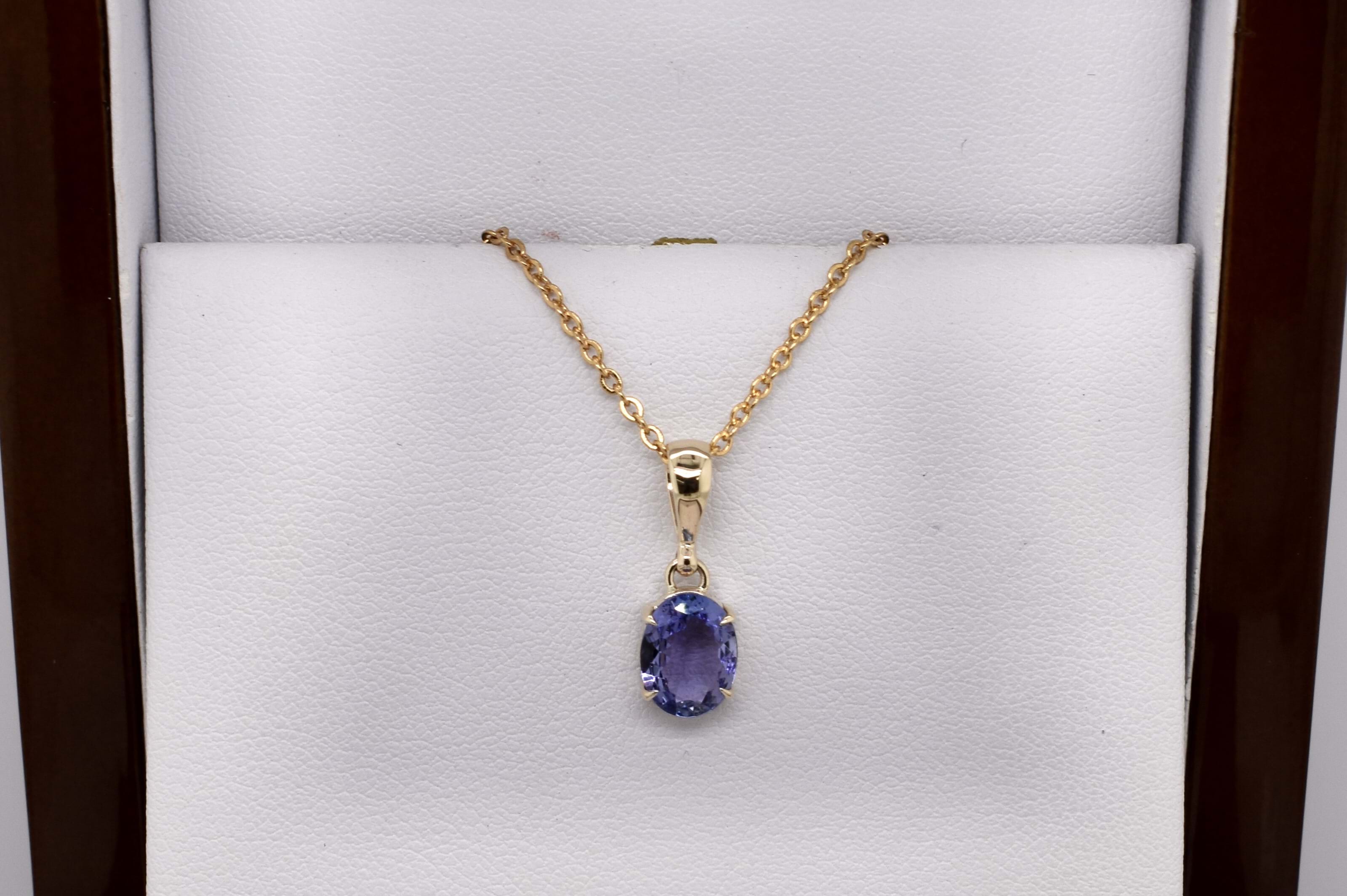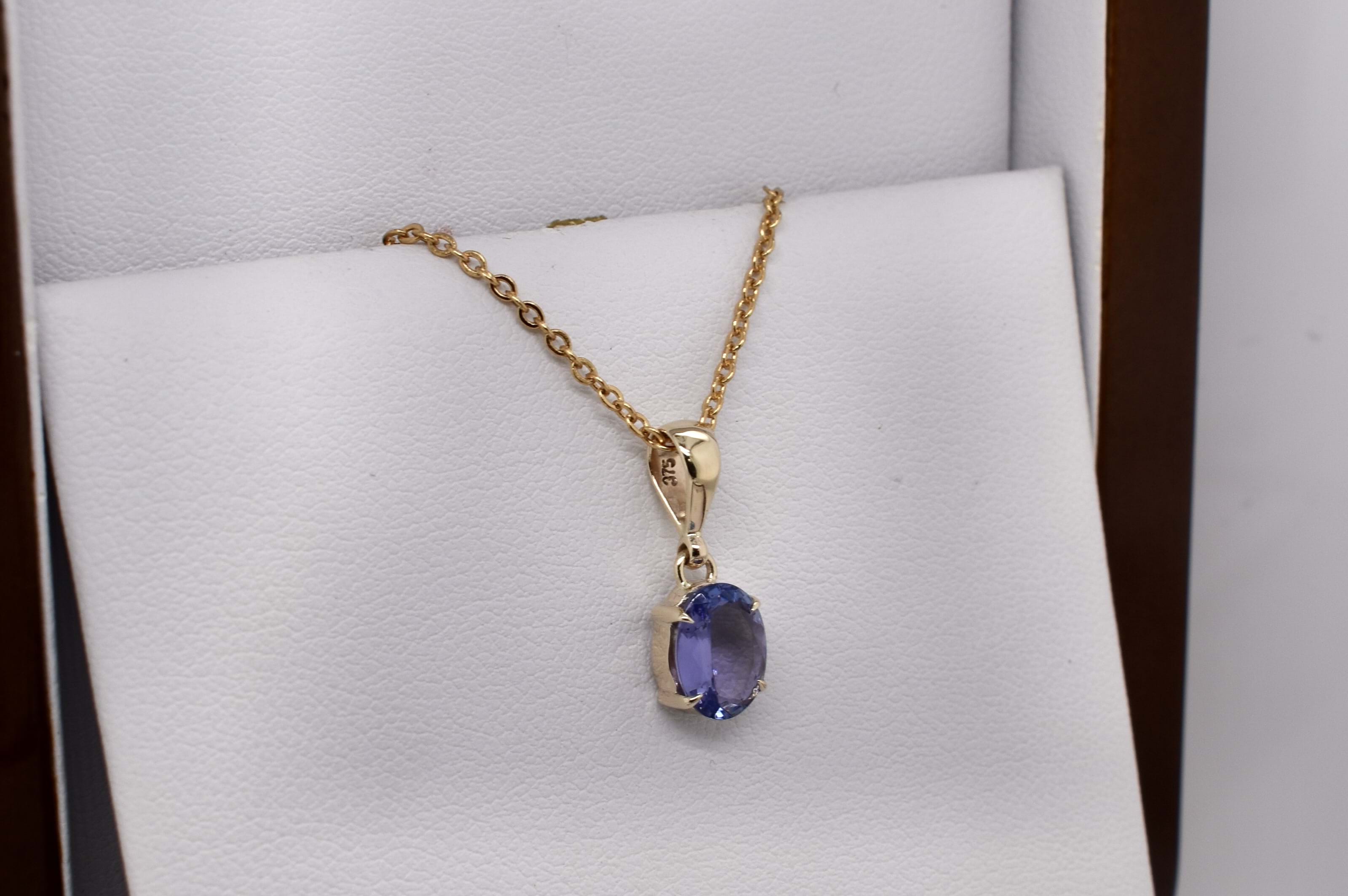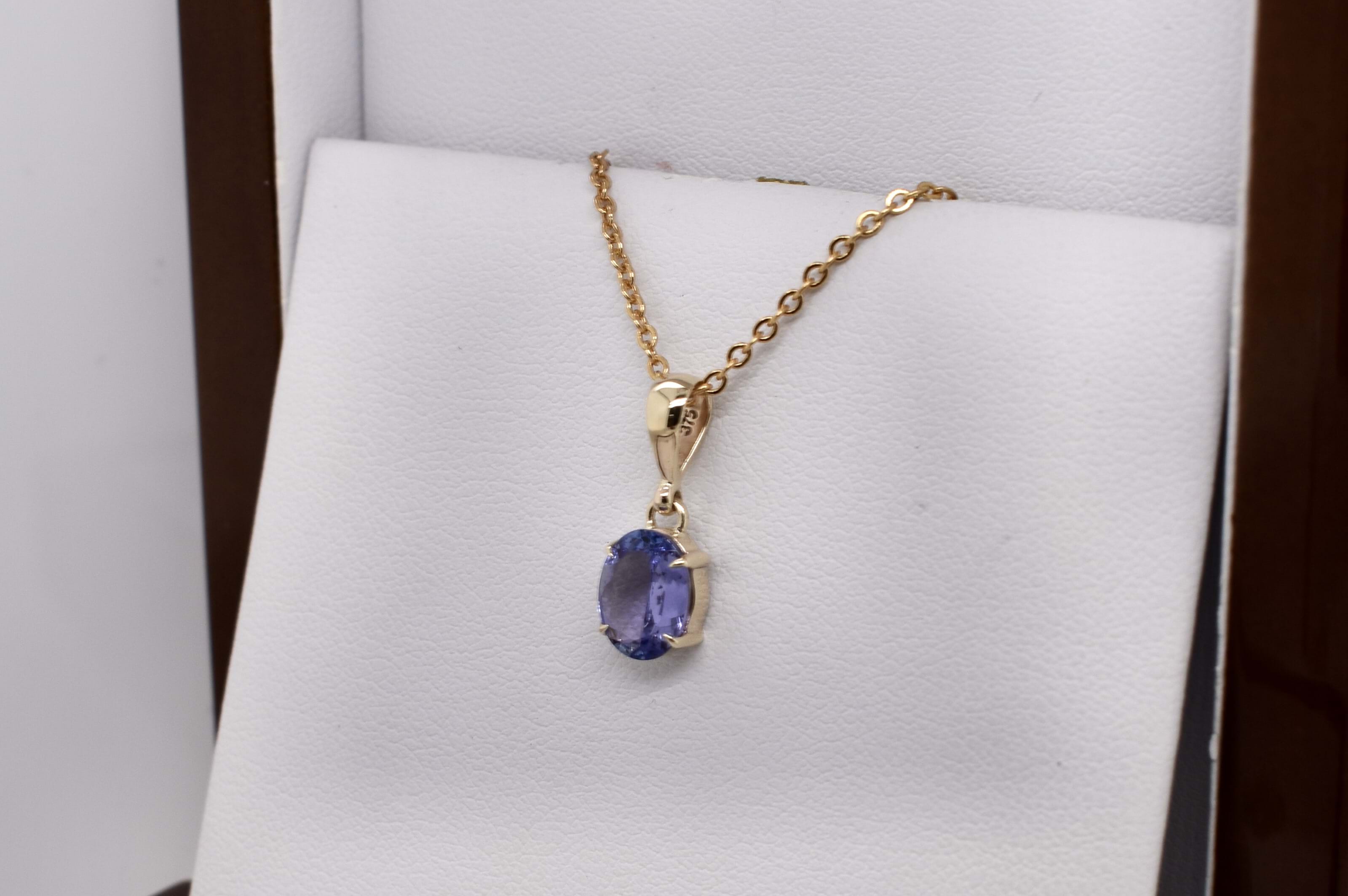 This beautiful tanzanite pendant is oval shaped and four claw set, in 9ct yellow gold, measuring 8.6x6.6mm. Finished with a plain bale. Chains available for separate purchase.