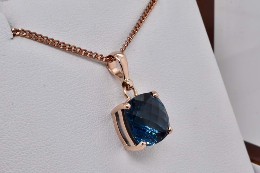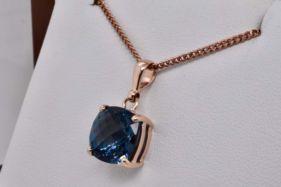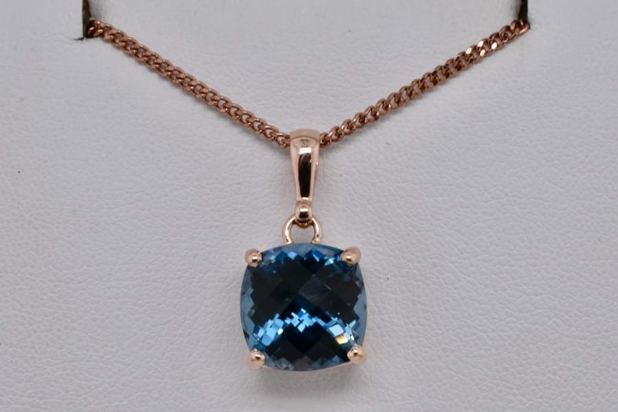 This handmade 9ct rose gold pendant showcases a stunning London blue topaz with beautiful depth of colour, cushion cut with chequerboard faceting and measuring approx. 12mm, in four claws with a plain bail. Chains available for separate purchase