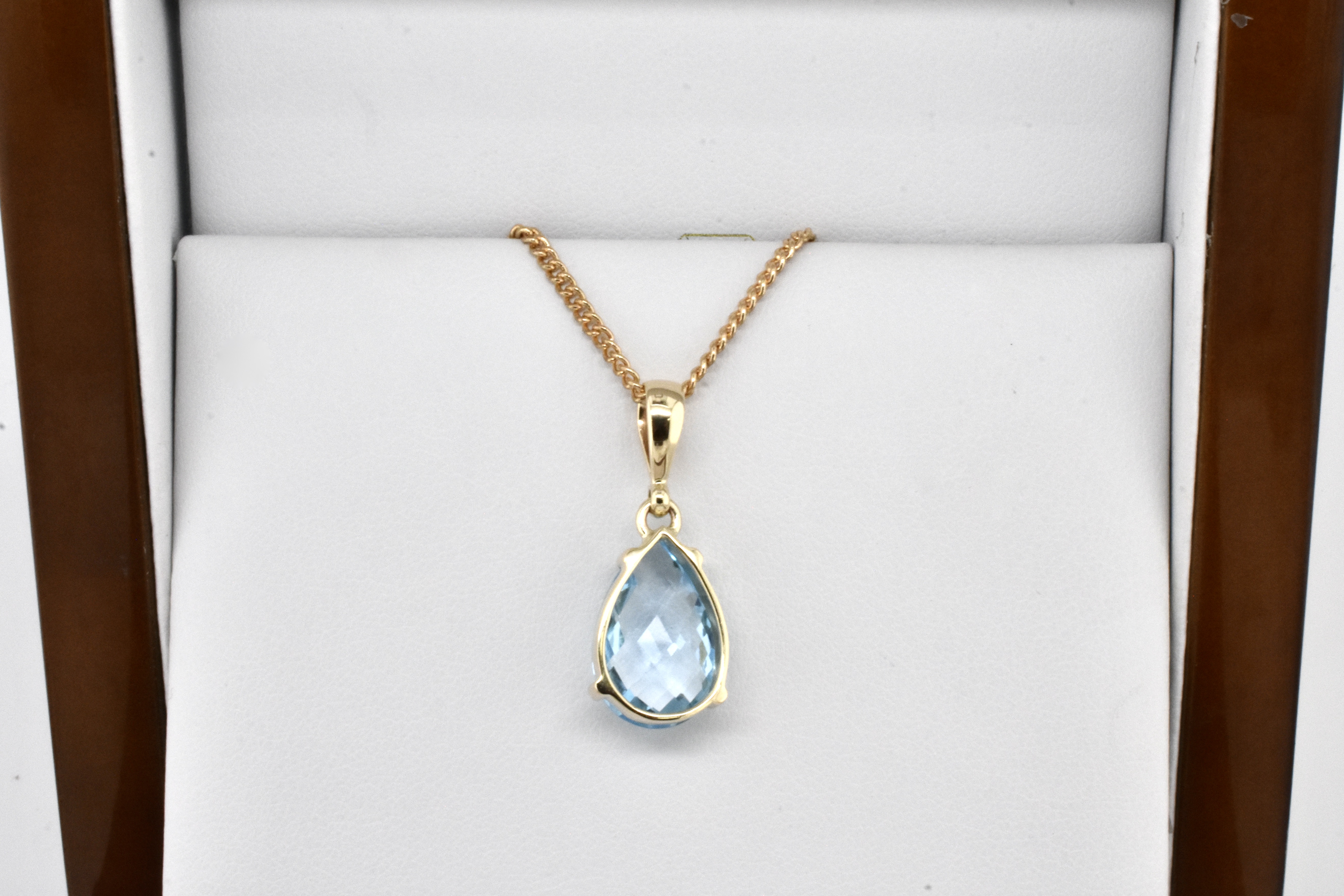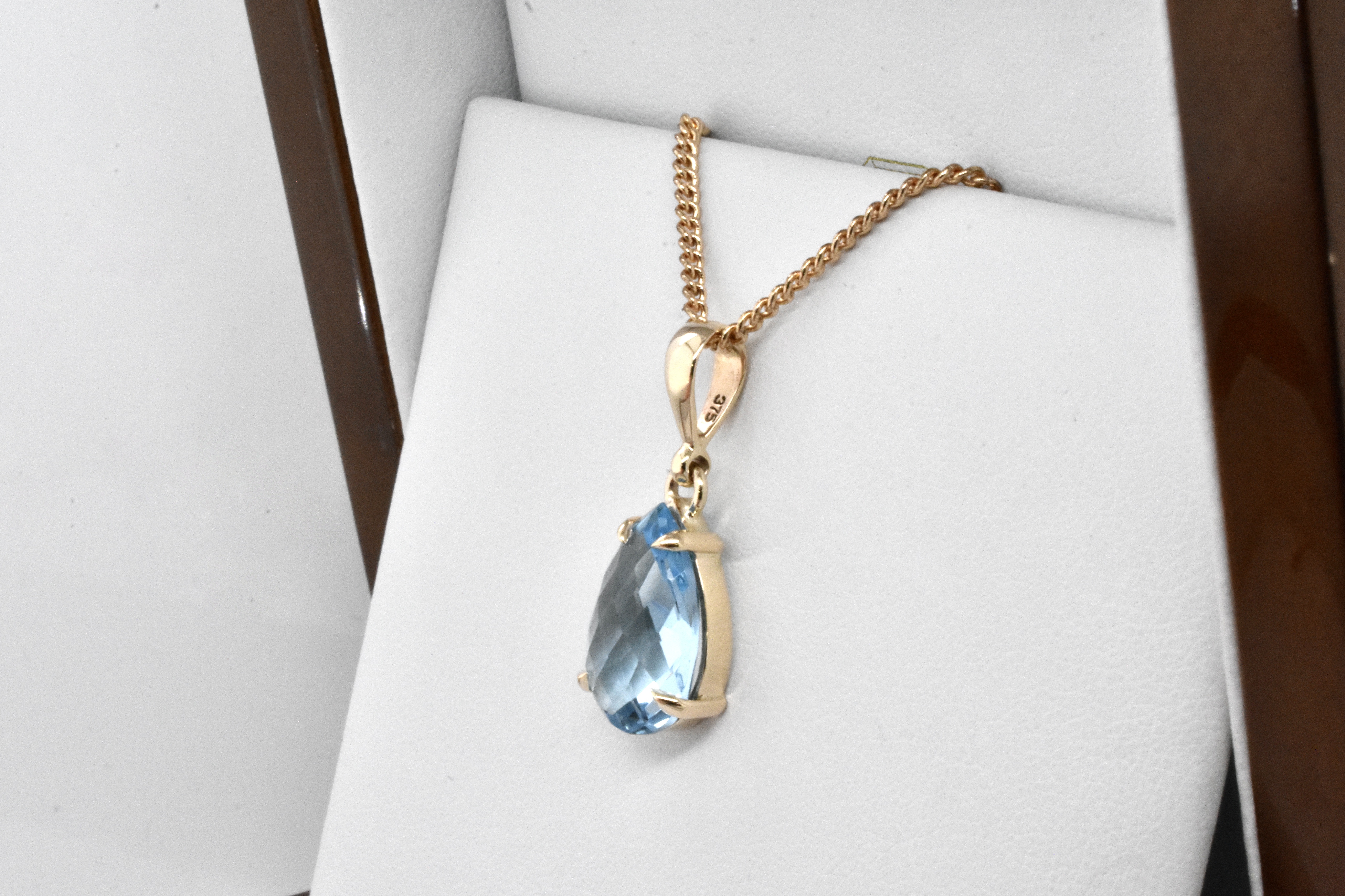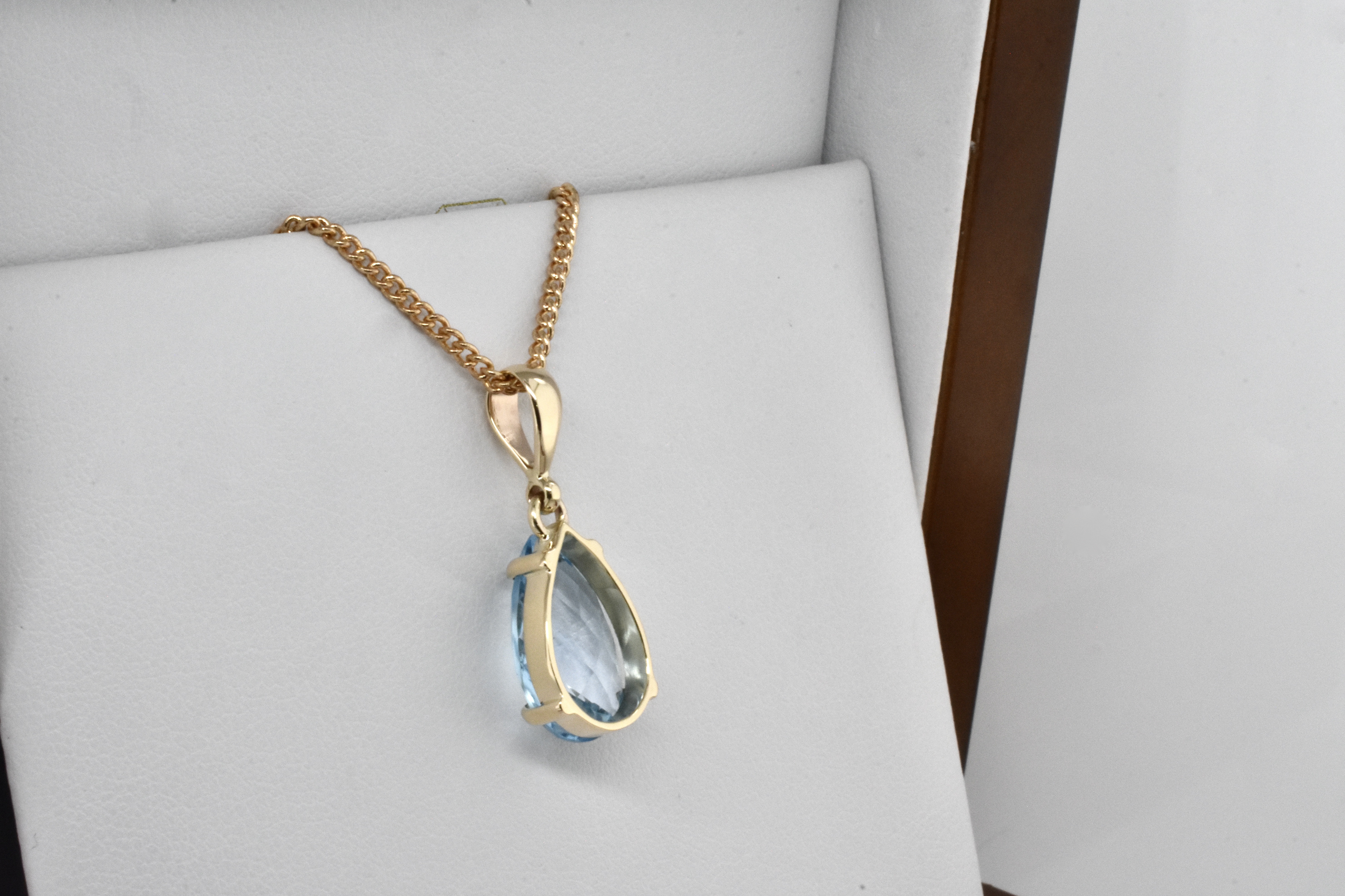 Handmade 9ct yellow gold pendant, set with an approx. 15 x 10mm pear shape sky blue topaz, 4 claw set with plain bail. Chains available for separate purchase