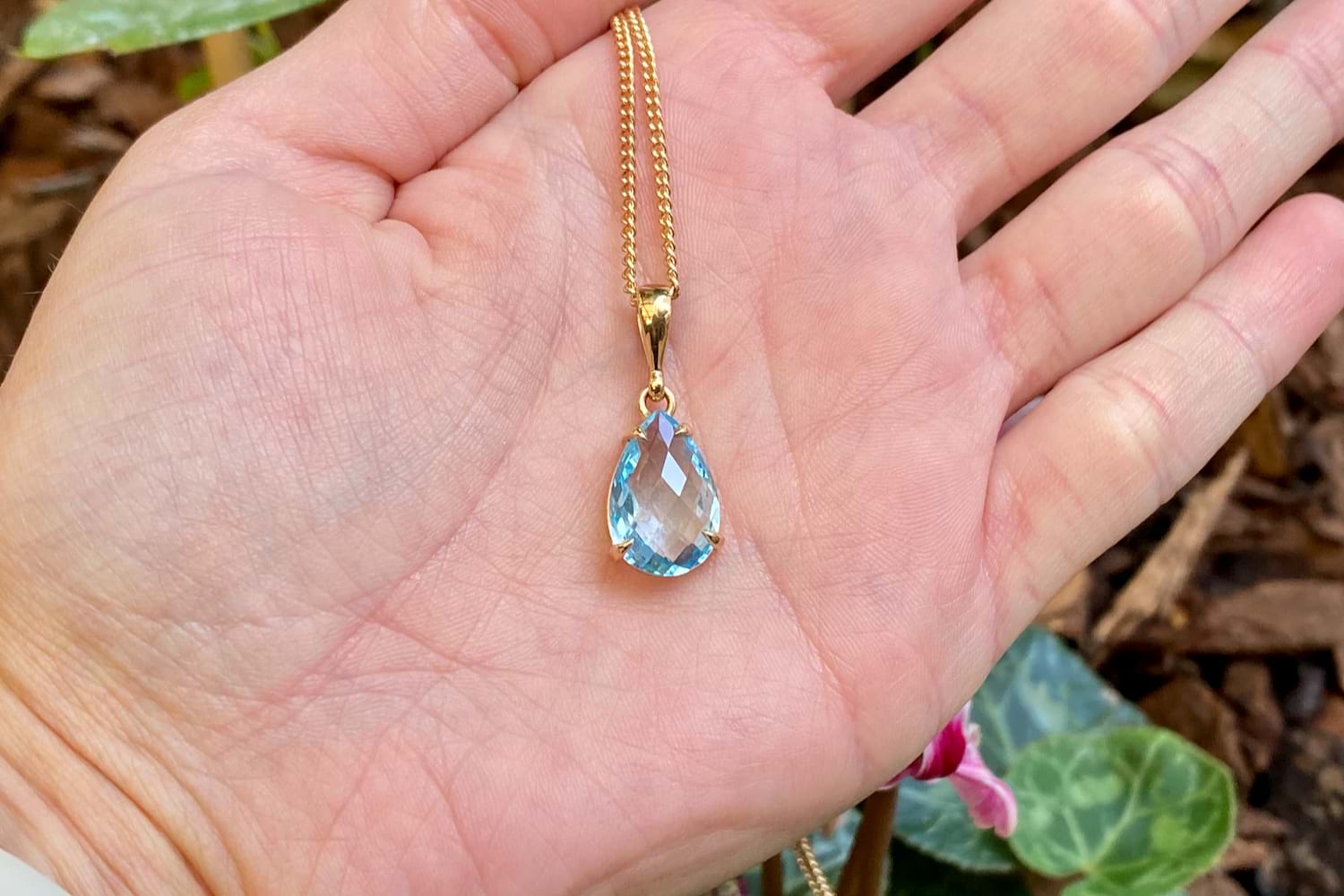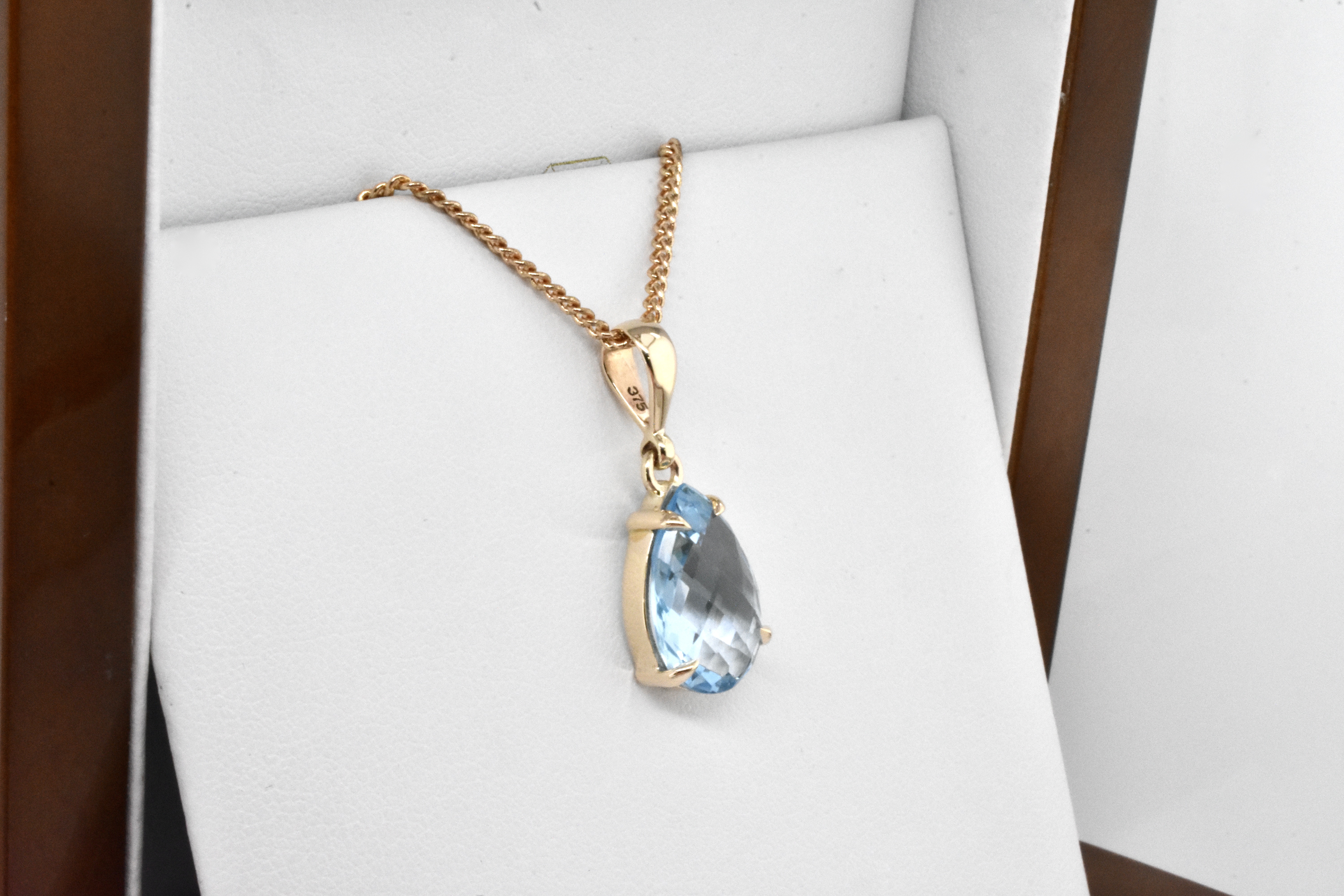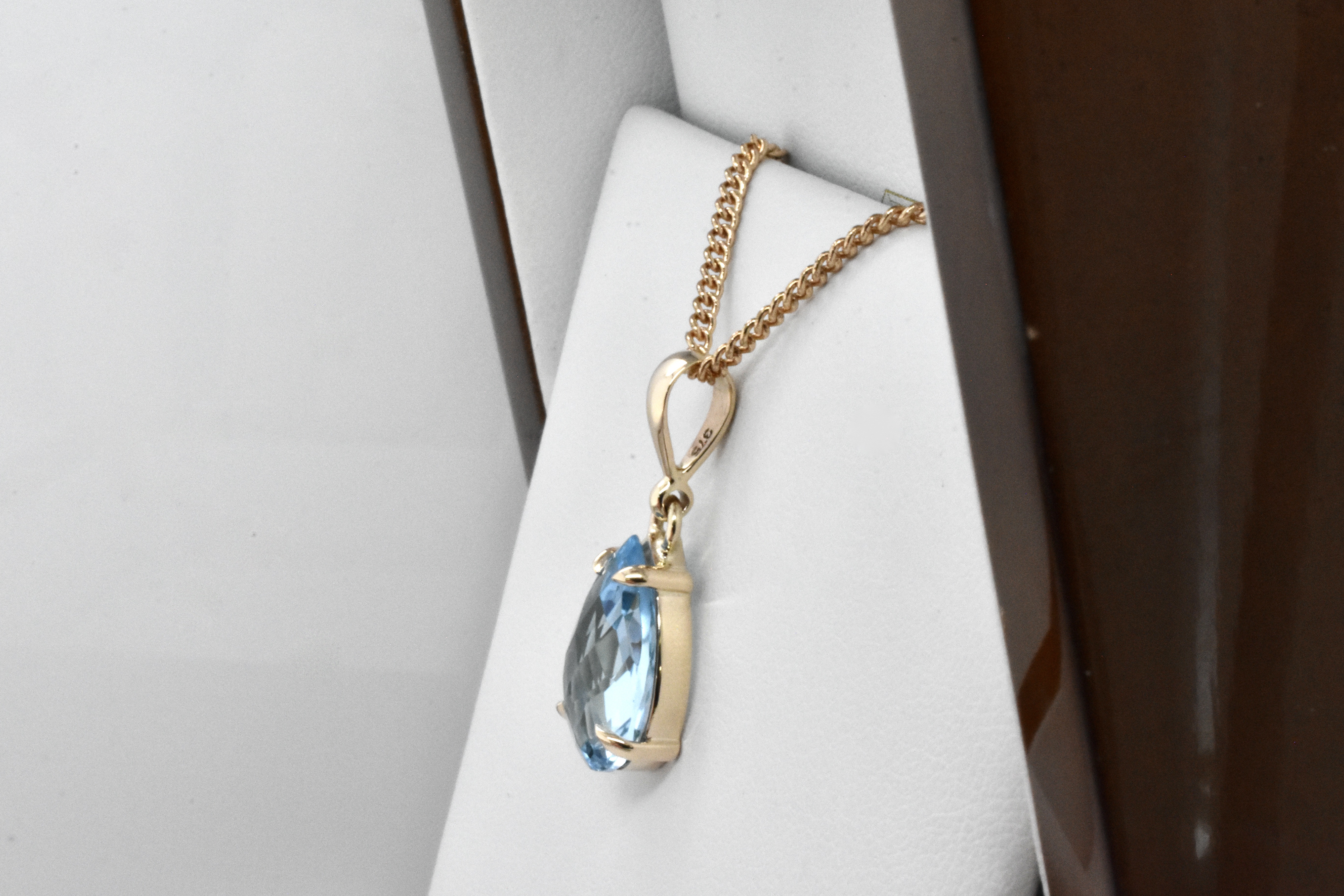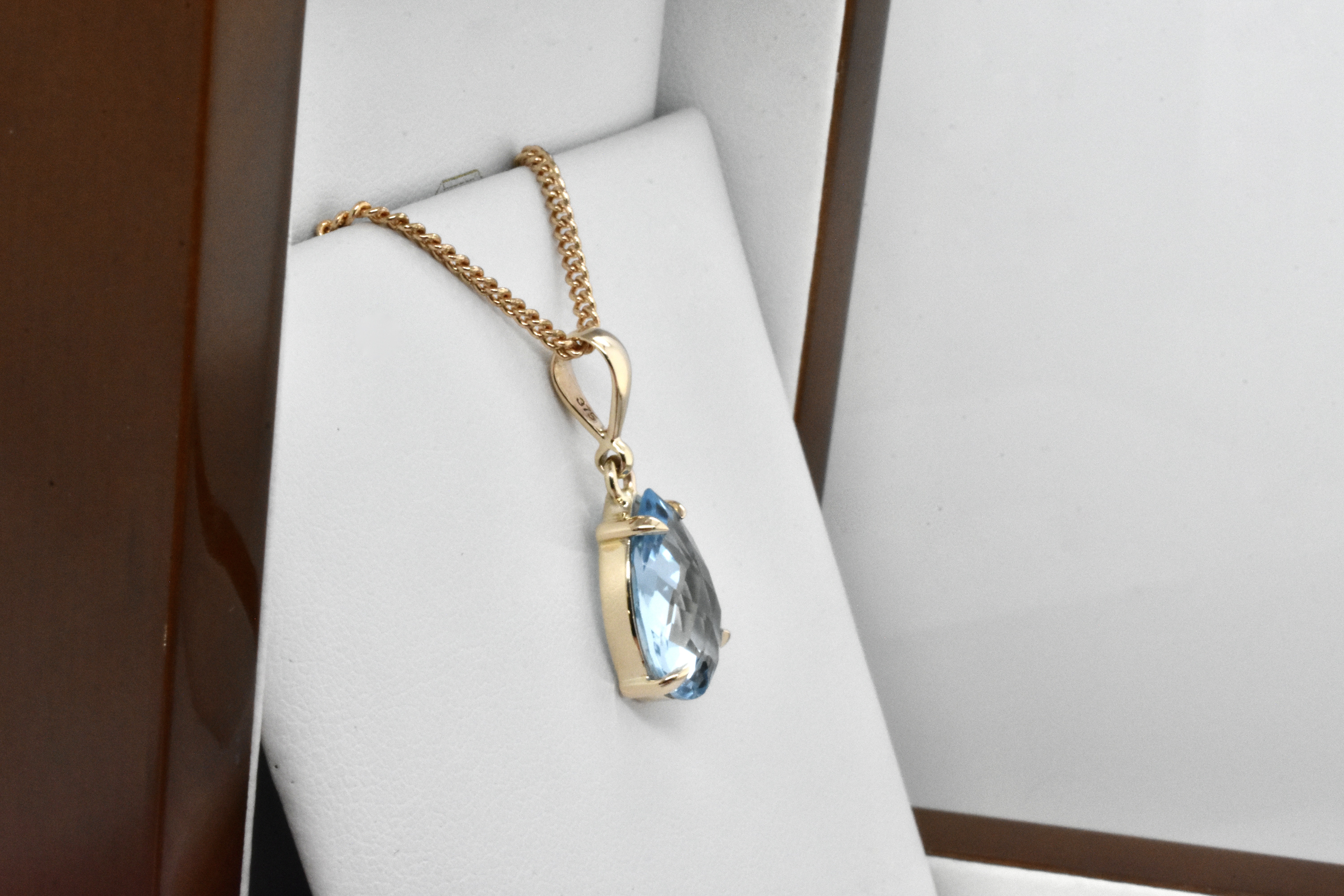 Handmade 9ct yellow gold pendant, set with an approx. 15 x 10mm pear shape sky blue topaz, 4 claw set with plain bail. Chains available for separate purchase