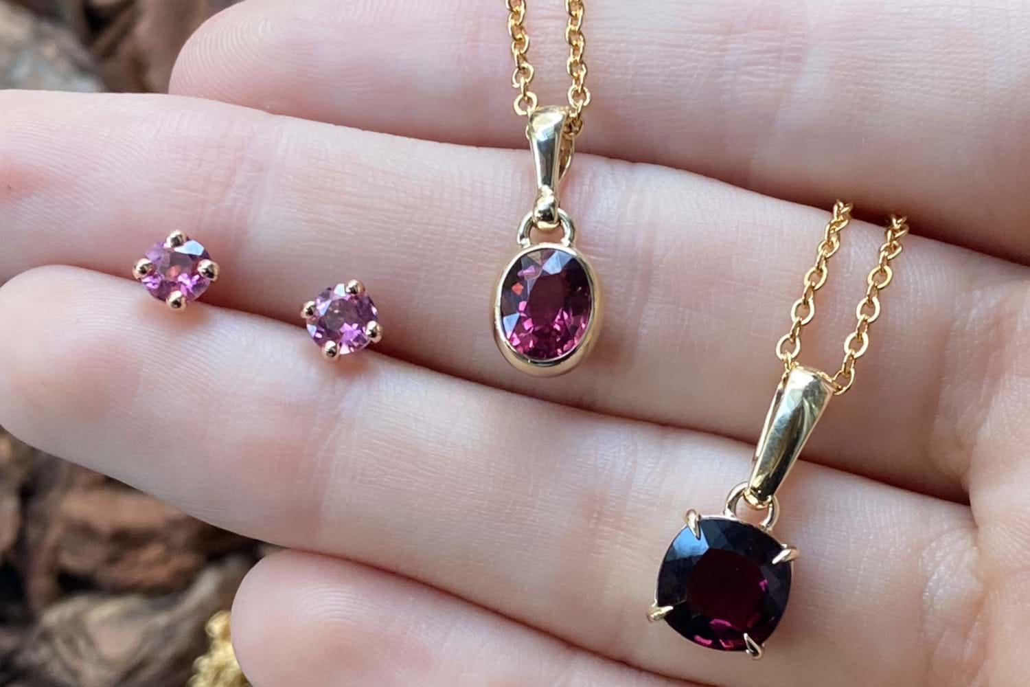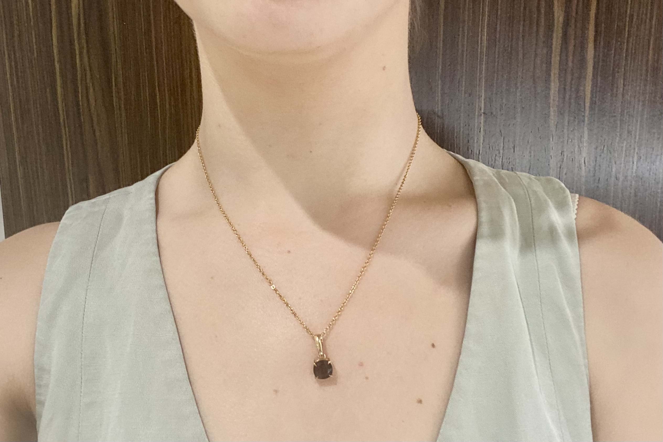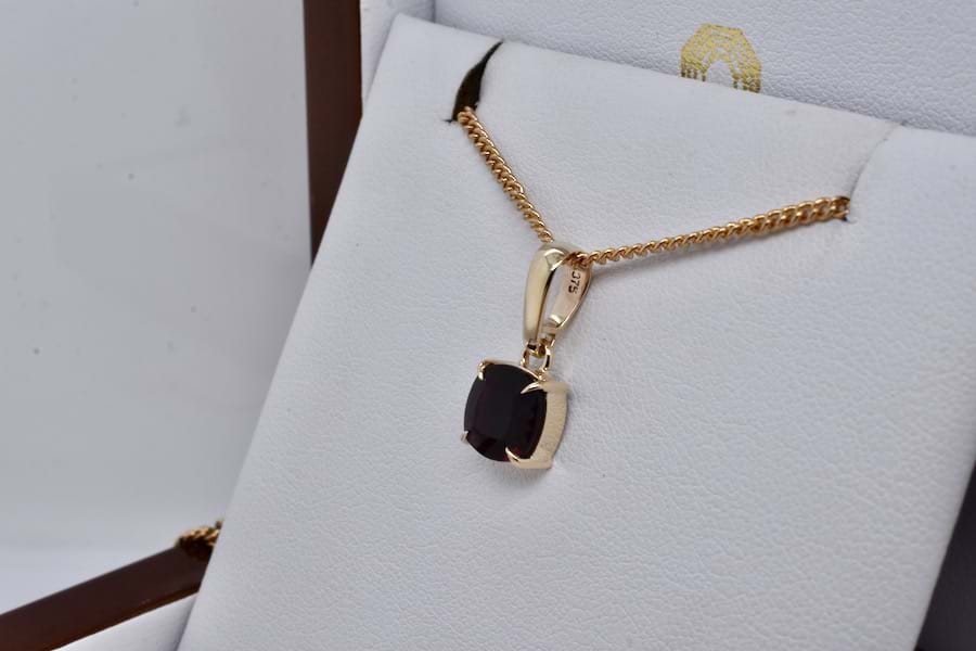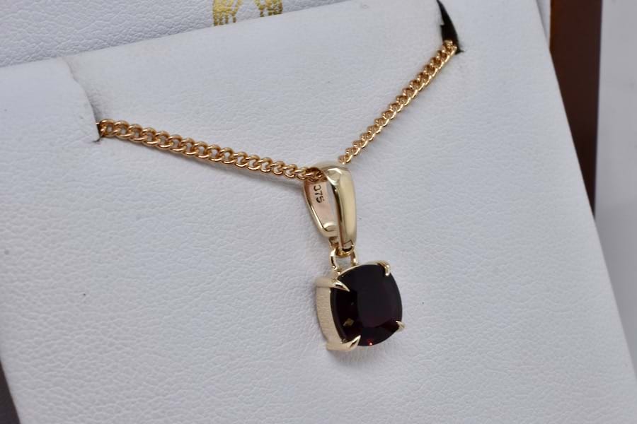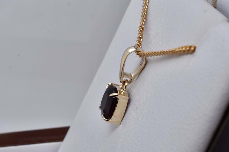 This pendant features a striking centre stone which could be mistaken for black, however is a deep and dark pink/purple tourmaline measuring approx. 8mm cushion cut, in a handmade 9ct yellow gold setting with four fine talon claws and plain bail. Chains available for separate purchase