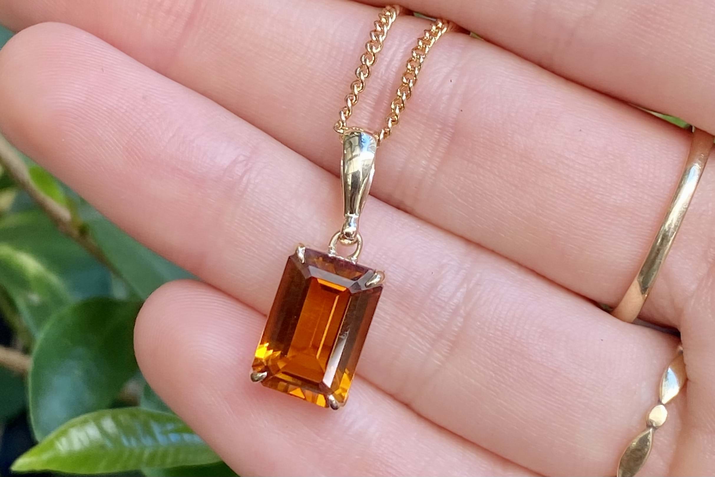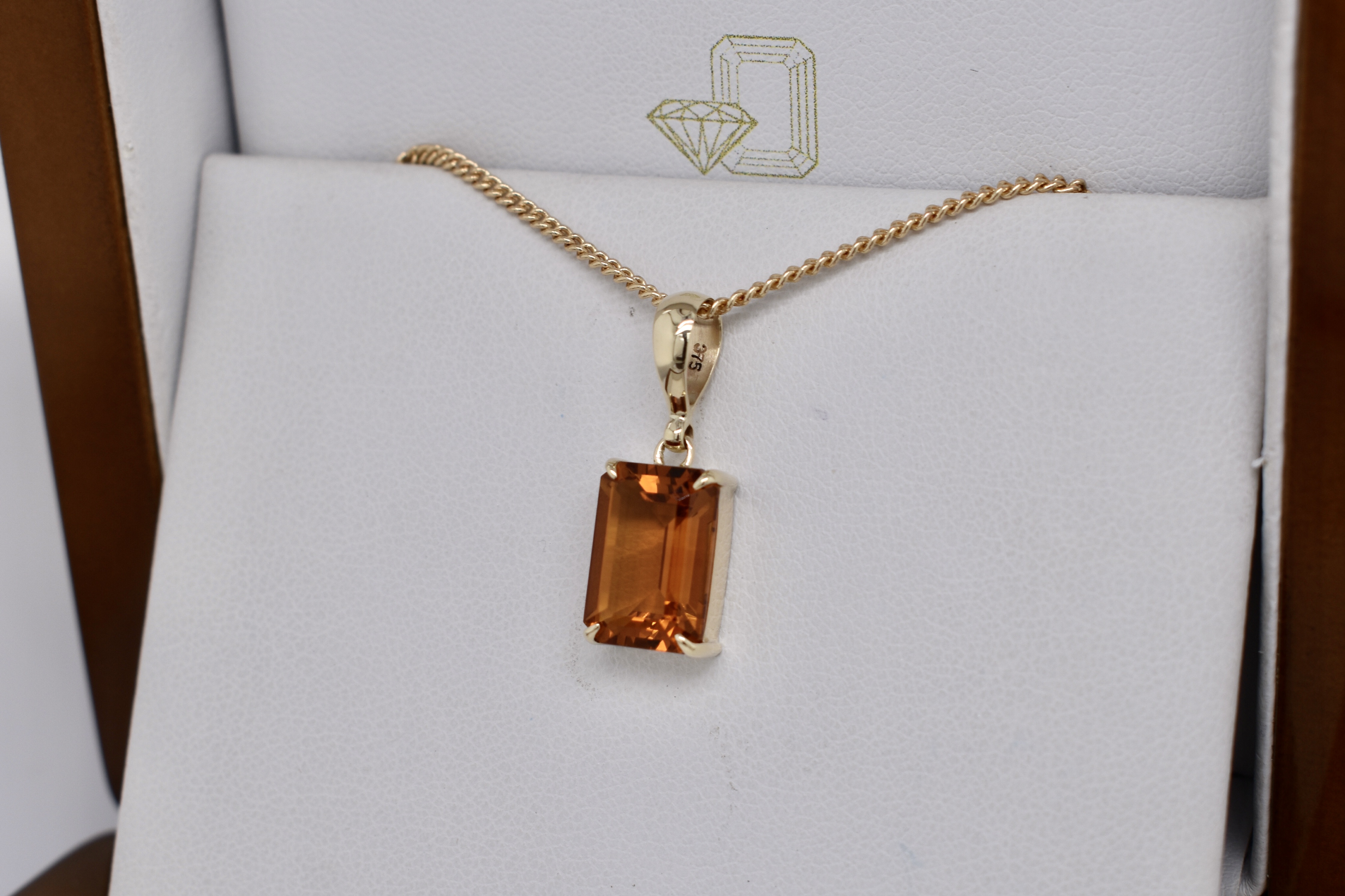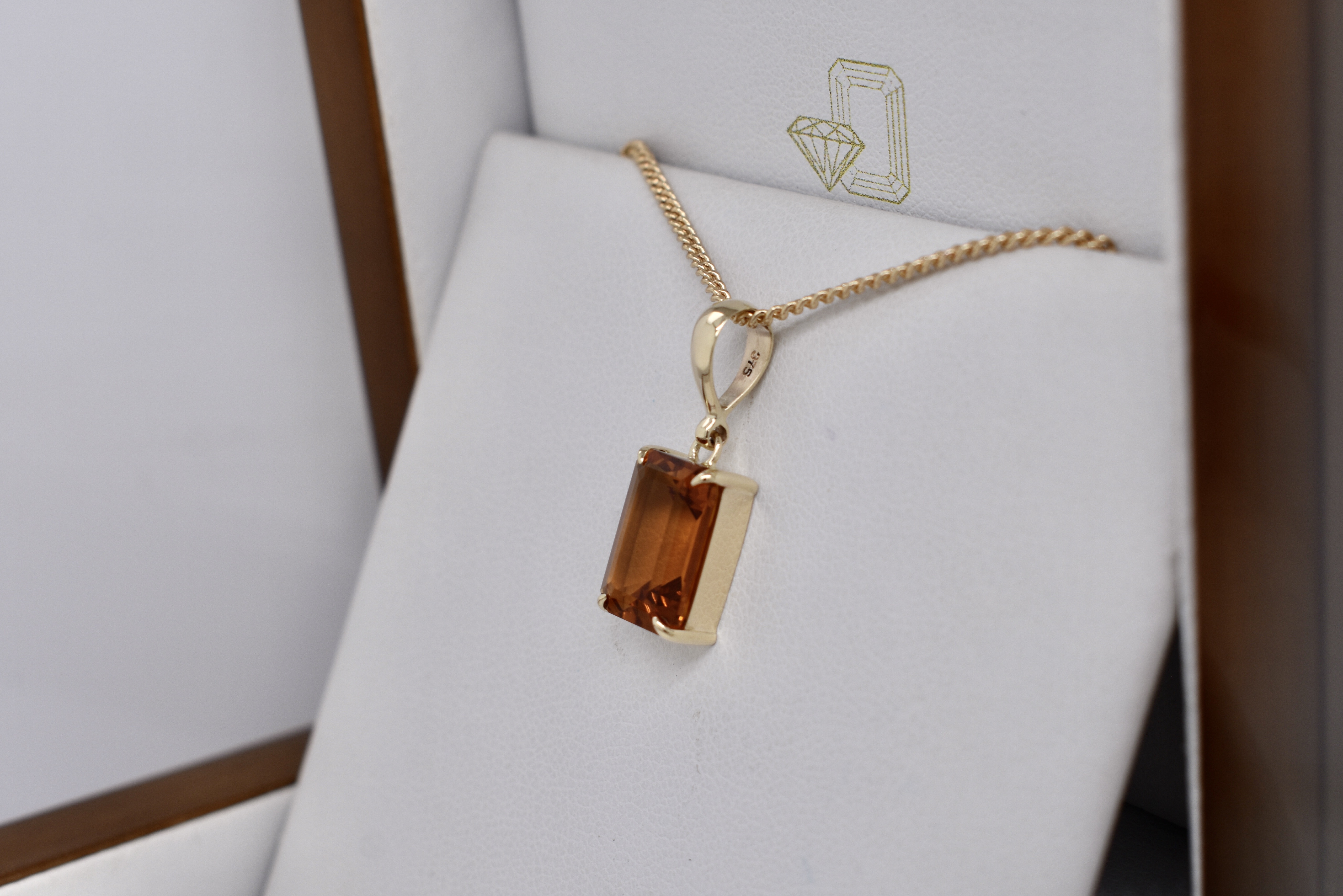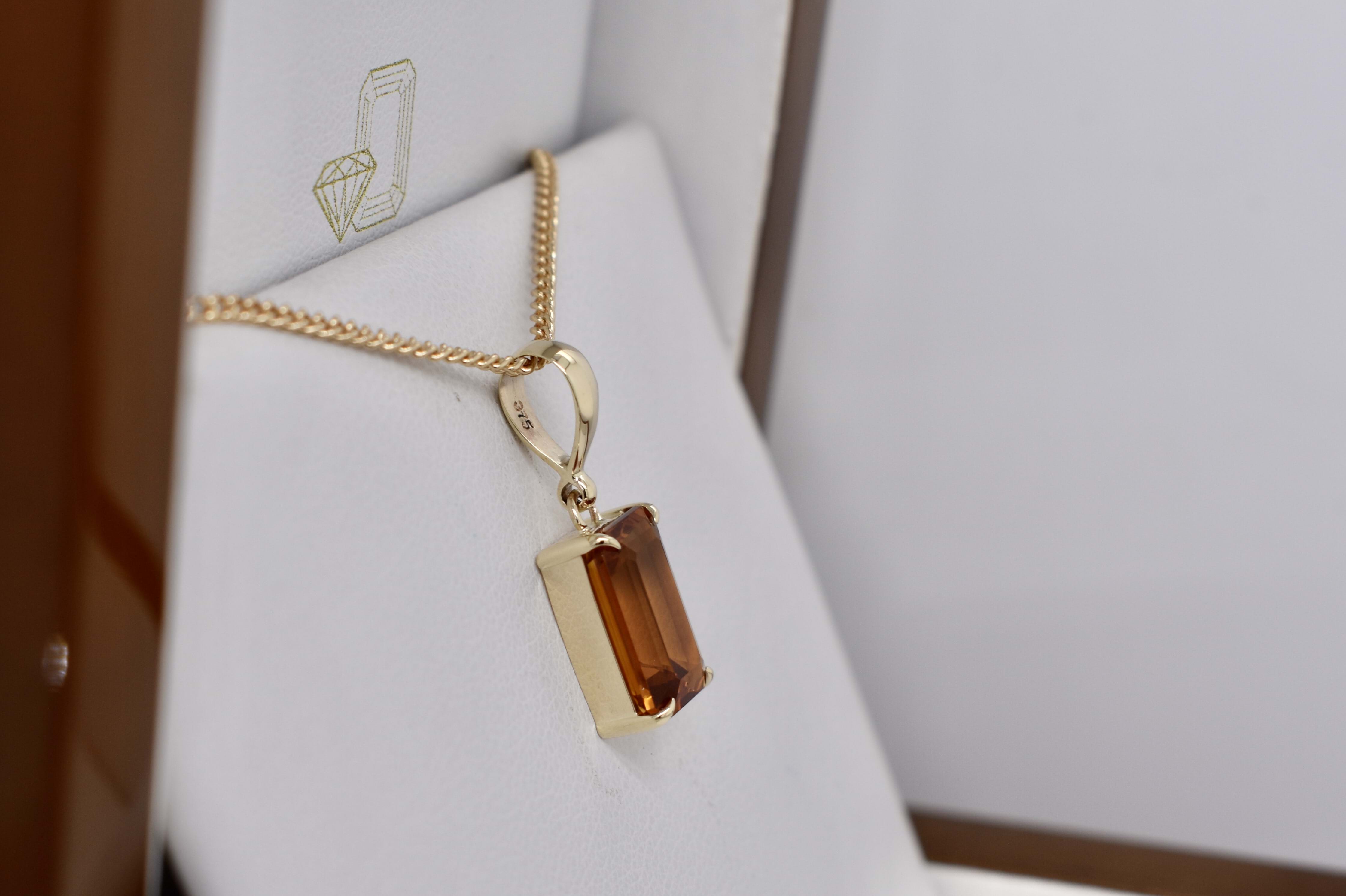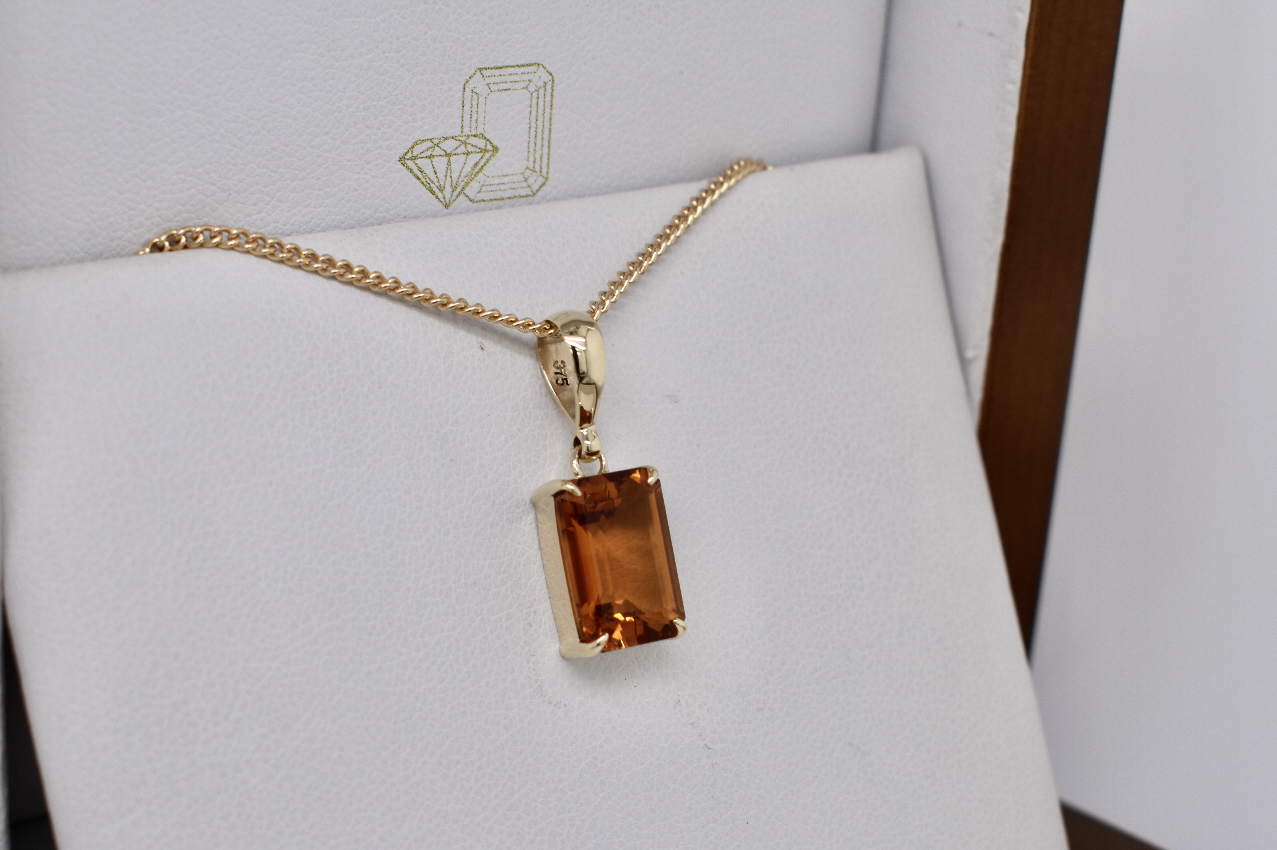 Hand crafted in 9ct yellow gold, this burnt orange emerald cut citrine pendant measures 12.4x8.5mm and is four claw set with a plain bale. Chains are available for separate purchase.