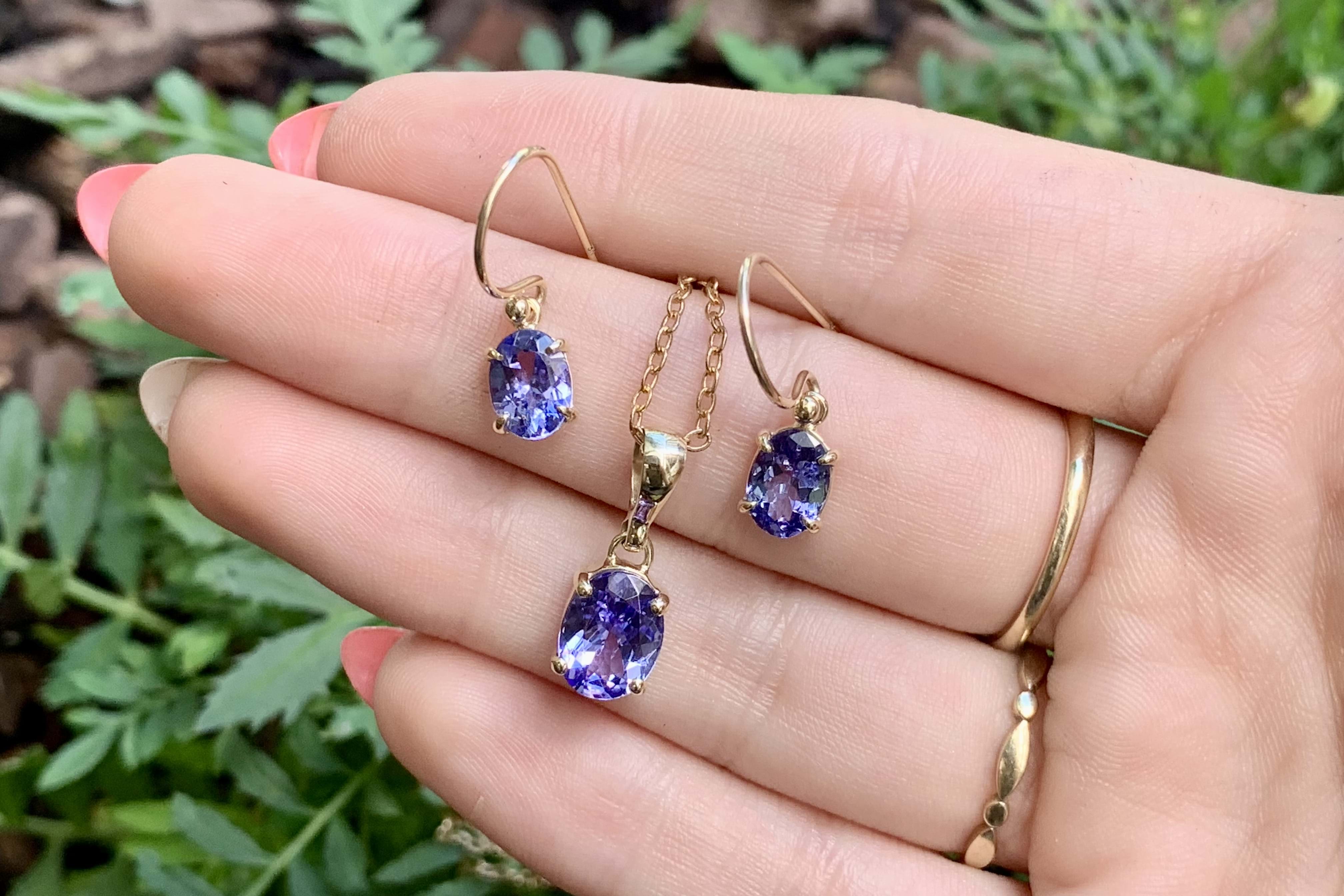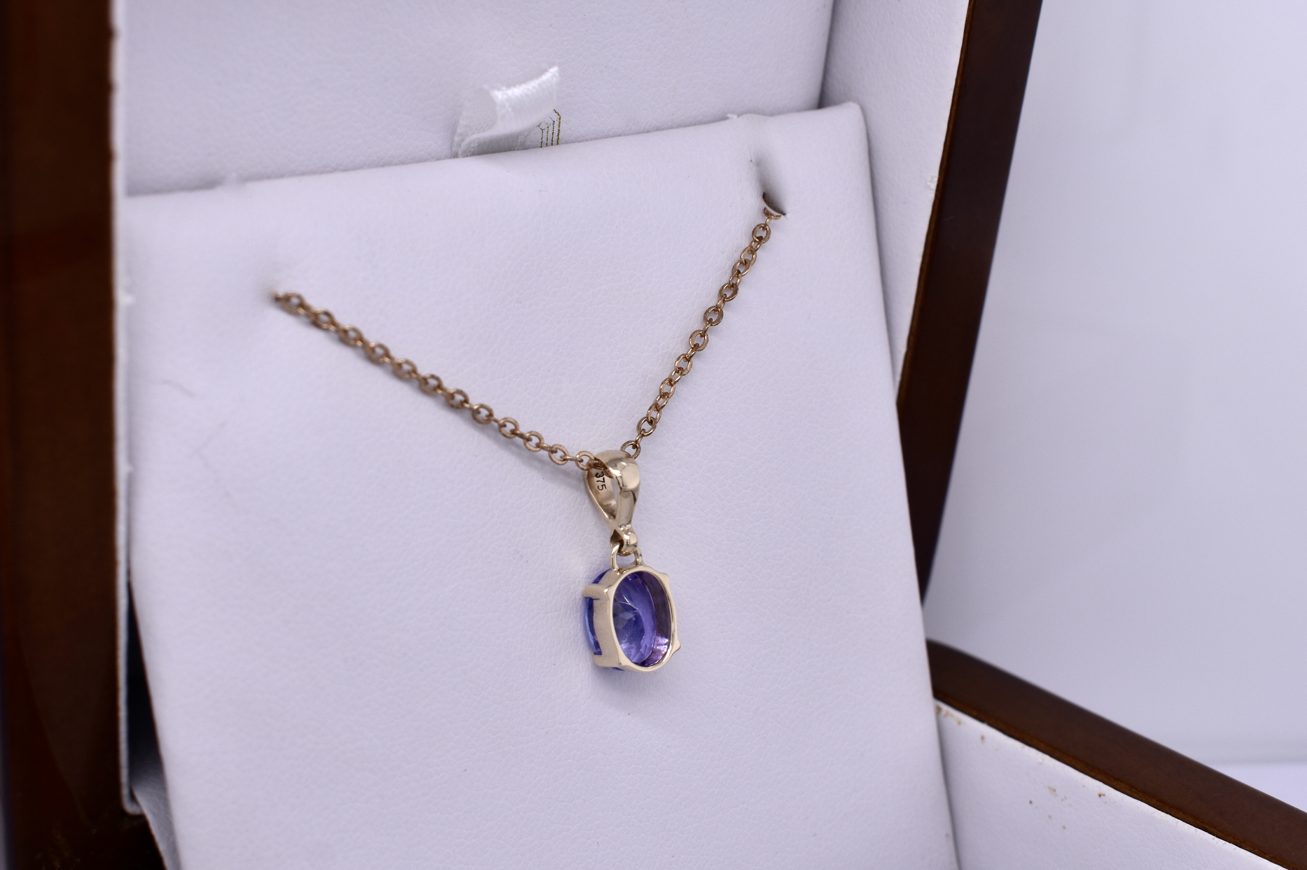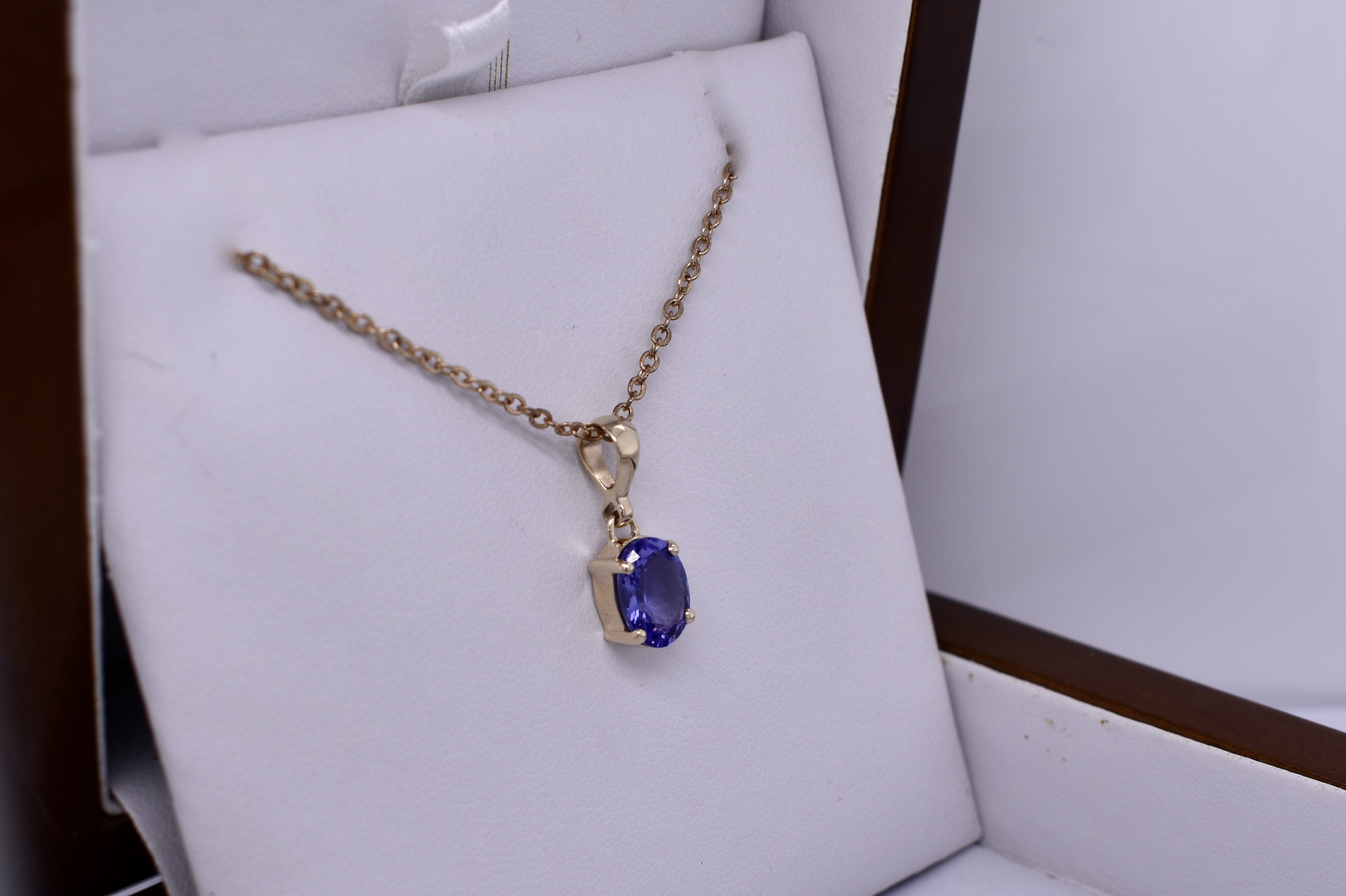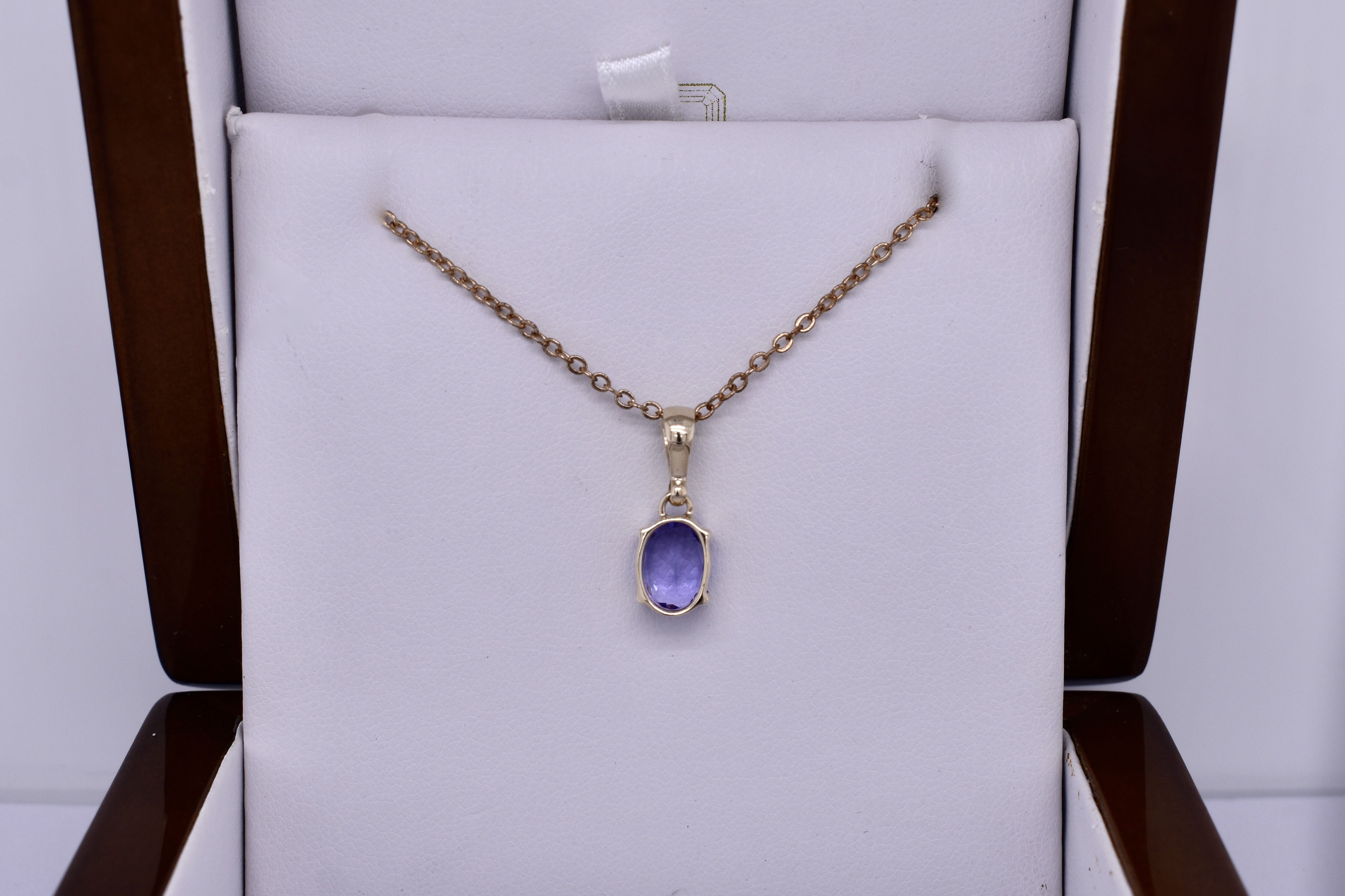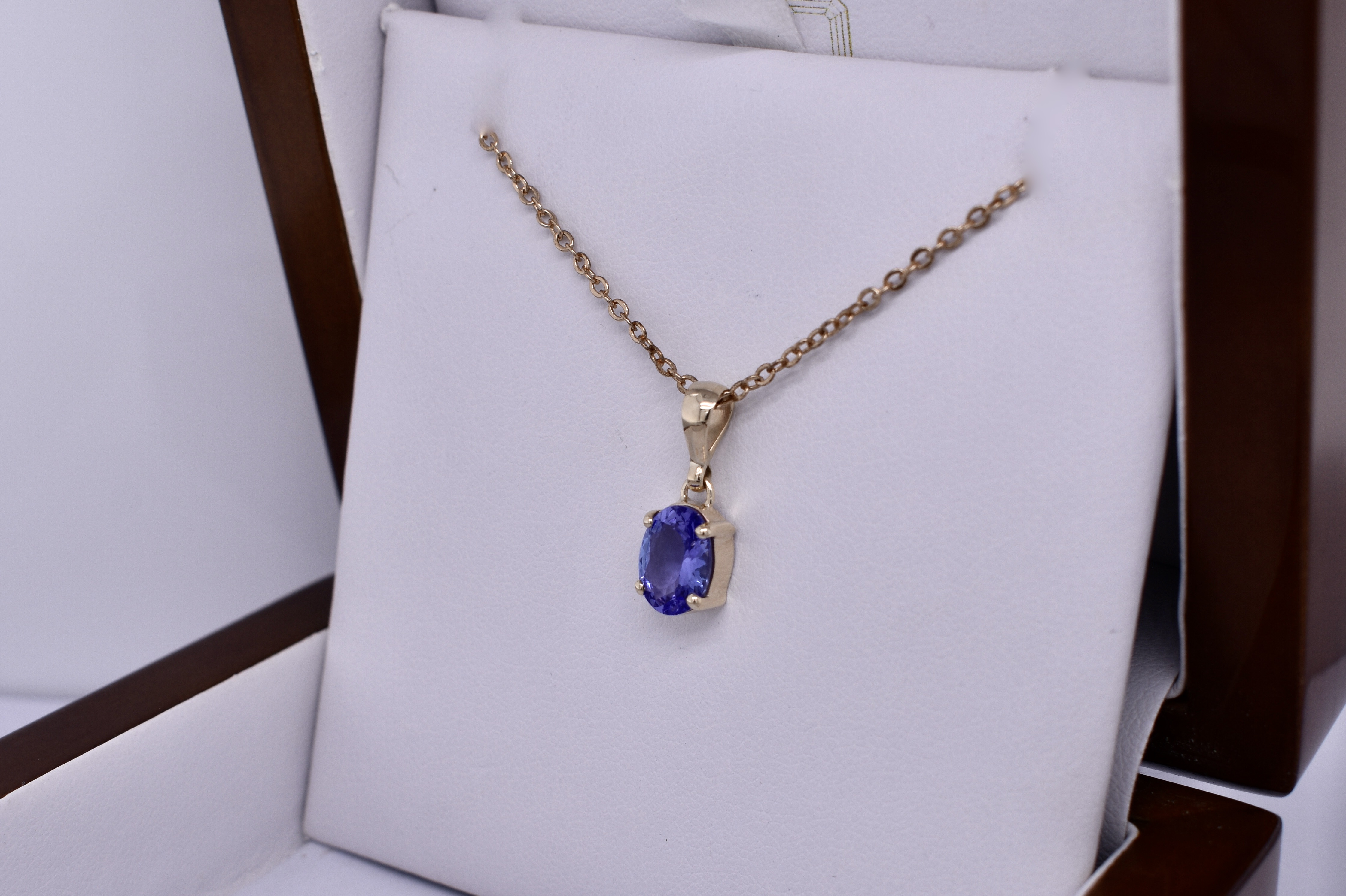 This pretty pendant features an oval tanzanite, measuring 9.1x6.9mm, four claw set in 9ct yellow gold with a plain bale. Chains available for separate purchase.