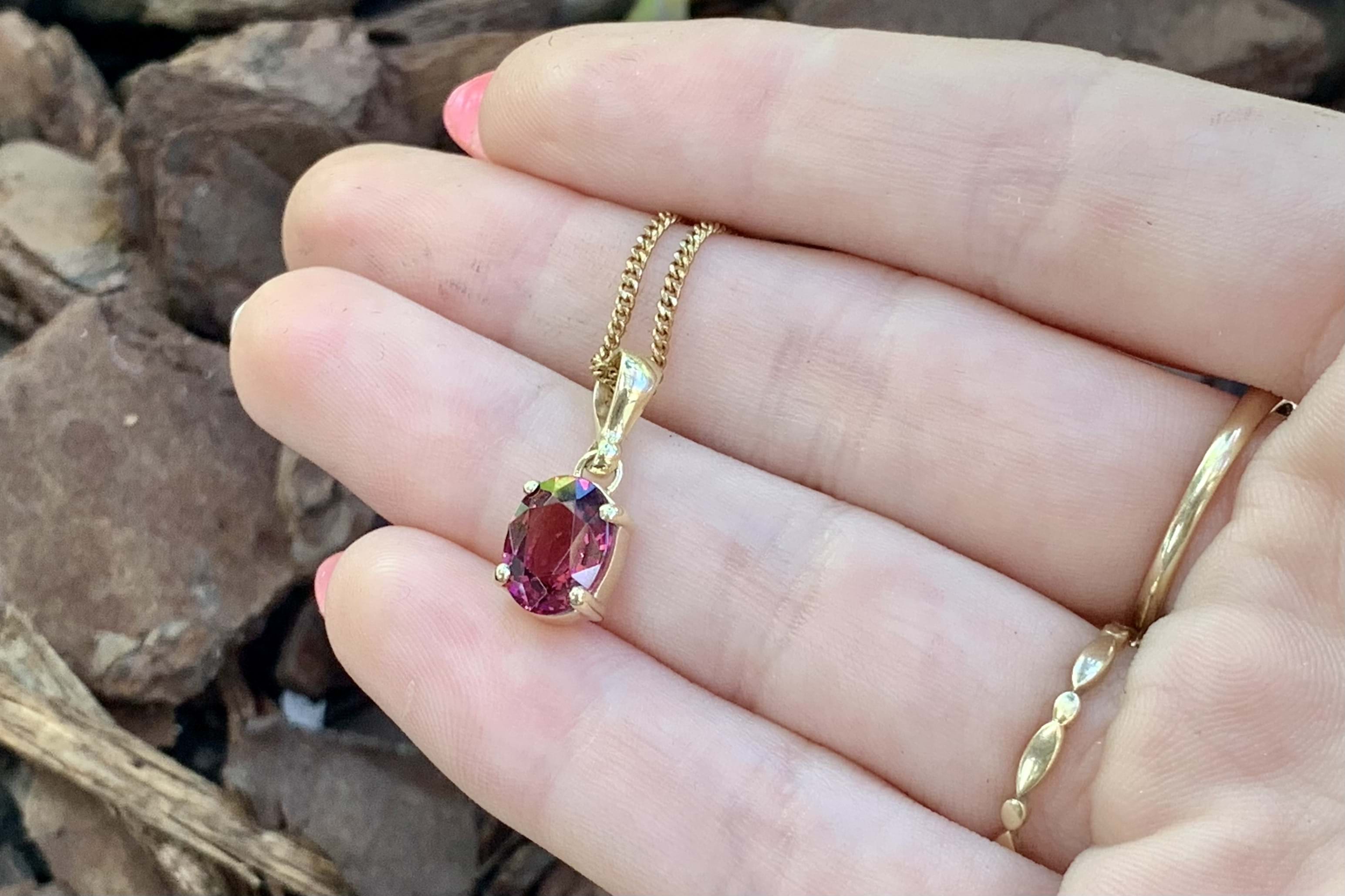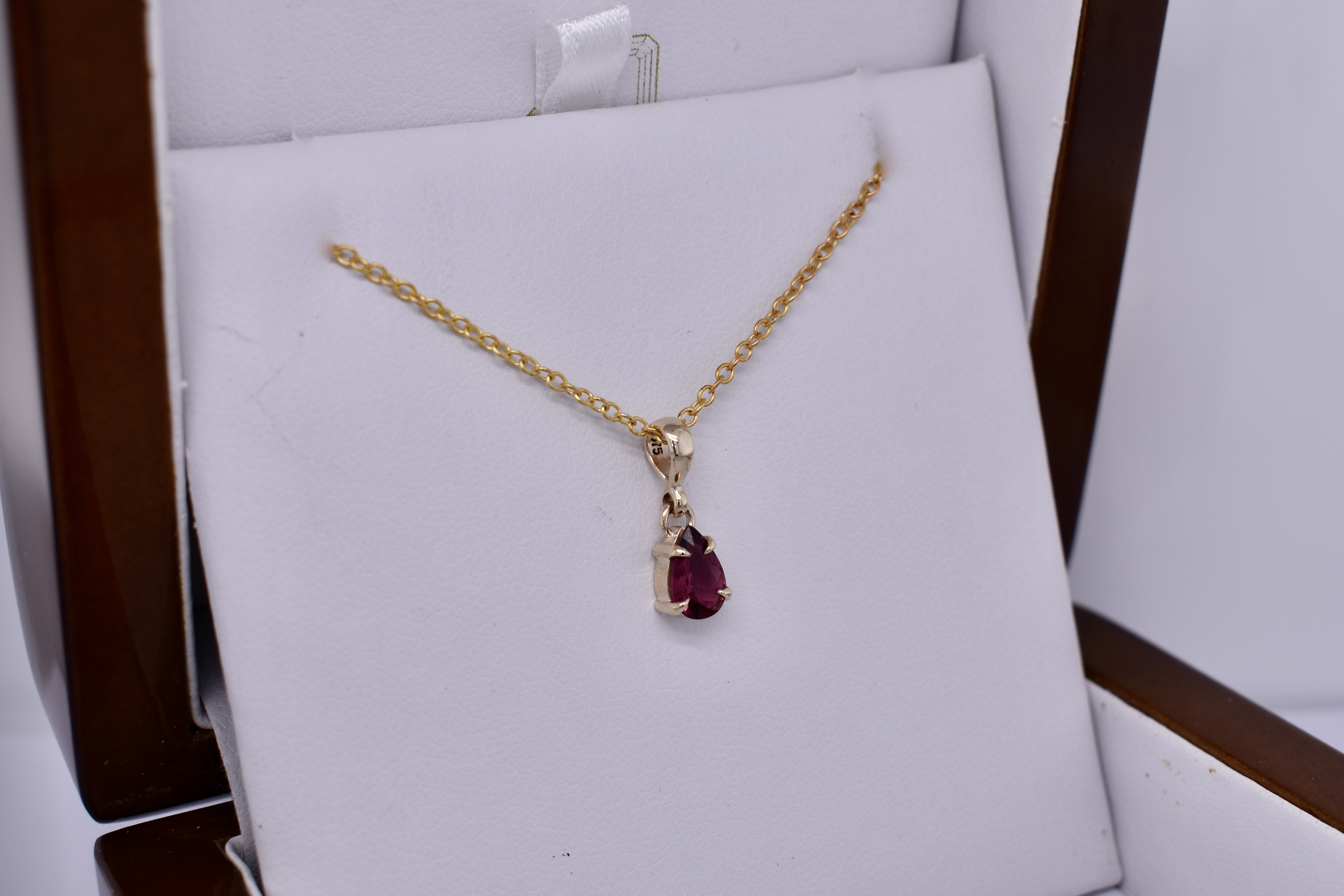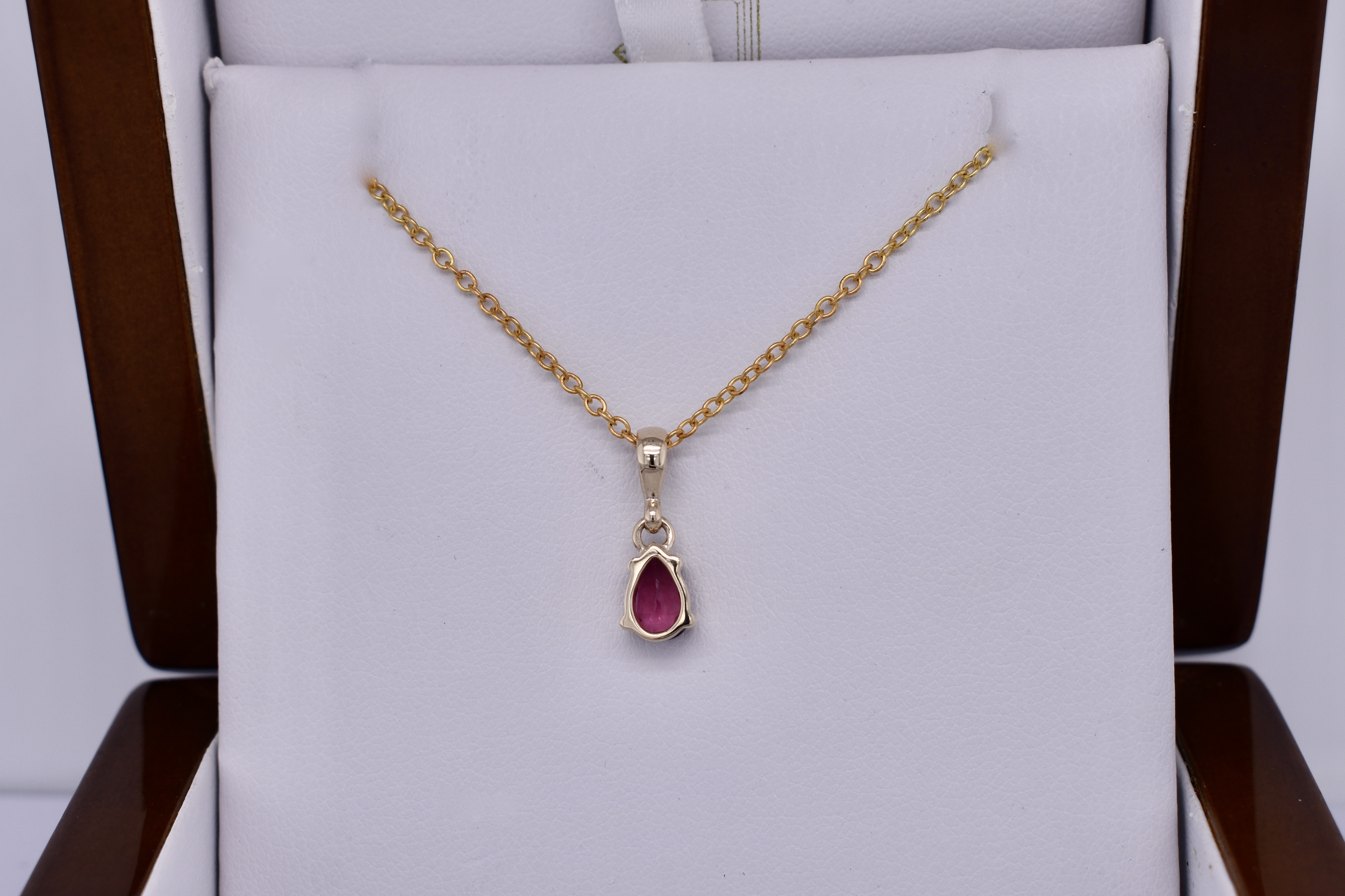 The sweetest pear shaped pink tourmaline pendant, four claw set in 9ct yellow gold. This lovely handmade pendant measures 7.1x6.0mm and is finished with a plain pendant bale. Chains available for separate purchase.