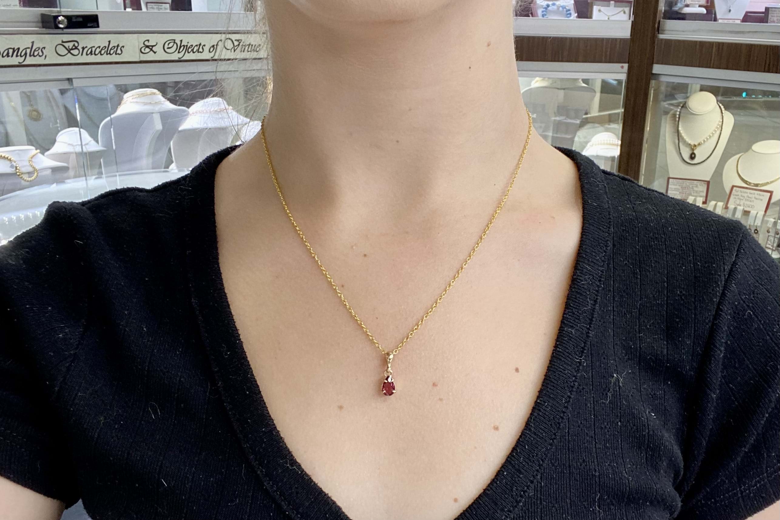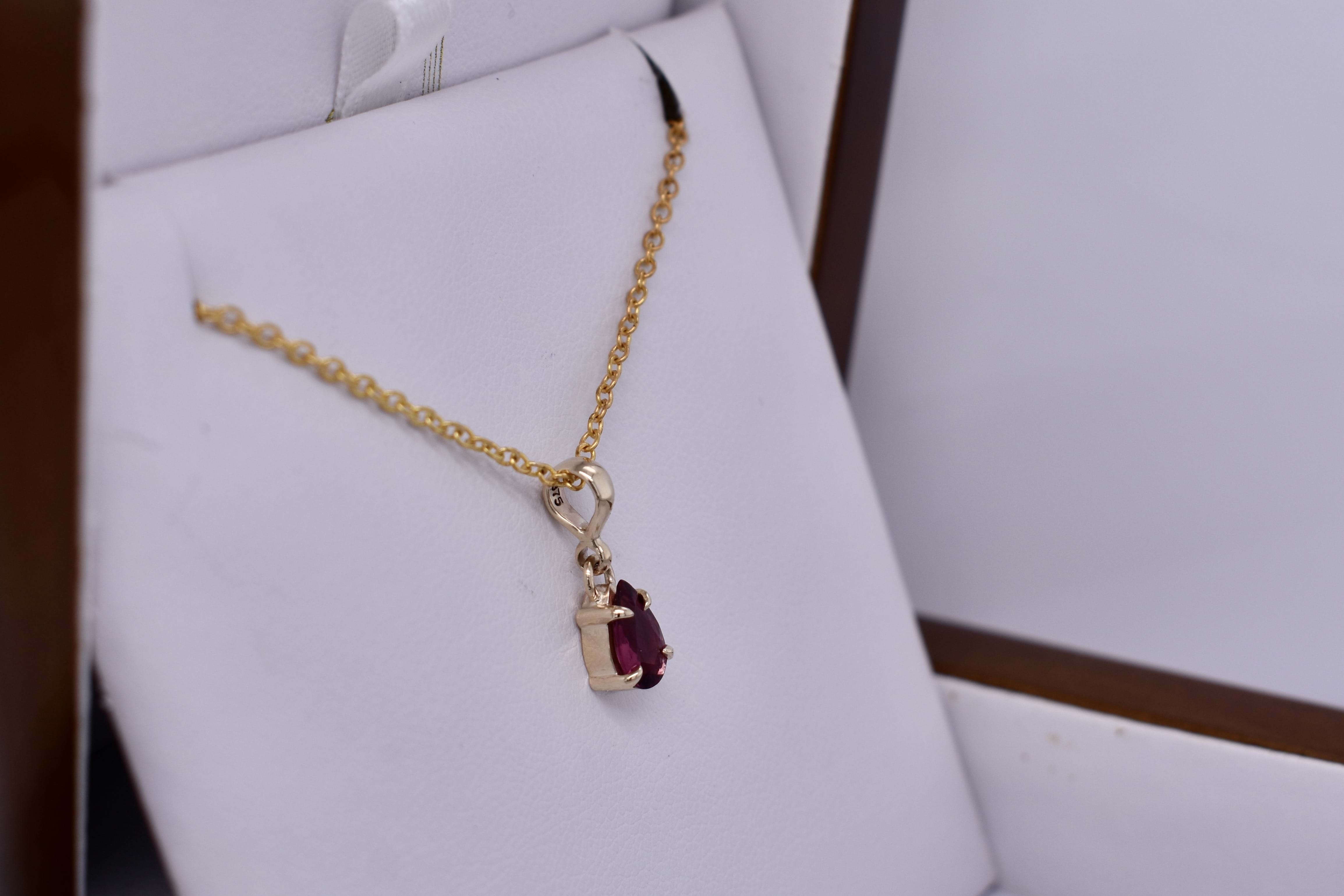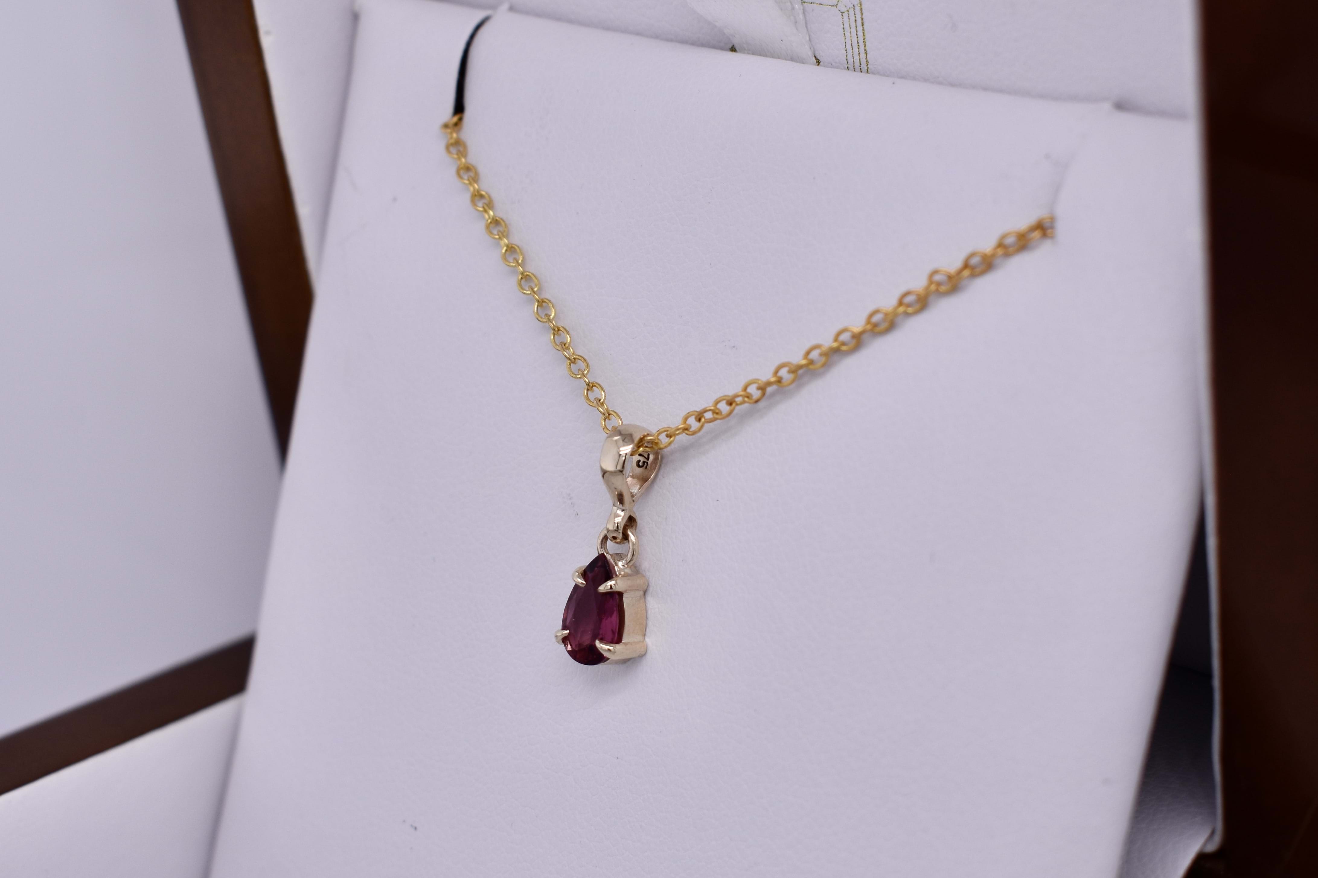 The sweetest pear shaped pink tourmaline pendant, four claw set in 9ct yellow gold. This lovely handmade pendant measures 7.1x6.0mm and is finished with a plain pendant bale. Chains available for separate purchase.