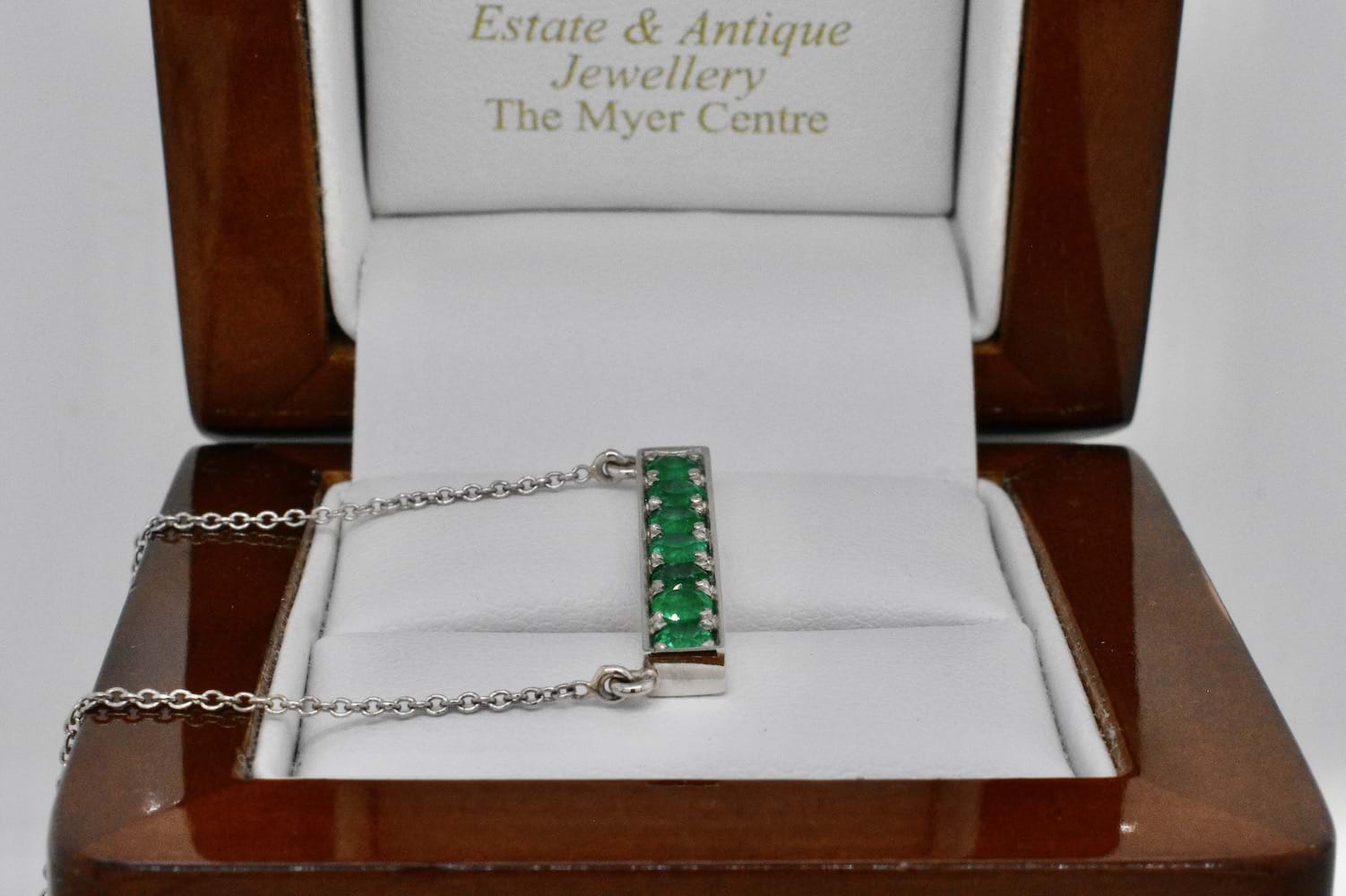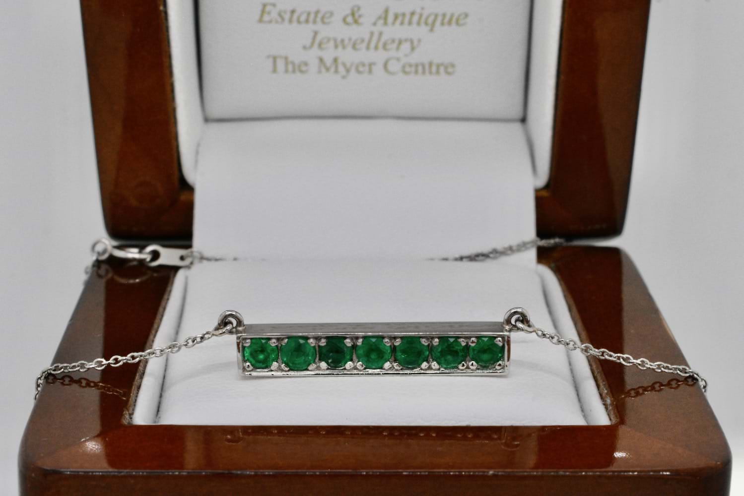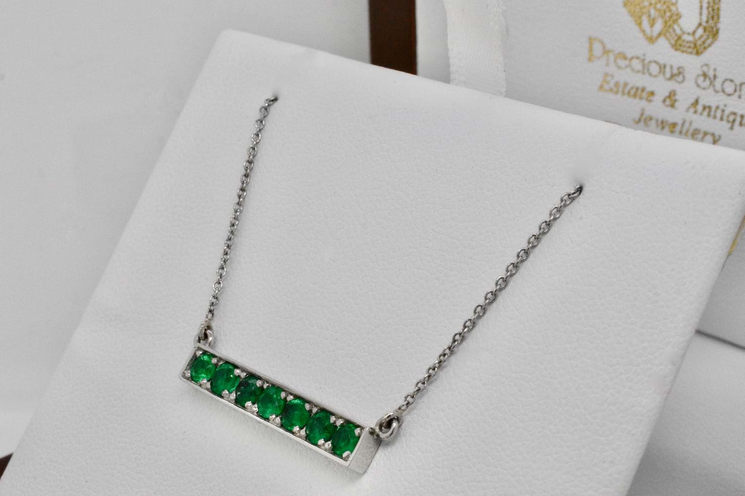 A sleek and stunning contemporary necklet crafted in platinum and set with seven bright, round mid-green emeralds grain set in a horizontal bar setting. The necklet has a fine platinum trace link chain measuring 48cm long with a bolt ring clasp. Independent Valuation Supplied