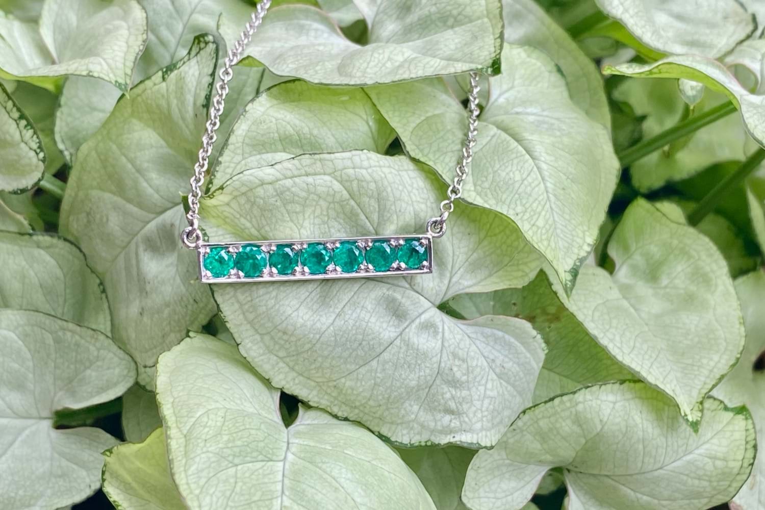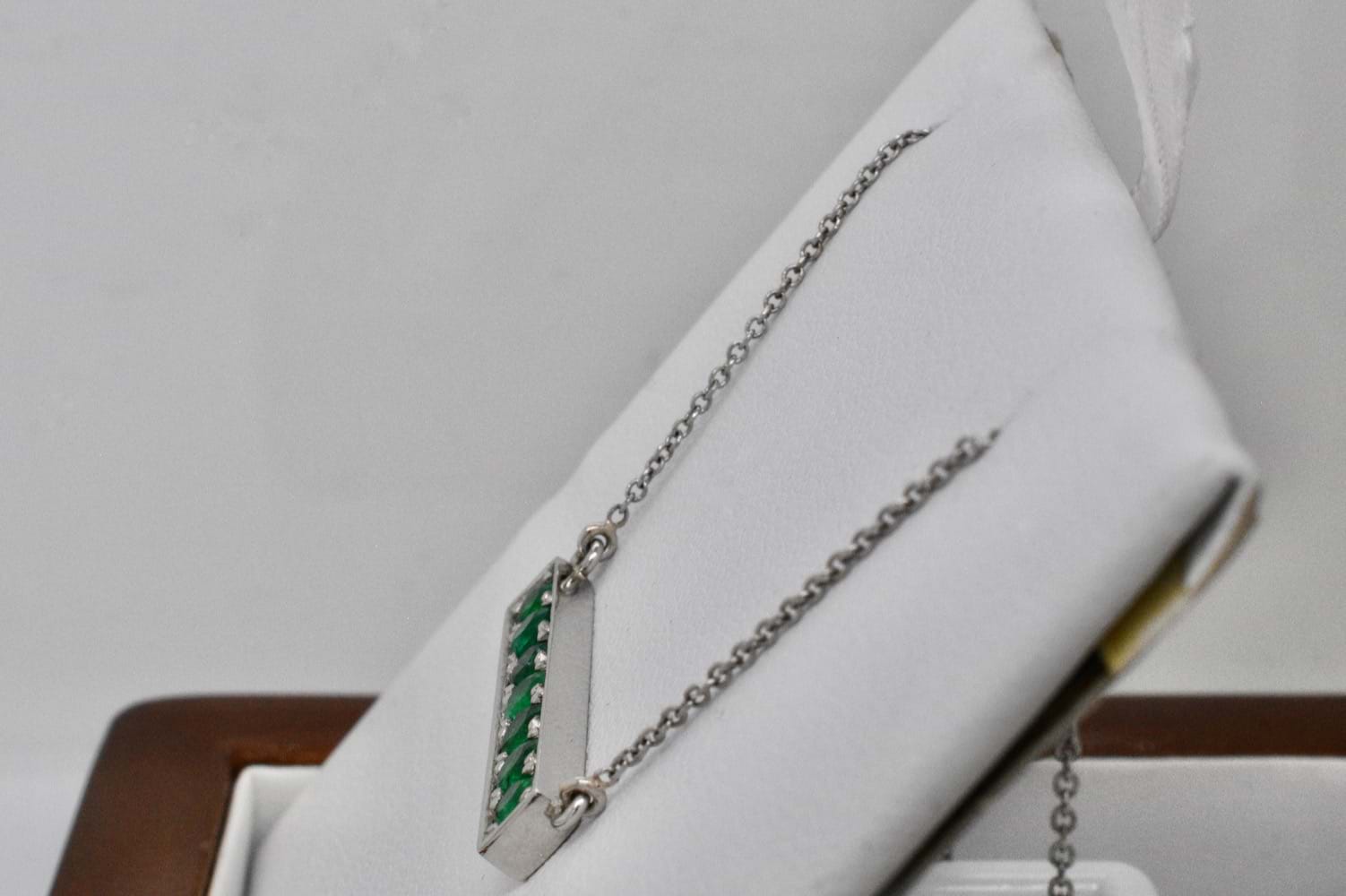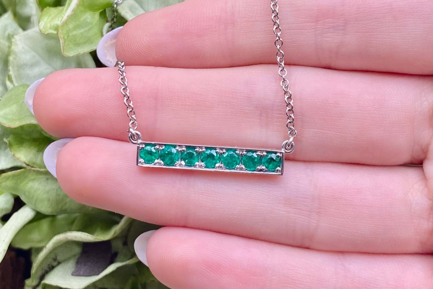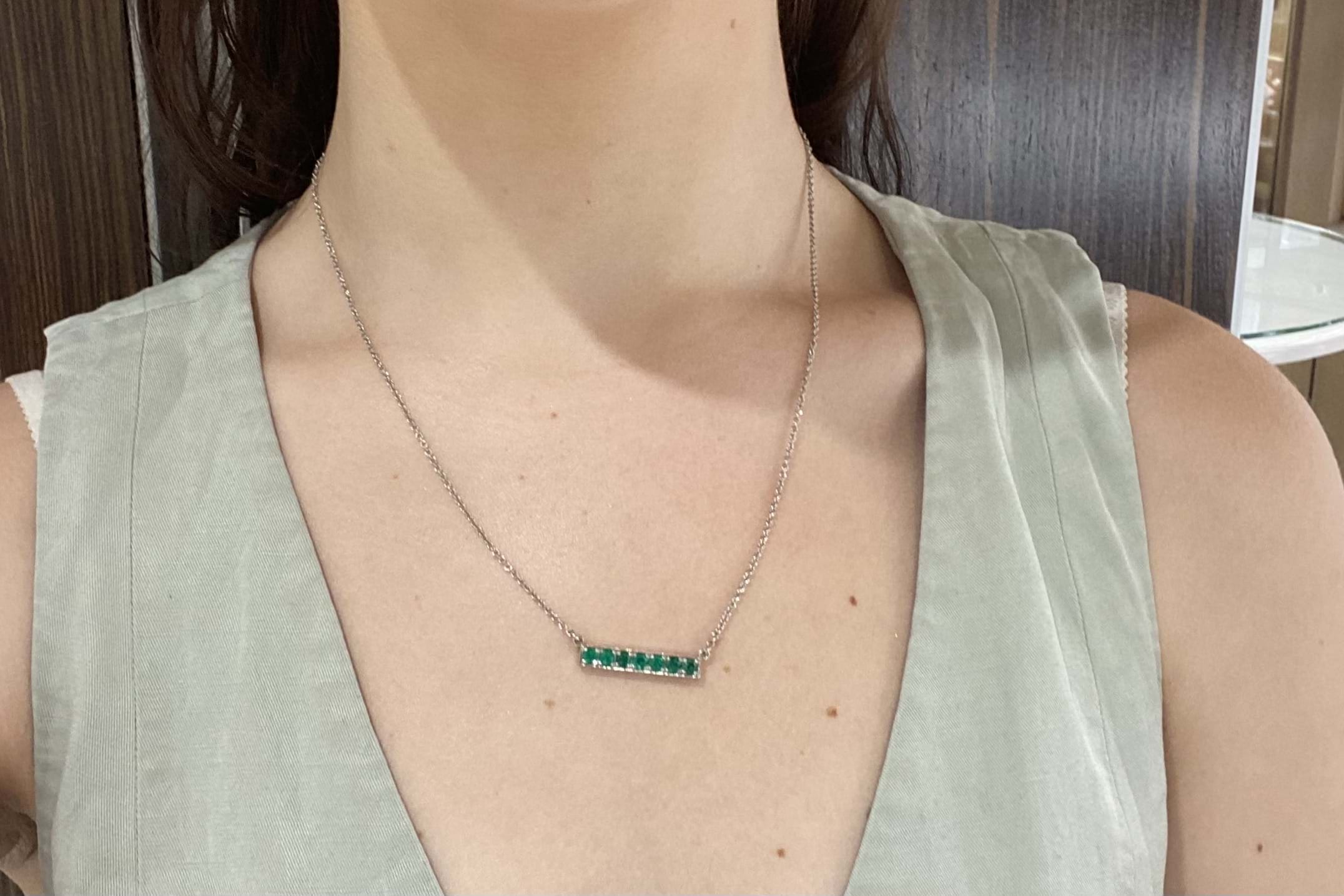 A sleek and stunning contemporary necklet crafted in platinum and set with seven bright, round mid-green emeralds grain set in a horizontal bar setting. The necklet has a fine platinum trace link chain measuring 48cm long with a bolt ring clasp. Independent Valuation Supplied