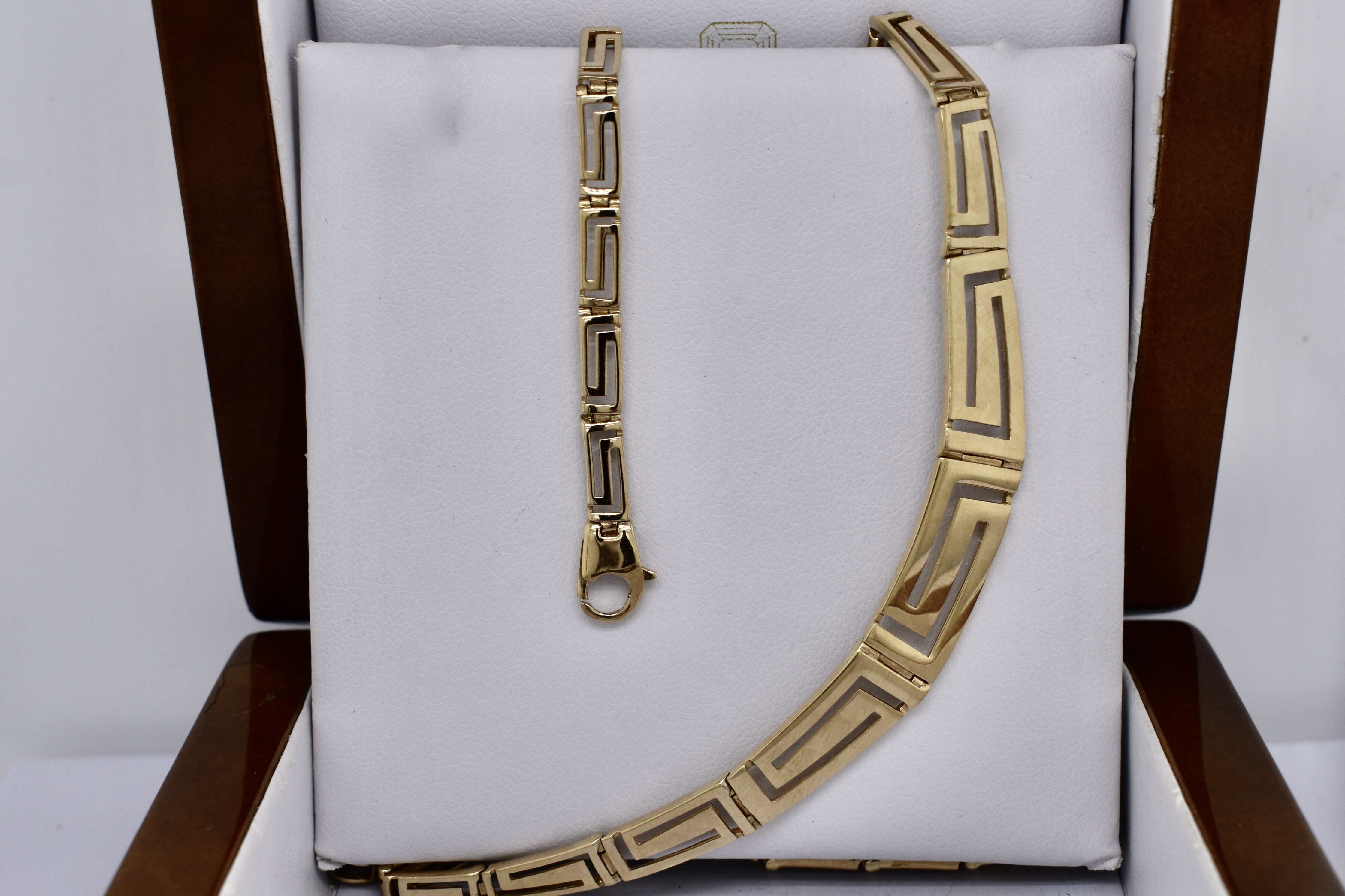 Absolutely stunning, this vintage 9ct yellow gold Greek key design necklet with graduated panels, measures 45cm long. Finished with a simple parrot clasp. Weighing 15.32 grams.