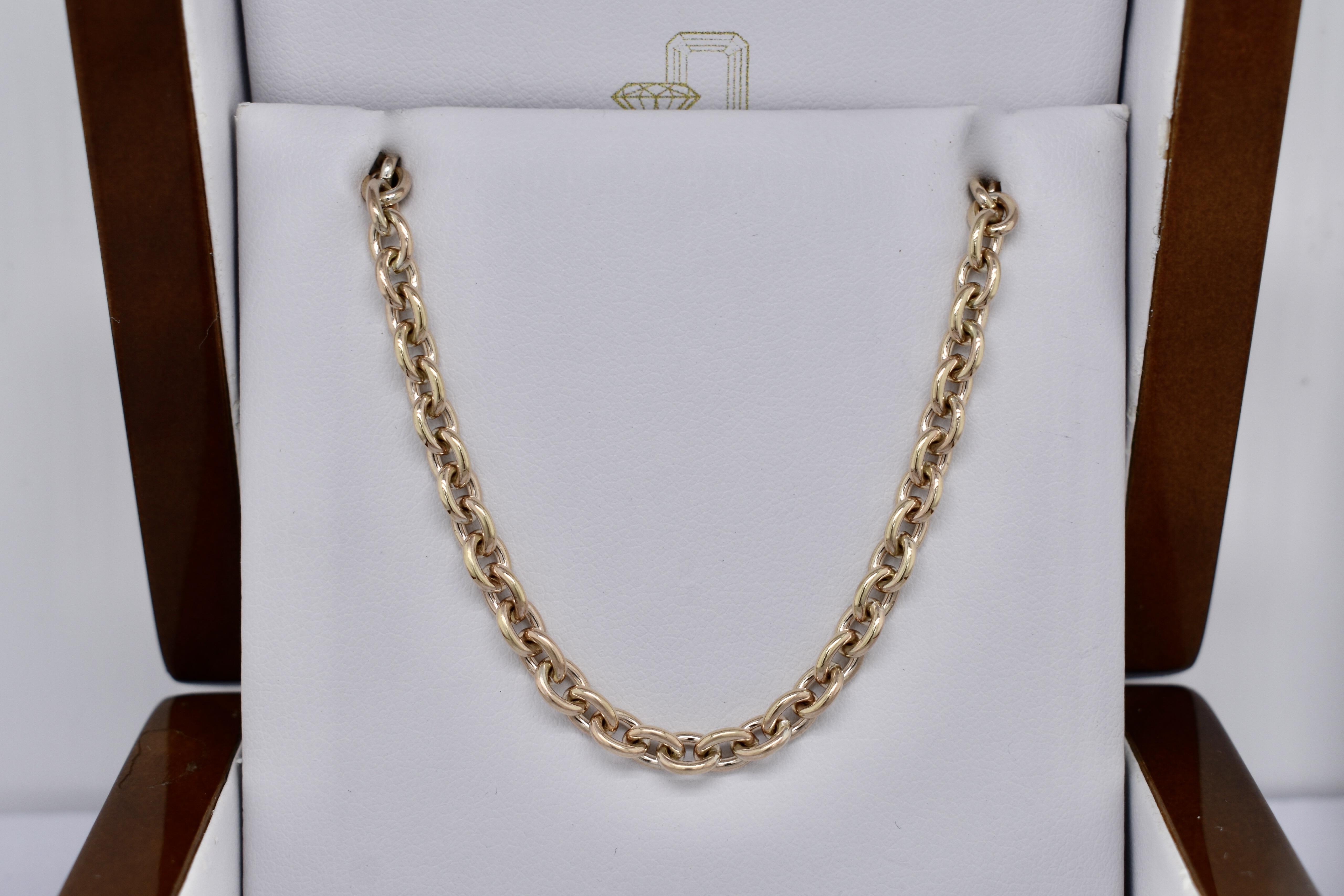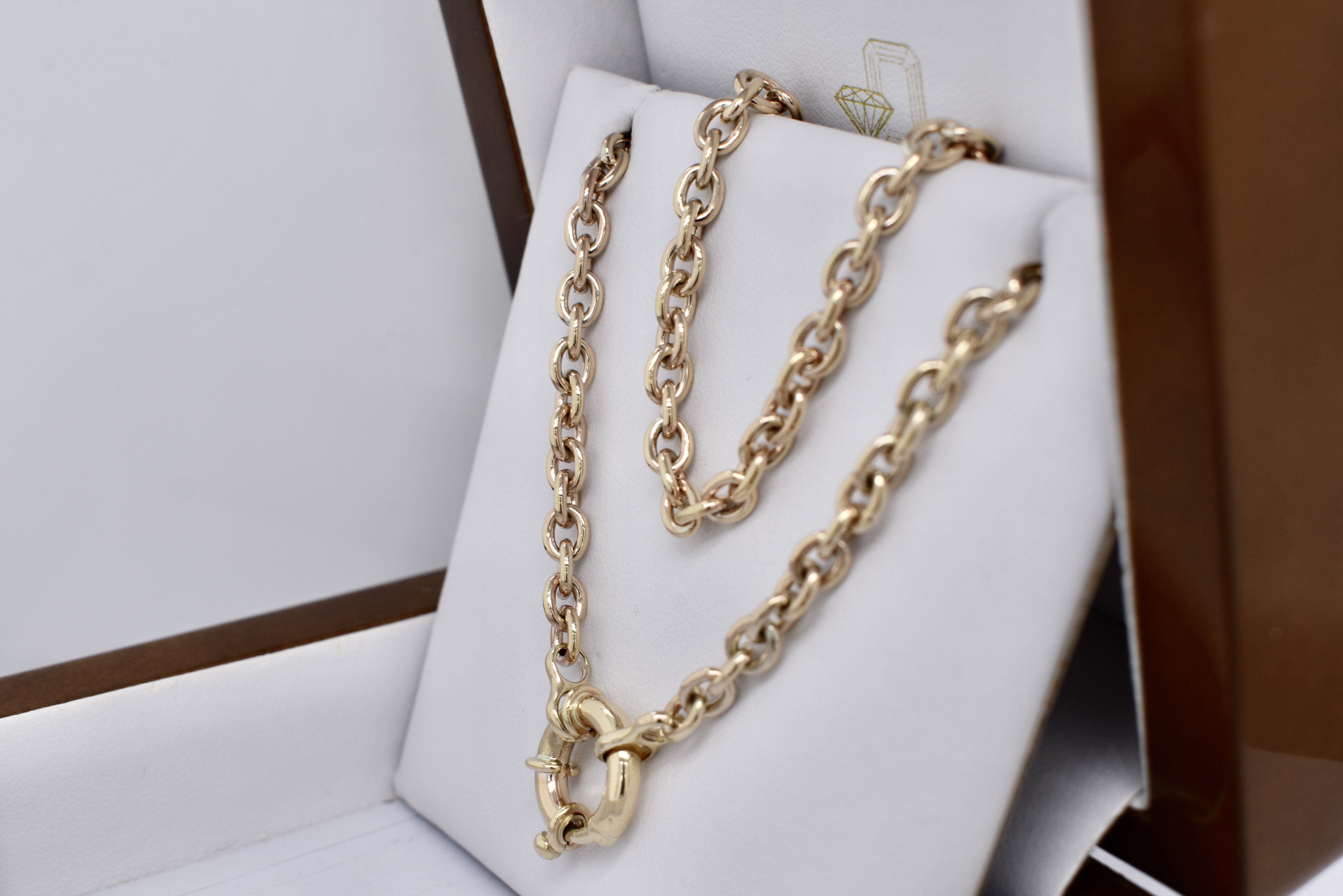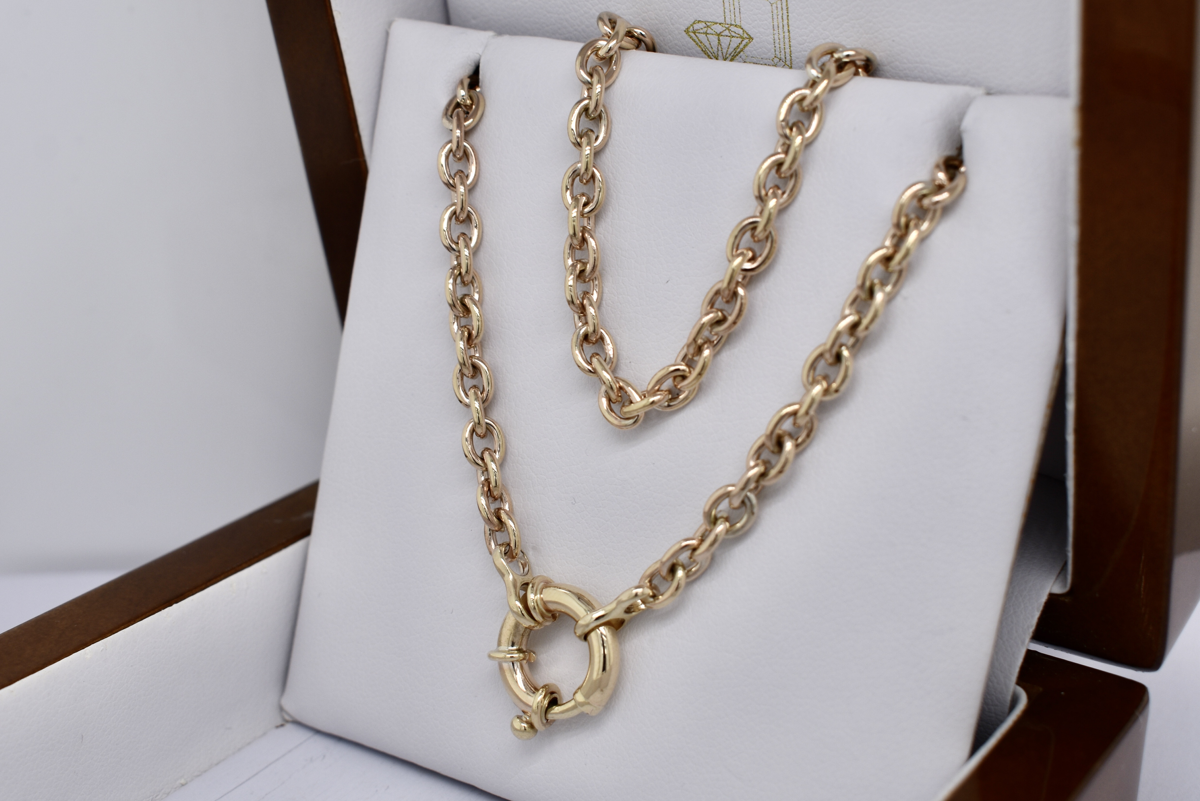 Hand crafted by our amazing goldsmith, this 9ct yellow gold LBB cable link chain measures 55cm long and 1.2mm wide and is completed with a bolt ring clasp. Weighs 28.74 grams.