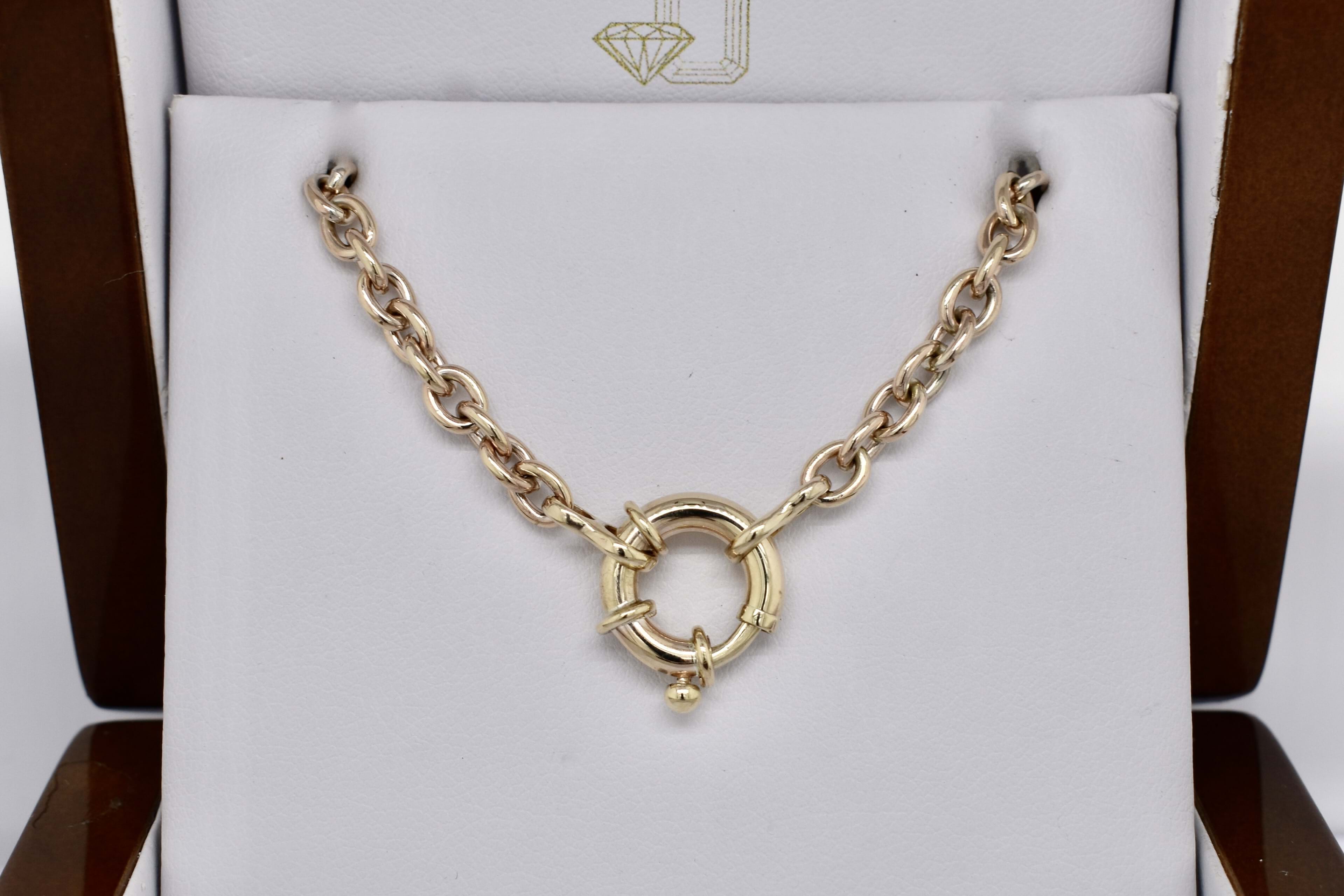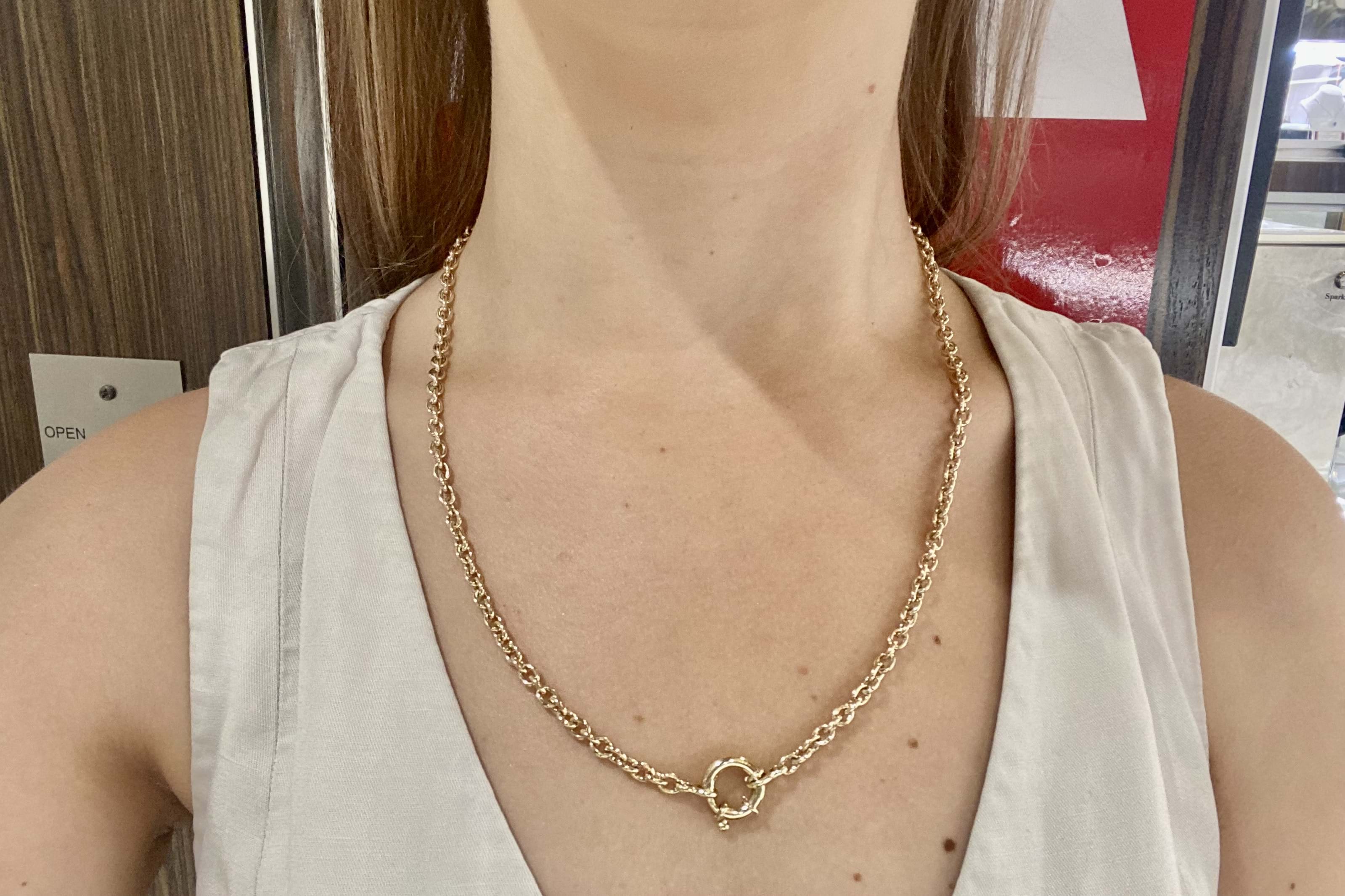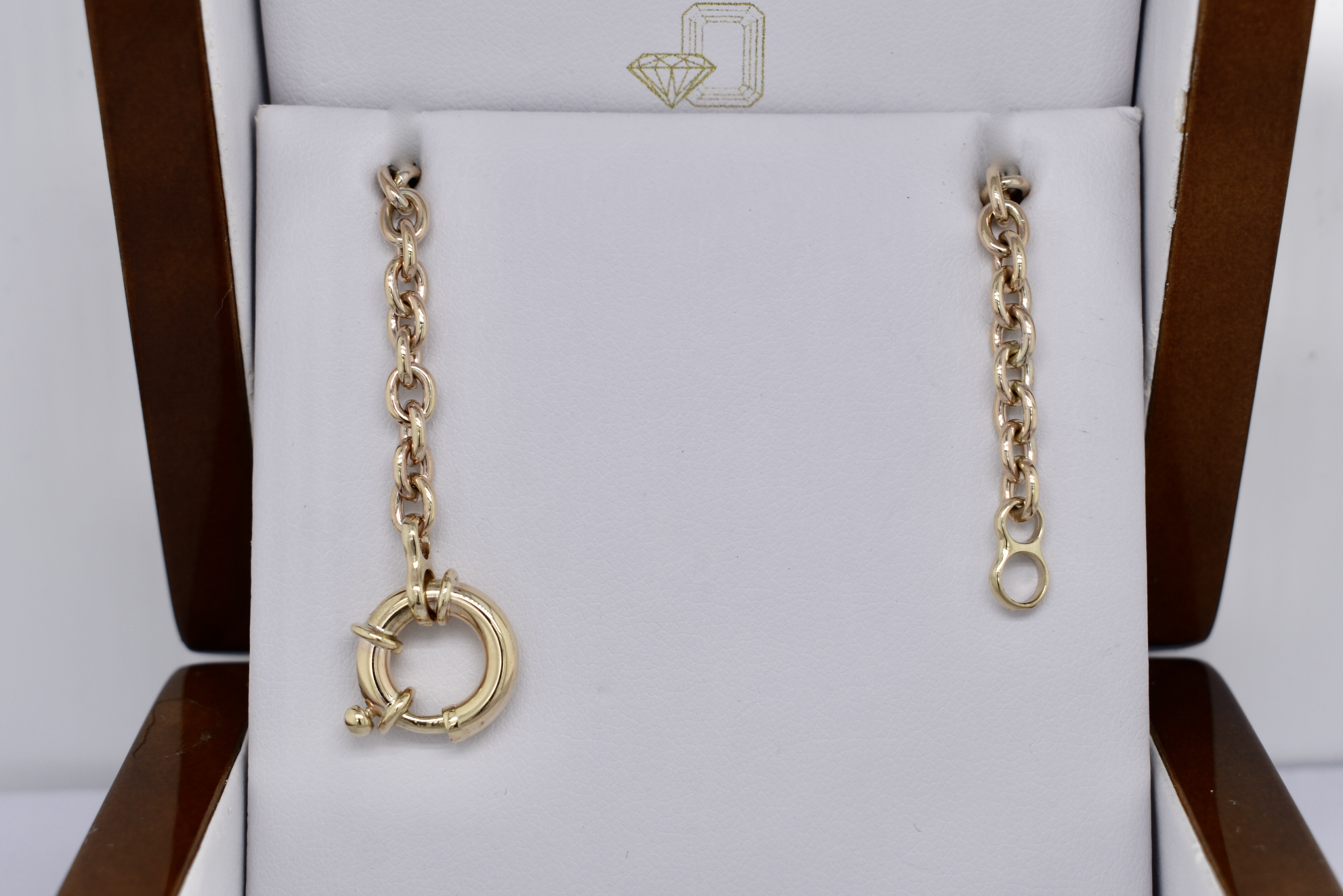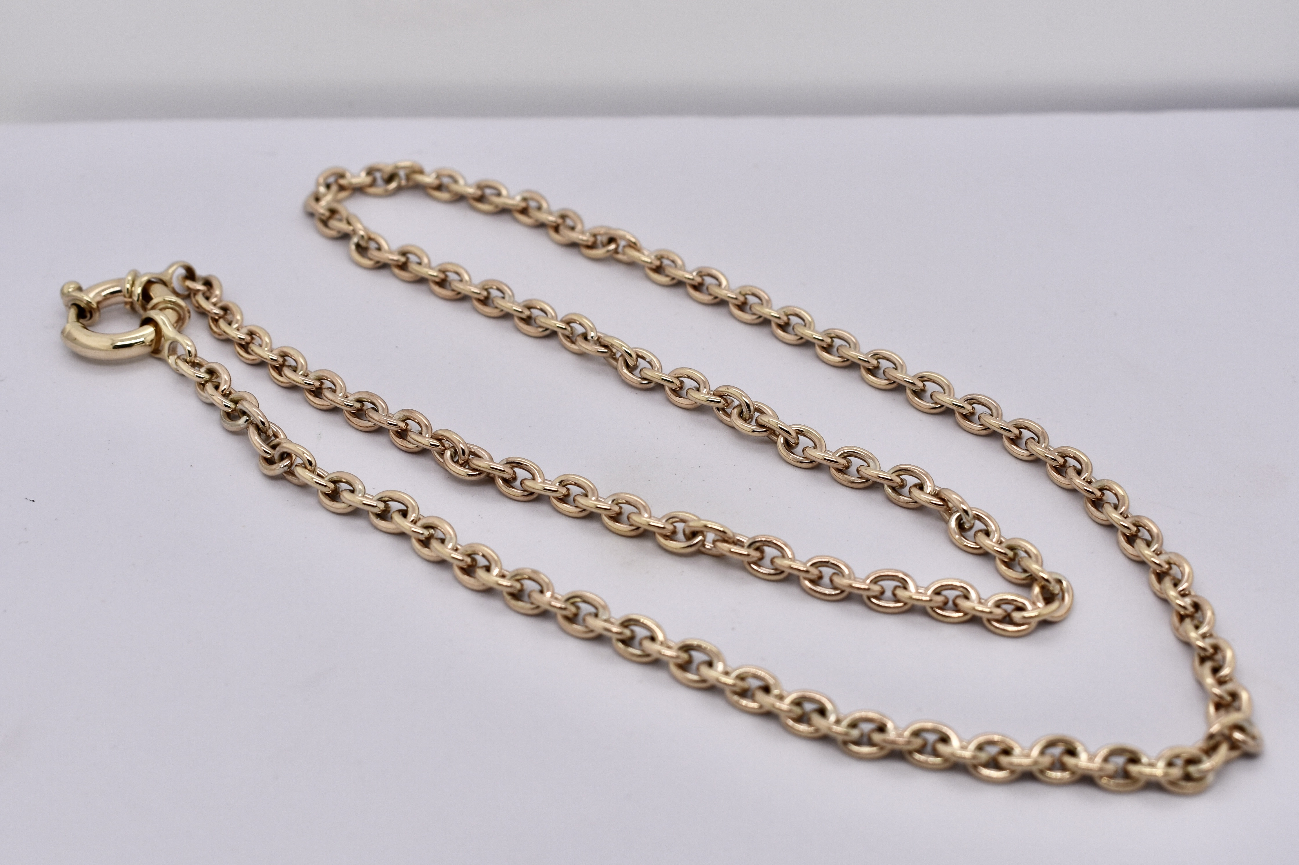 Hand crafted by our amazing goldsmith, this 9ct yellow gold LBB cable link chain measures 55cm long and 1.2mm wide and is completed with a bolt ring clasp. Weighs 28.74 grams.