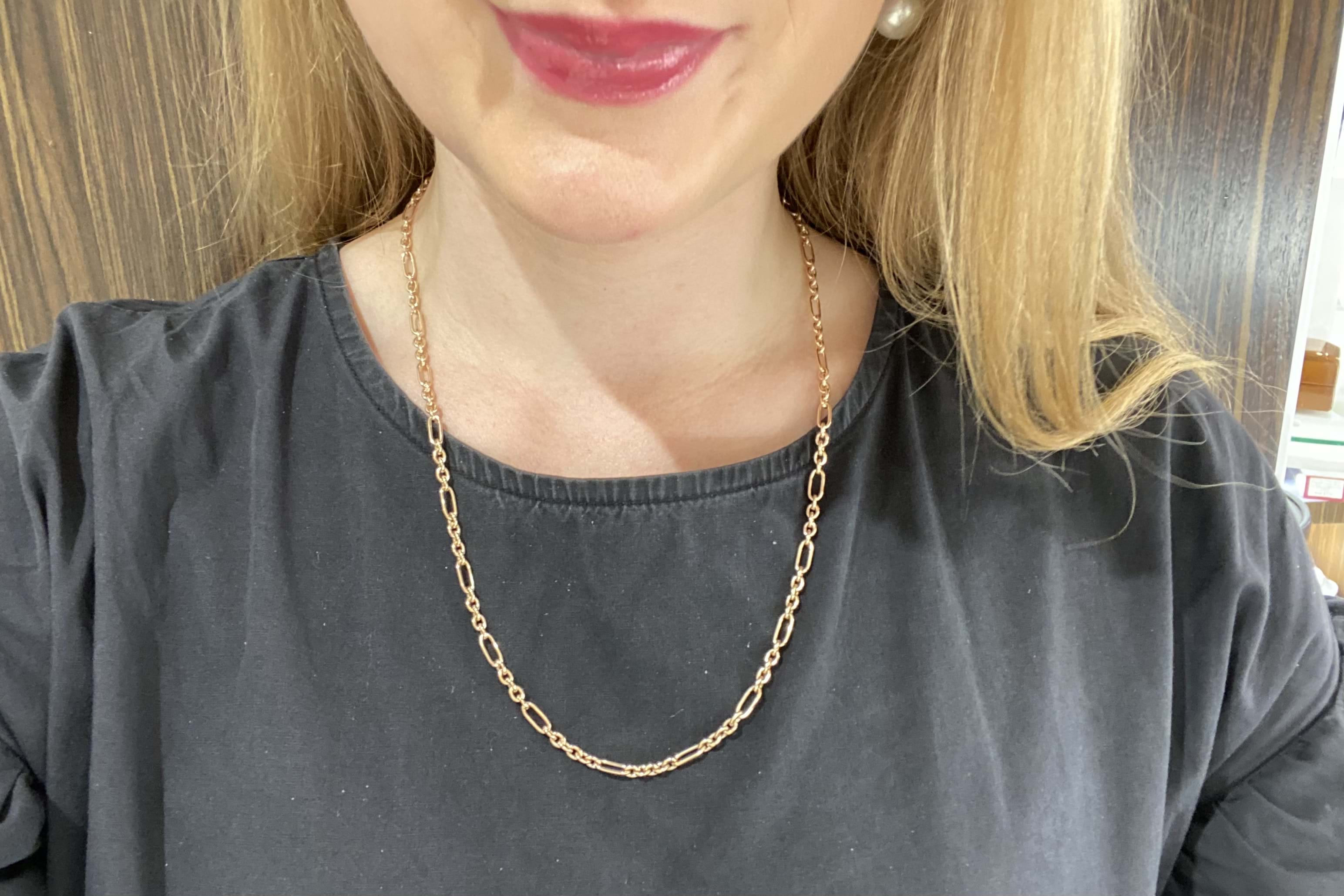 This beautiful classic chain was handmade by our goldsmith in 9ct yellow gold in this pretty 5/1 Figaro cable link (5 short, 1 long link). It has a simple parrot clasp. Chain measures 54cm long and weighs 15.63grams. This chain is the perfect layering piece in a stack or looks amazing alone.