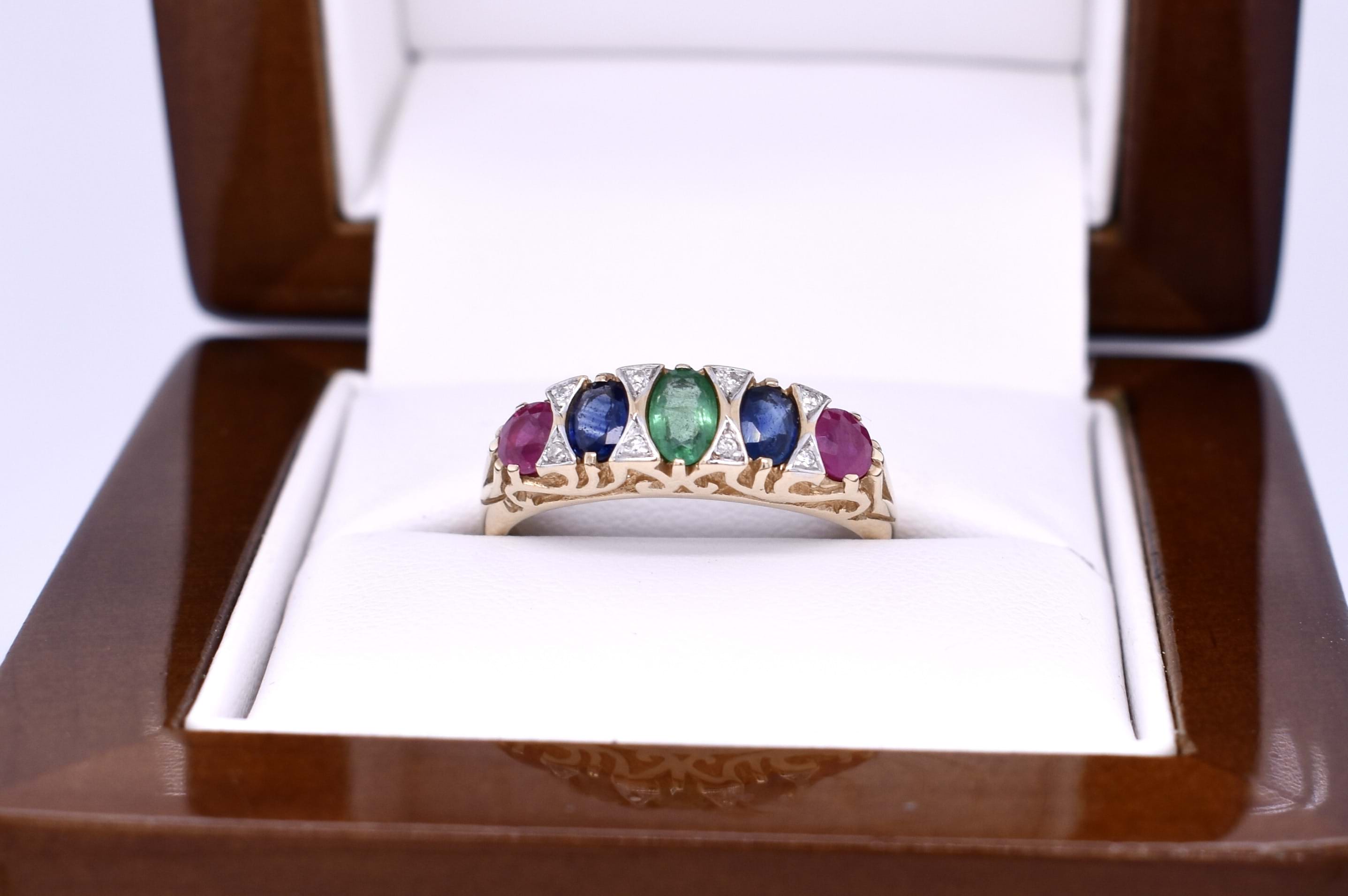 9ct Yellow Gold Sapphire, Ruby, Emerald & Diamond Bridge Ring (N+)