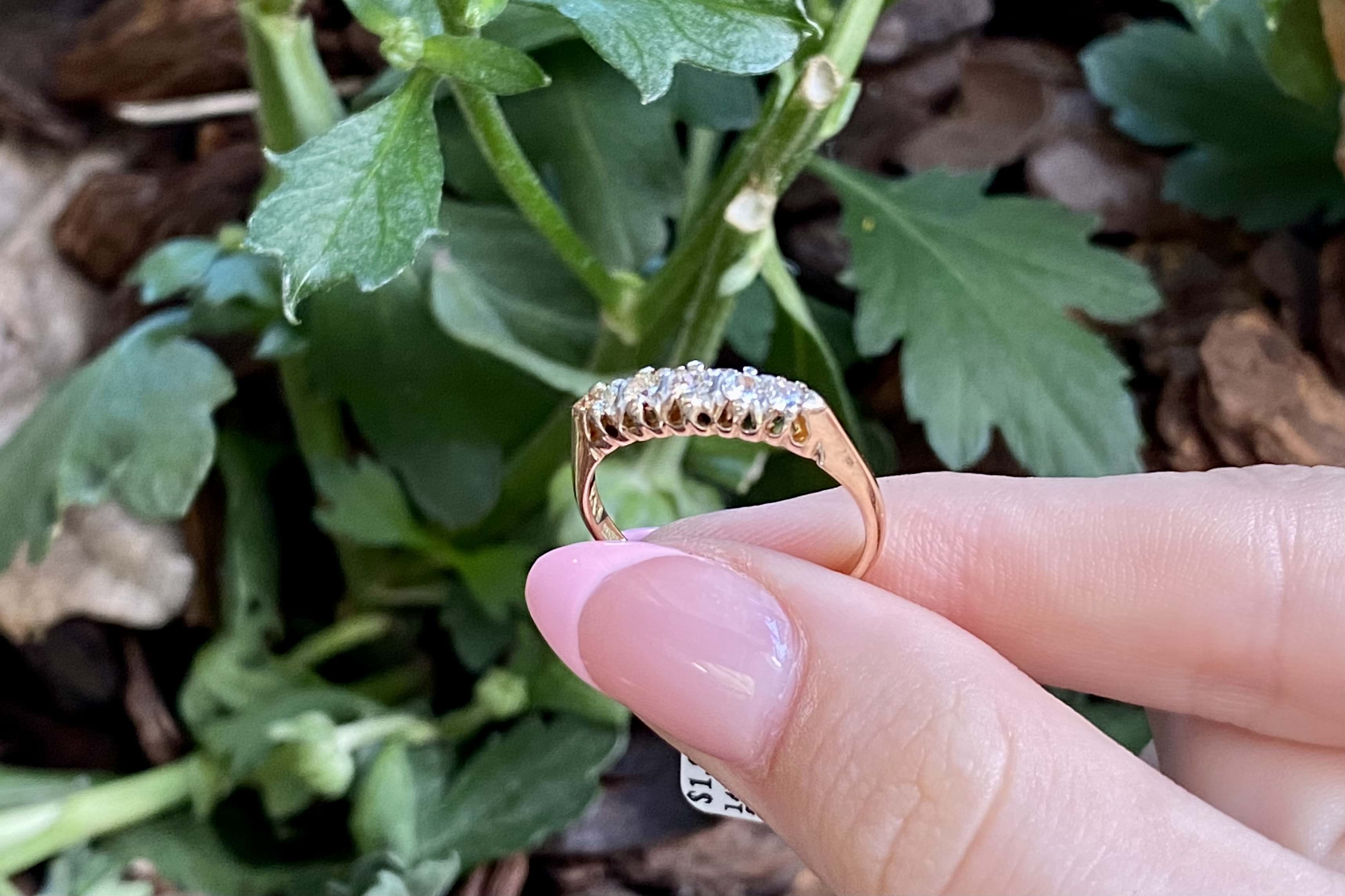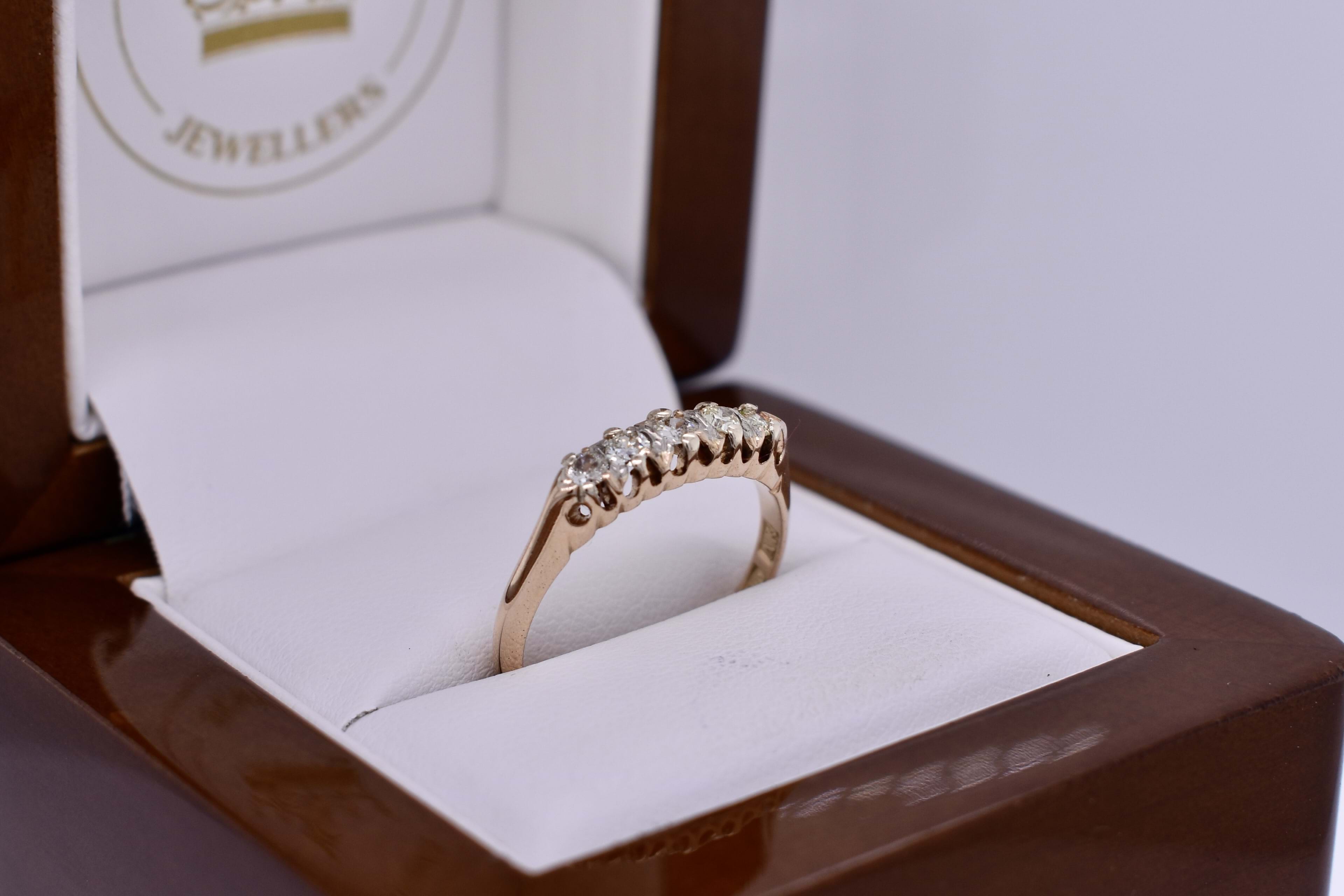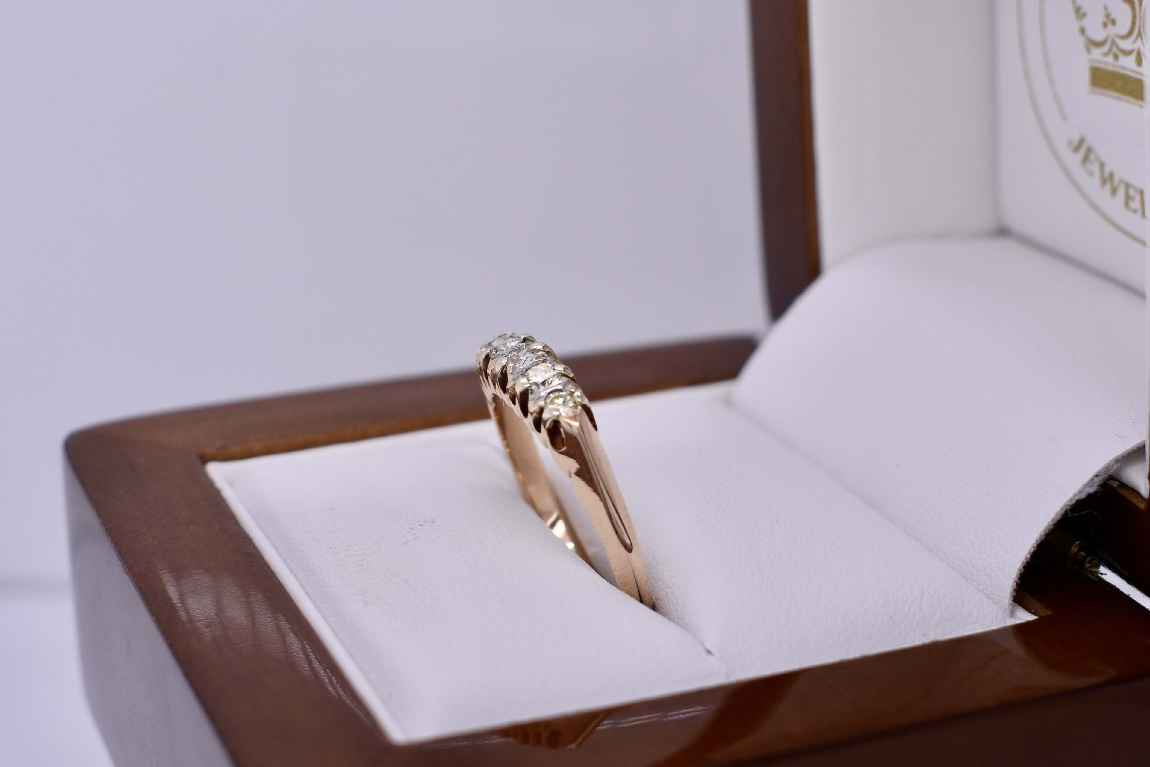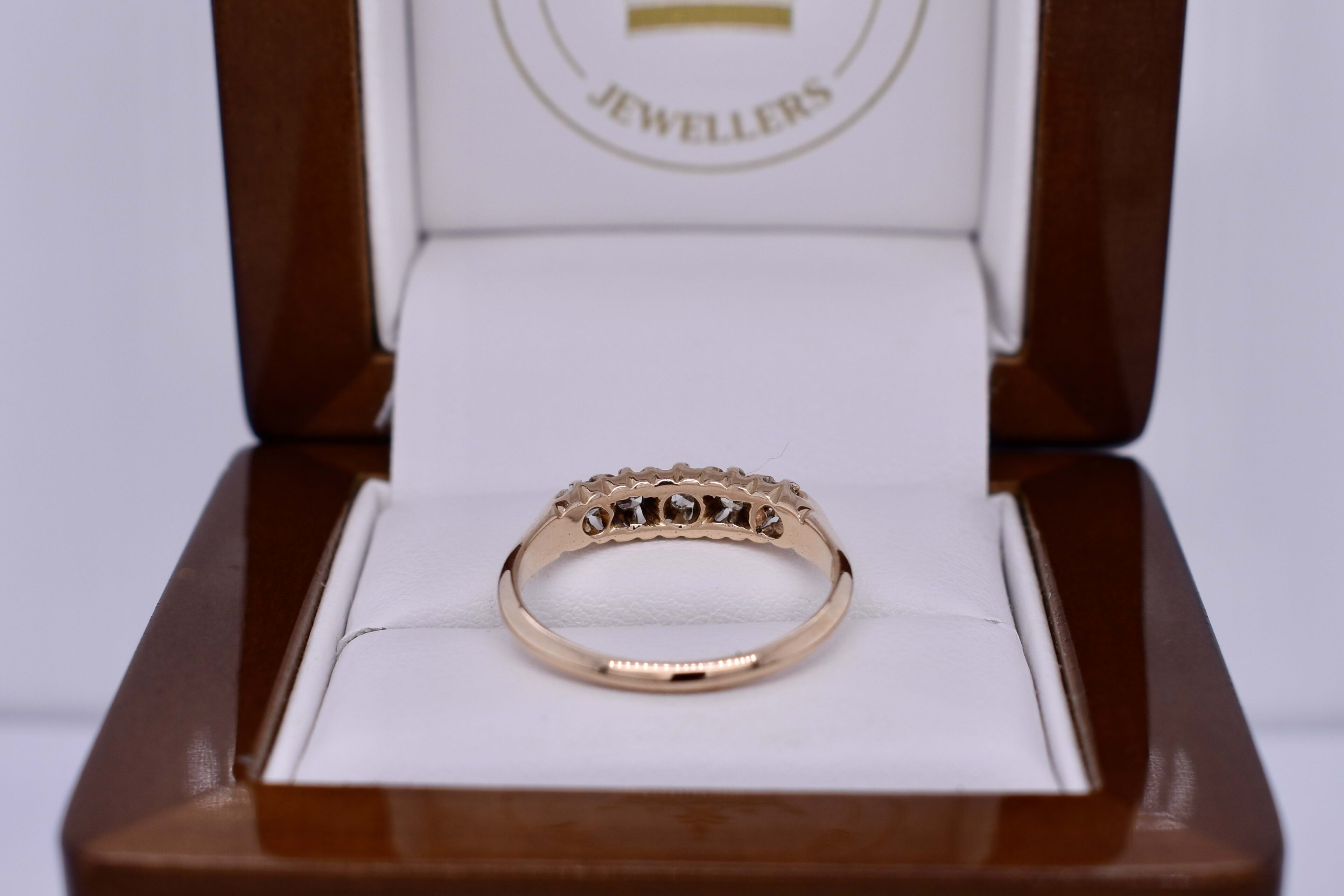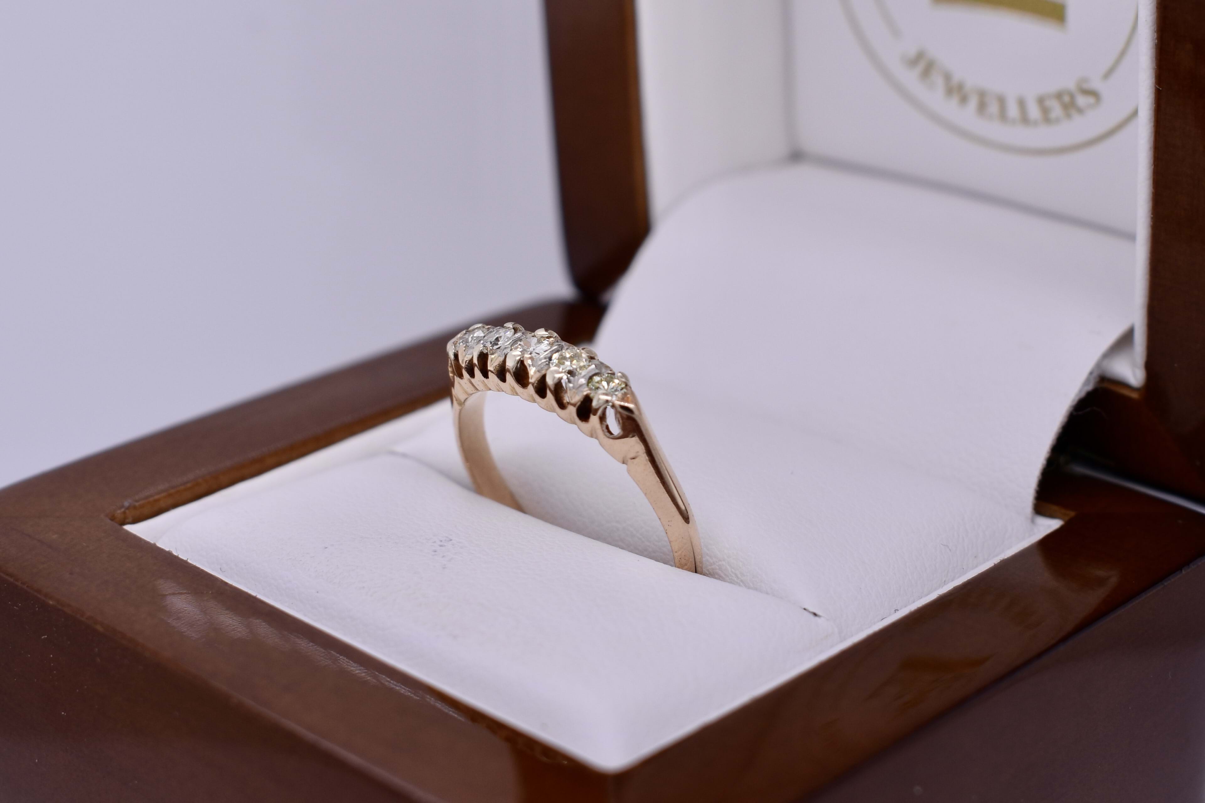This cute antique 14ct yellow gold bridge ring, features five semi modern cut faint yellow diamonds grip and claw set in a low bridge style 1.80mm band. The diamonds measure 2.7-2.3mm faint yellow coloured SI1 clarity diamonds totalling 0.30ct. Dated circa 1900. Finger size O. Independent Valuation Supplied.