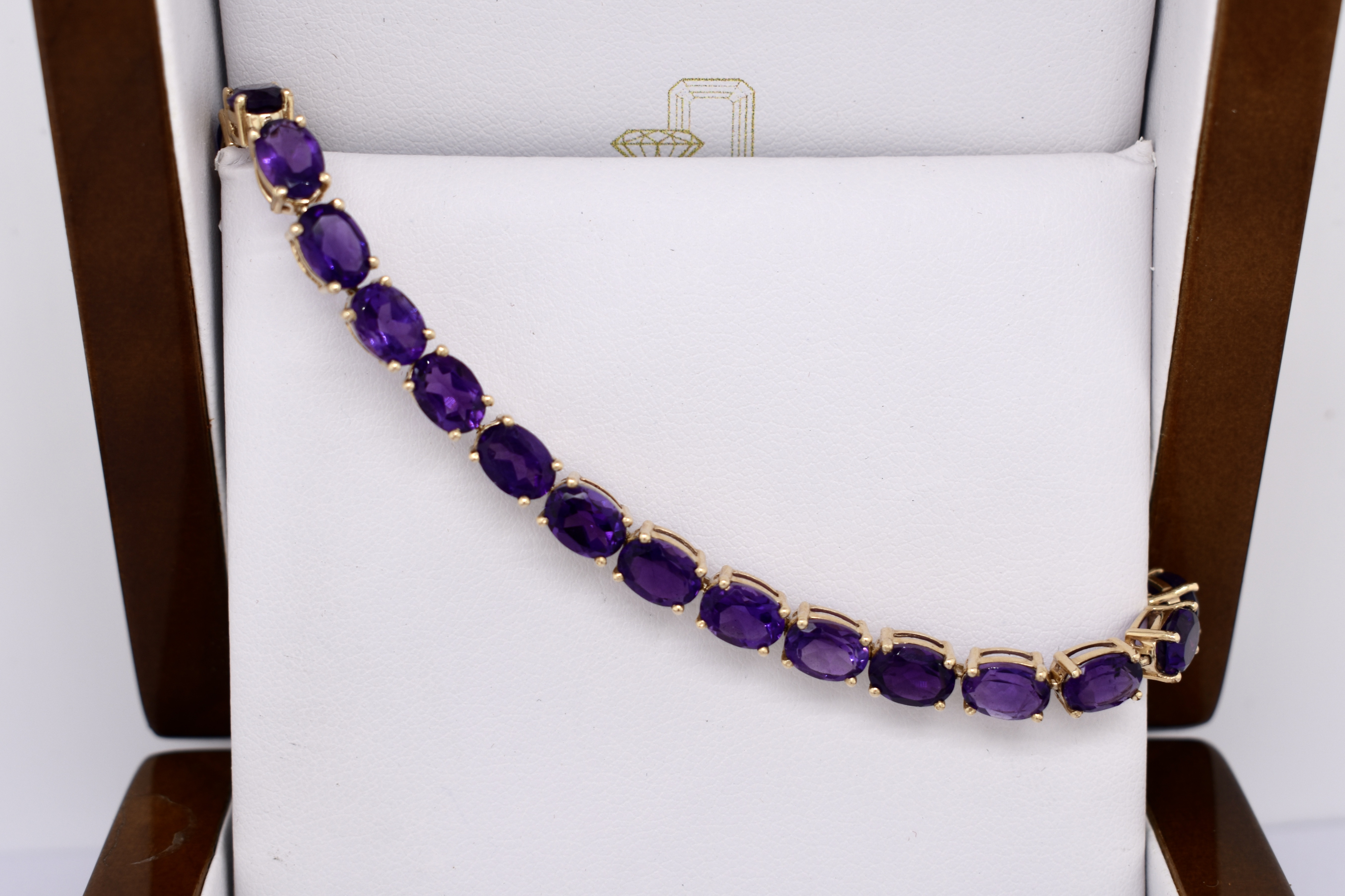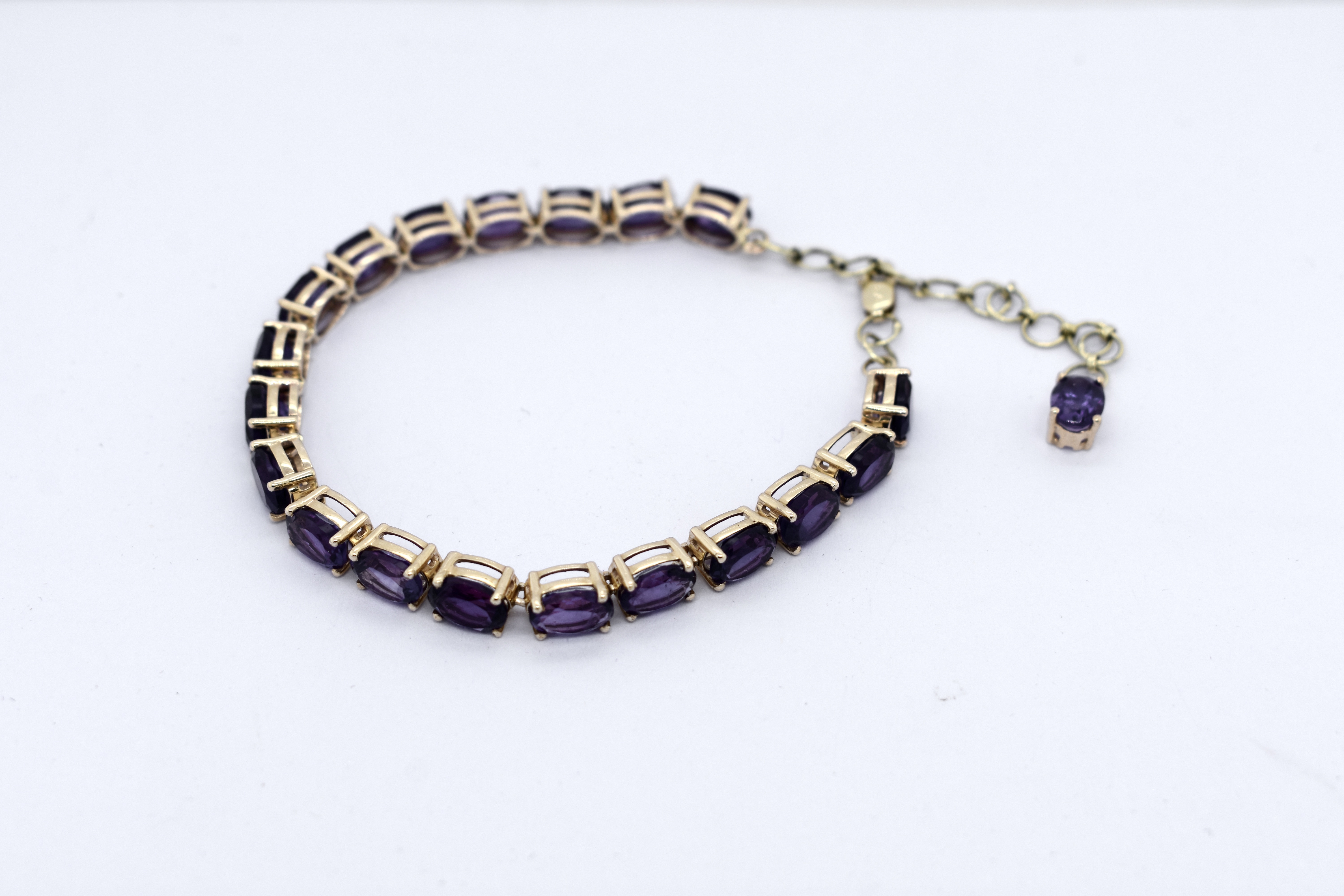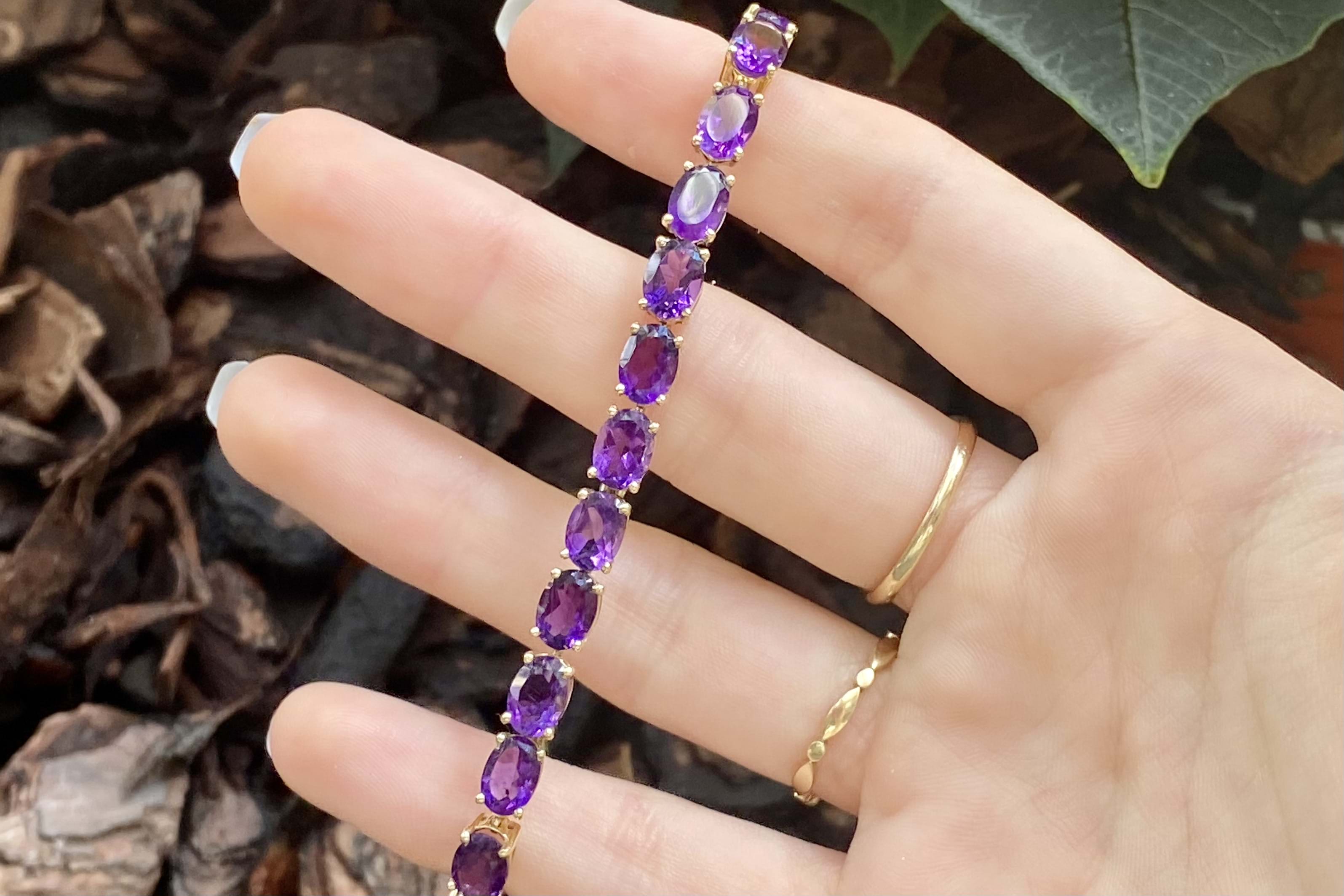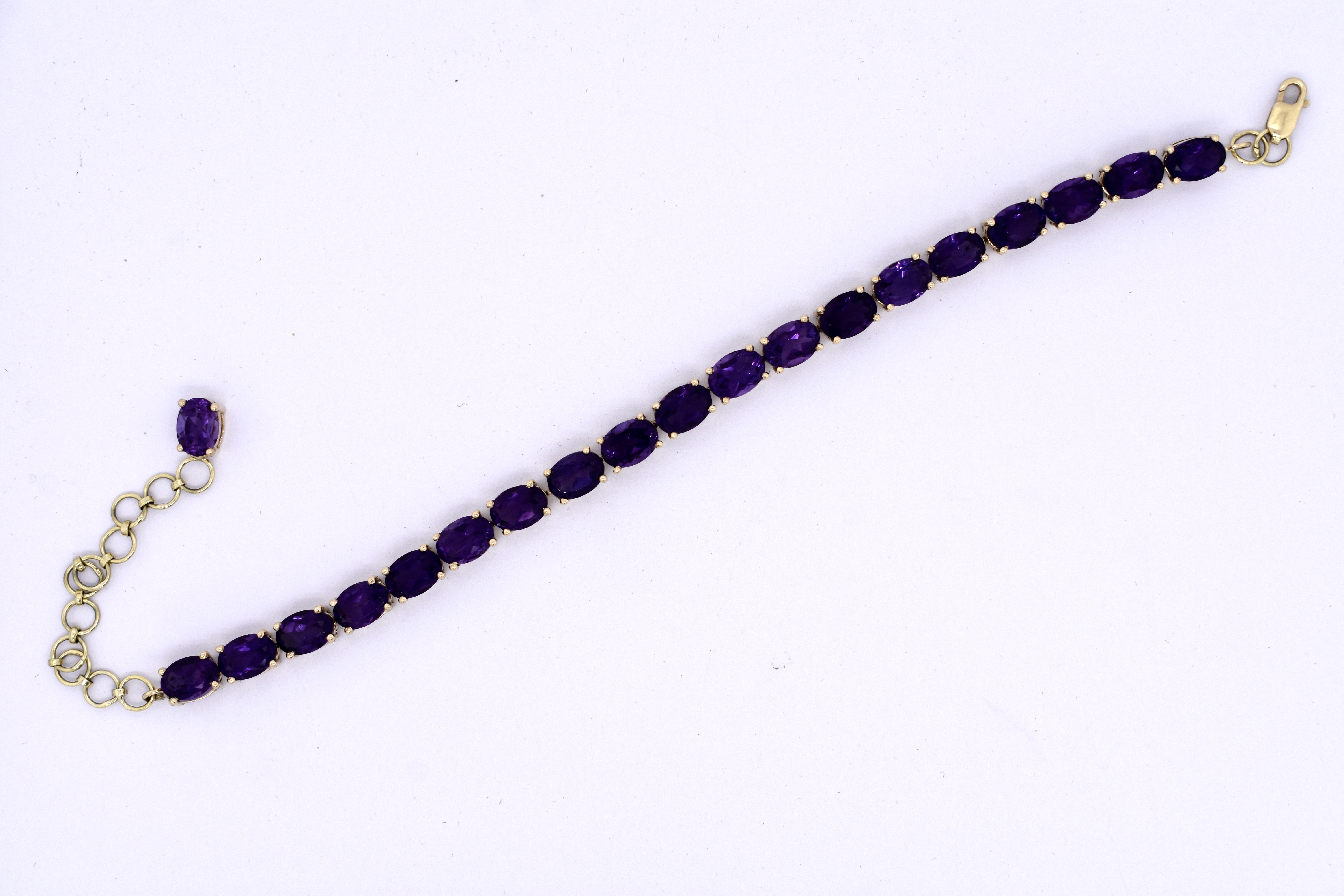 The bright and pretty bracelet, with twenty oval amethyst stones measuring 7.1x5.1mm, equalling 16.00ct. Crafted in 14ct yellow gold, the amethyst are four claw set with a parrot clasp fitting. Bracelet measures 22.5cm (adjustable extension) and weighs 11.20 grams. Independent Valuation Supplied.