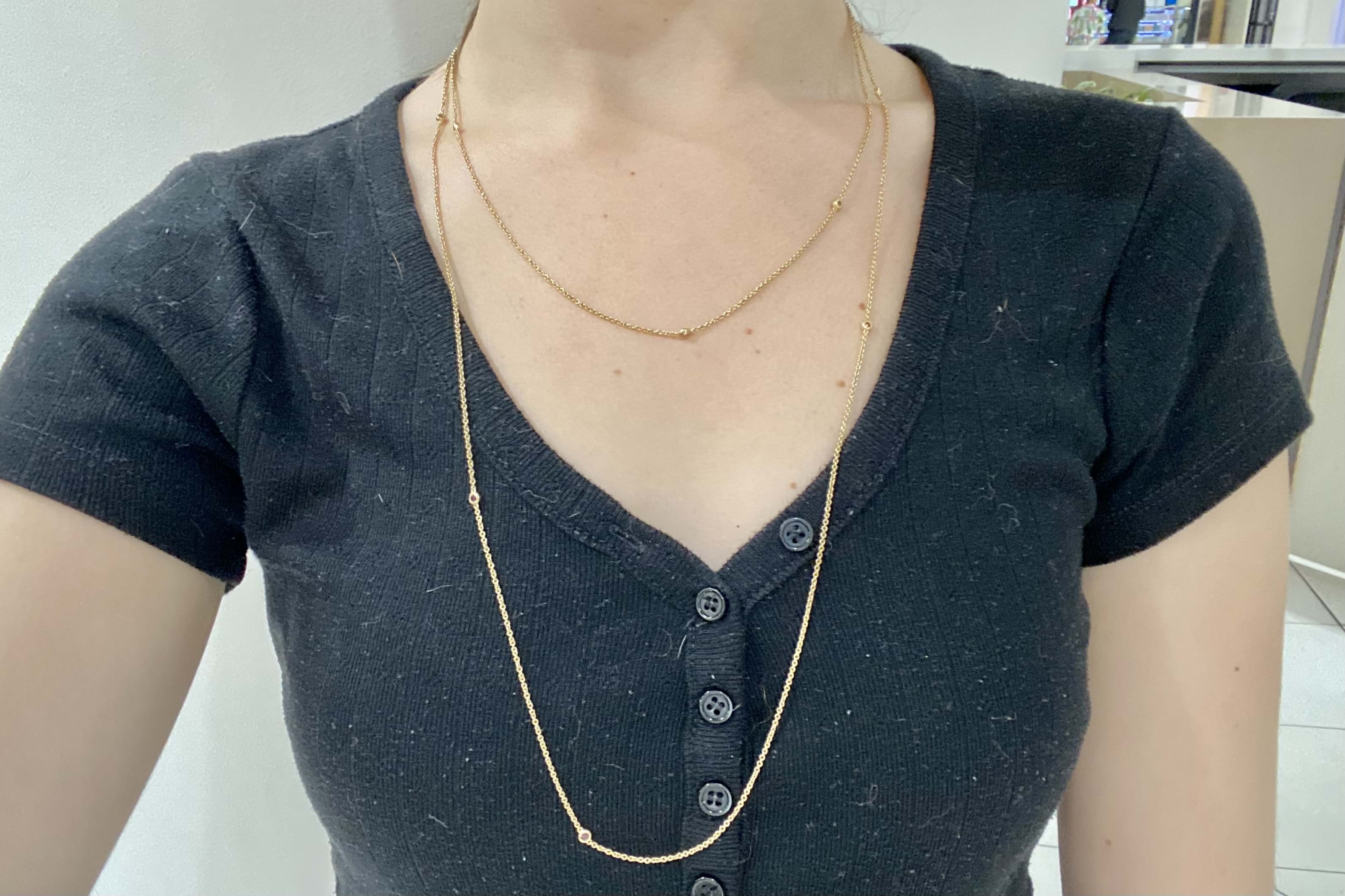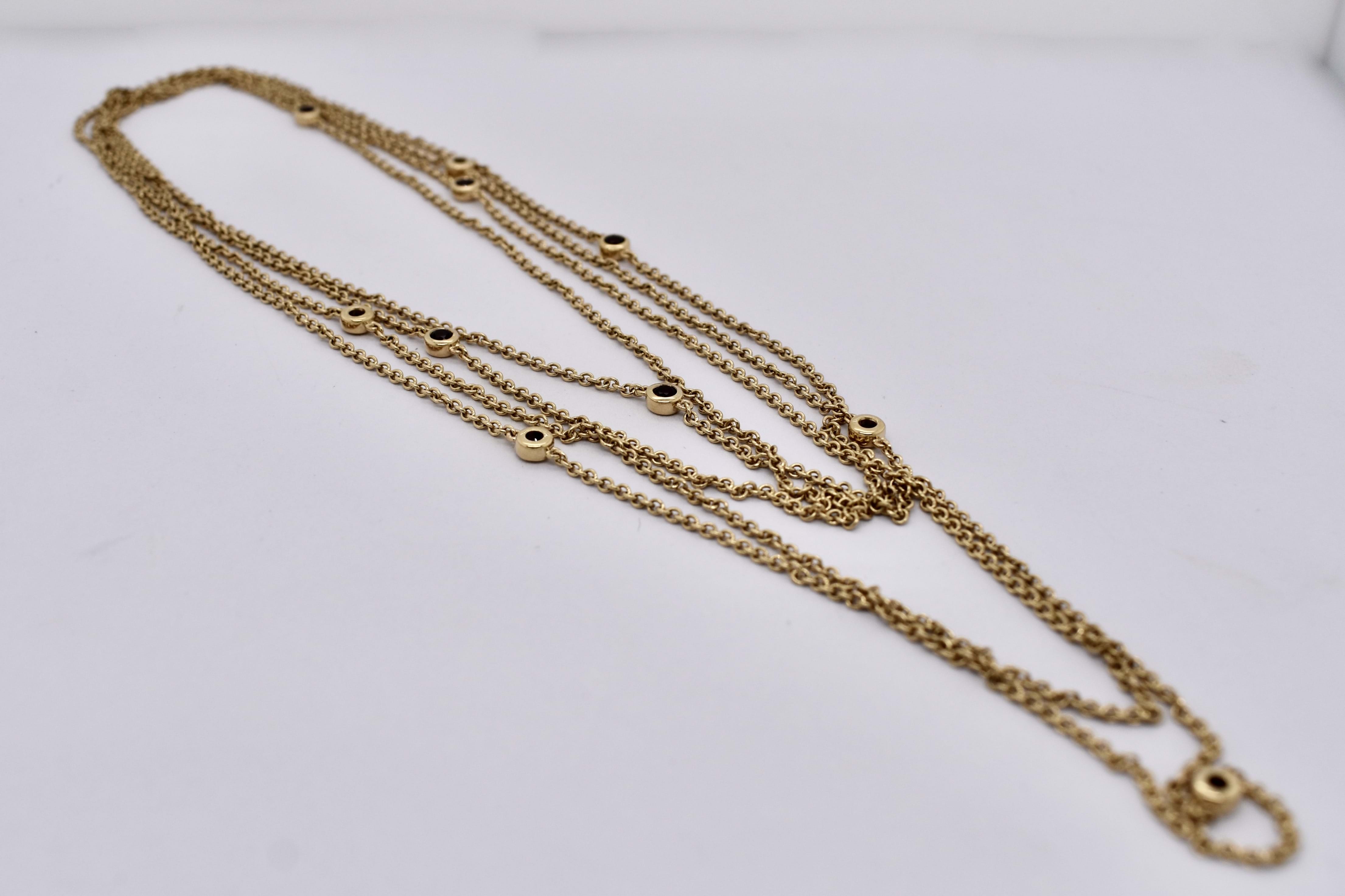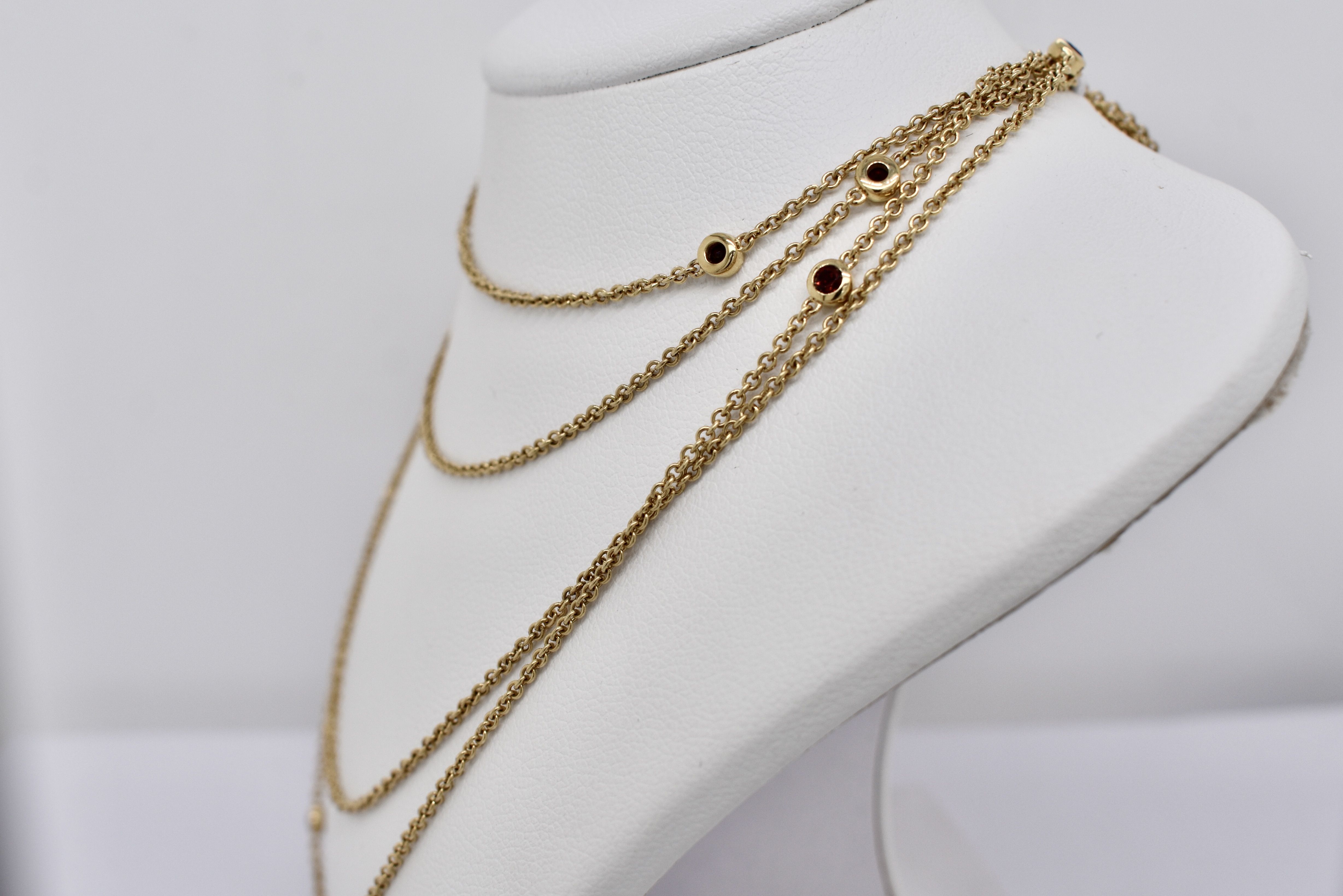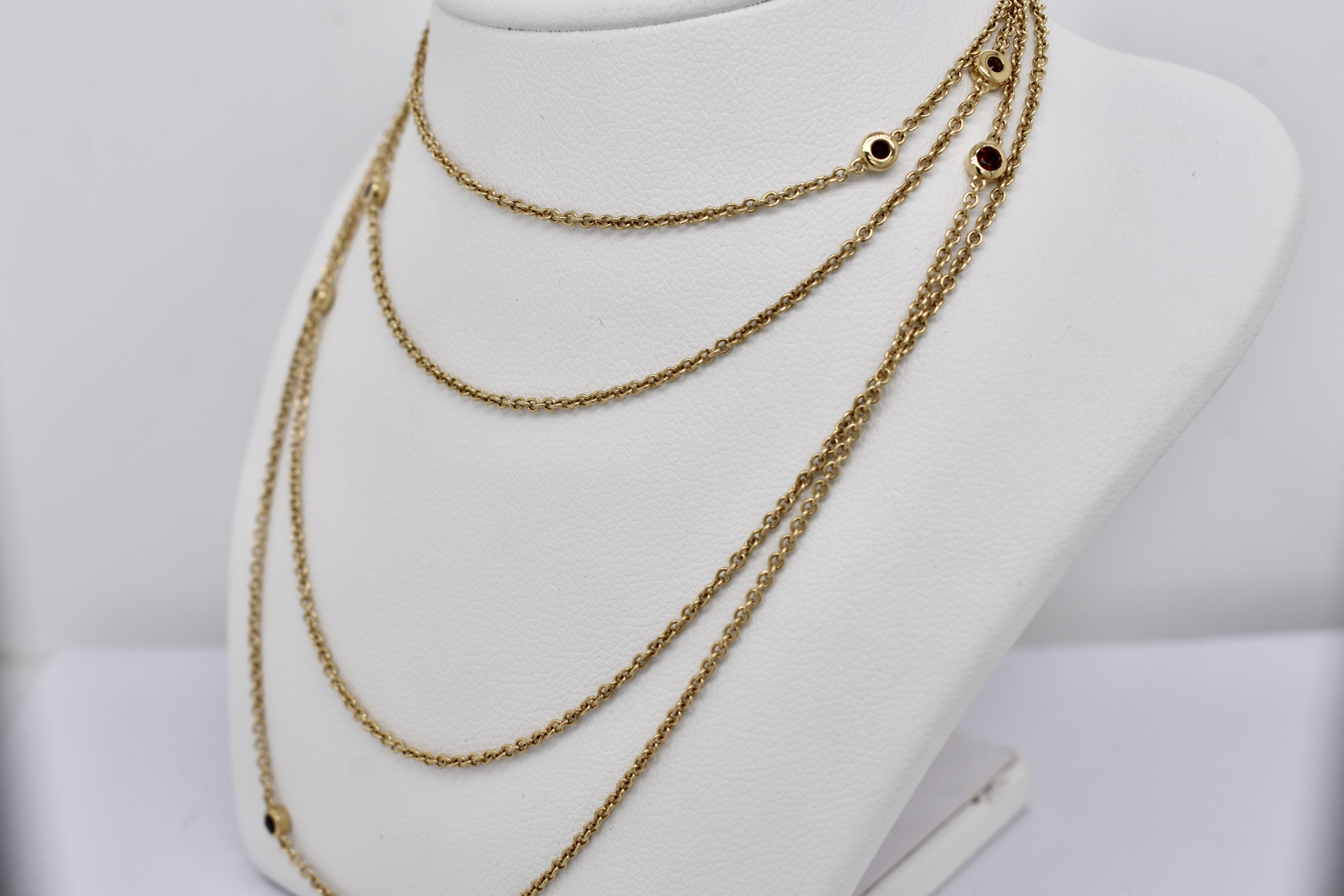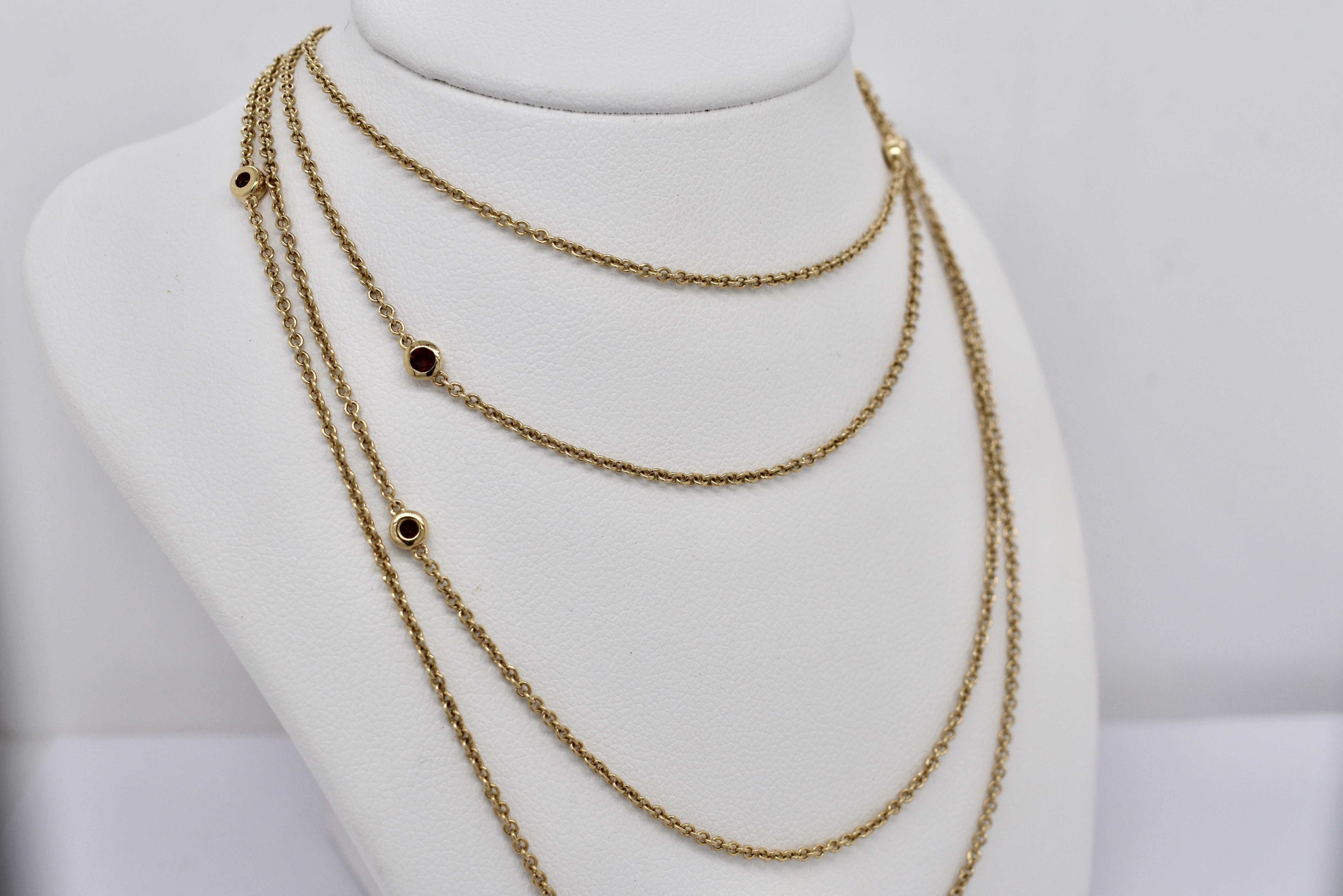 Crafted in 14ct yellow gold, this beautiful continuous trace link chain of 125cm, is set with 10 evenly spaced 2mm round garnets. The garnets are bezel set along the 1.40mm wide chain. Chain has no clasp and is made to wrap around or wear long. 7.76 grams. Independent Valuation Supplied.
