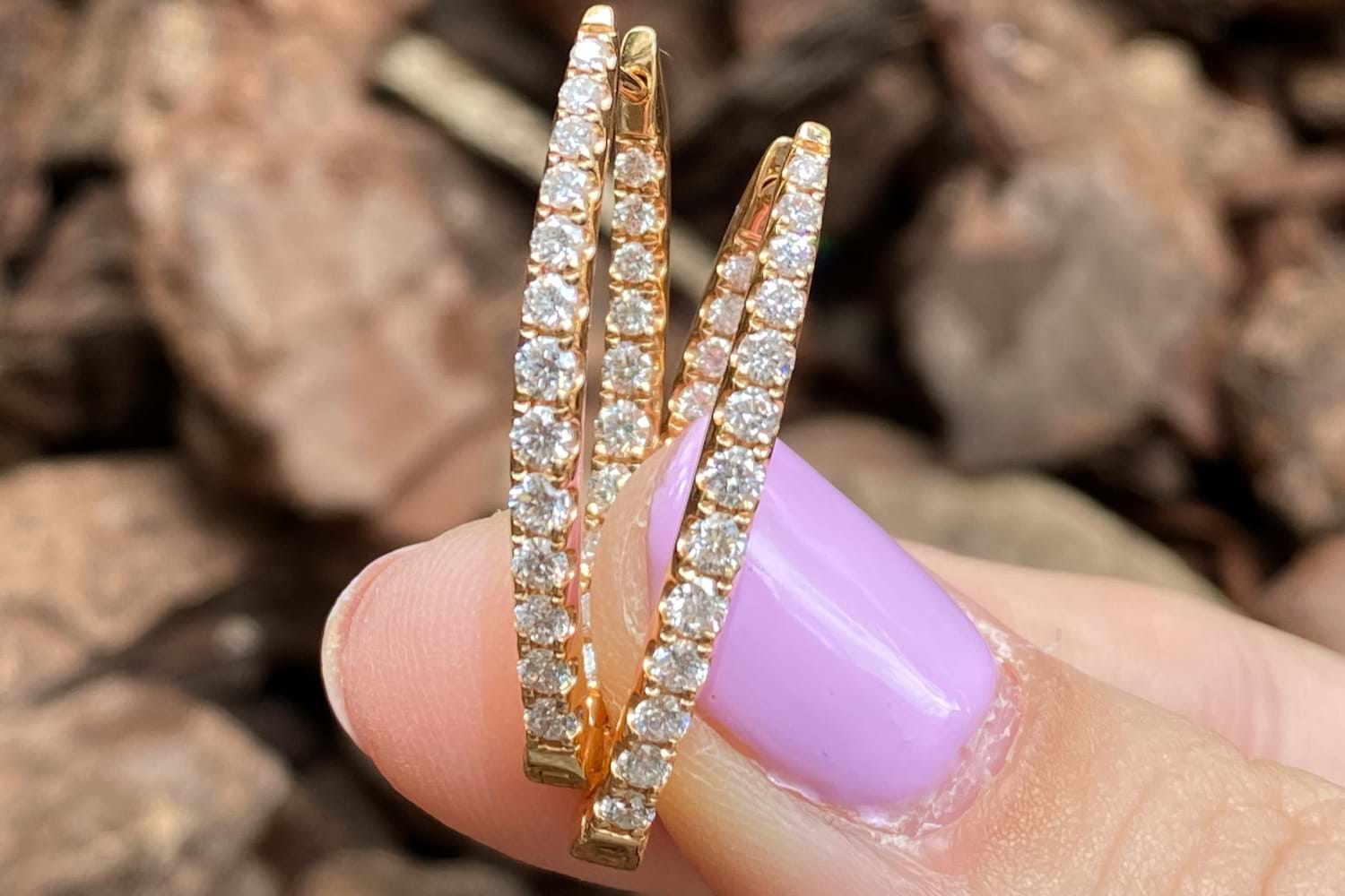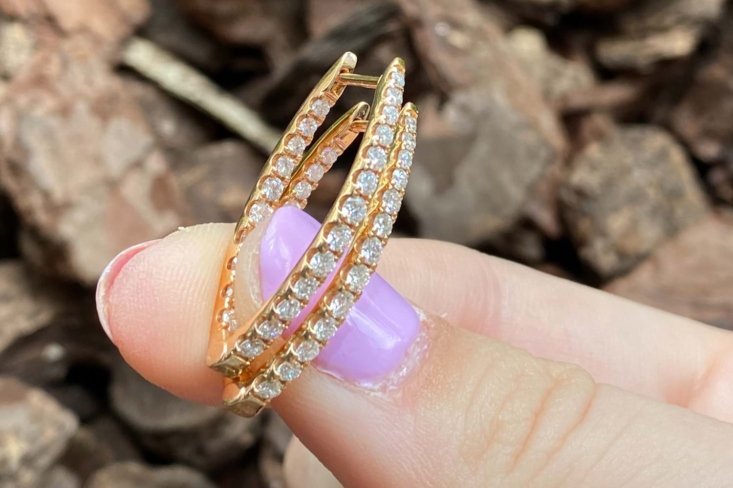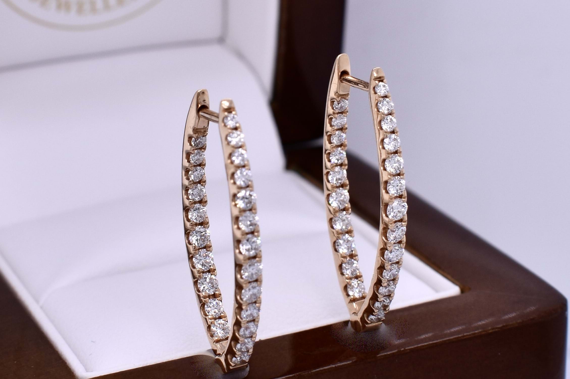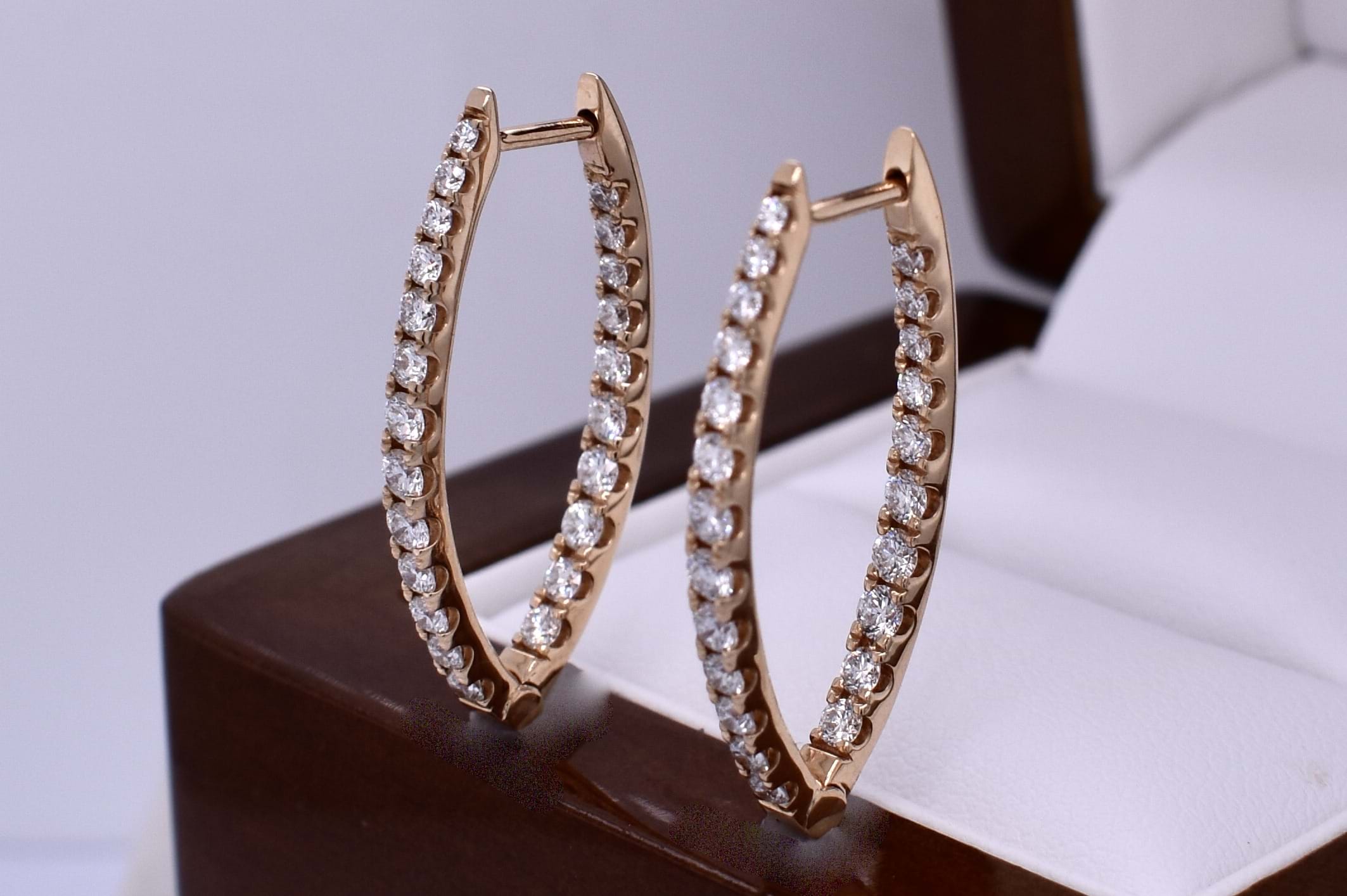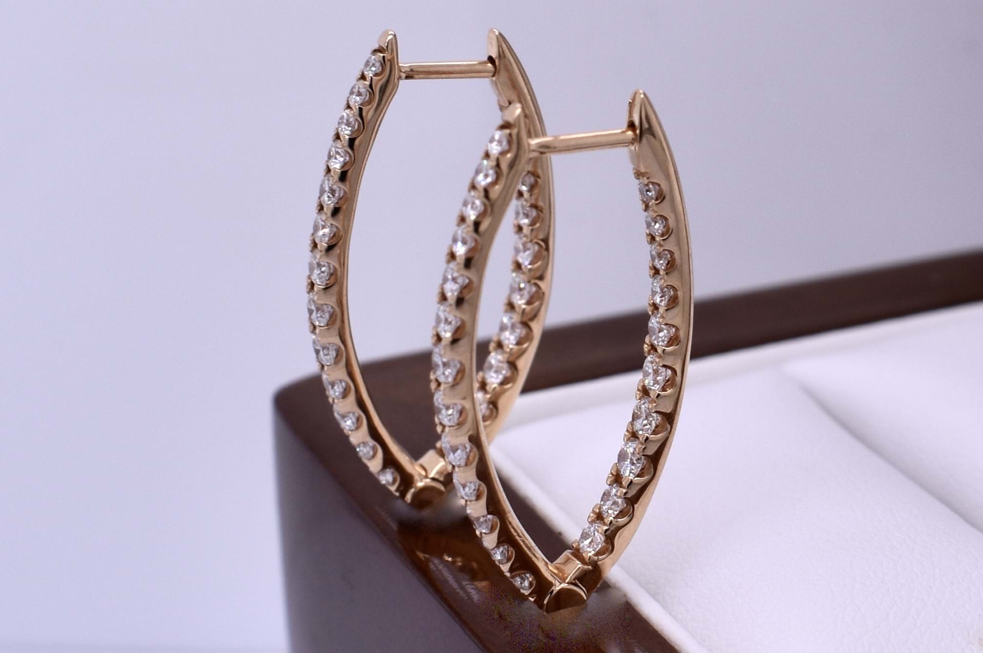 An sparkly pair of hinged hoop earrings crafted in 18ct rose gold, featuring a V-shaped profile that sits beautifully with drop earrings. Each hoop is set with round brilliant cut diamonds to the front and inner back totalling 46 FGVS-SI diamonds equalling 1.24cts, creating continuous sparkle and depth from every angle. Designed for both comfort and everyday wear, the earrings are finished with secure clipped post fittings. Independent valuation supplied.