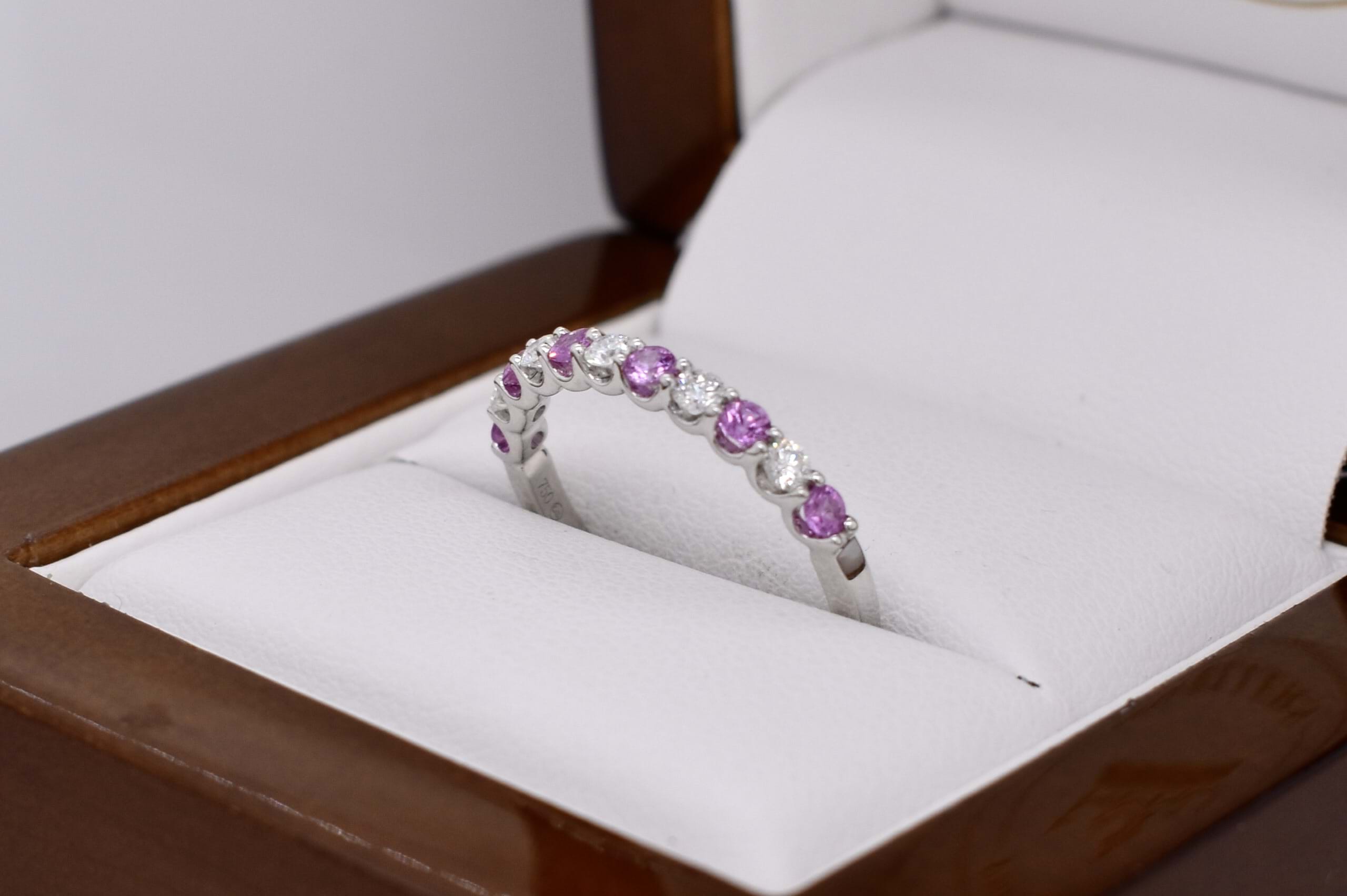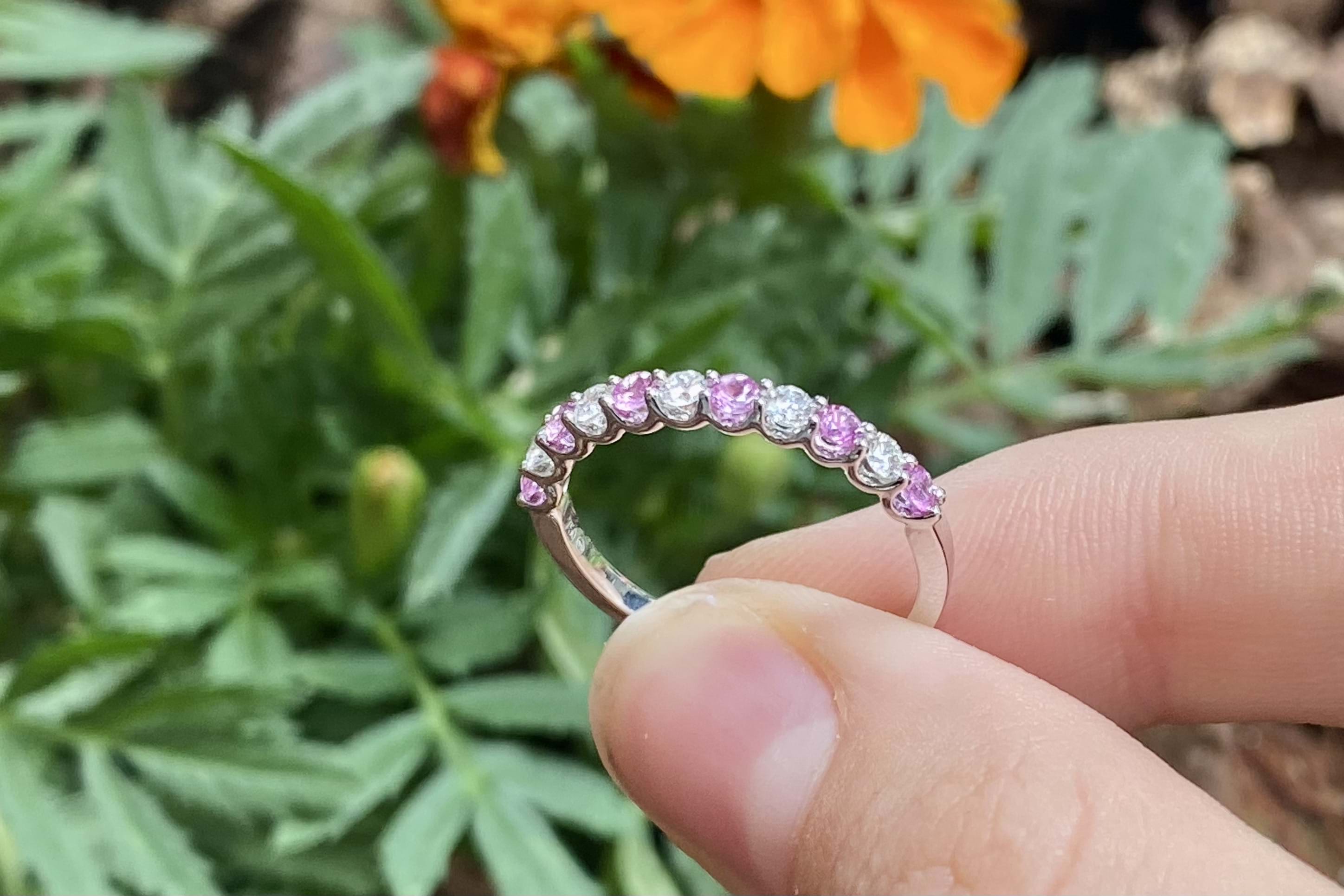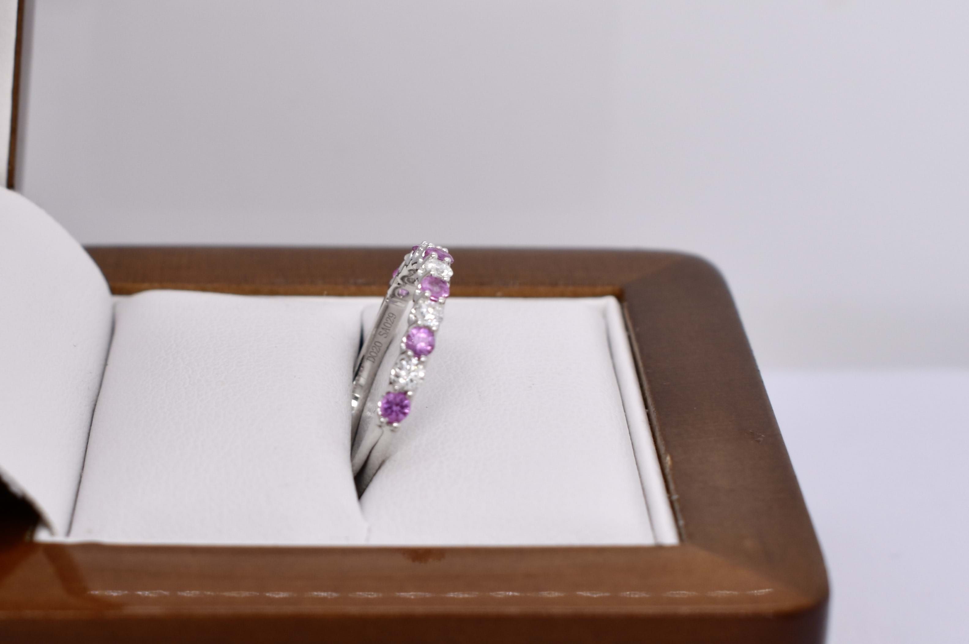 This sweet 18ct white gold band contains six bright light pink 2.15-2.10mm sapphires, totalling 0.29ct, alternately shared 4 claw set with five 2.1mm round brilliant cut diamonds. Total diamond weight of 0.20ct H SI. The perfect band for stacking or to wear alone. 2.09 grams. Finger size M+. Independent valuation supplied.