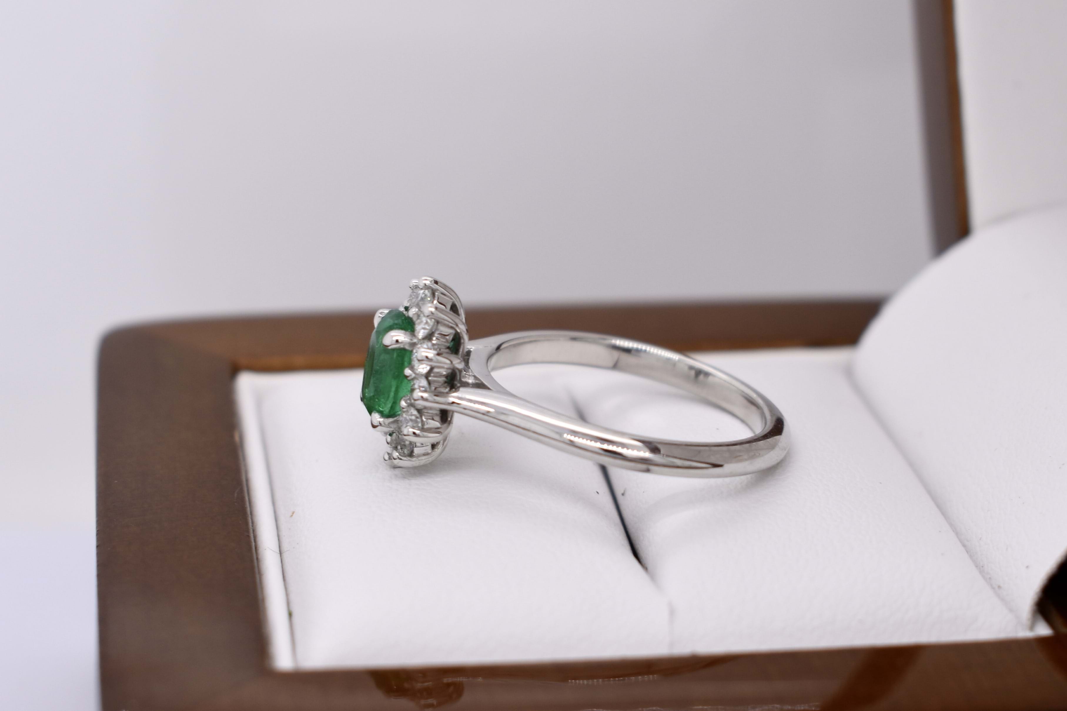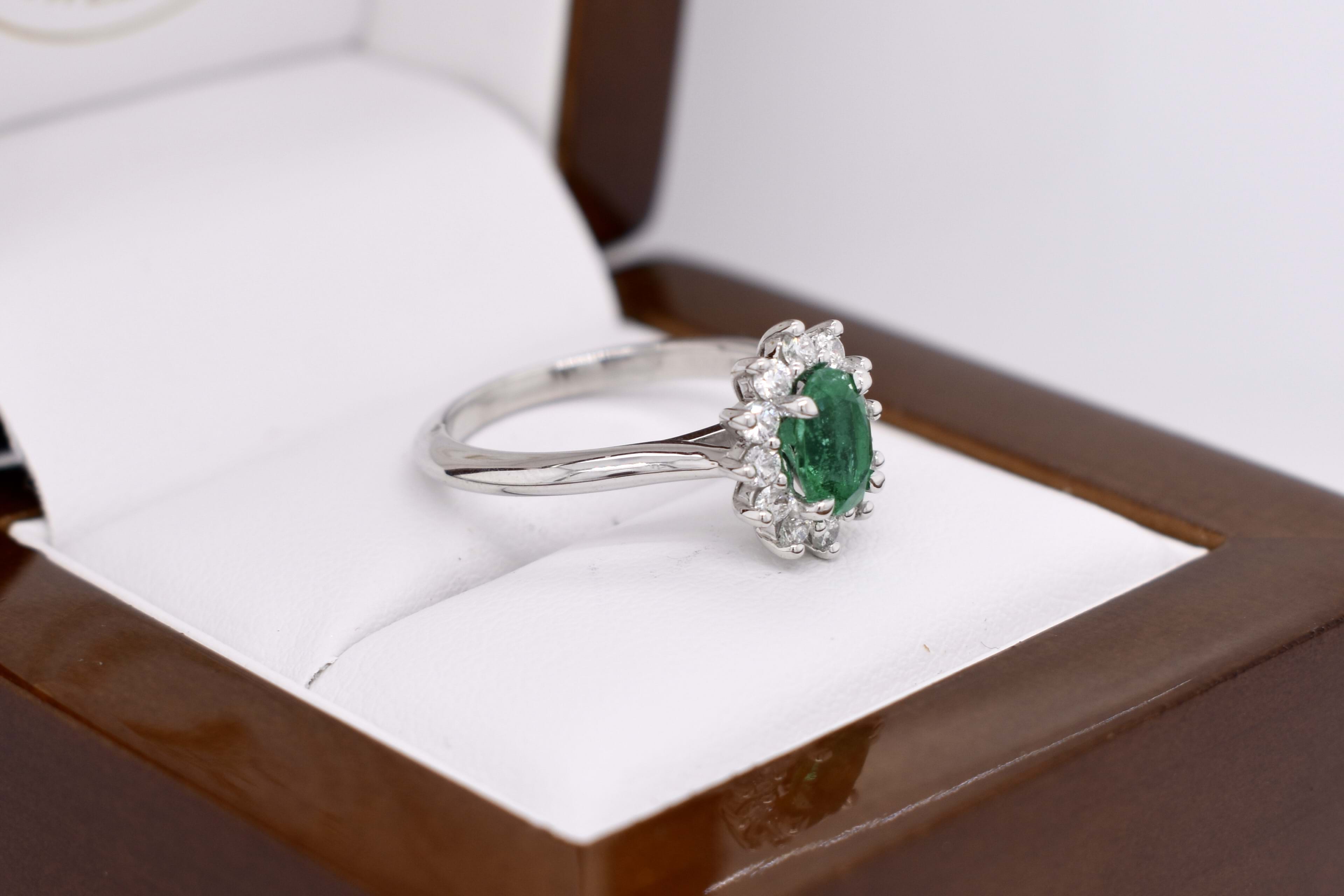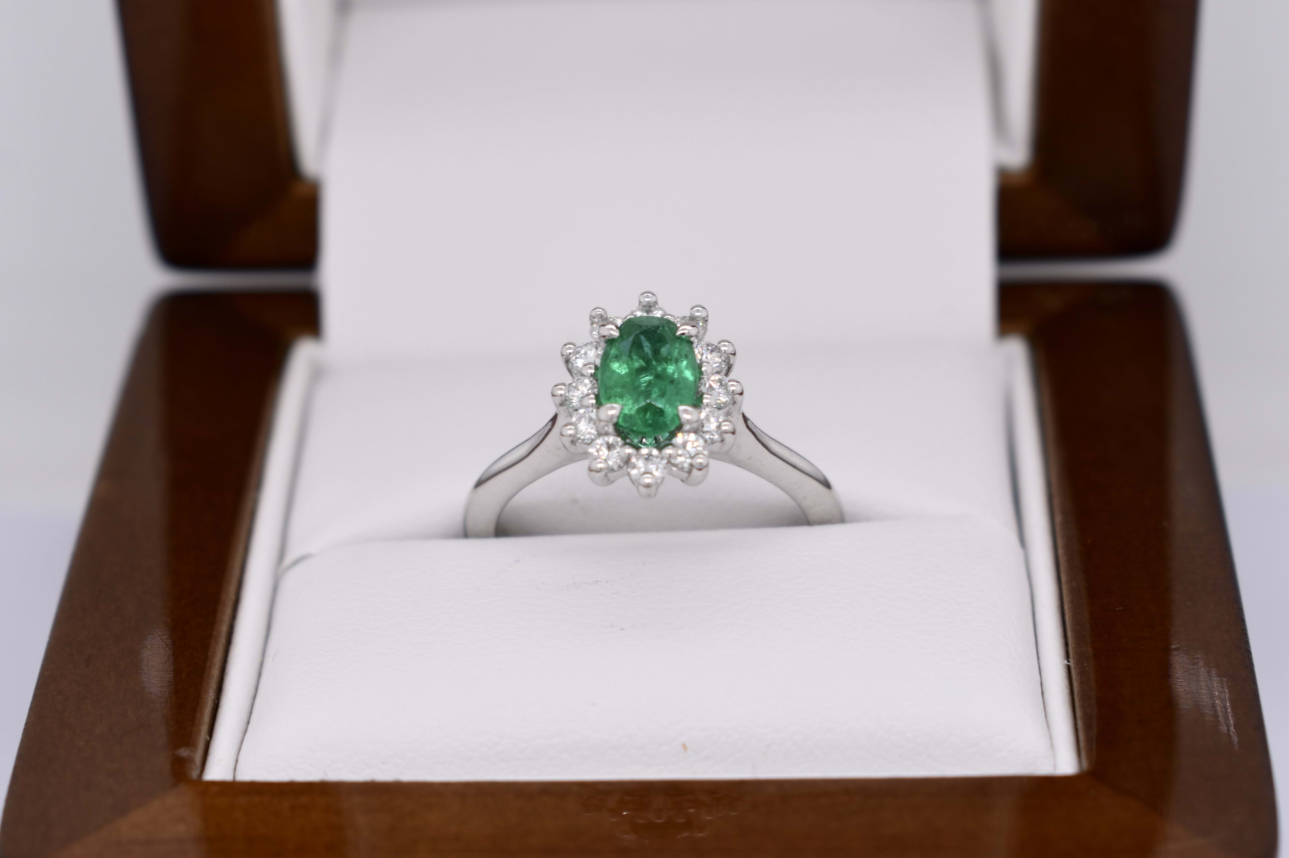 Fabulous and eye catching 18ct white gold ring, featuring a beautiful bright green oval Zambian emerald of 0.71ct, four claw set, with a diamond cluster halo. The cluster halo contains a total of 12 round brilliant cut diamonds, measuring 2.00mm and equalling 0.38ct G SI. Completed with a plain band. Finger size L. Independent Valuation available upon purchase.