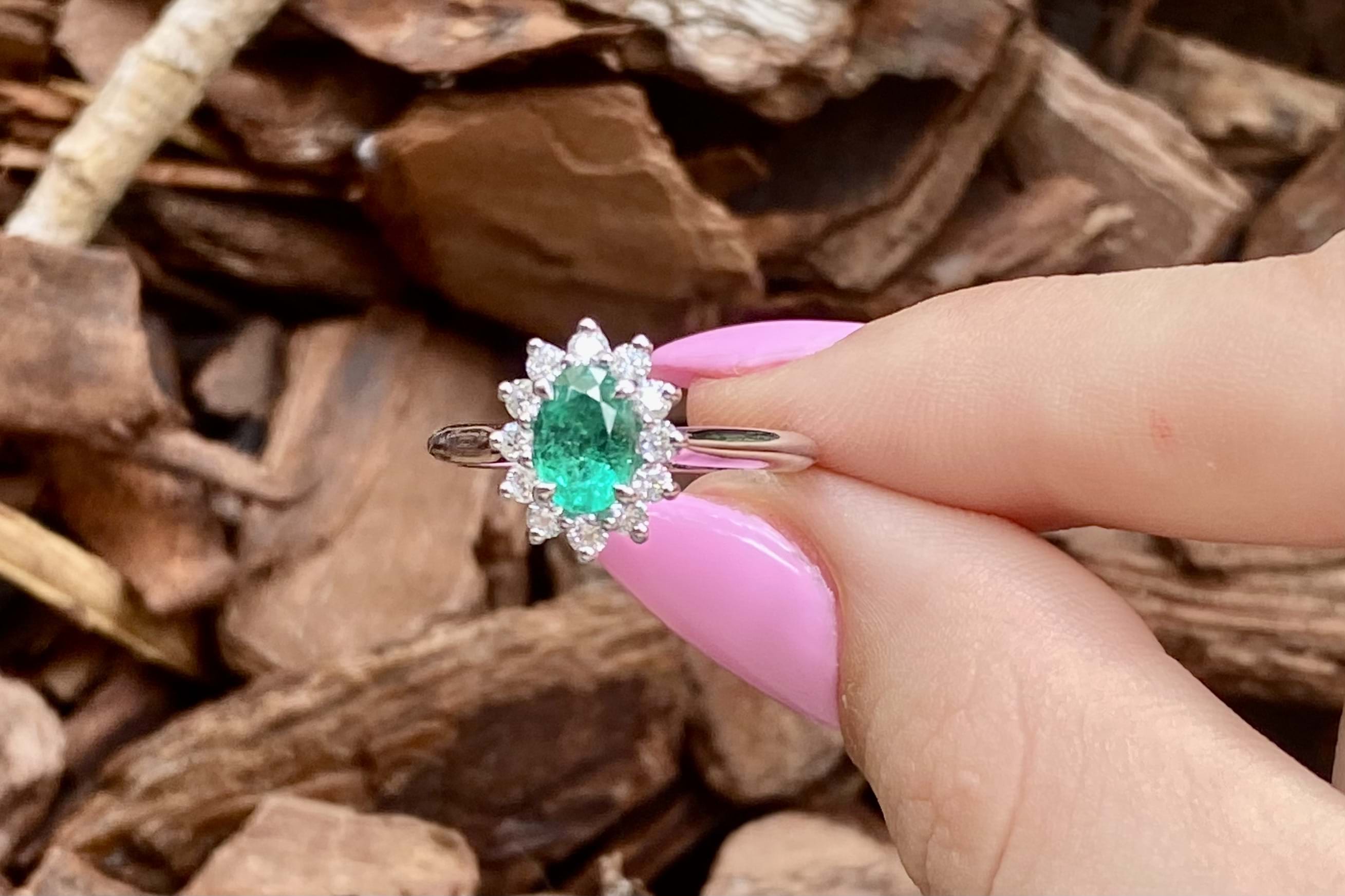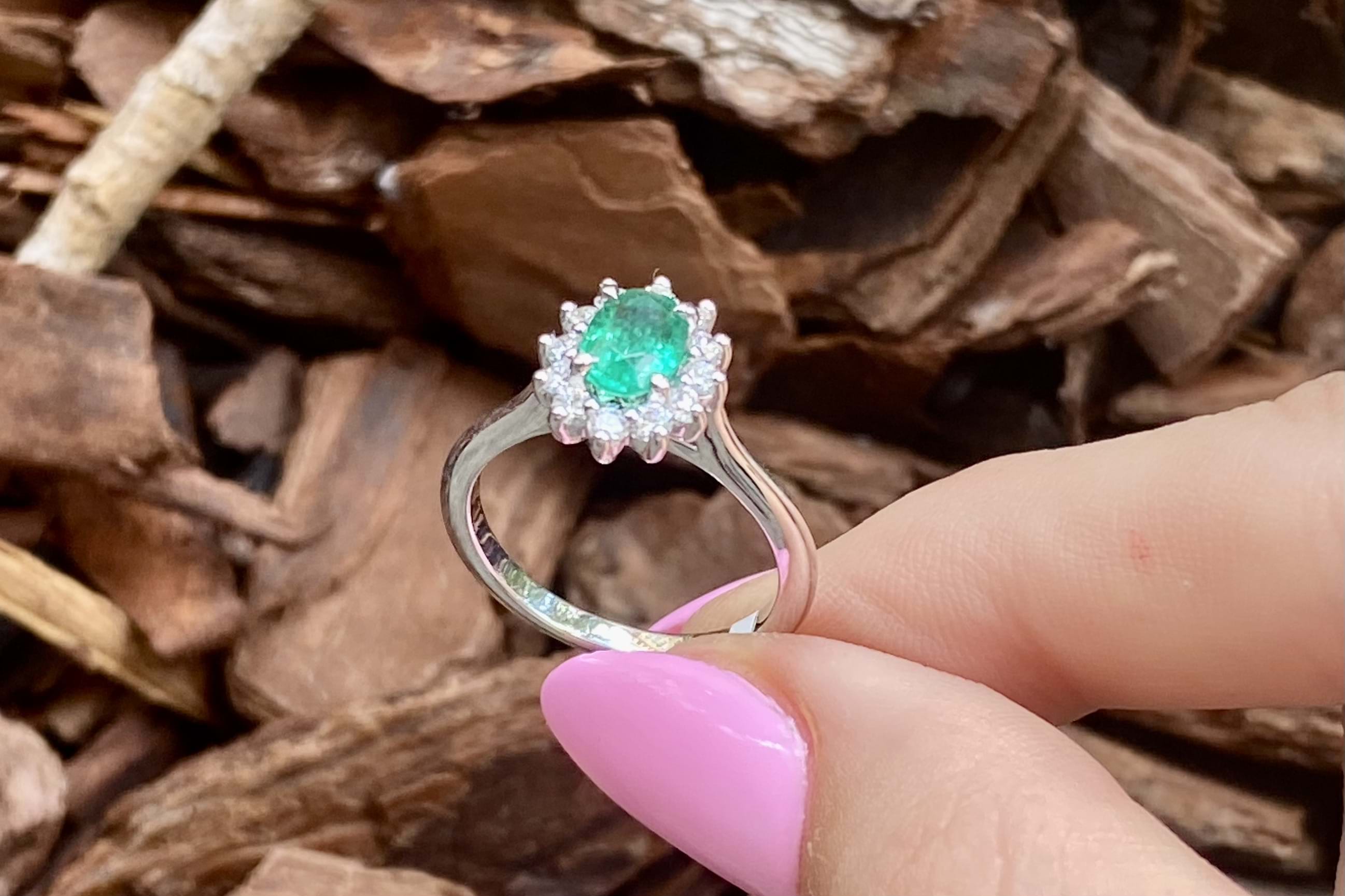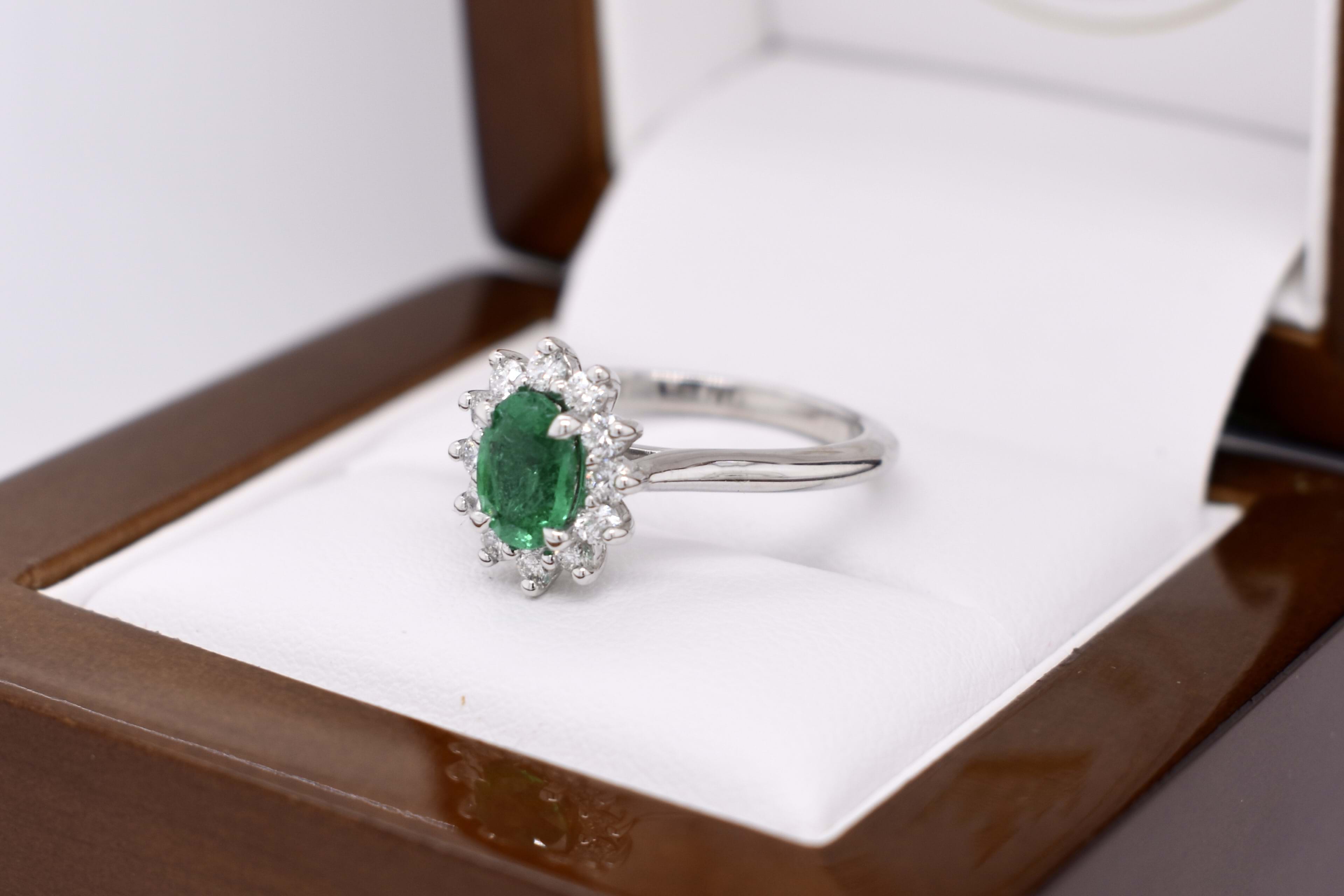 Fabulous and eye catching 18ct white gold ring, featuring a beautiful bright green oval Zambian emerald of 0.71ct, four claw set, with a diamond cluster halo. The cluster halo contains a total of 12 round brilliant cut diamonds, measuring 2.00mm and equalling 0.38ct G SI. Completed with a plain band. Finger size L. Independent Valuation available upon purchase.