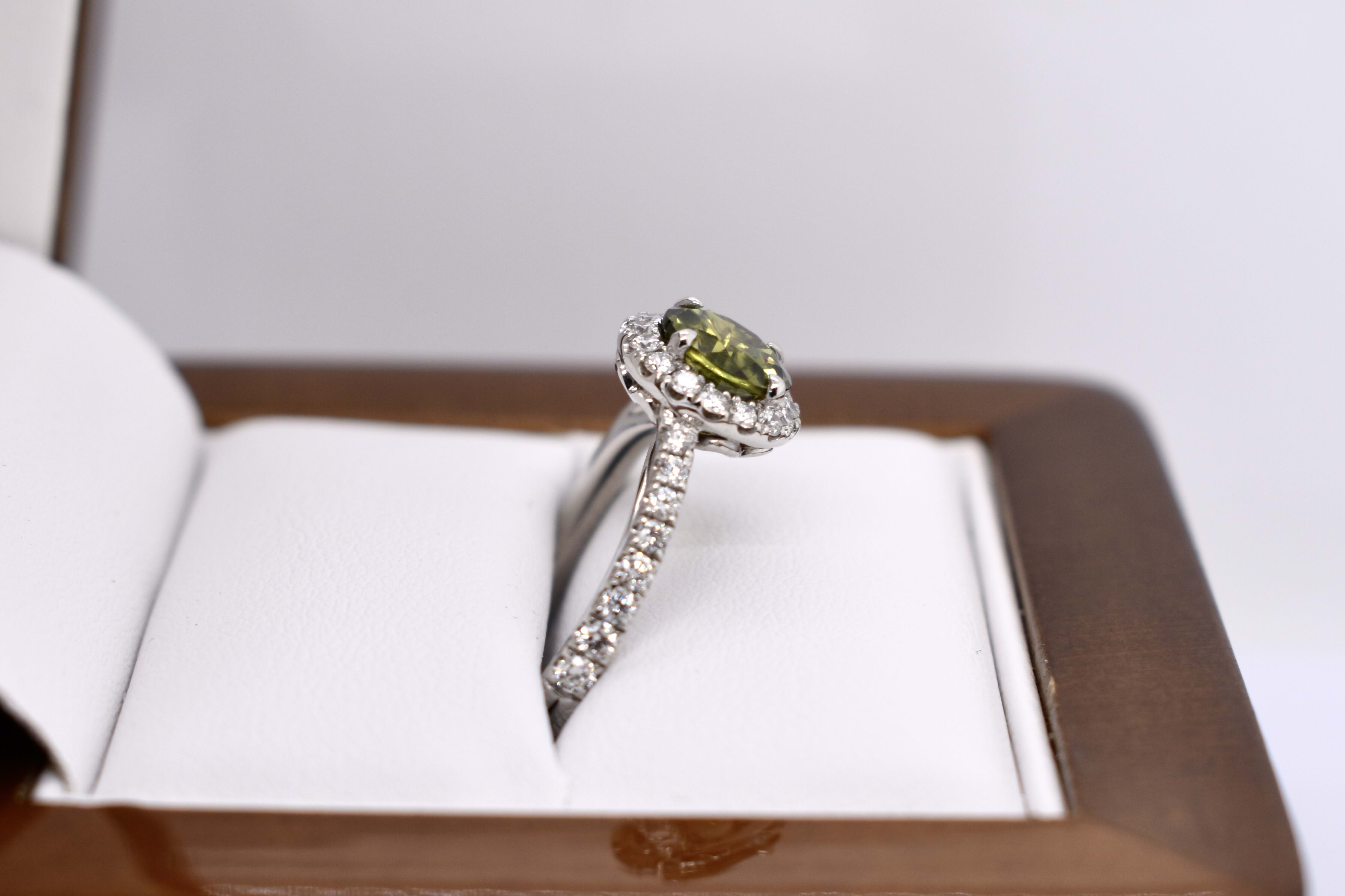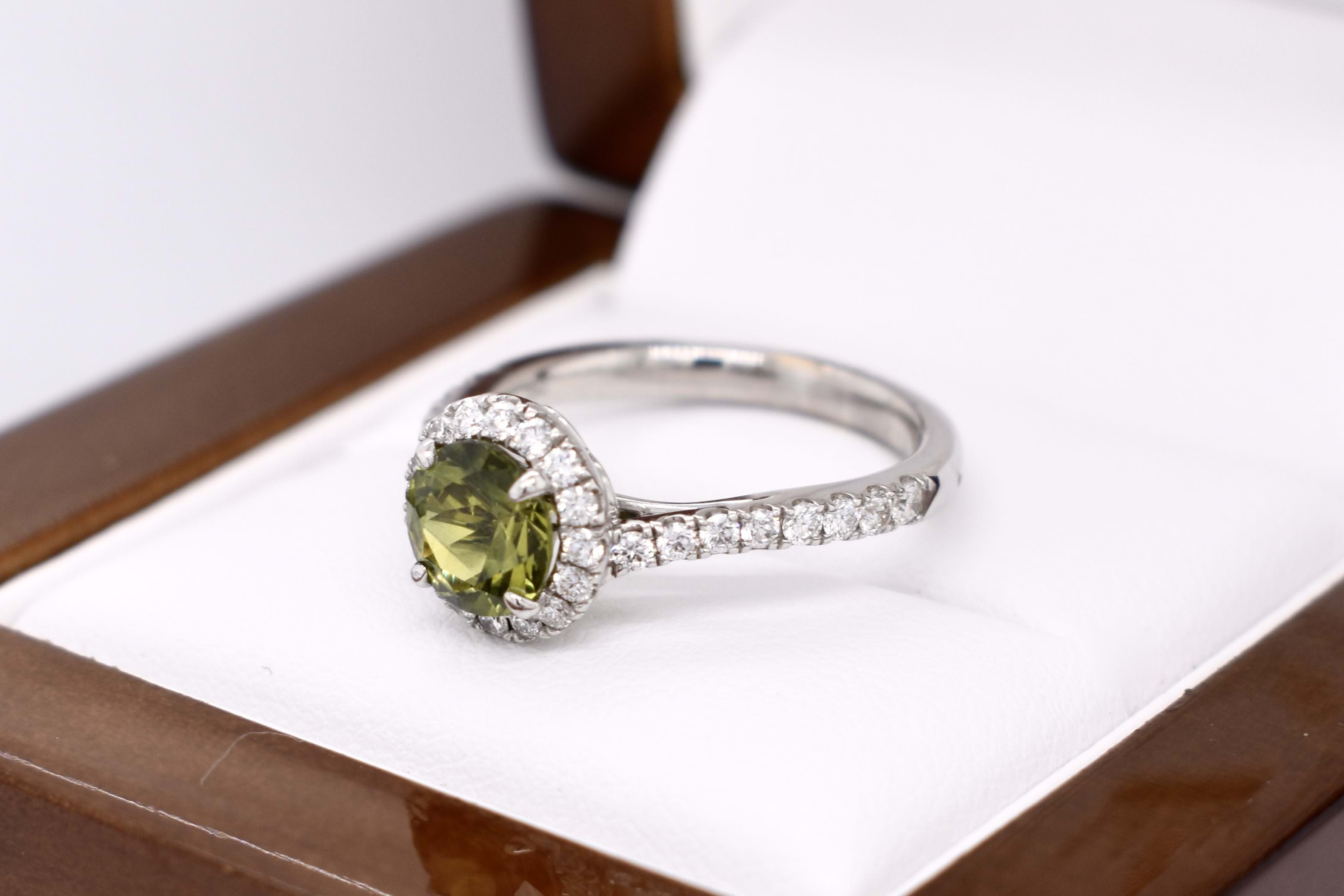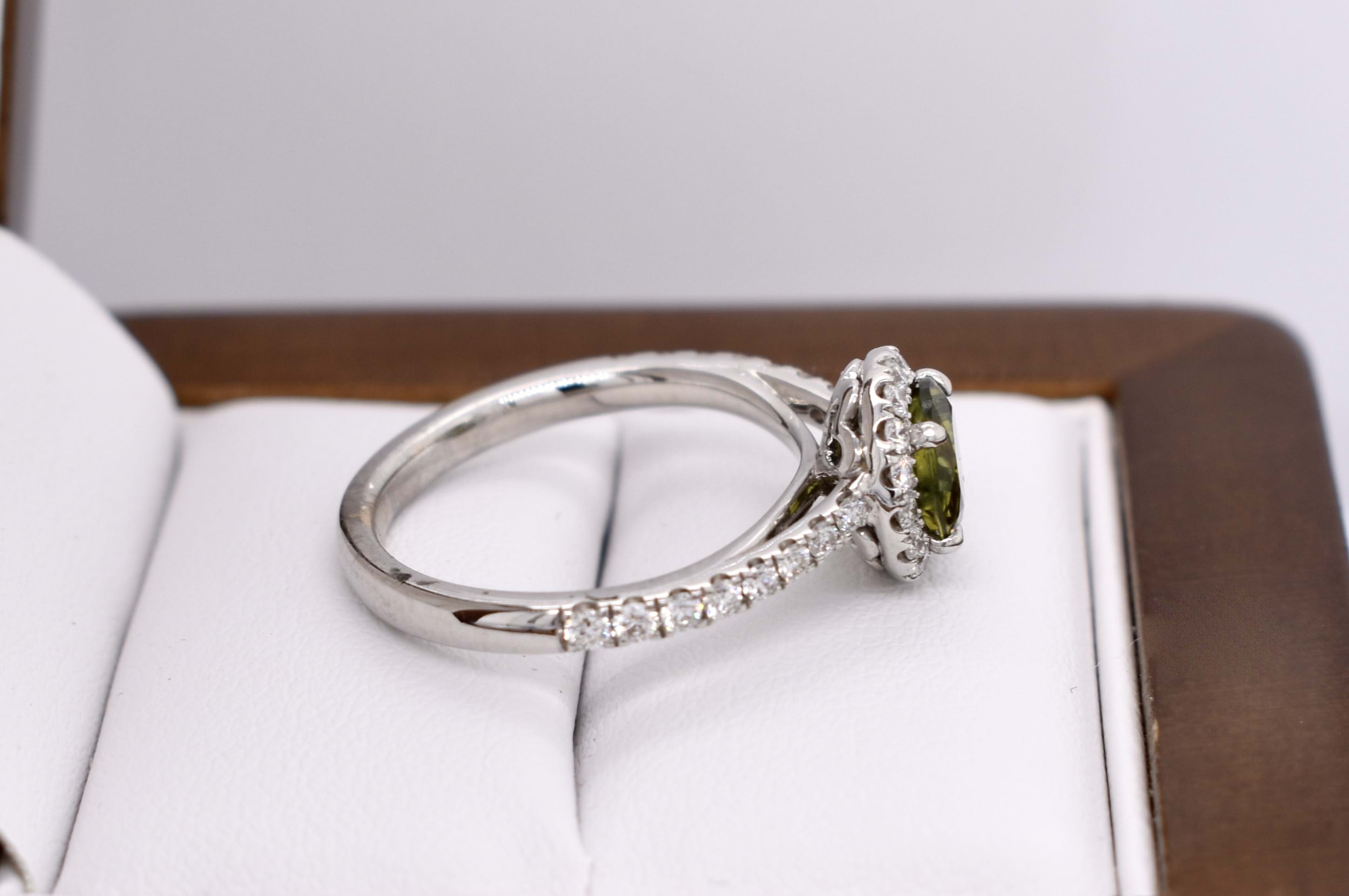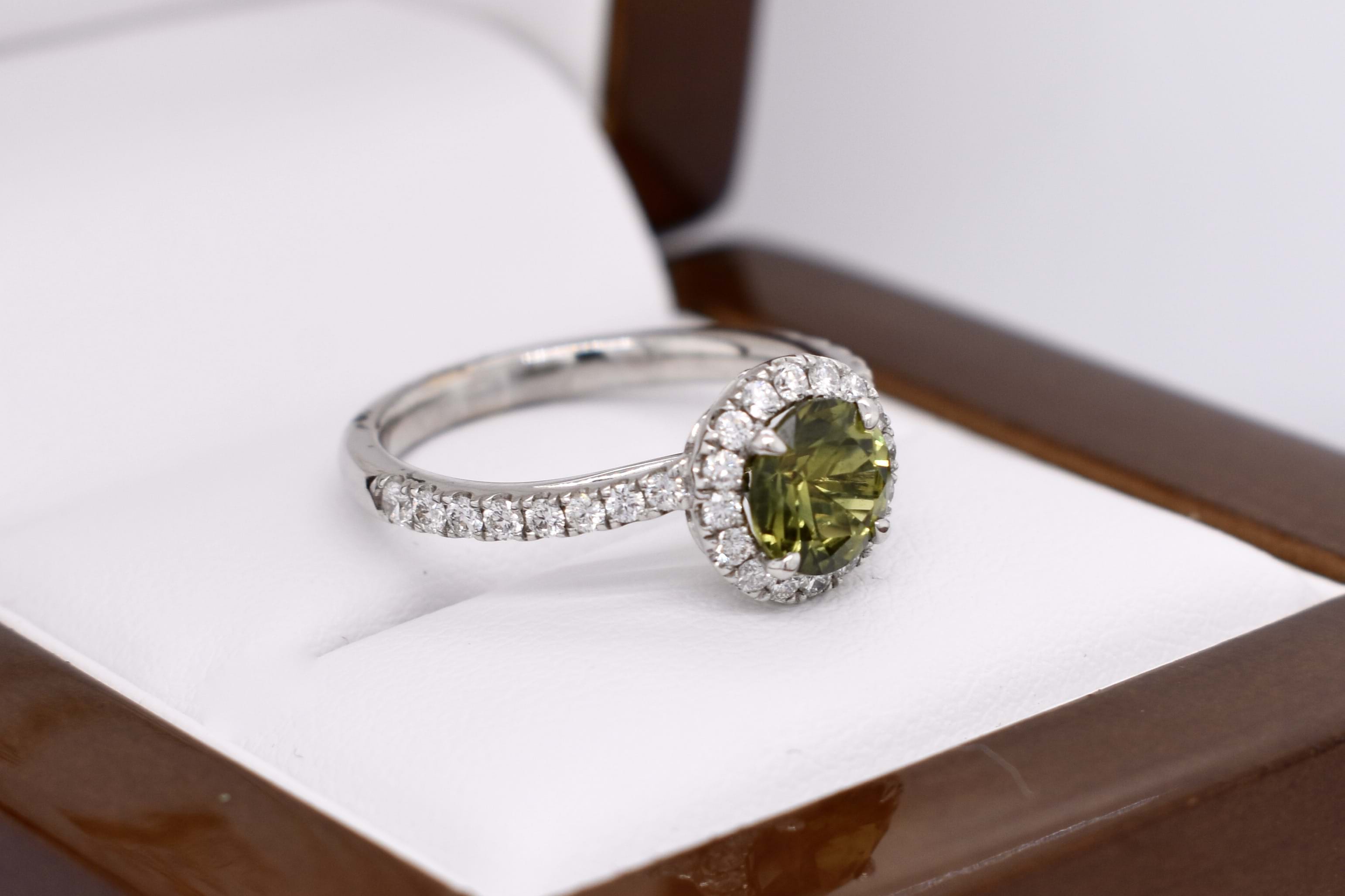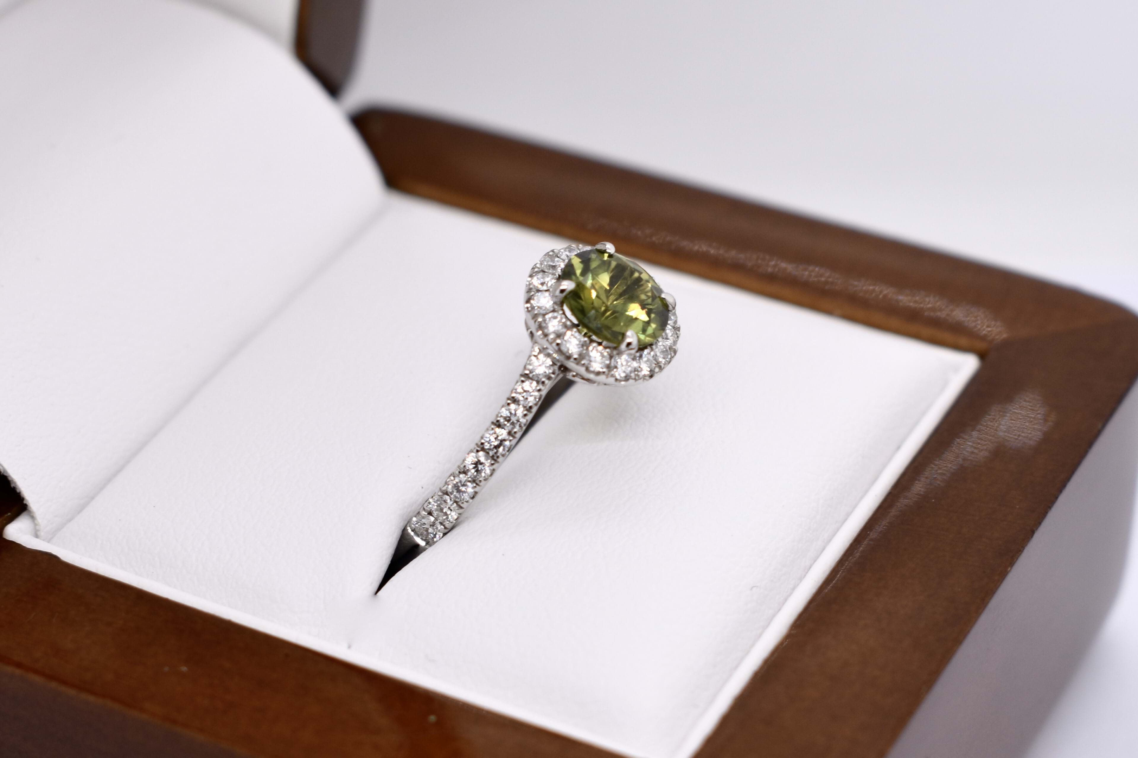 This beautiful ring features a central round Australian green sapphire of 1.30ct, four claw set, in 18ct white gold. With a shimmering halo of round brilliant cut white diamonds surrounding it and continuing down the band. Total of 32 diamonds weighing 0.47ct GH SI total. Finger size M. Independent Valuation available upon purchase.