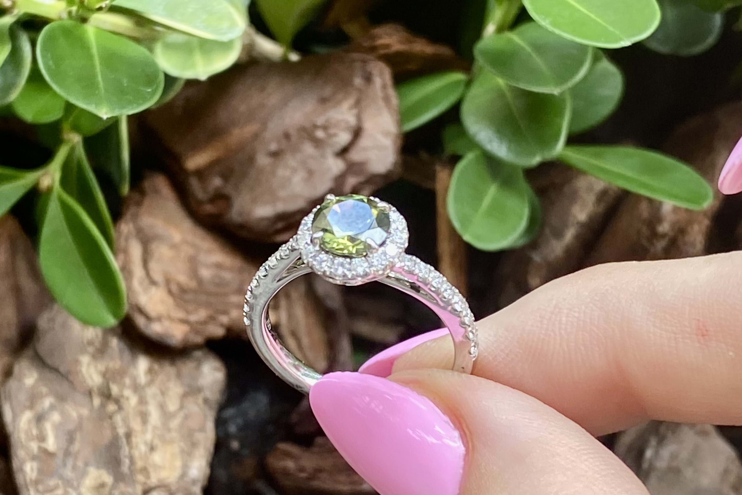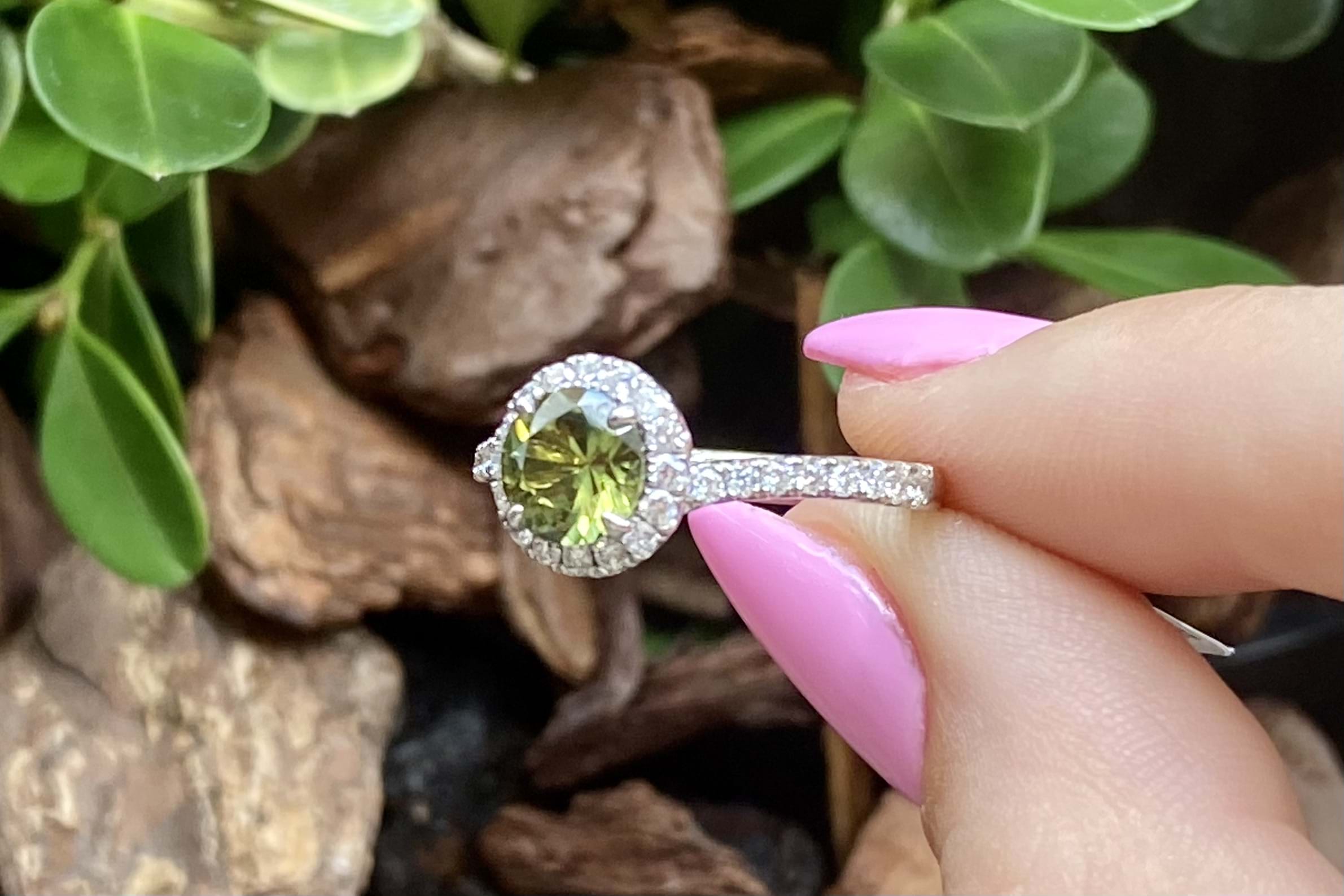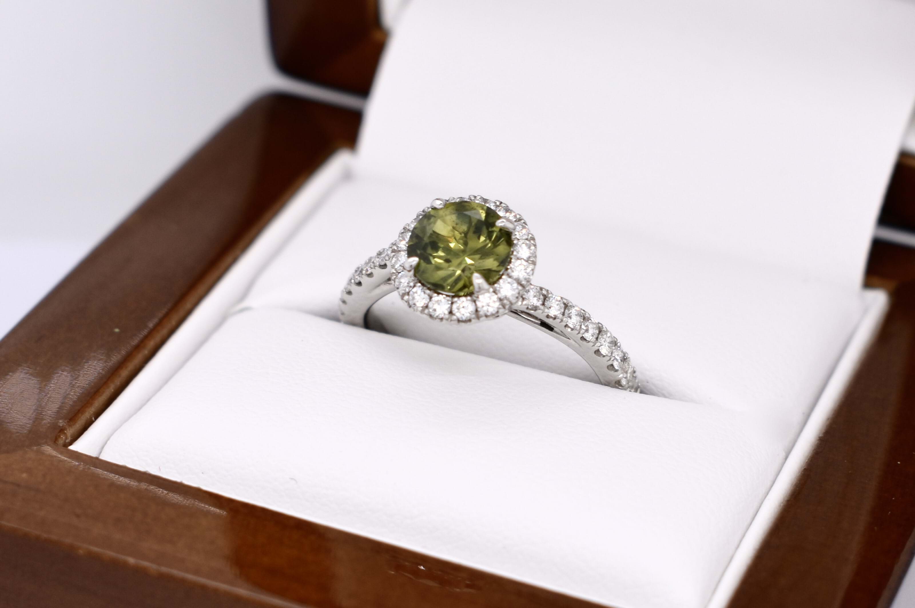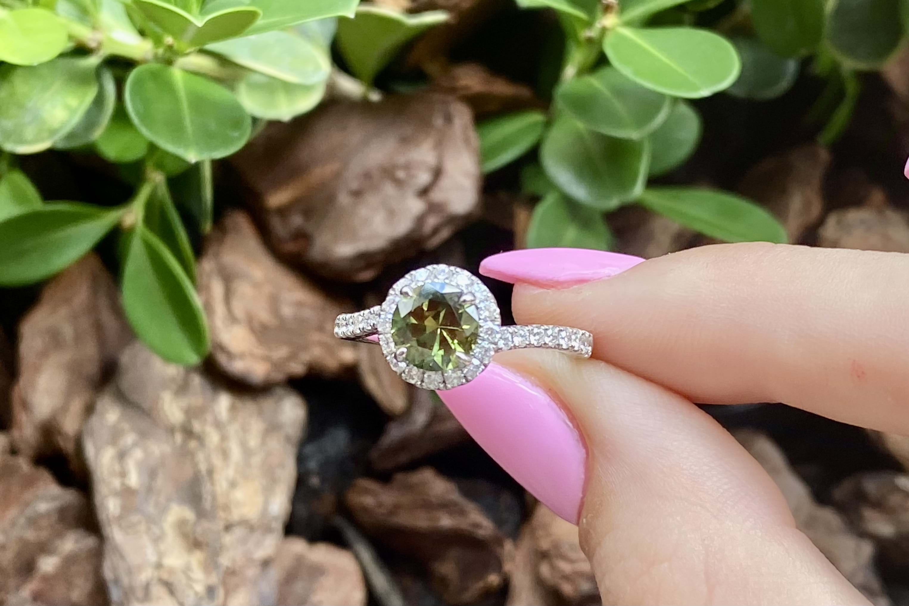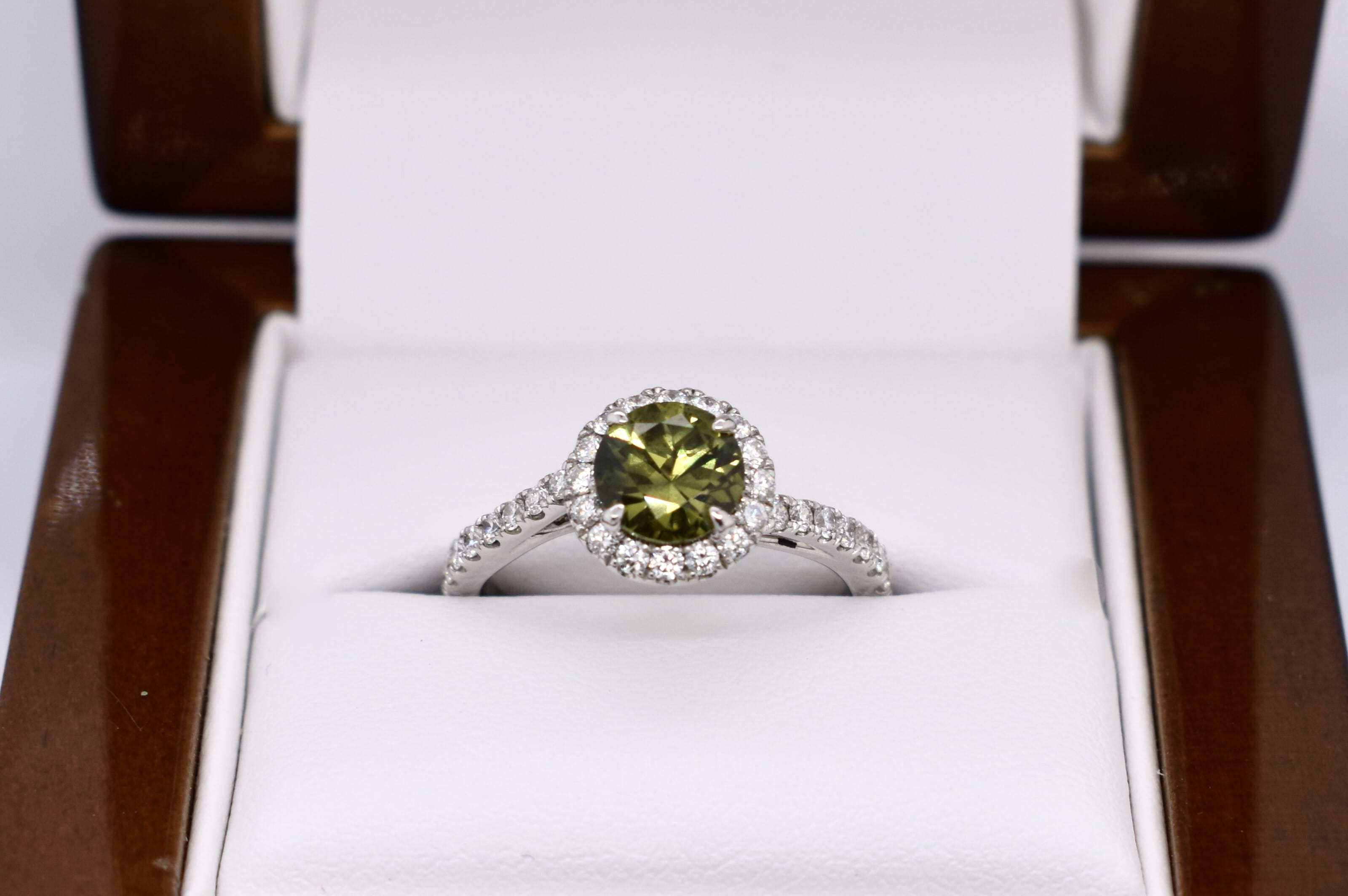 This beautiful ring features a central round Australian green sapphire of 1.30ct, four claw set, in 18ct white gold. With a shimmering halo of round brilliant cut white diamonds surrounding it and continuing down the band. Total of 32 diamonds weighing 0.47ct GH SI total. Finger size M. Independent Valuation available upon purchase.