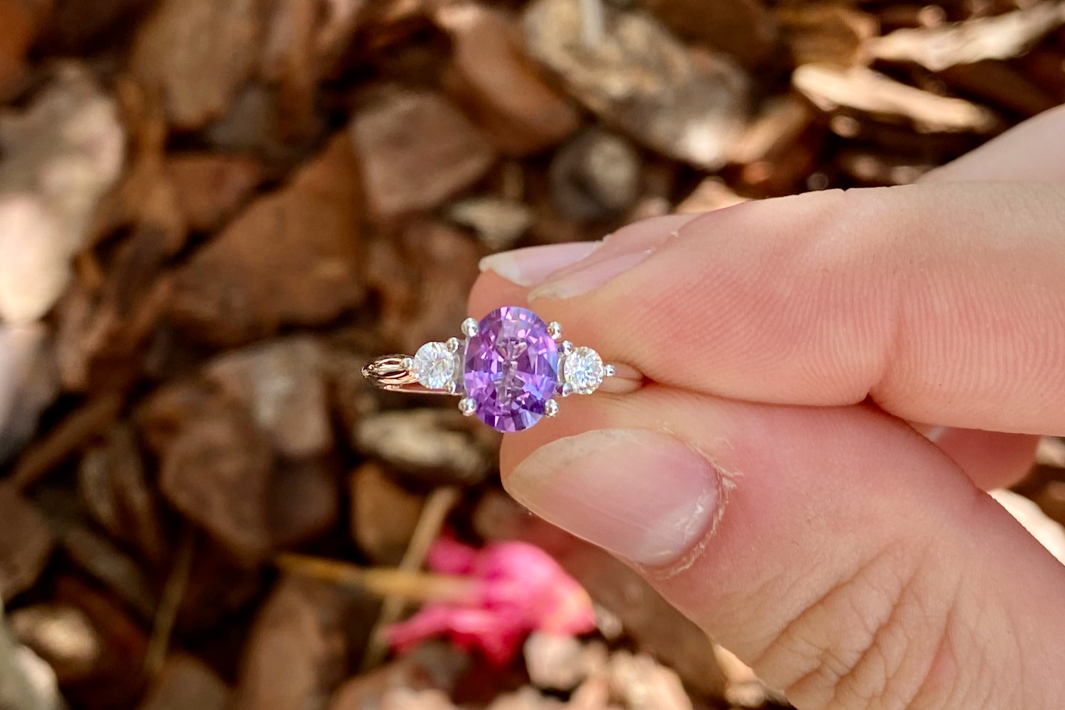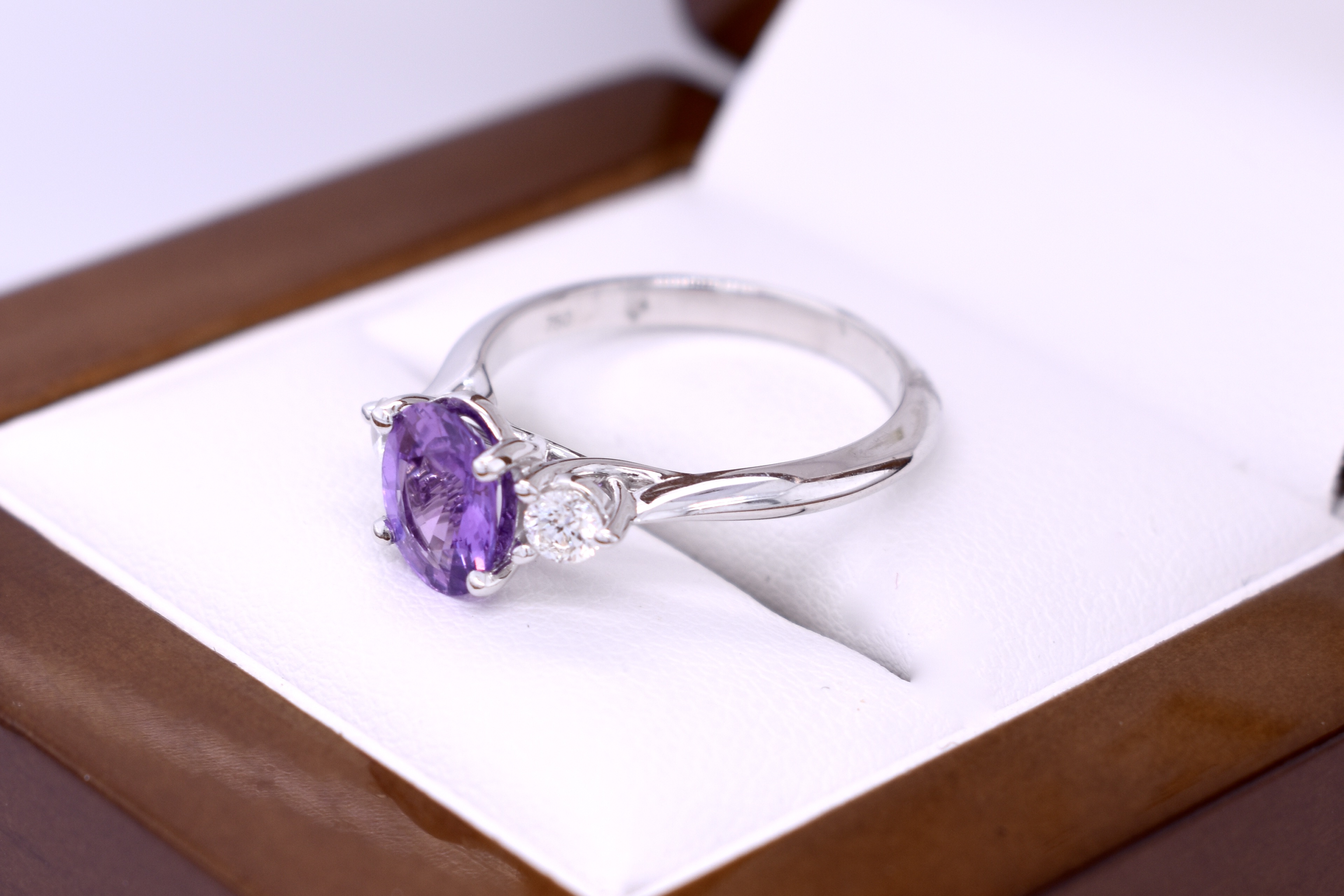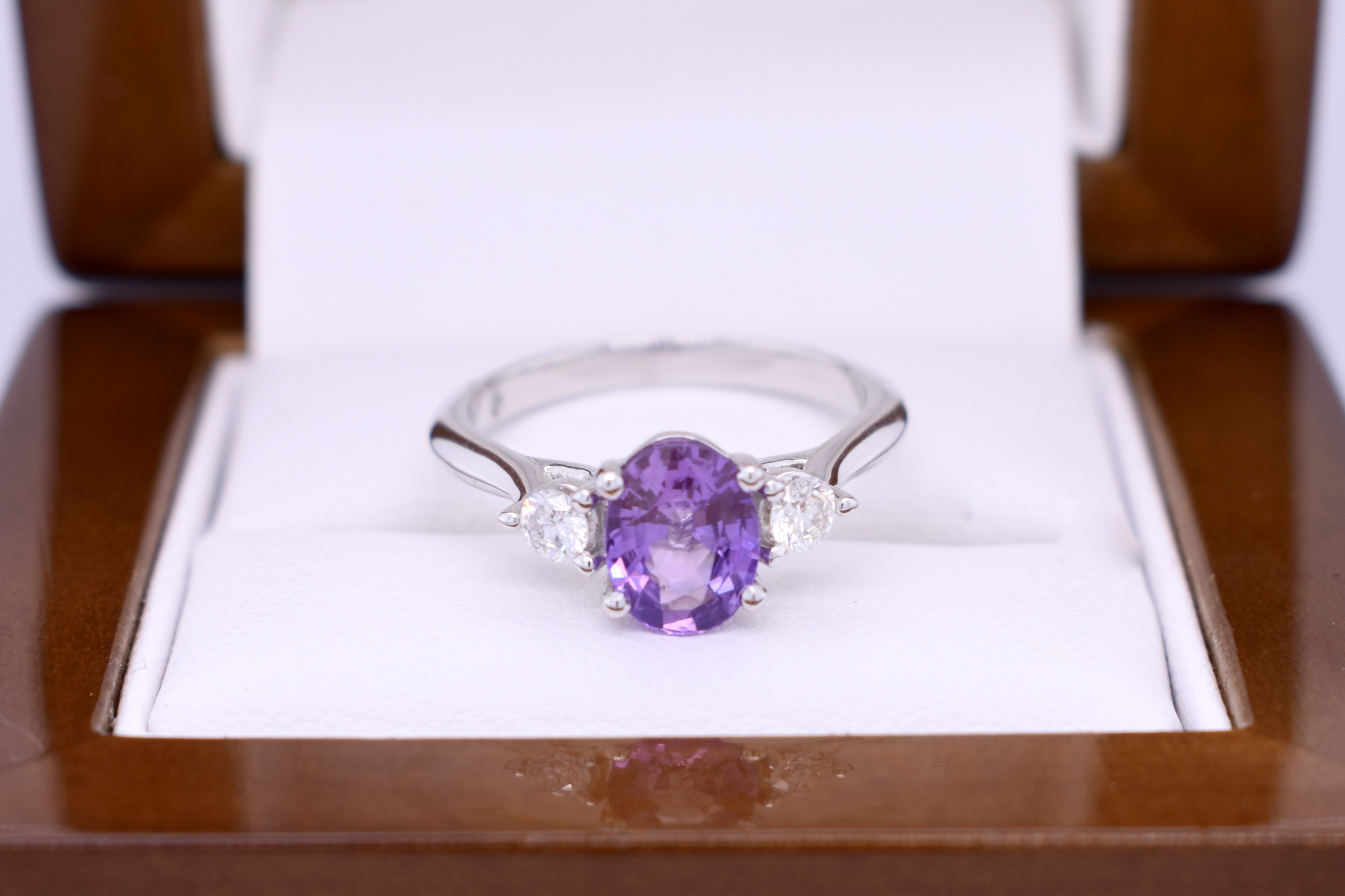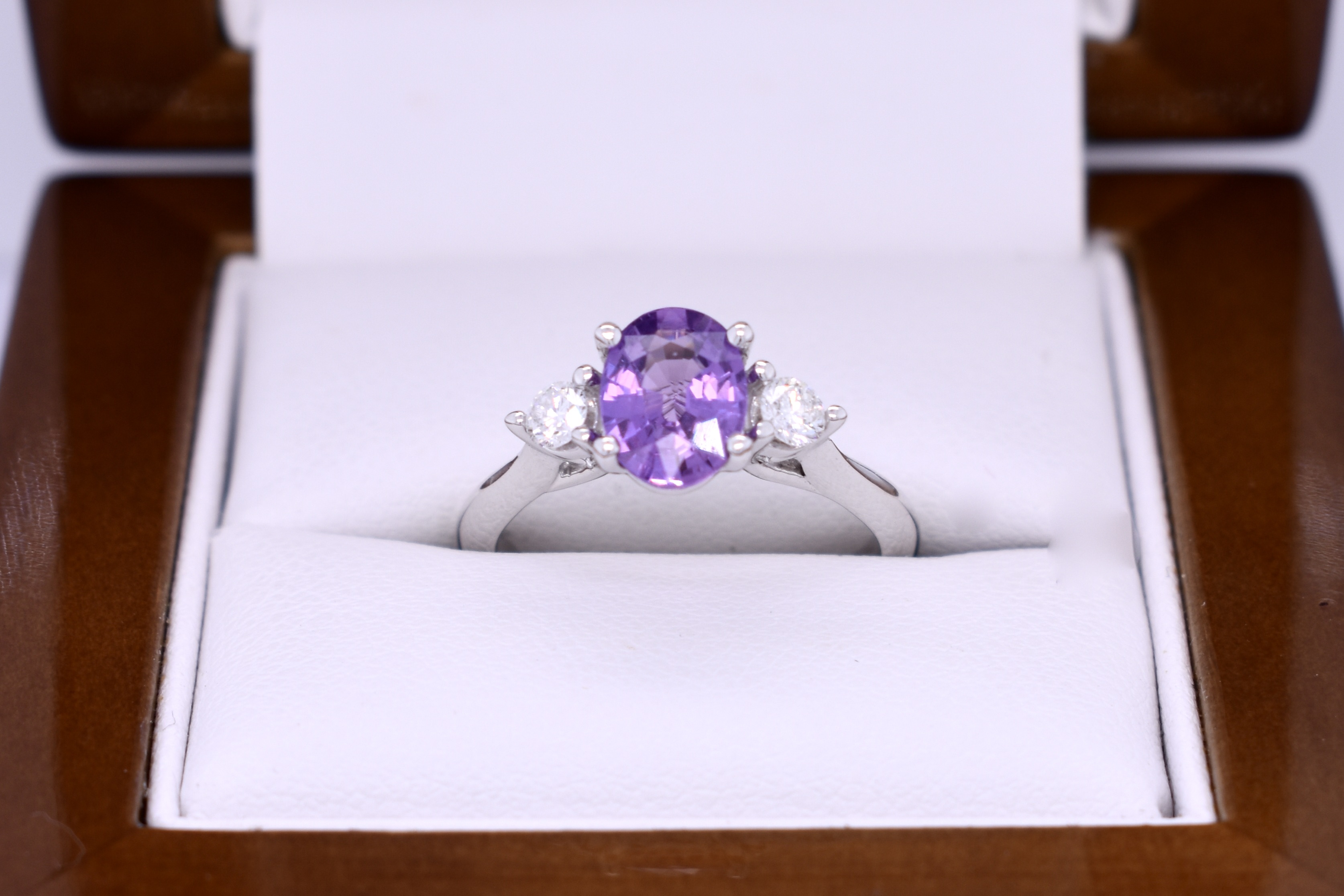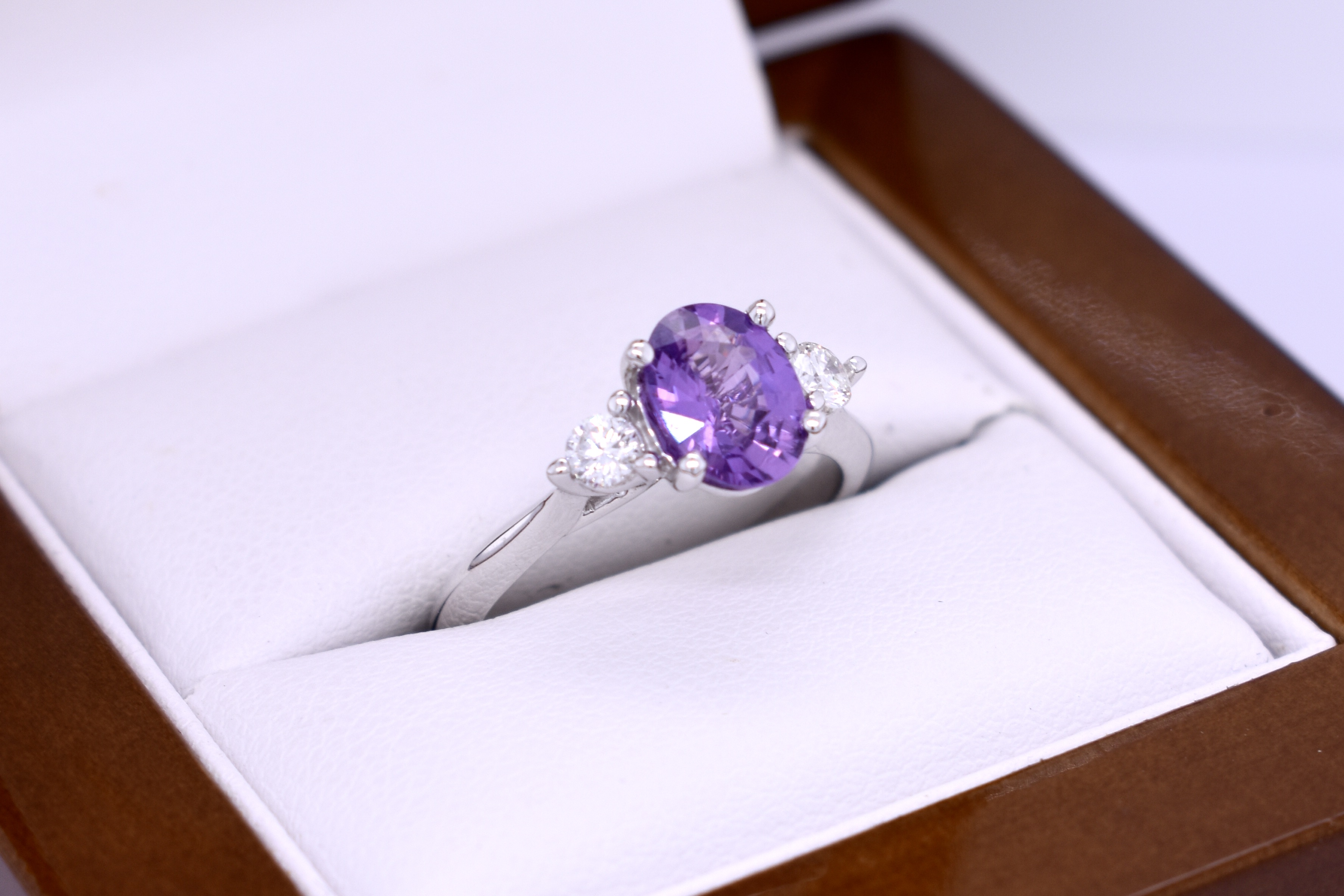 Bright and eye-catching, this 18ct white gold ring features a centre purple Ceylon oval sapphire of 1.34ct, four claw set with a round brilliant cut diamond either side. Total diamond weight of 0.20ct FG SI. Set with a lovely trellis style design and 2.18mm wide knife edge band. Finger size L.