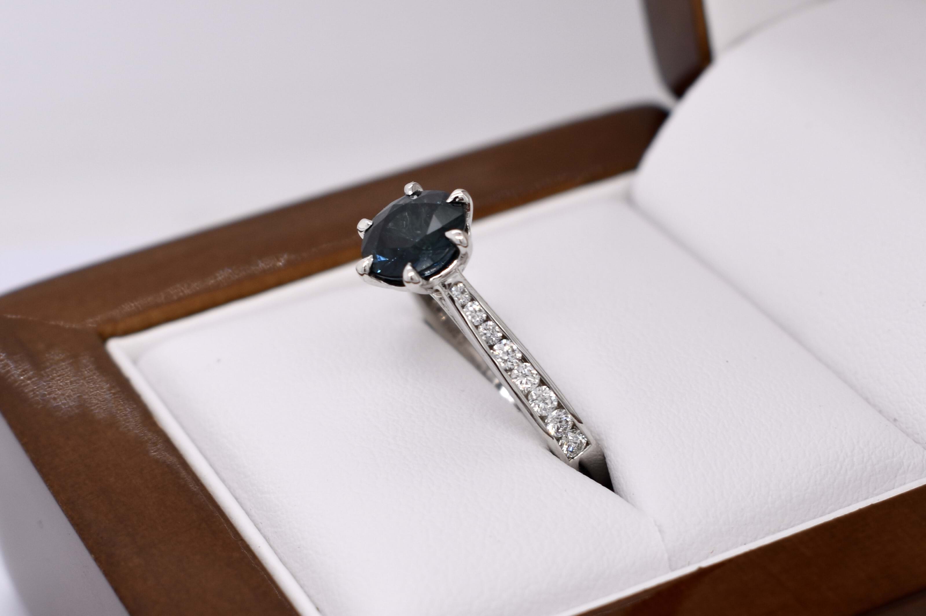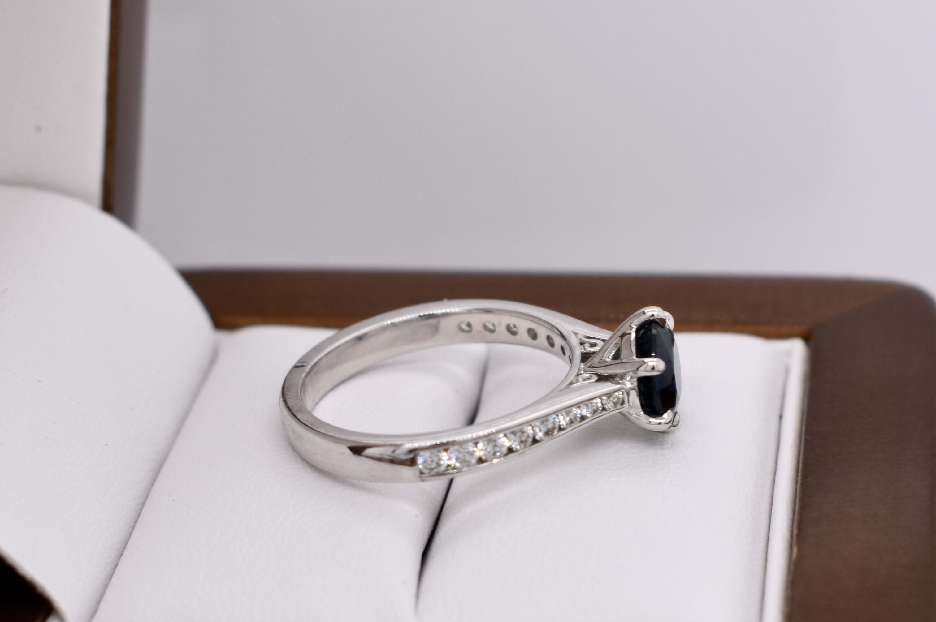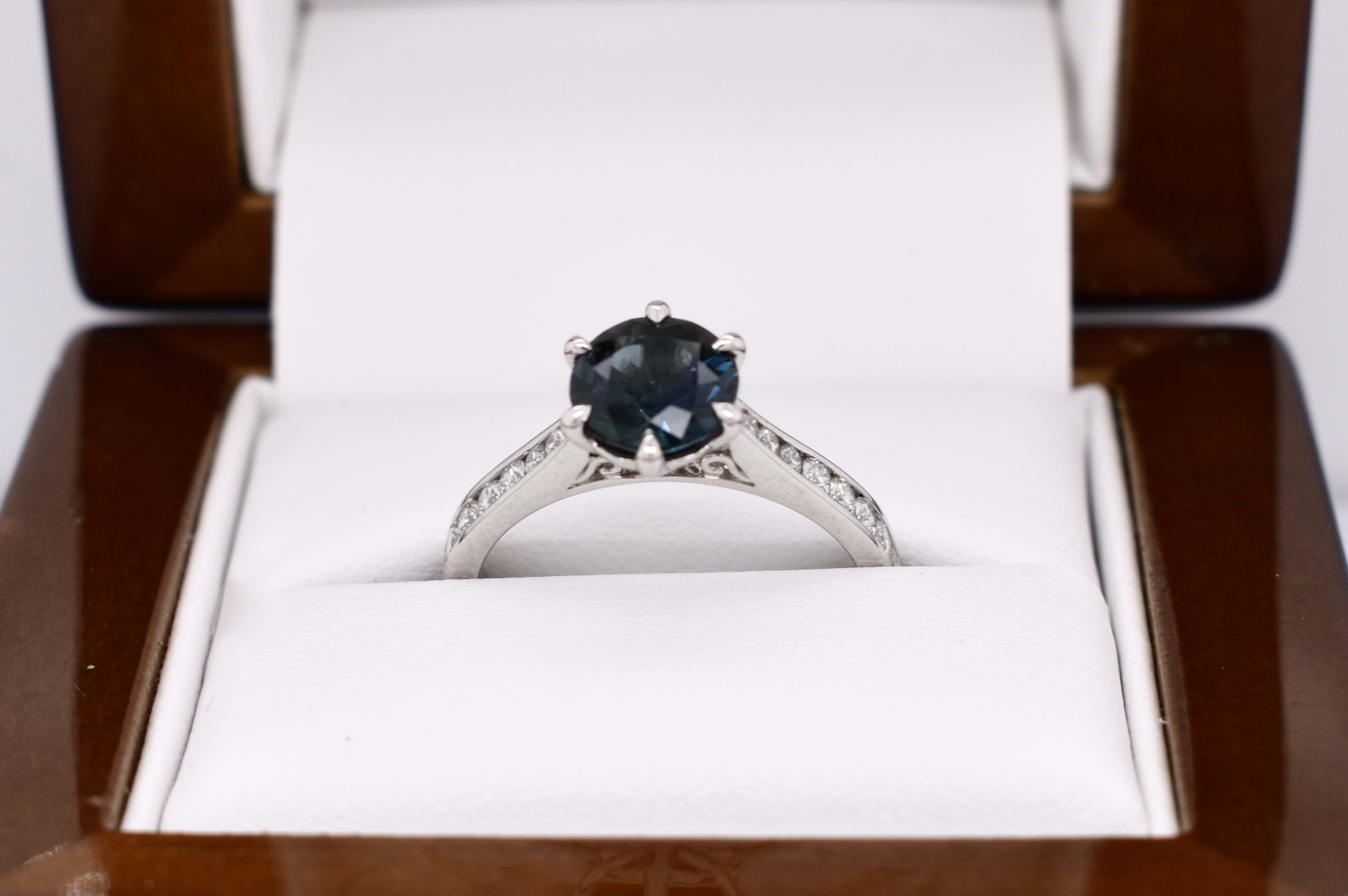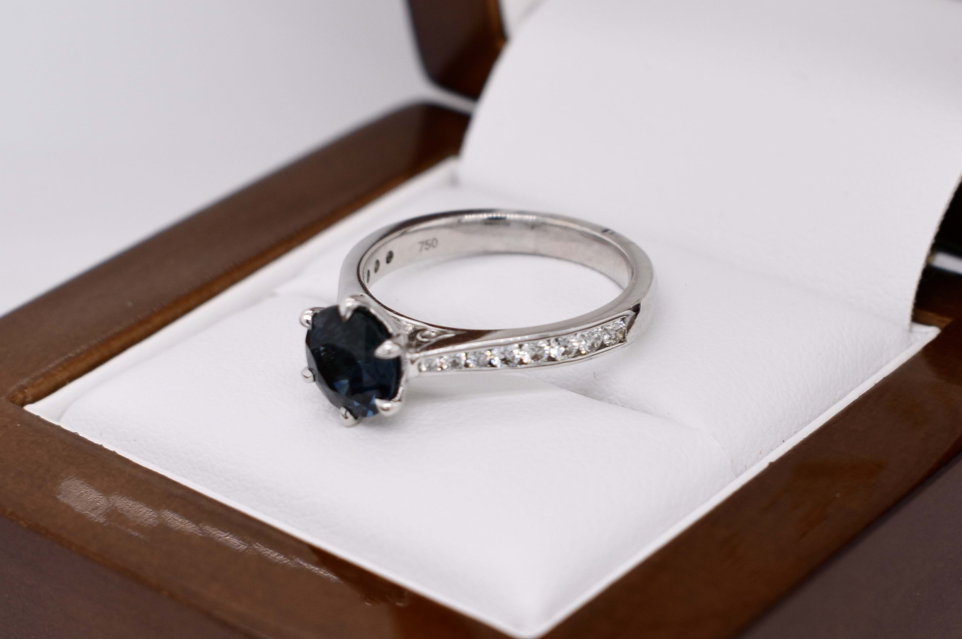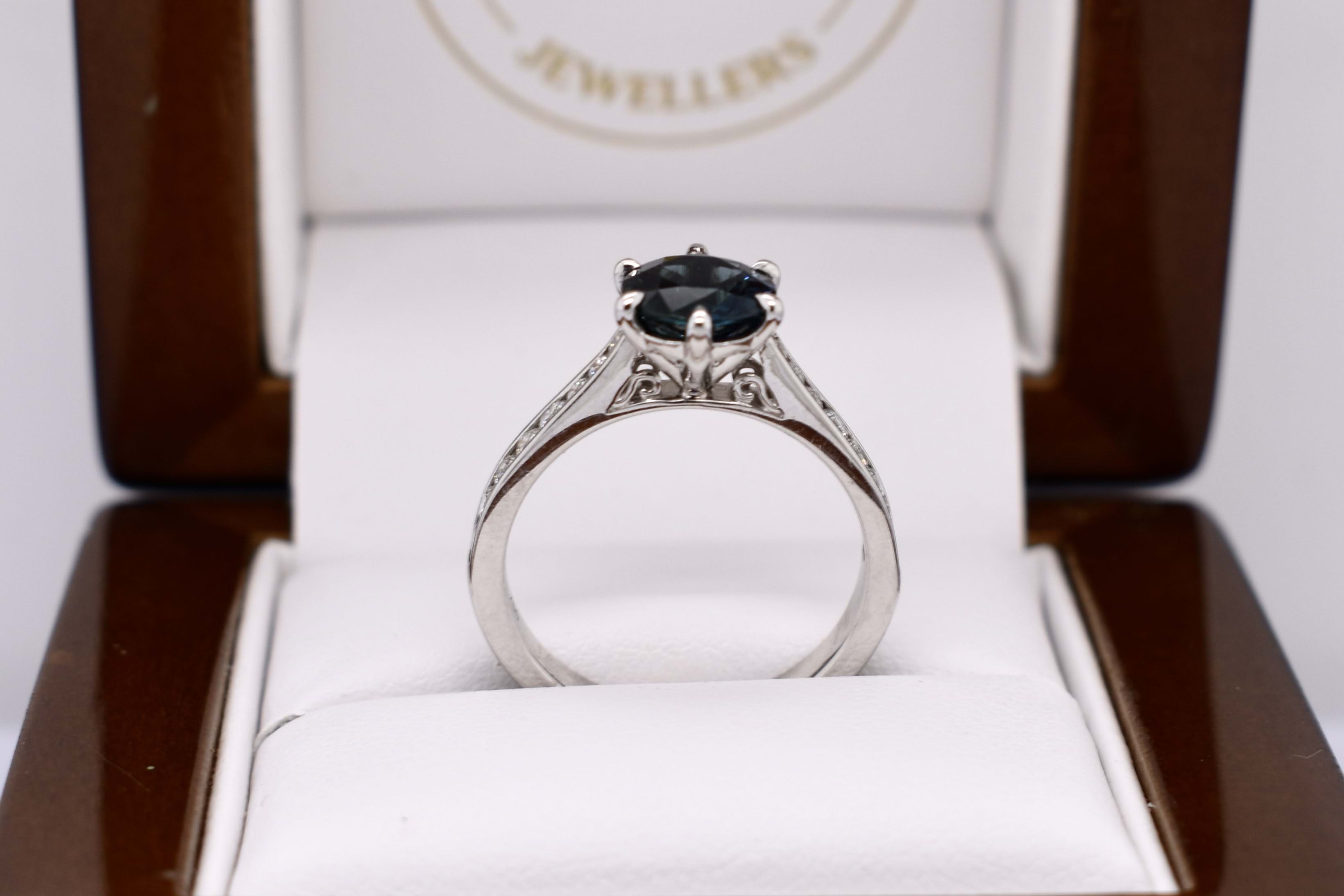 Crafted in 18ct white gold, this ring features a dark blue round Australian sapphire of 1.42ct, six claw set with sixteen round brilliant cut diamonds channel set down the shoulders. Total diamond weight of 0.33ct G SI. Finger size M. Independent Valuation available upon purchase.