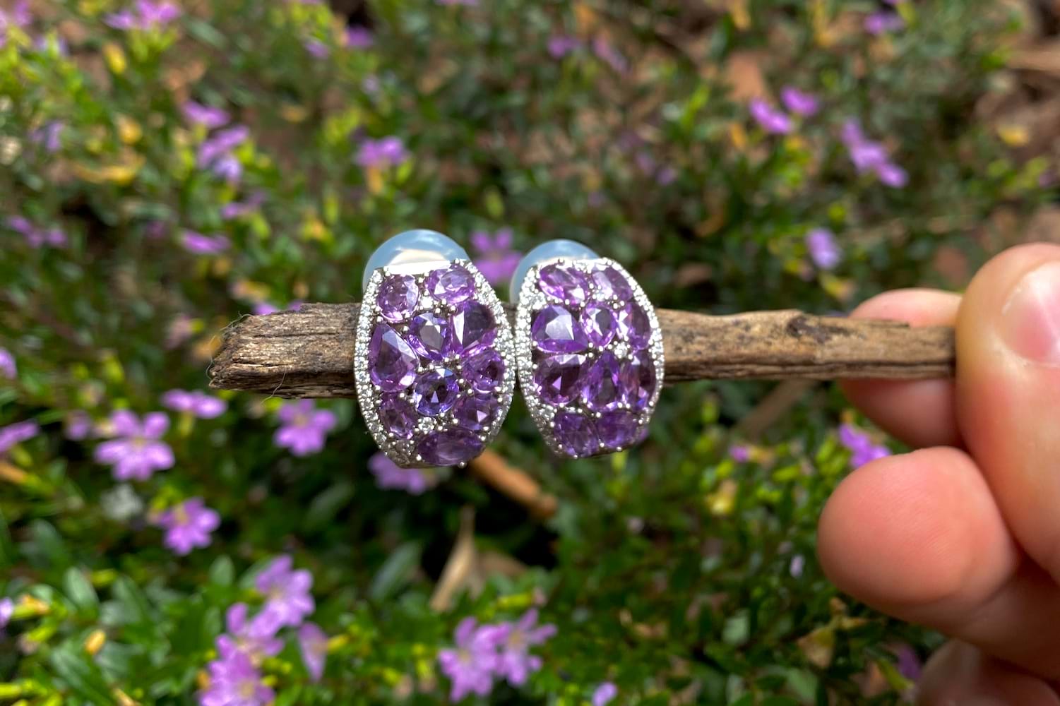 18ct White Gold 7.35ct Purple Sapphire & 0.52ct Diamond Cluster Earrings