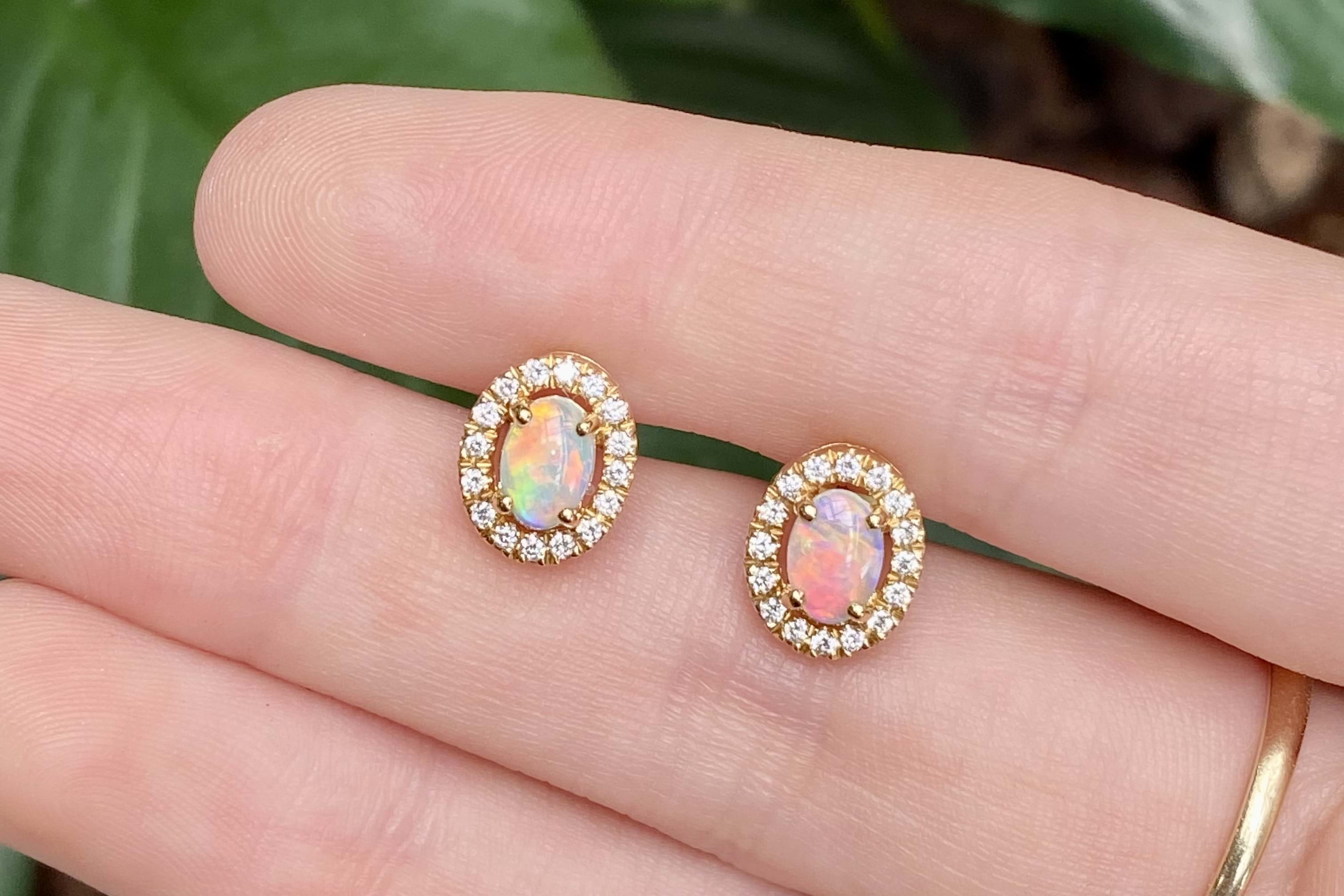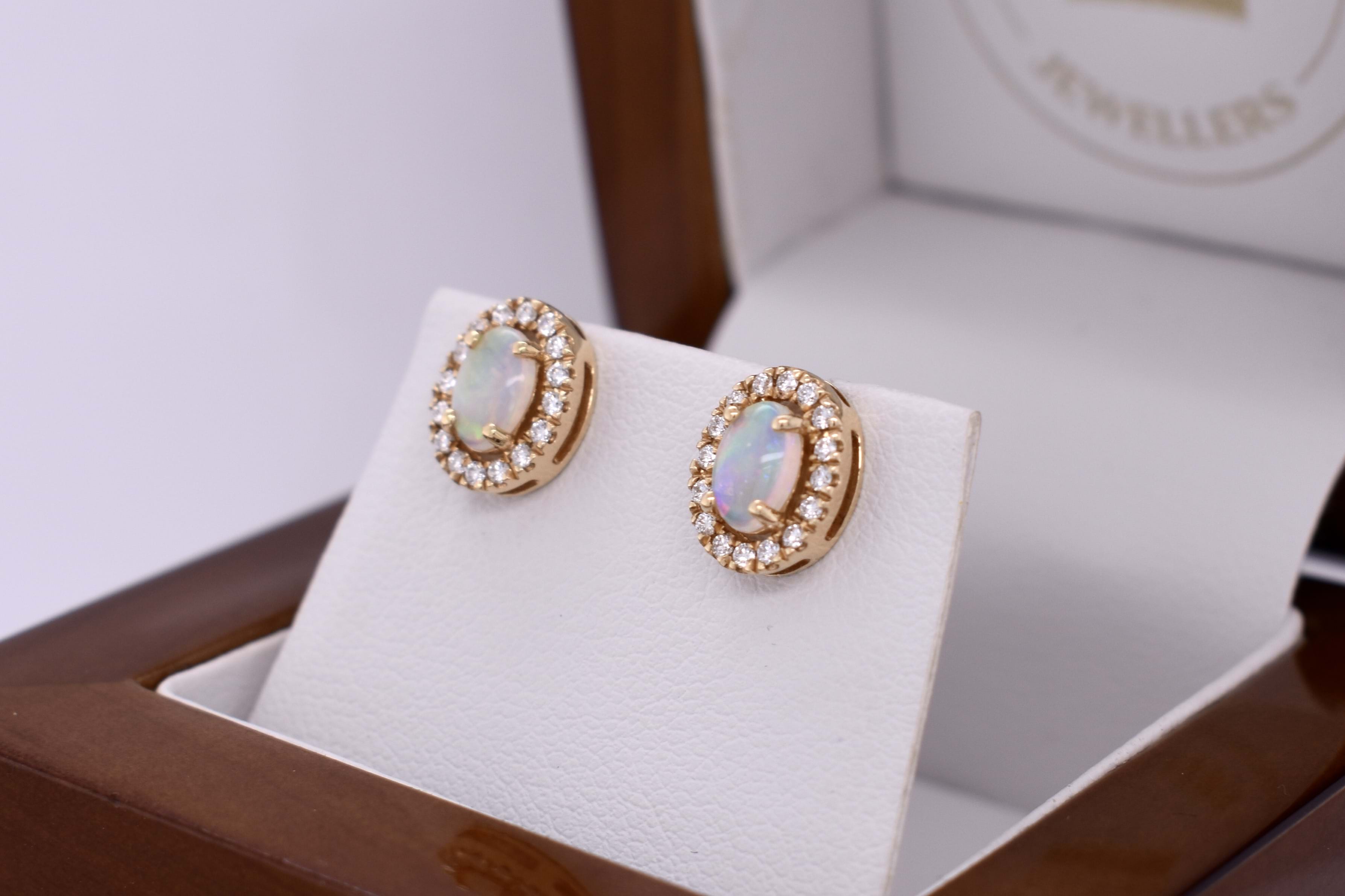 This gorgeous pair of studs feature two crystal opals equalling 0.52ct, four claw set into 18ct yellow gold. The opals are oval in shape, and have jaw-dropping full colour spectrum rolling flashes throughout. Each complimented by a 15 stone diamond halo totalling 30 round brilliant cuts equalling 0.21ct FGVS. Independent valuation supplied.