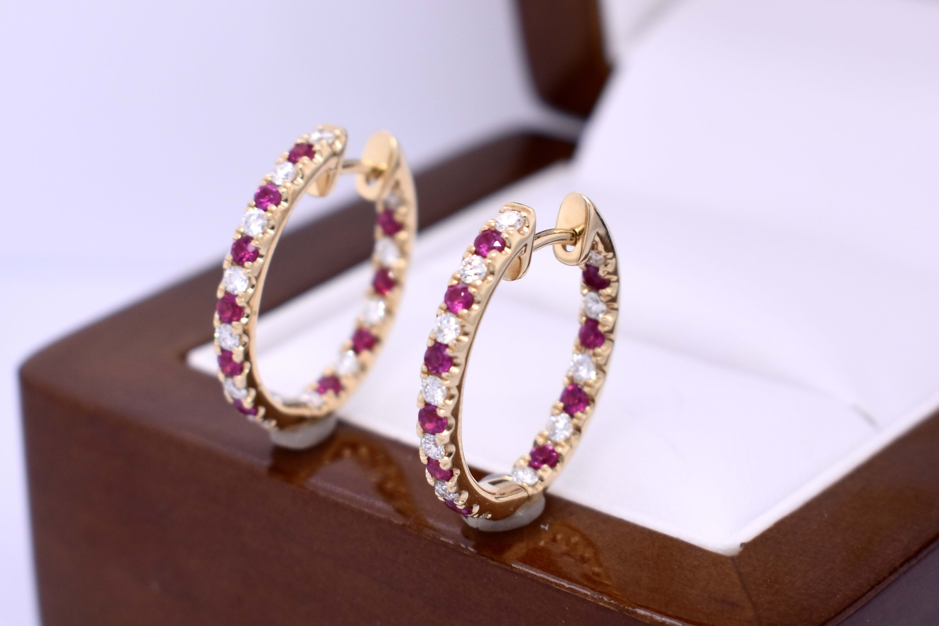This classy pair of hoop earrings are crafted in 18ct yellow gold, set with alternating rubies and diamonds. 10 bright, pinkish red round rubies equal 0.61ct and 24 RBC diamonds equal 0.48ct FVS. Huggies are round in shape with clipped post fittings.