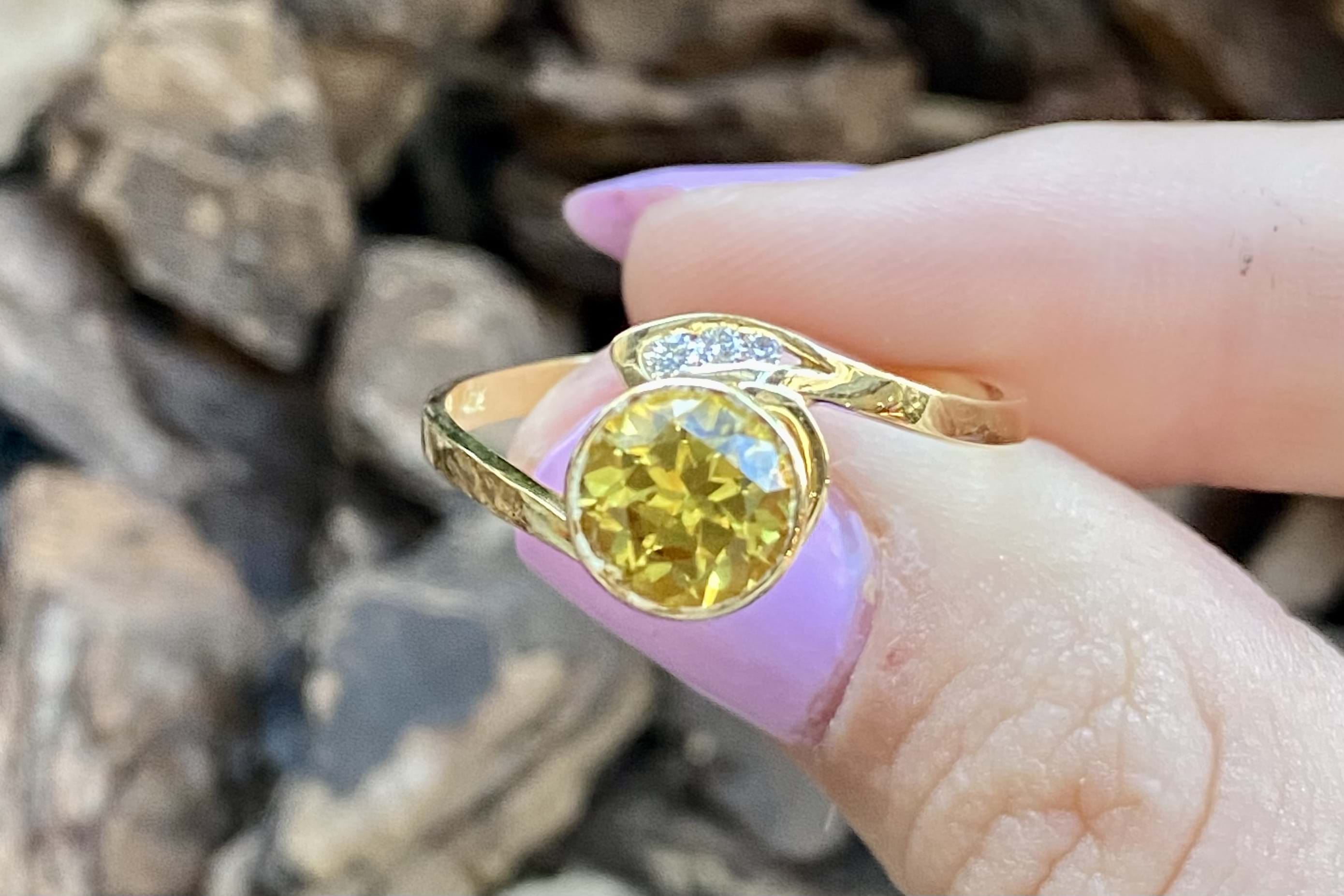 This gorgeous ring is entirely handmade and features a bright, eye-clean, well cut, strong orangish yellow Australian sapphire weighing approx. 1.79cts, bezel set in 18ct yellow gold and complimented by 3 round channel set diamonds on one shoulder. The band is offset and finishes the design with a subtle swirl pattern. Finger size U. Diamond clarity GH SI. Independent valuation supplied.