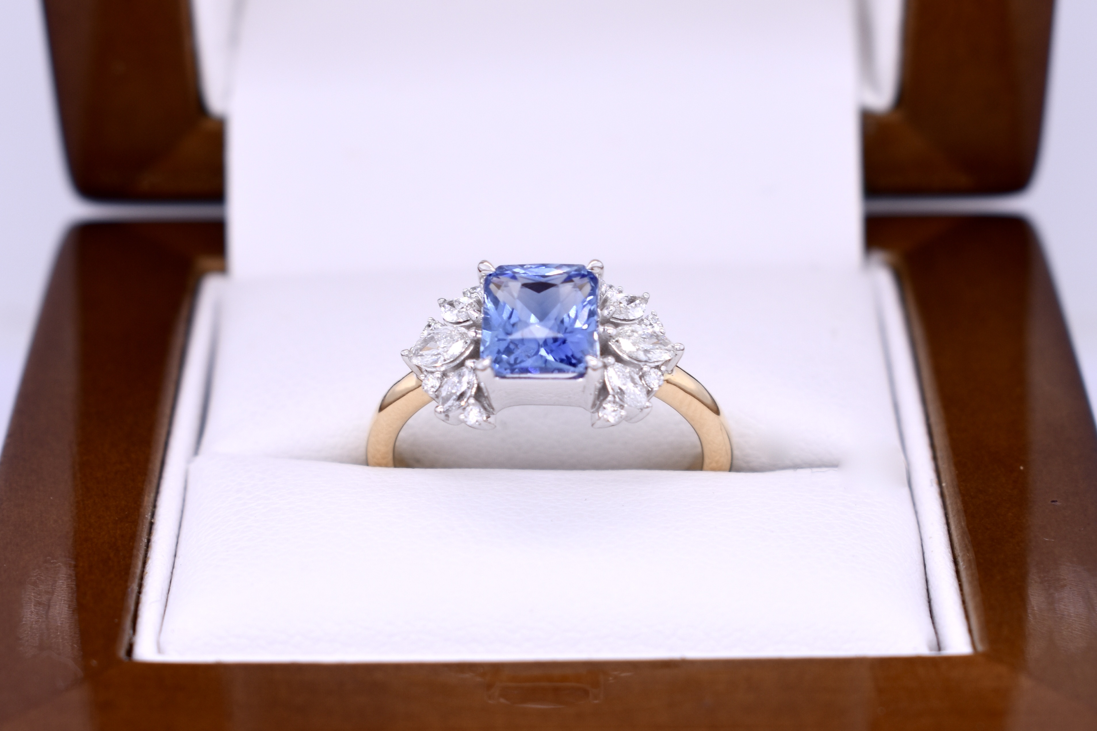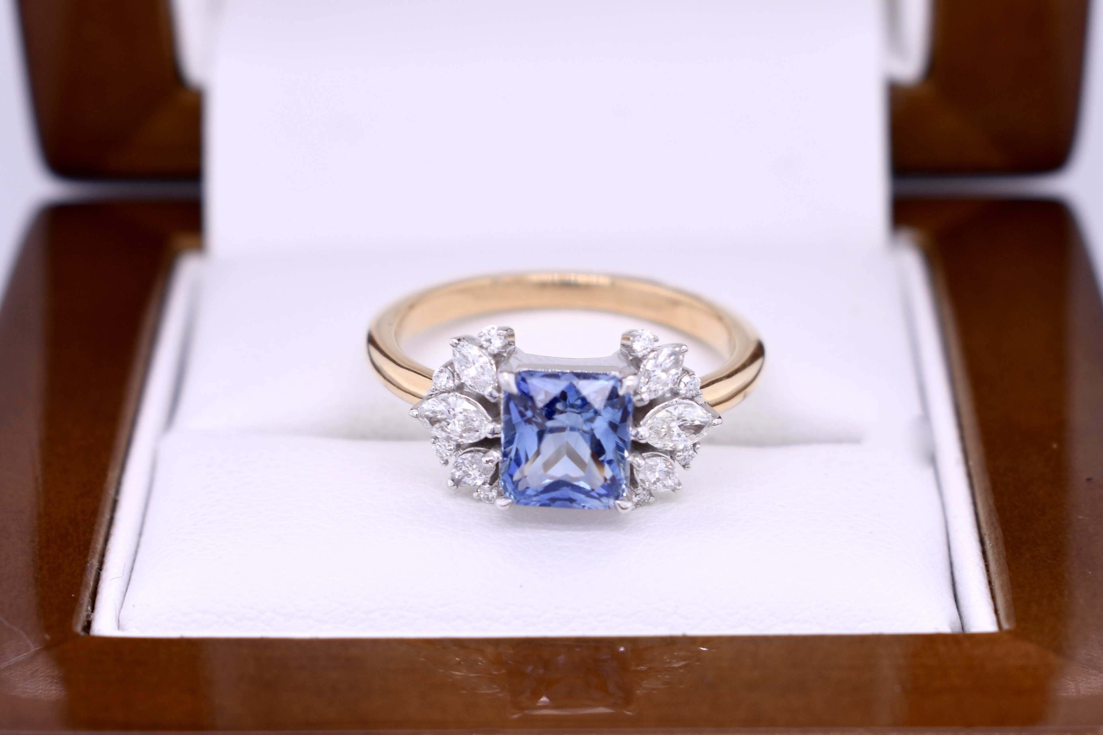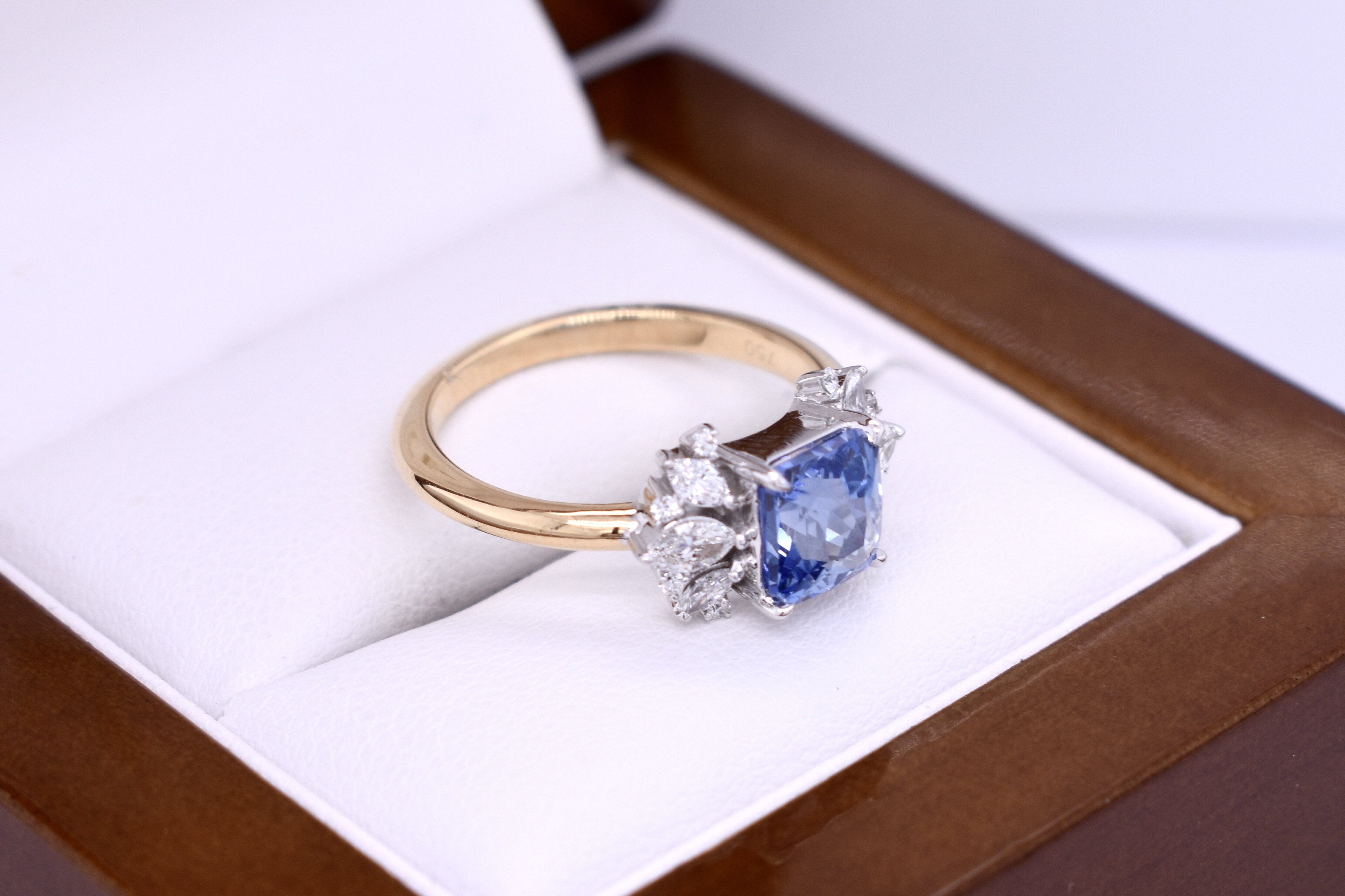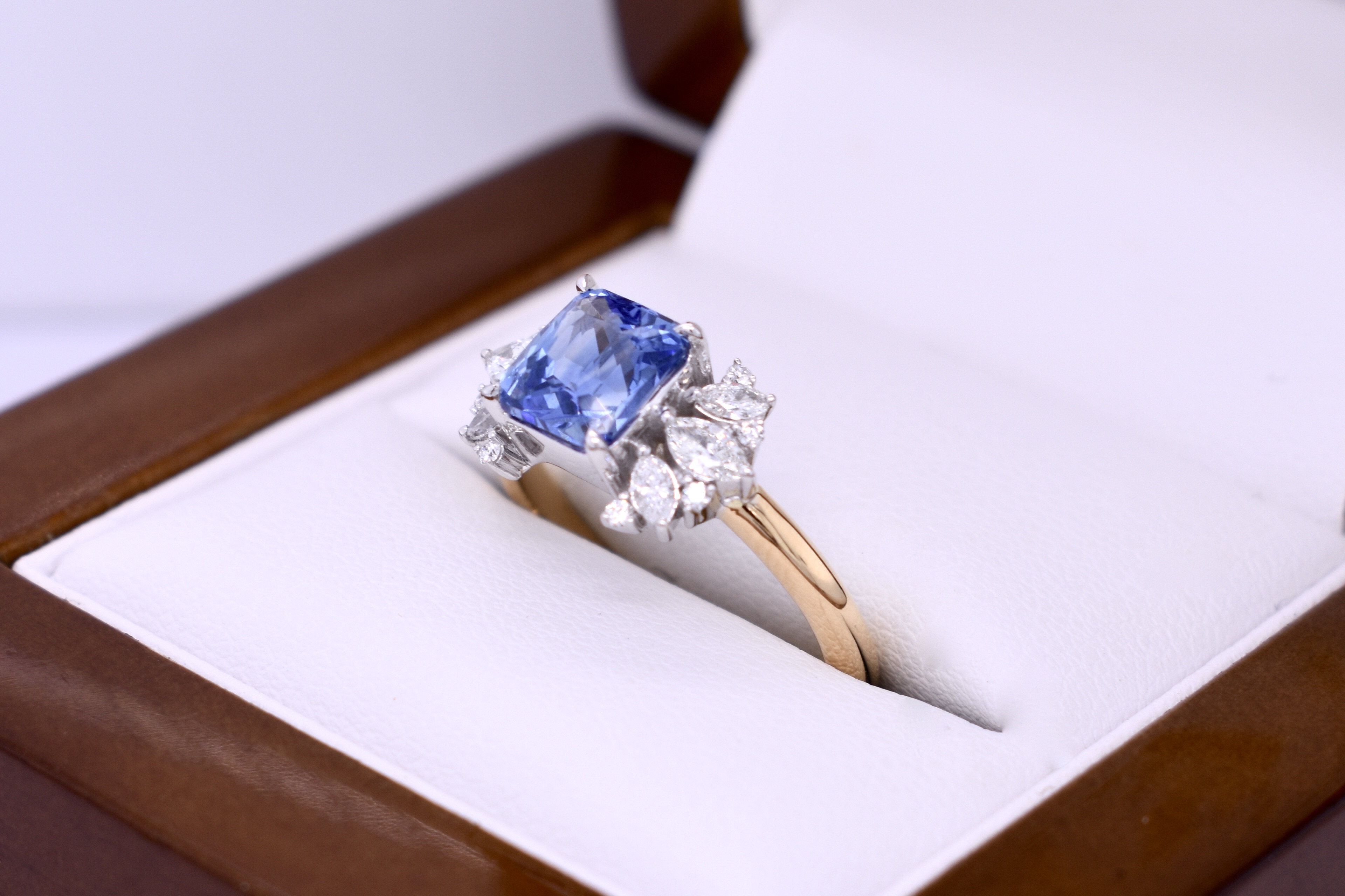 Crafted in 18ct yellow gold, this stunning Ceylon blue square radiant cut sapphire of 1.98ct, four claw set in white gold with a cluster of 7 marquise and round diamonds set each side. A total of 14 diamonds totalling 0.34ct GH SI. Finished with a plain gold band, this ring sits quite low to the finger. Finger size M.