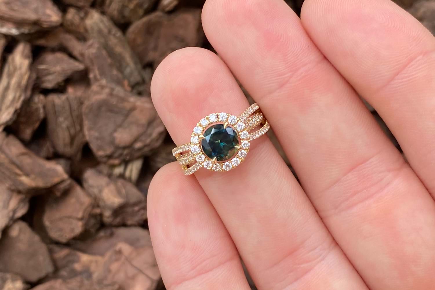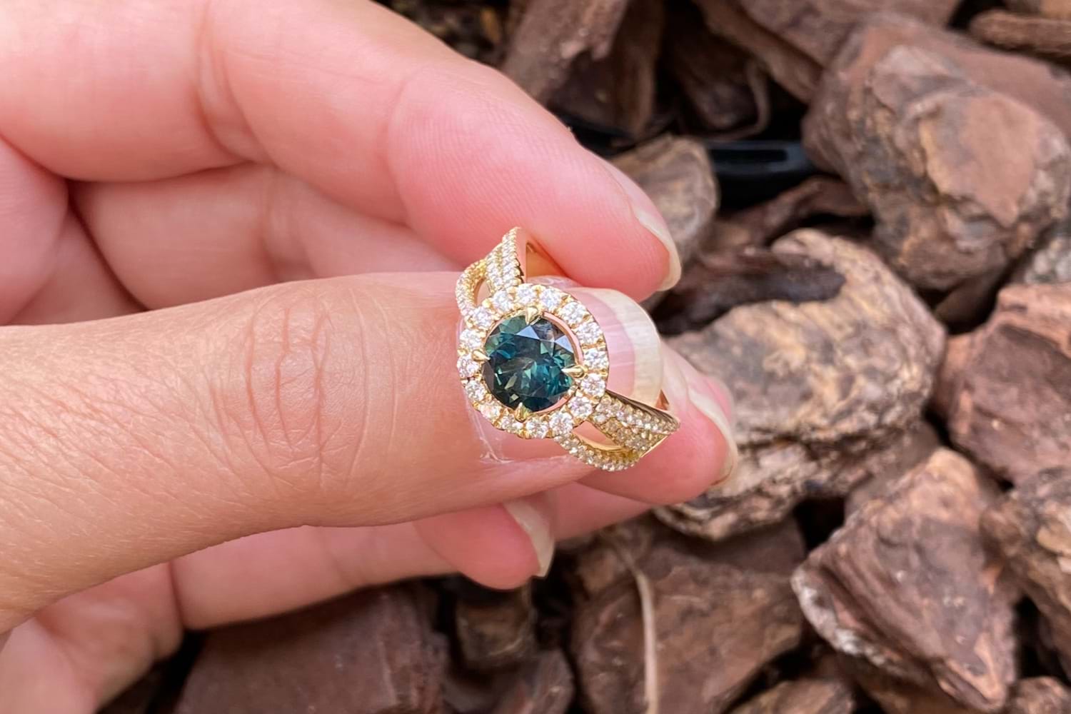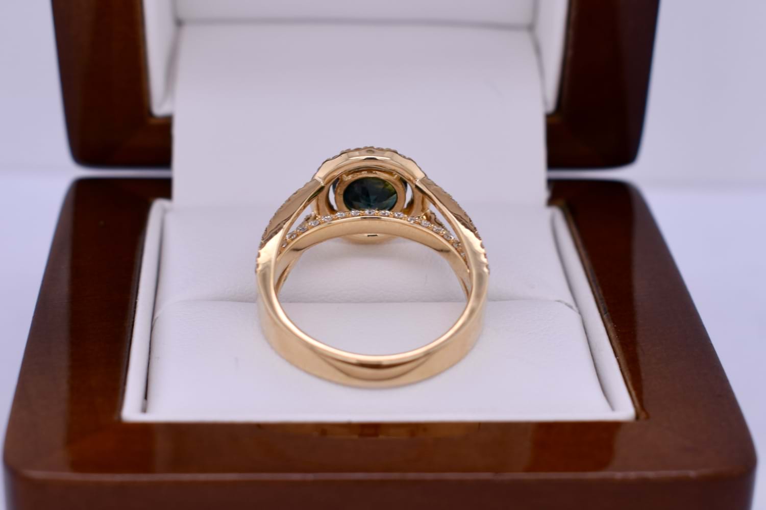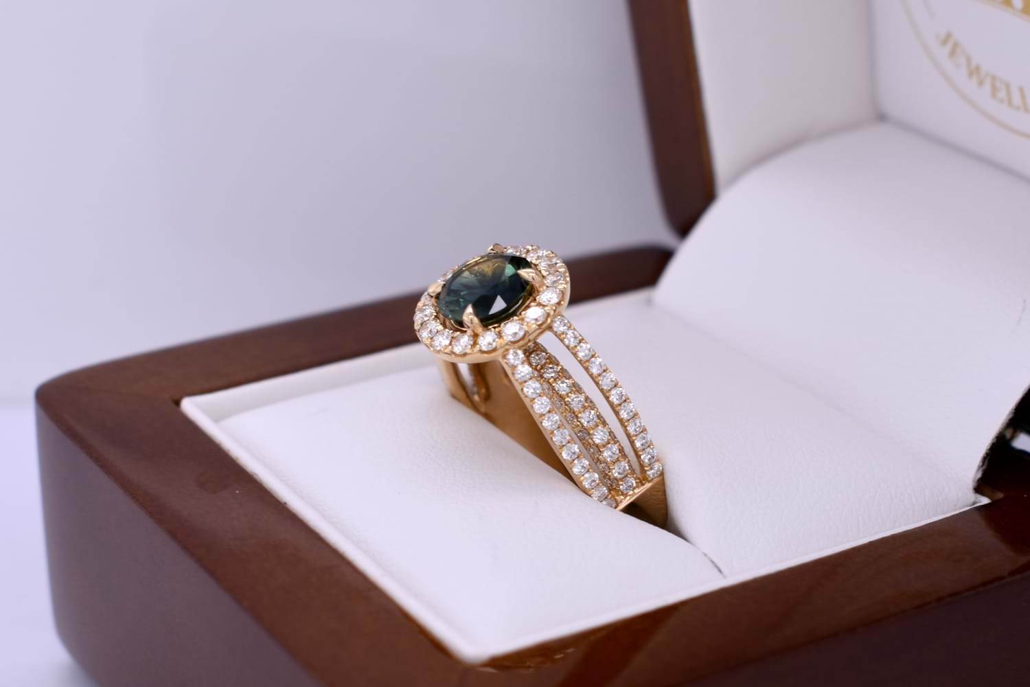 Beautifully crafted in 18ct yellow gold, showcasing a round iridescent Australian parti sapphire four claw set and surrounded by a halo of round brilliant cut diamonds. The micro claw diamond set outer shoulders sweep upward to support the halo, creating a graceful, elevated profile, while the middle row of diamonds, also micro claw set, flow alongside the shoulders and down into the under rail beneath the centre setting. Finished on a softly edged flat band measuring approximately 3.16mm wide. The sapphire displays a moderately bright deep greenish blue colour, is eye clean, and is of Australian type, totalling approximately 1.62cts. The diamond content totals approximately 1.00ct, comprising 124 round brilliant cut diamonds graded approximately F-G colour and VS-SI clarity. Independent valuation supplied. Finger size M.