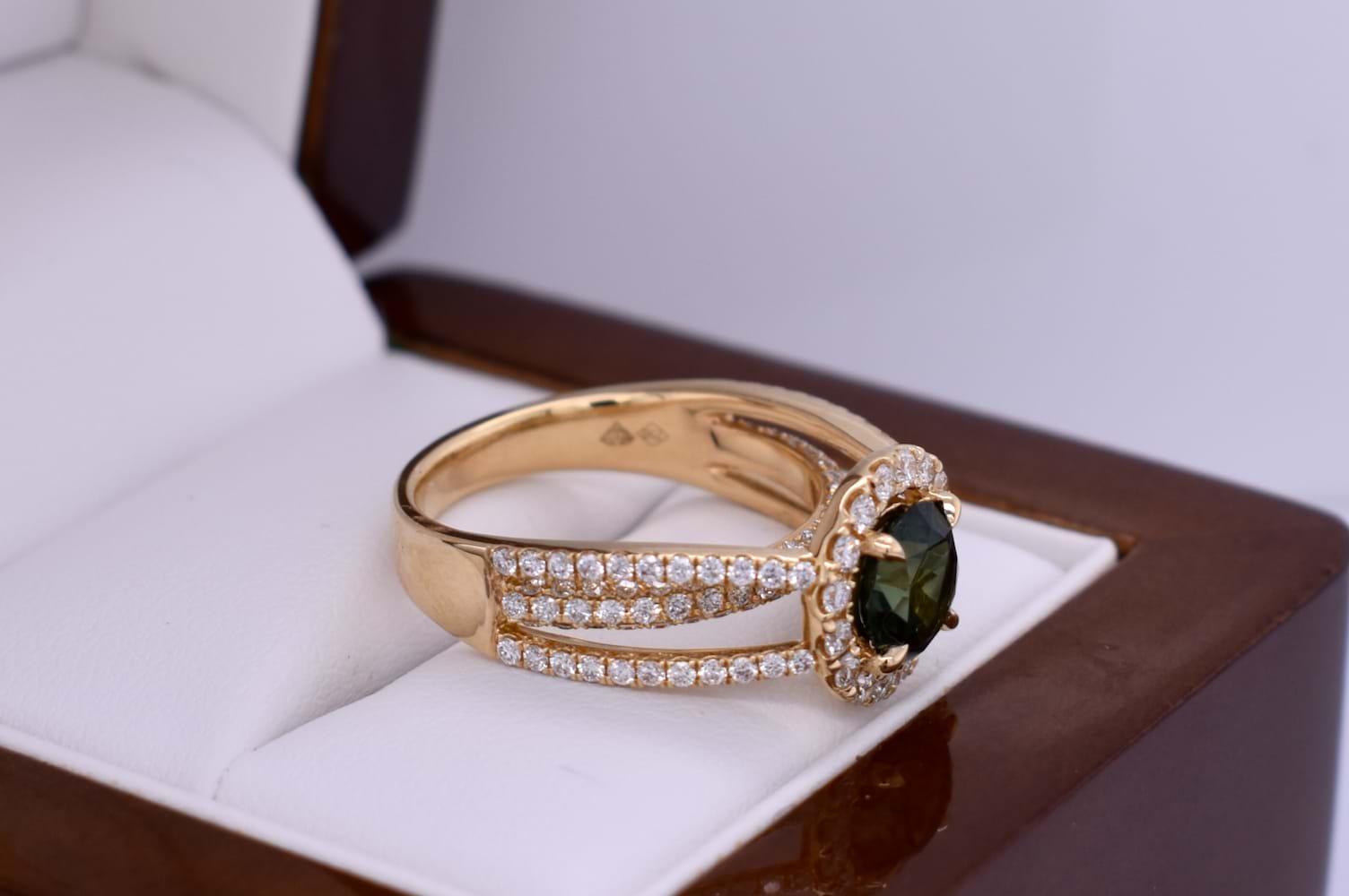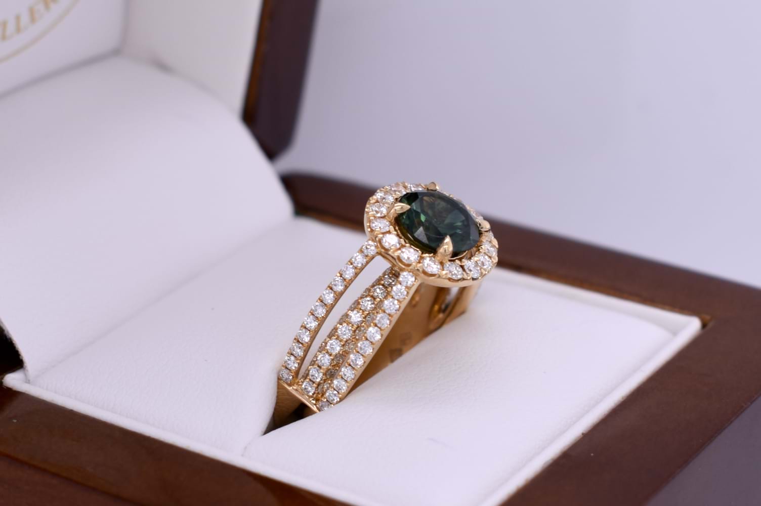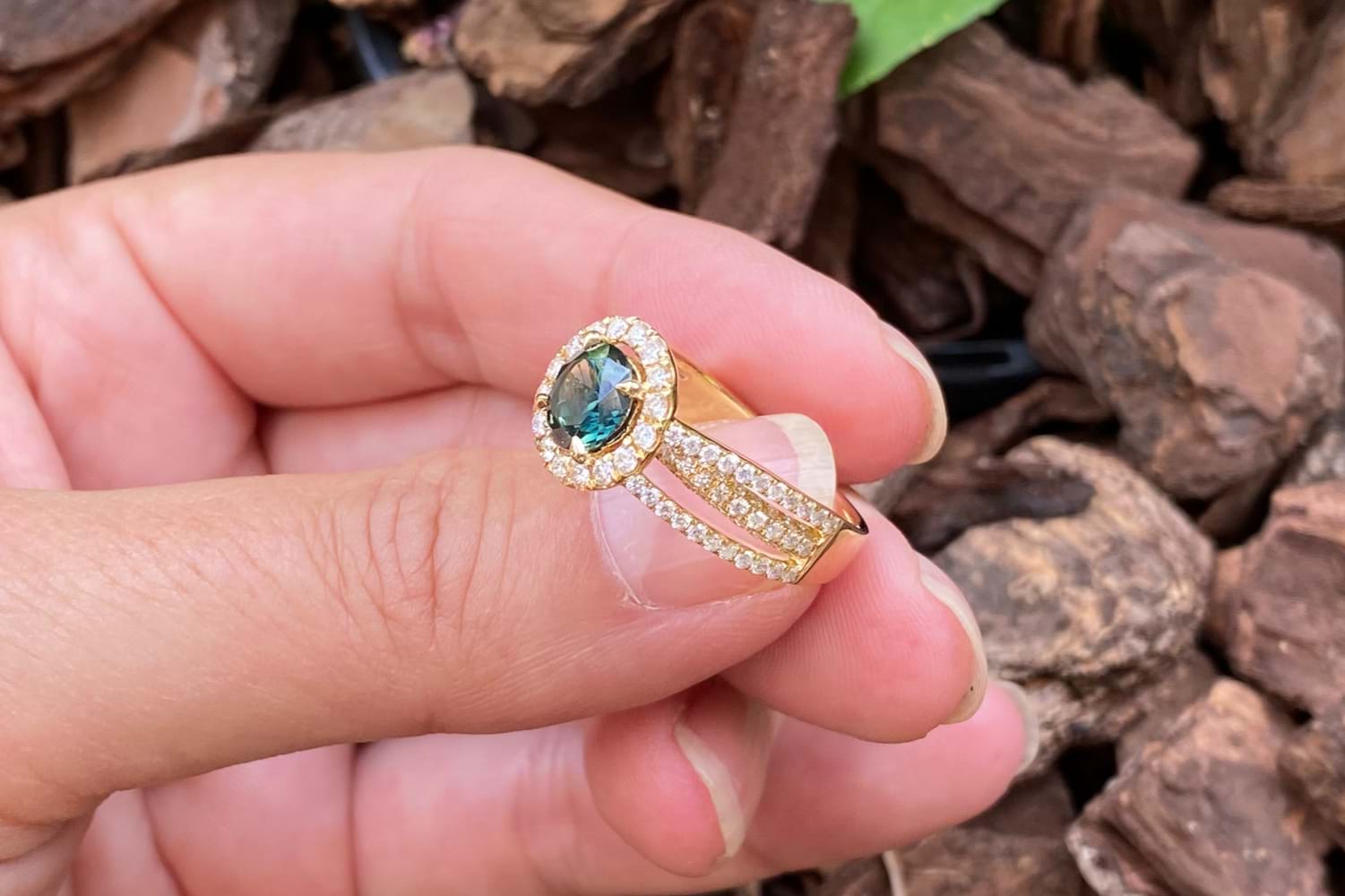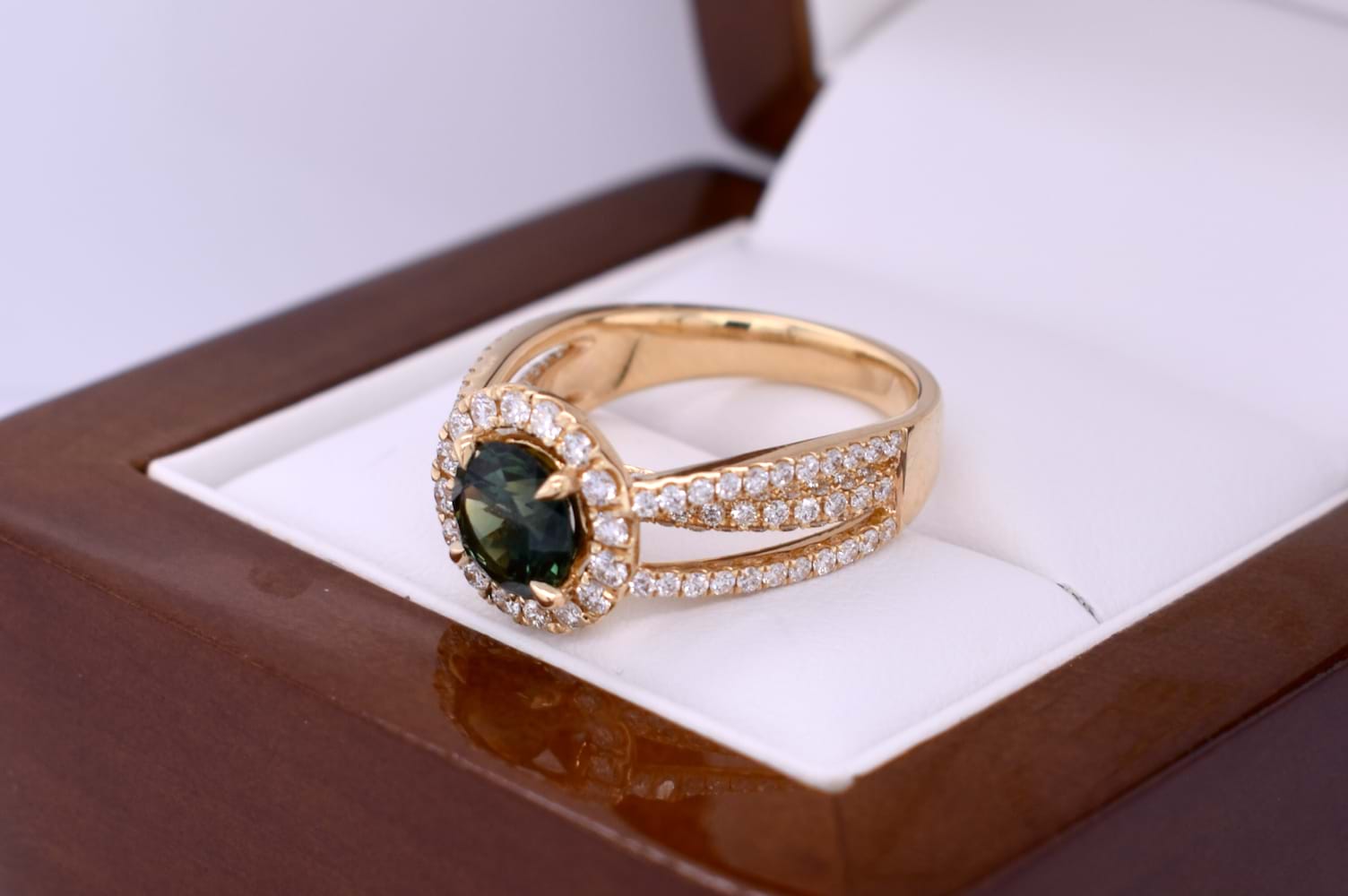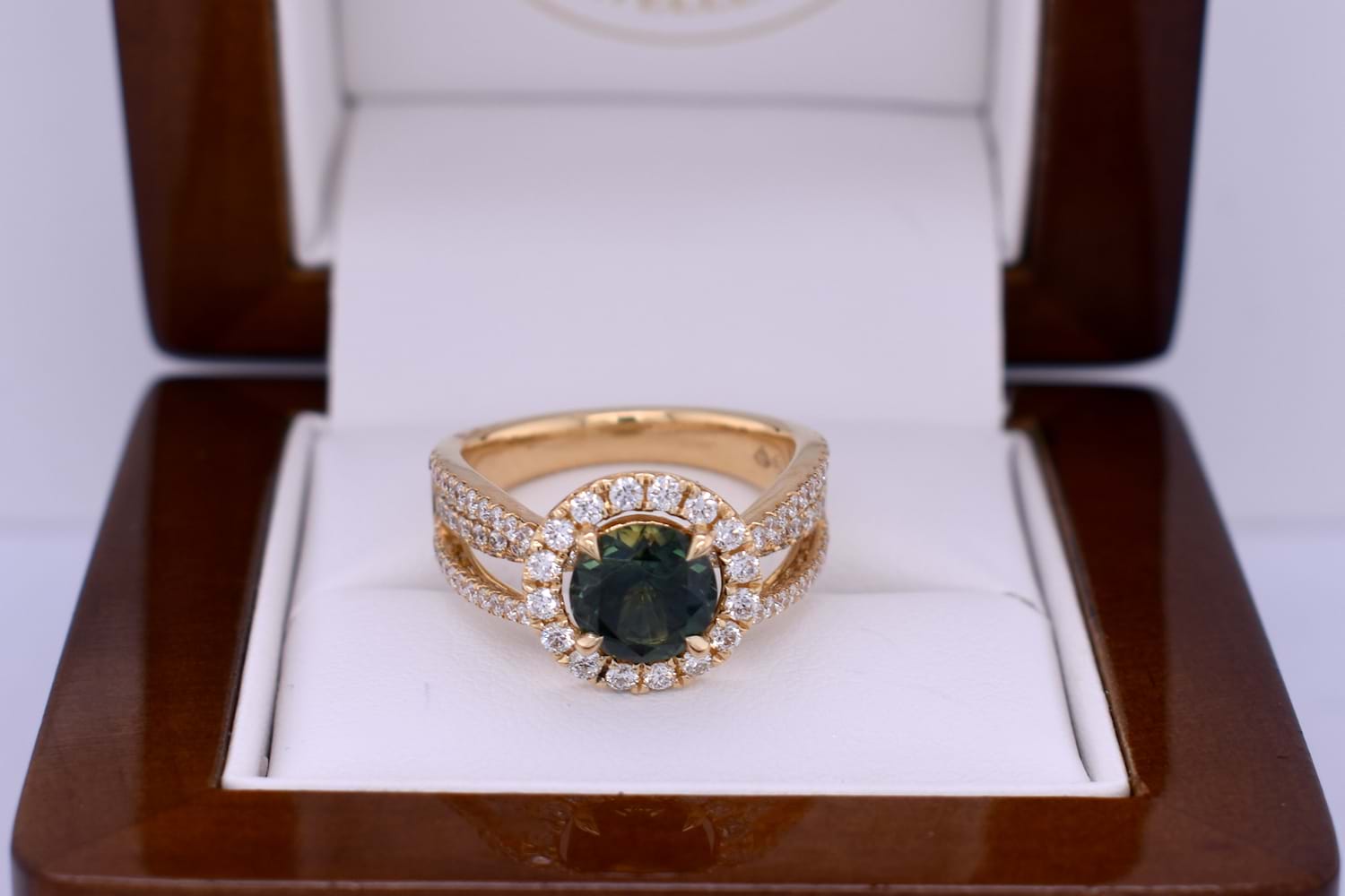Beautifully crafted in 18ct yellow gold, showcasing a round iridescent Australian parti sapphire four claw set and surrounded by a halo of round brilliant cut diamonds. The micro claw diamond set outer shoulders sweep upward to support the halo, creating a graceful, elevated profile, while the middle row of diamonds, also micro claw set, flow alongside the shoulders and down into the under rail beneath the centre setting. Finished on a softly edged flat band measuring approximately 3.16mm wide. The sapphire displays a moderately bright deep greenish blue colour, is eye clean, and is of Australian type, totalling approximately 1.62cts. The diamond content totals approximately 1.00ct, comprising 124 round brilliant cut diamonds graded approximately F-G colour and VS-SI clarity. Independent valuation supplied. Finger size M.