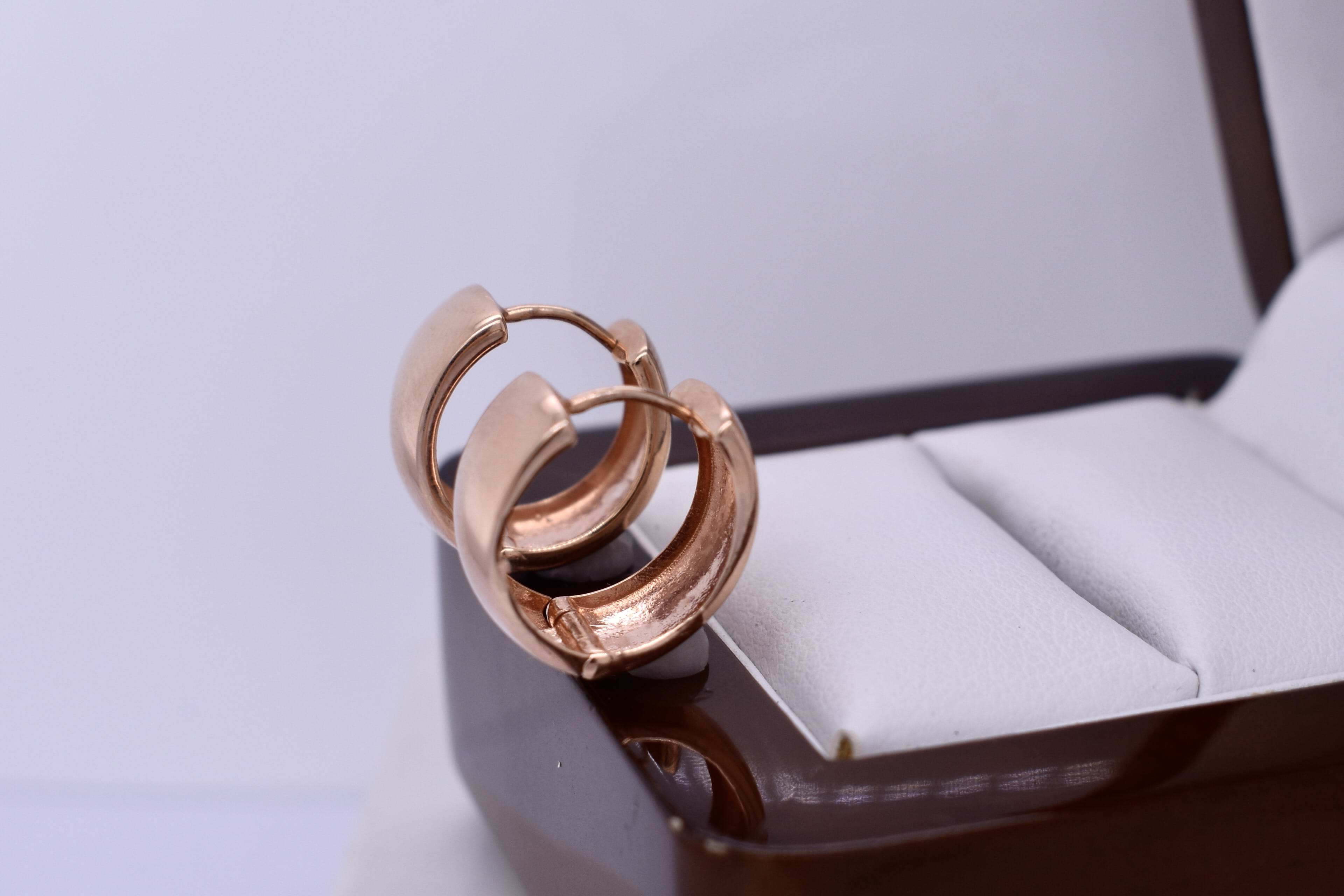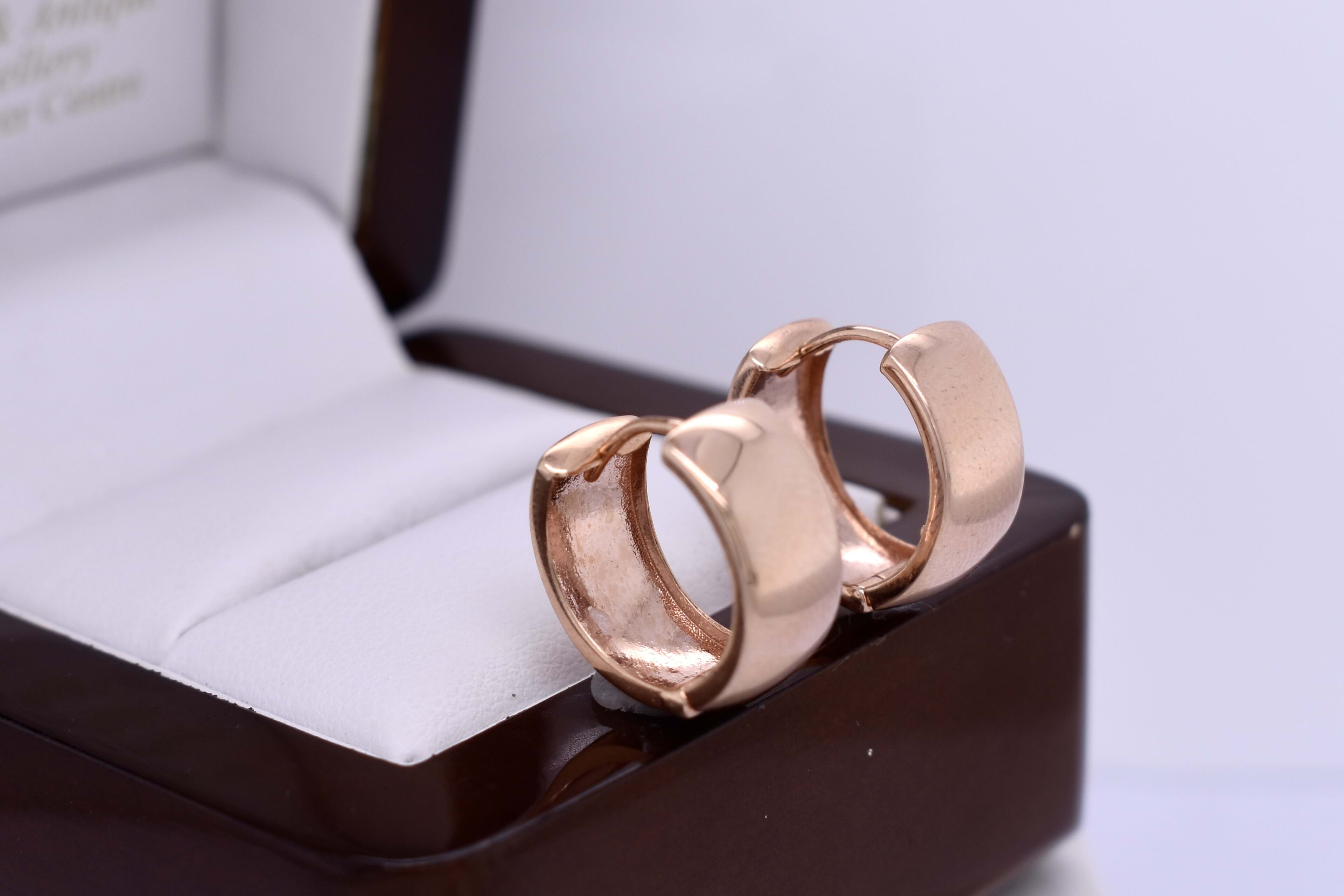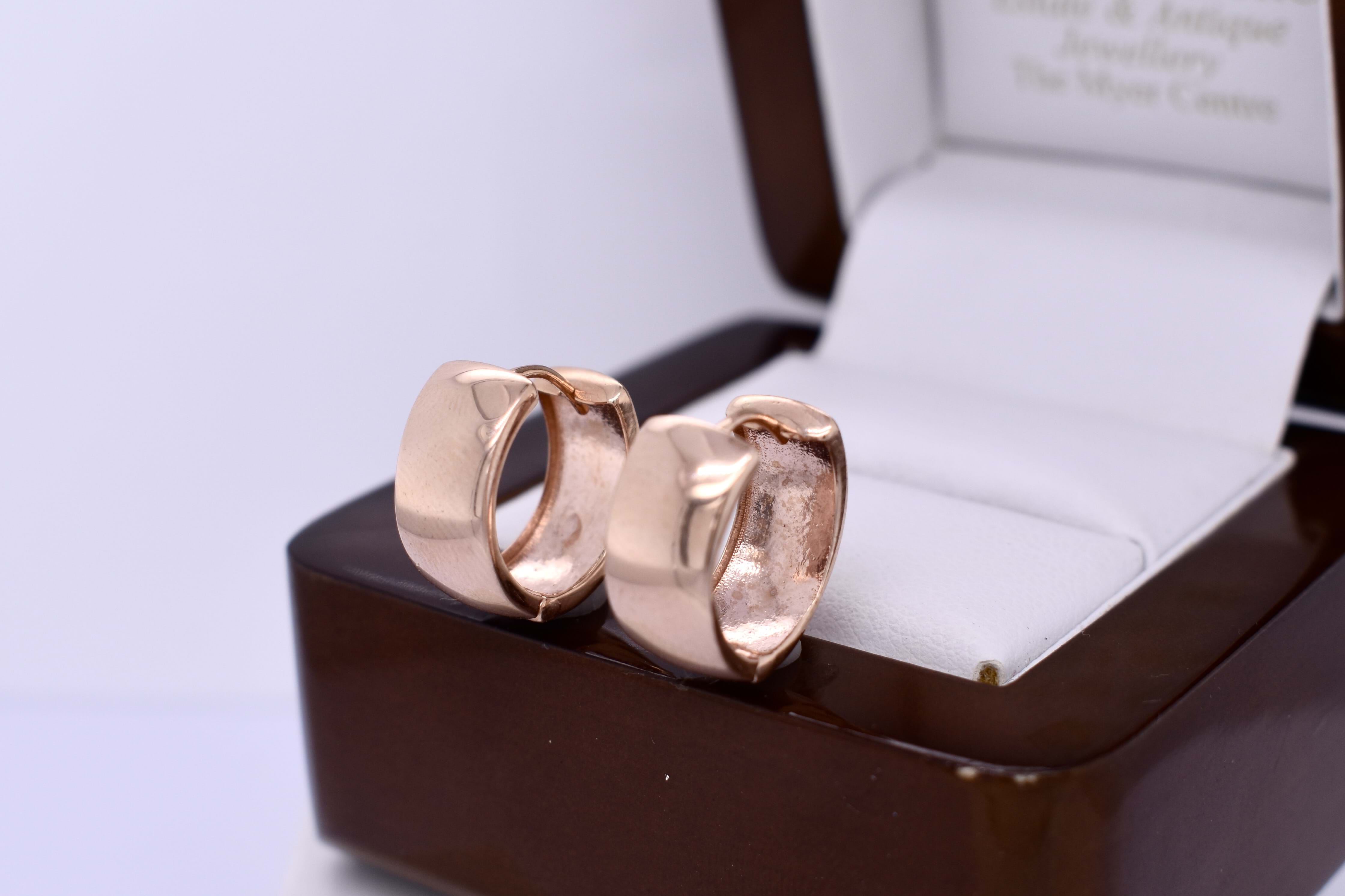 These classic 9ct rose gold huggies measure approx 16.2x15.3mm round with an internal diameter of 13mm, with a polished finish and hinge clip fittings. 3.25 grams