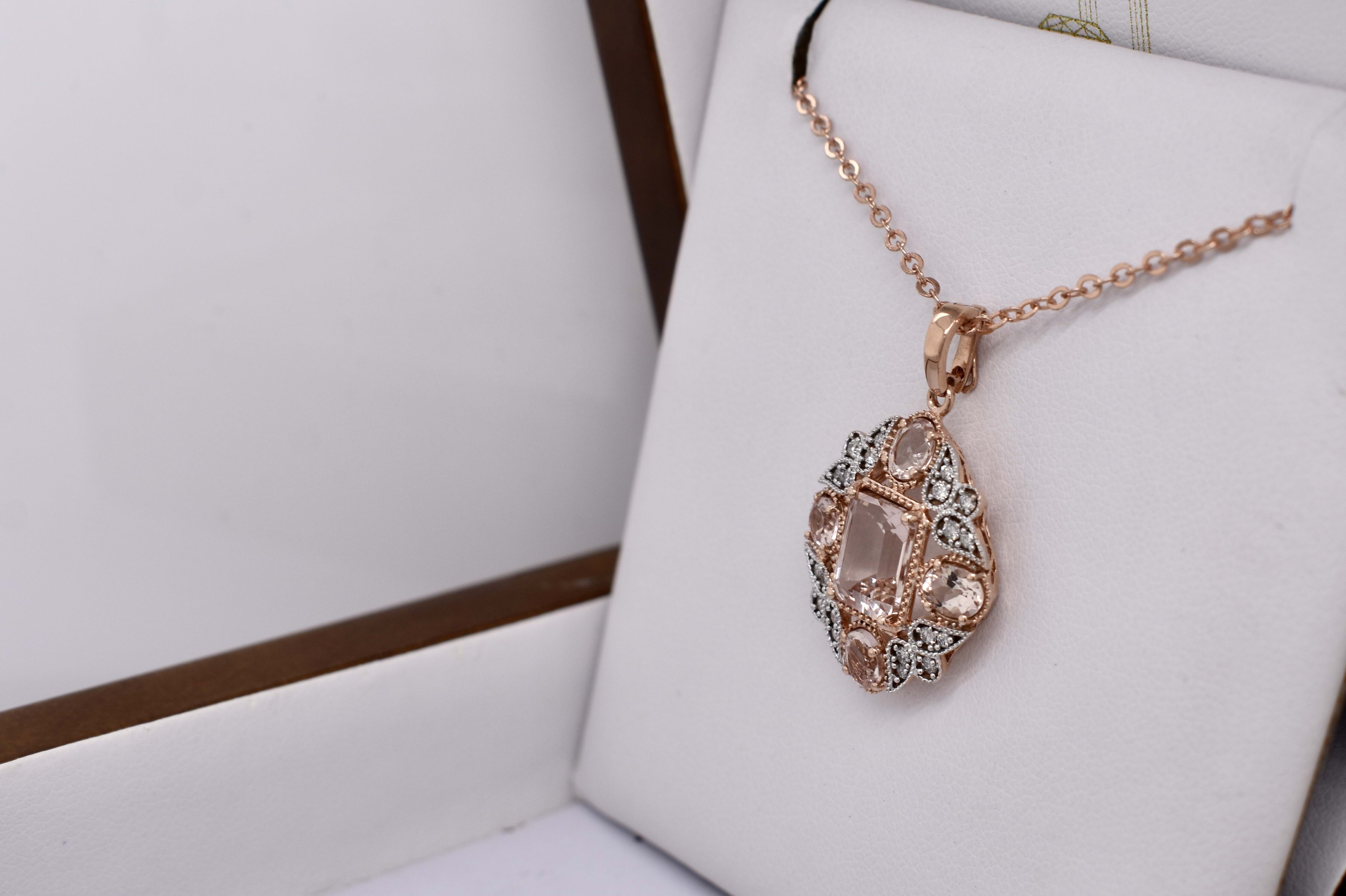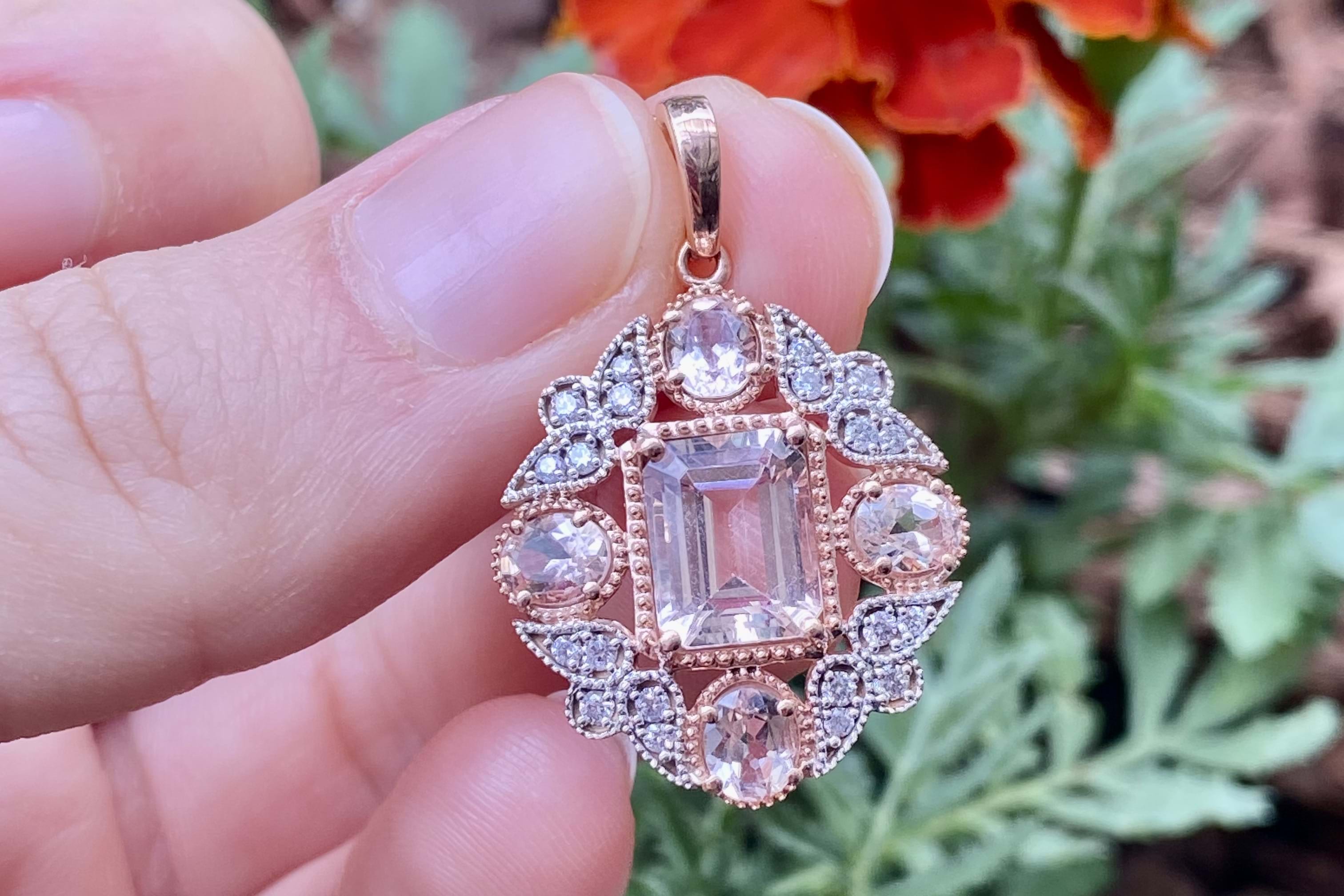 Pink and sparkly, 9ct rose gold enhancer featuring an emerald cut 2.00ct morganite in the centre, measuring 8.89X6.92X4.67mm. Four claw set with millgrain outer edge, surrounded by a cluster of 4 morganites and 20 round brilliant cut diamonds, set with a rose gold enhancer bale. Morganites measure 5.00x3.90x2.67mm, totalling 1.15ct and round brilliant cut diamonds of 1.50-1.10mm totalling 0.31ct H P1-2, with white rhodium plated sections. Chains available for separate purchase. Independent valuation supplied.