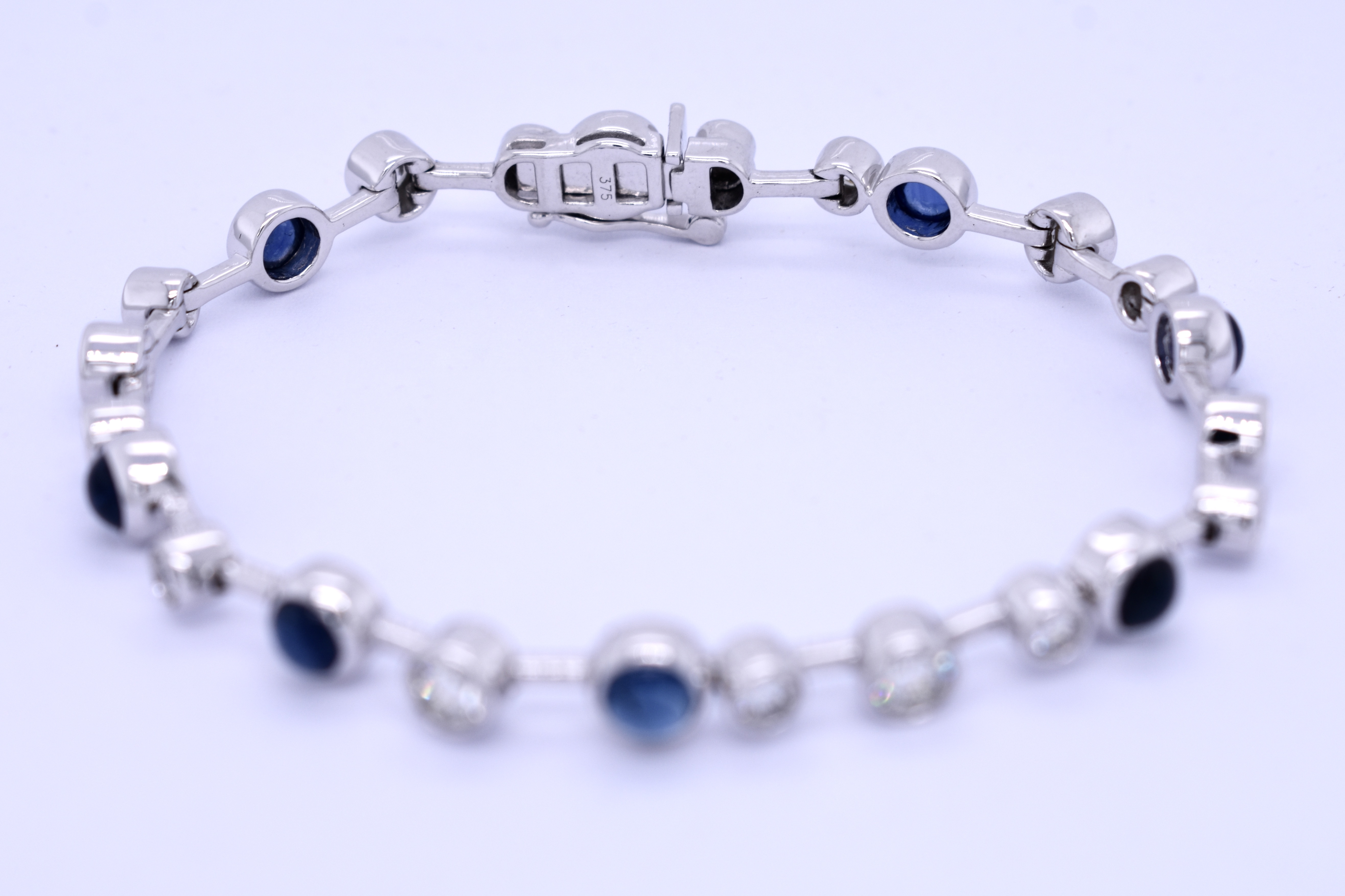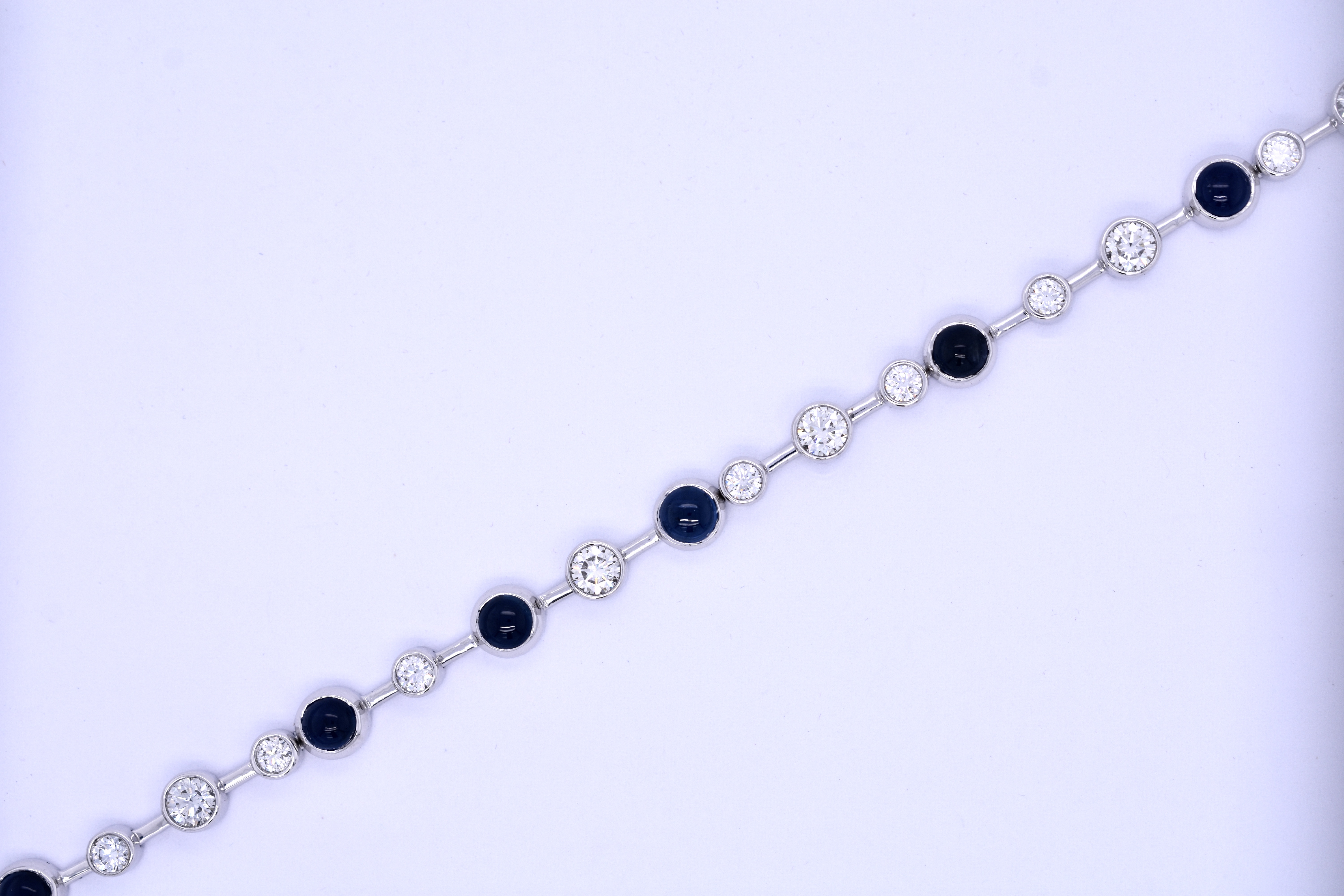 The prettiest sapphire and diamond bracelet, consisting of 8 cabochon blue round sapphires, bezel set, stationed between 16 round brilliant cut diamonds, also bezel set. Total sapphire weight of 6.74ct and a total diamond weight of 2.50ct FG SI. All in various sizes set along the 9ct white gold bracelet creating a 'bubble' design. Complete with a box clasp and figure 8 safety catch. Length of 19.5cm.
