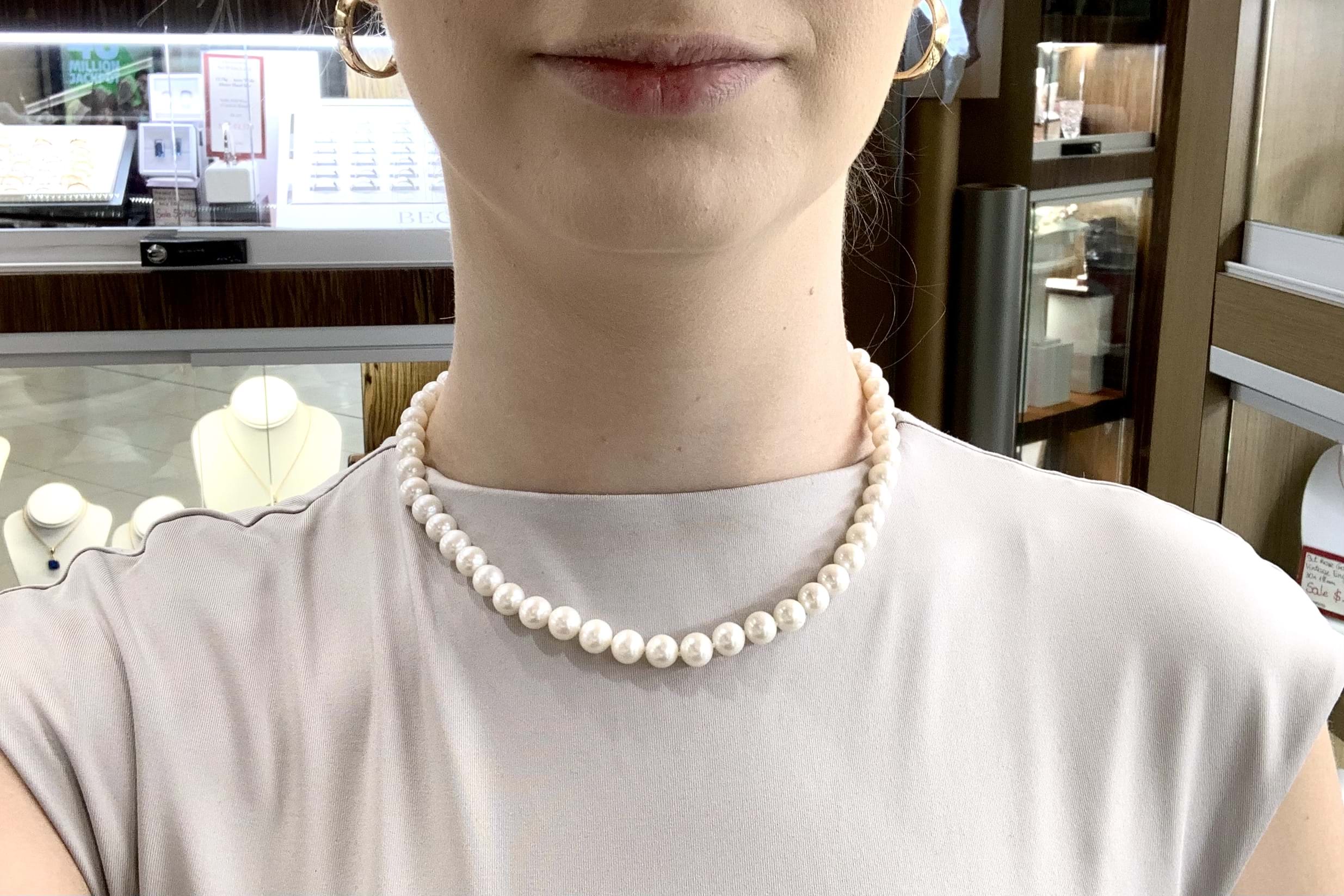 This pretty strand of white near round freshwater pearls measuring 7.5-8.5mm has been hand strung on silk with 9ct white gold ball clasp. Length is 45cm.