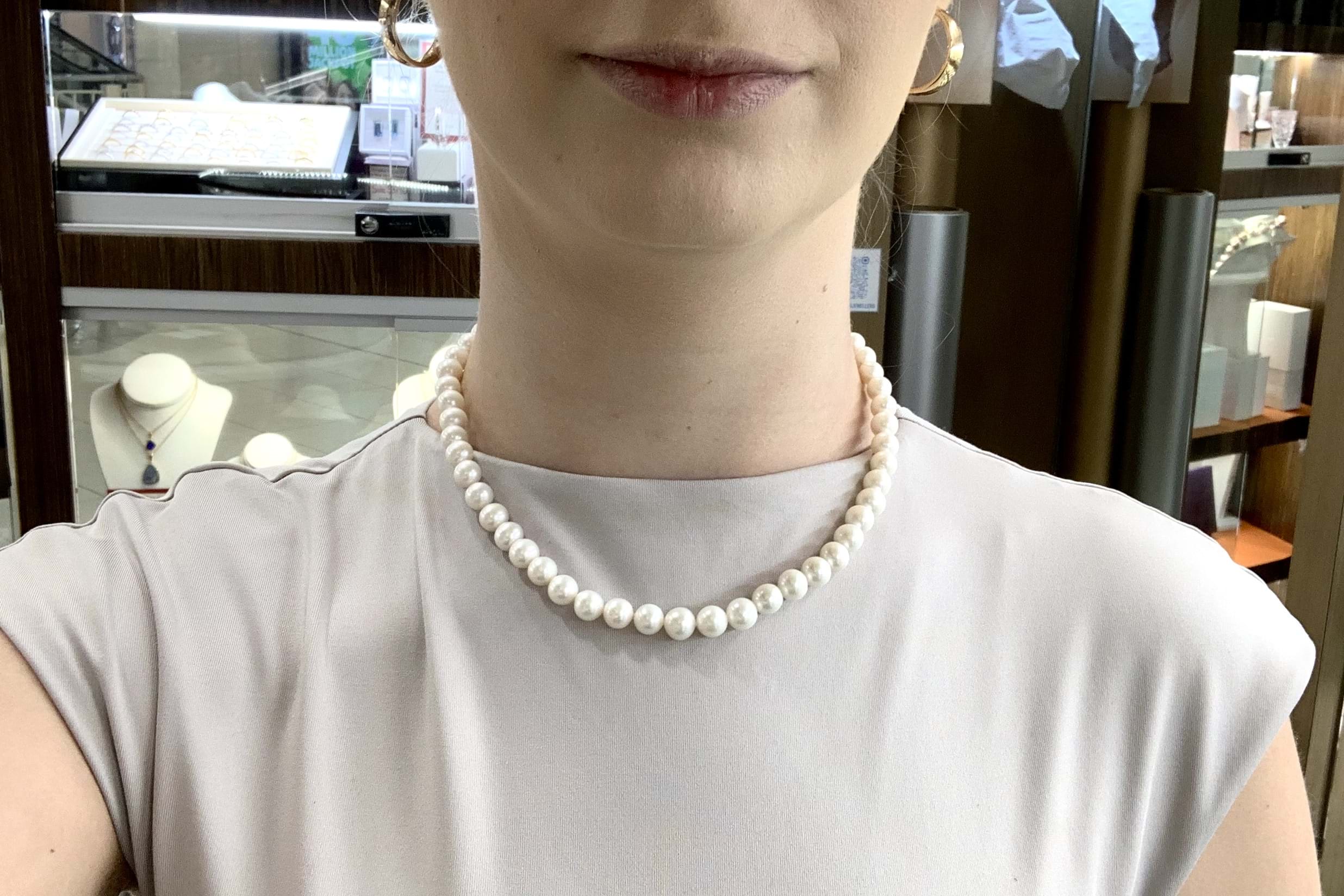 This pretty strand of white near round freshwater pearls measuring 7.5-8.5mm has been hand strung on silk with 9ct white gold brushed finish ball clasp. Length is 45cm.