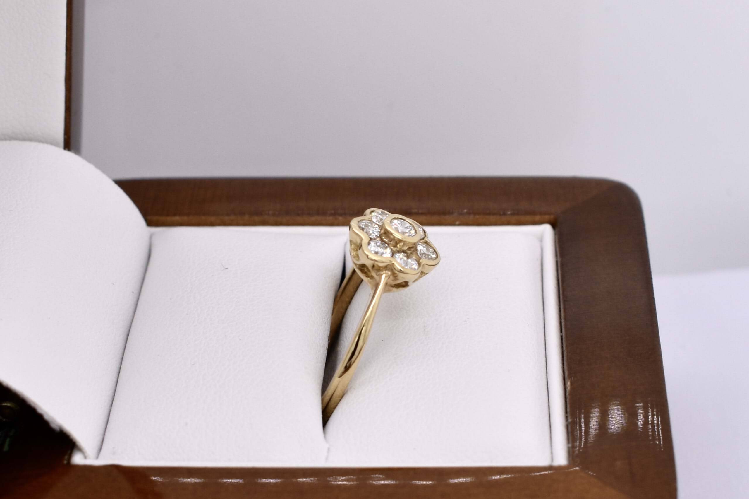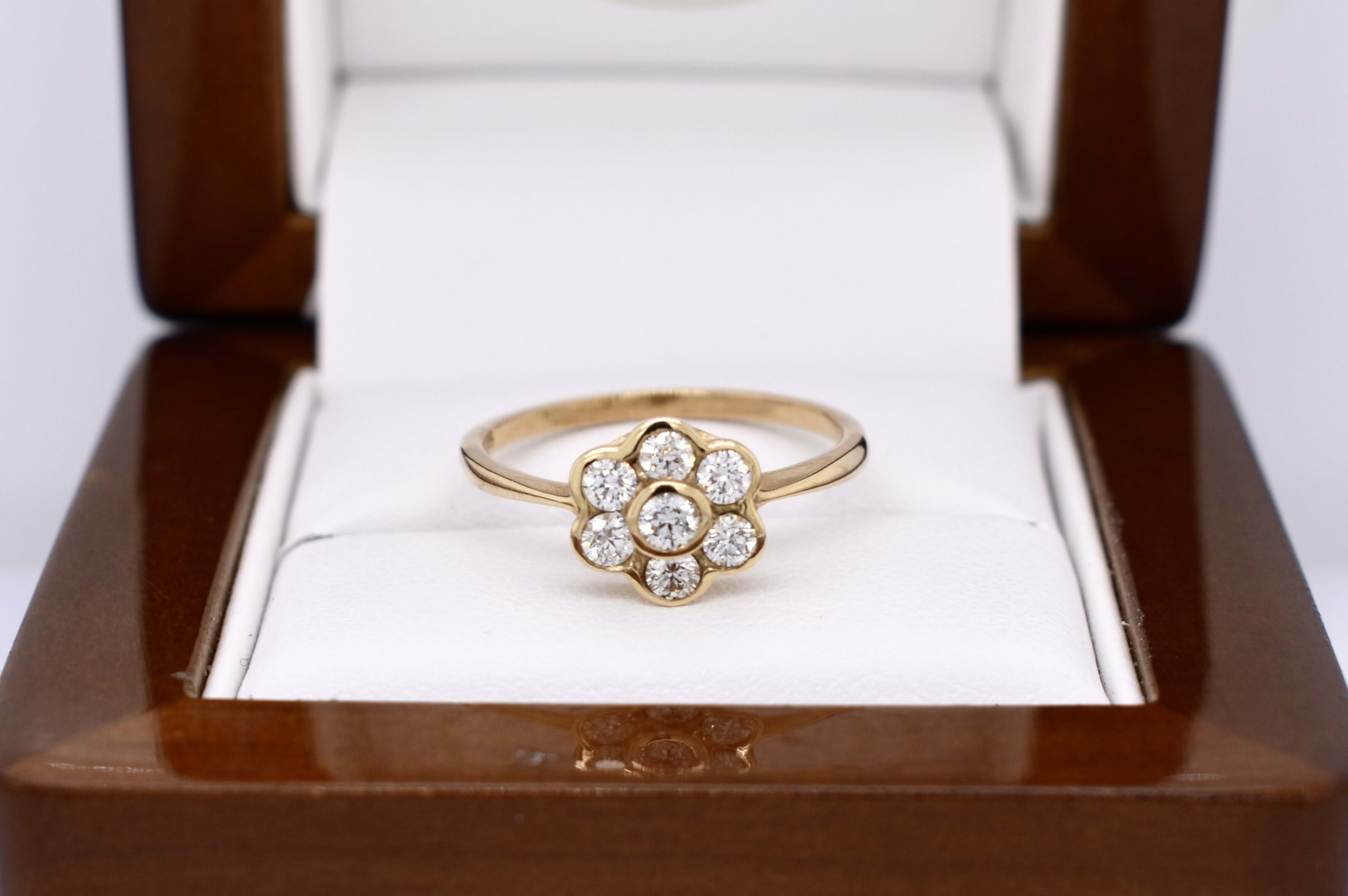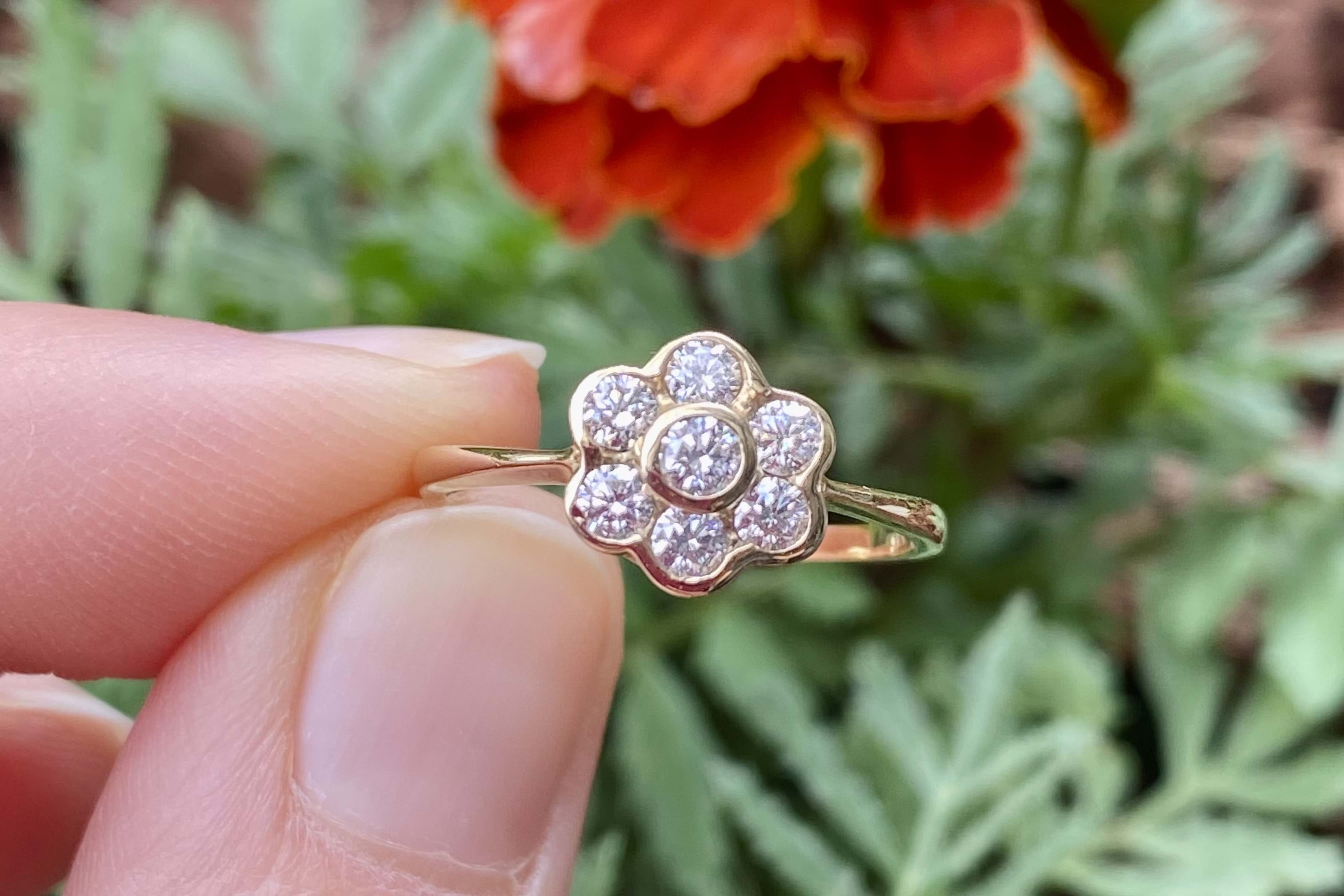 The sweetest 9ct yellow gold daisy cluster ring, featuring 7 round brilliant cut diamonds, measuring 2.80mm-2.60mm round. The diamonds are bezel set in a flower shape on a 1.50mm wide plain gold band. Total diamond weight 0.44ct G SI. Finger size N+. Independent valuation supplied.