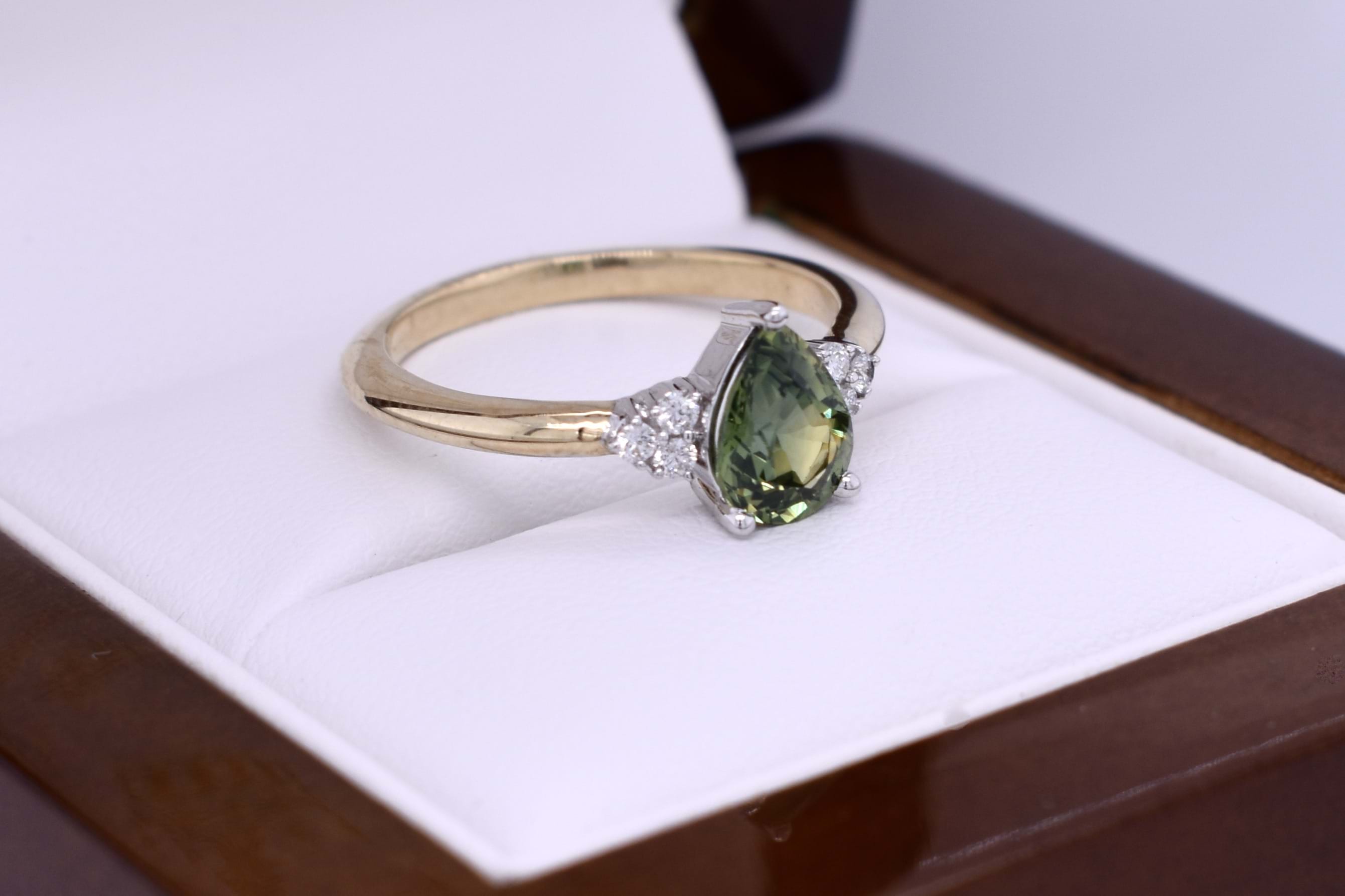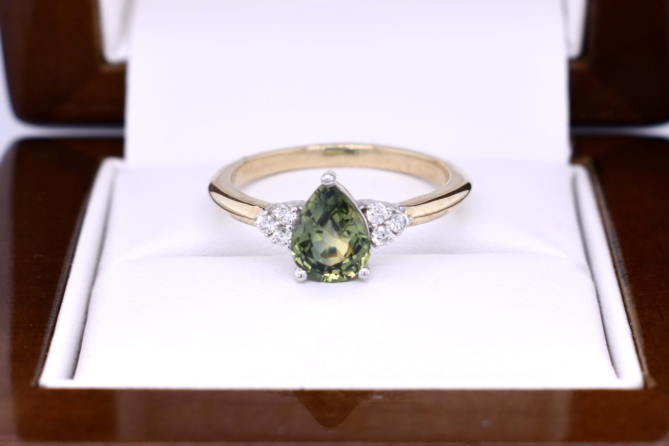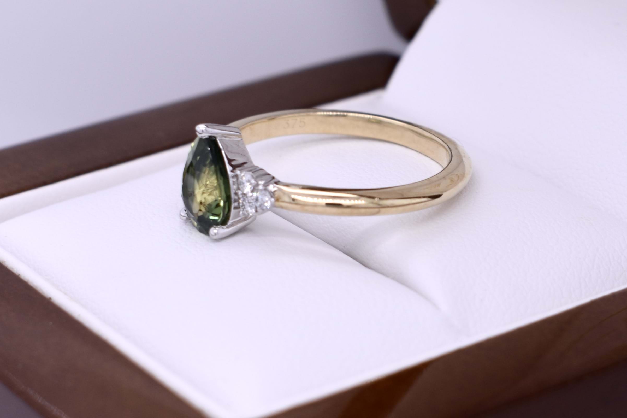 9ct Yellow Gold 1.32ct Pear Shaped Aus Green Parti Sapphire & 0.08ct Diamond Ring (M+)