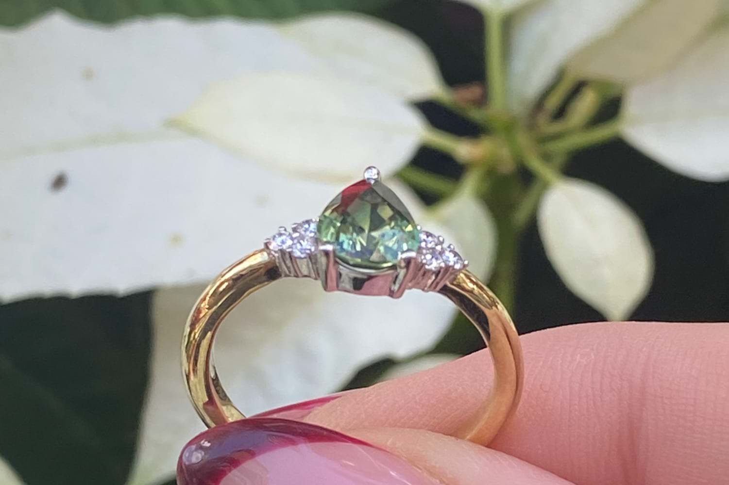 Unique and pretty, this 9ct yellow gold ring features a 1.32ct pear shaped Australian green parti sapphire, two claw and cap set. Further set with a shimmering triangular formation made up of three round brilliant cut diamonds either side, total of 6 diamonds equalling 0.08ct GH SI, also claw set. Ring is low sitting on the finger. and has no under rail. Finger size M.