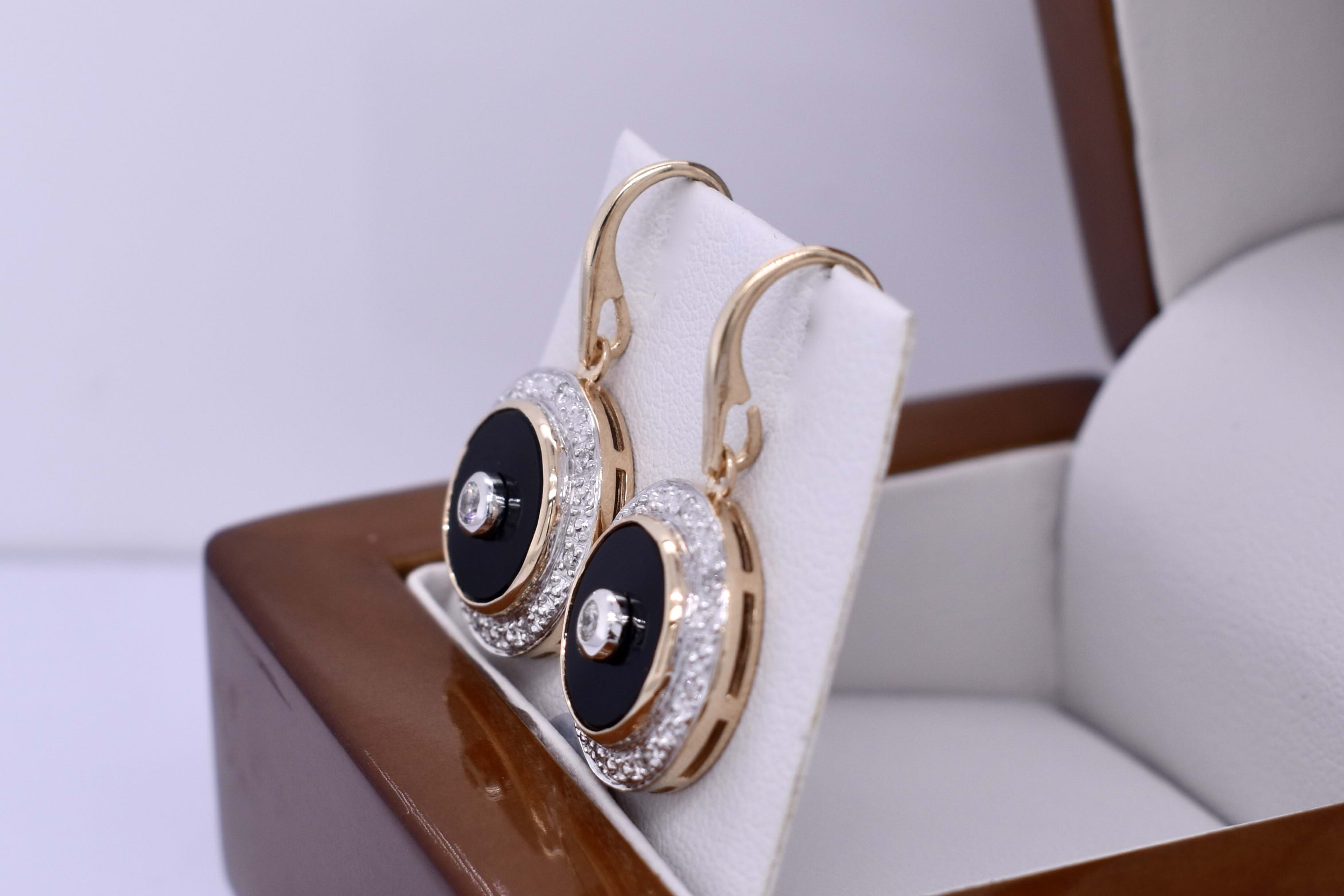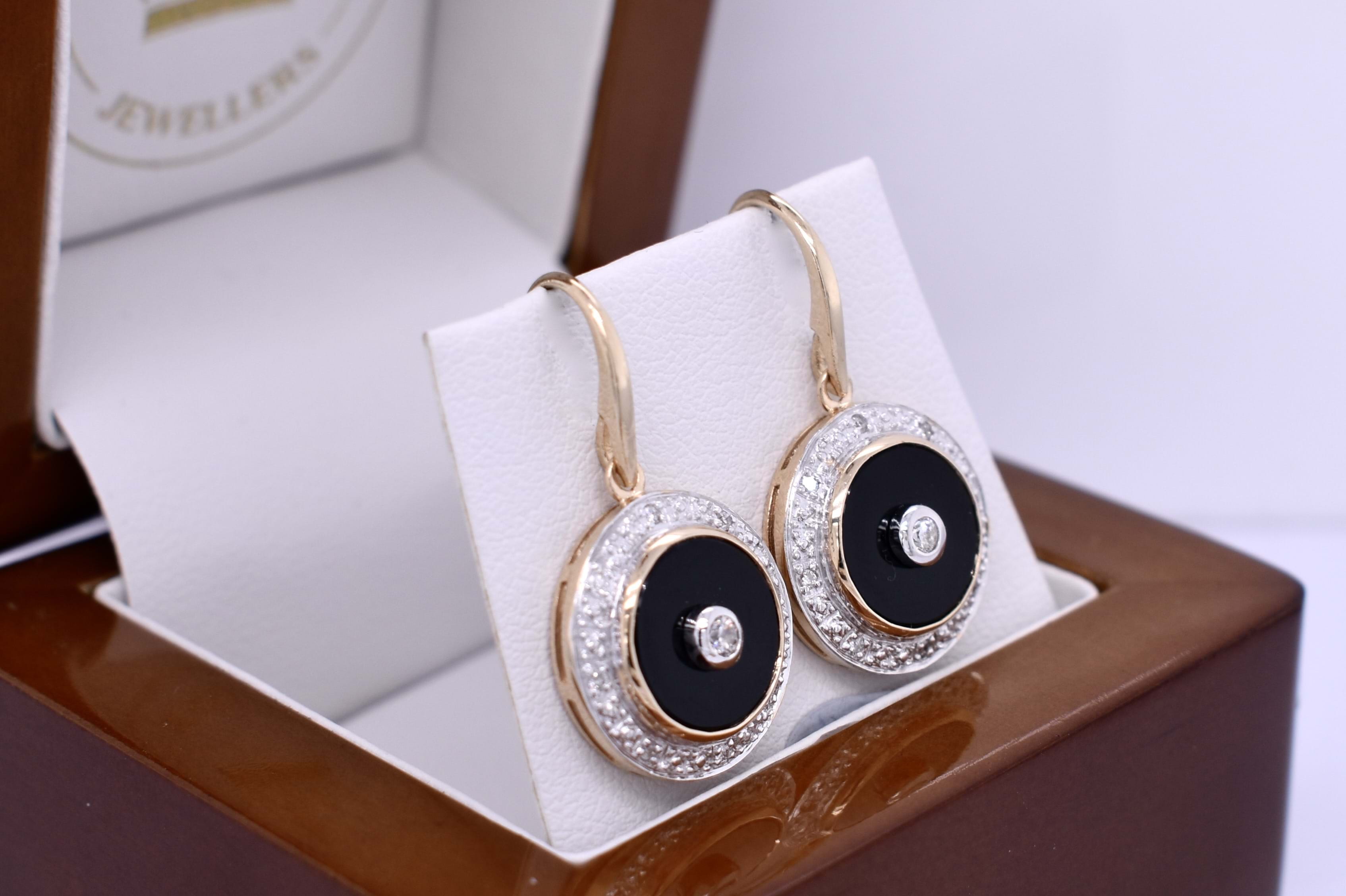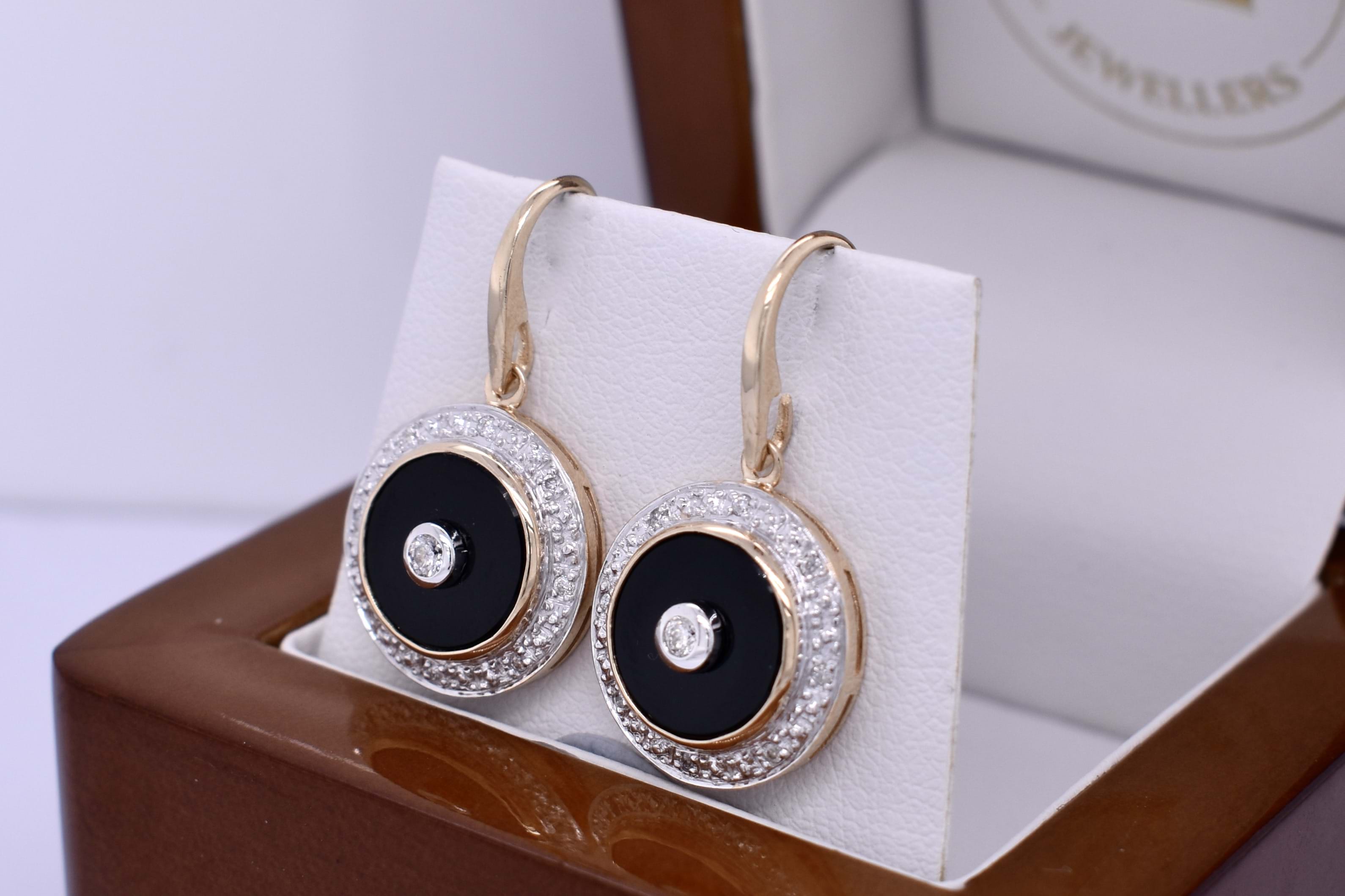9ct Yellow Gold 10mm Onyx & 0.06ct Diamond Centre with 0.06ct Diamond Halo Drops