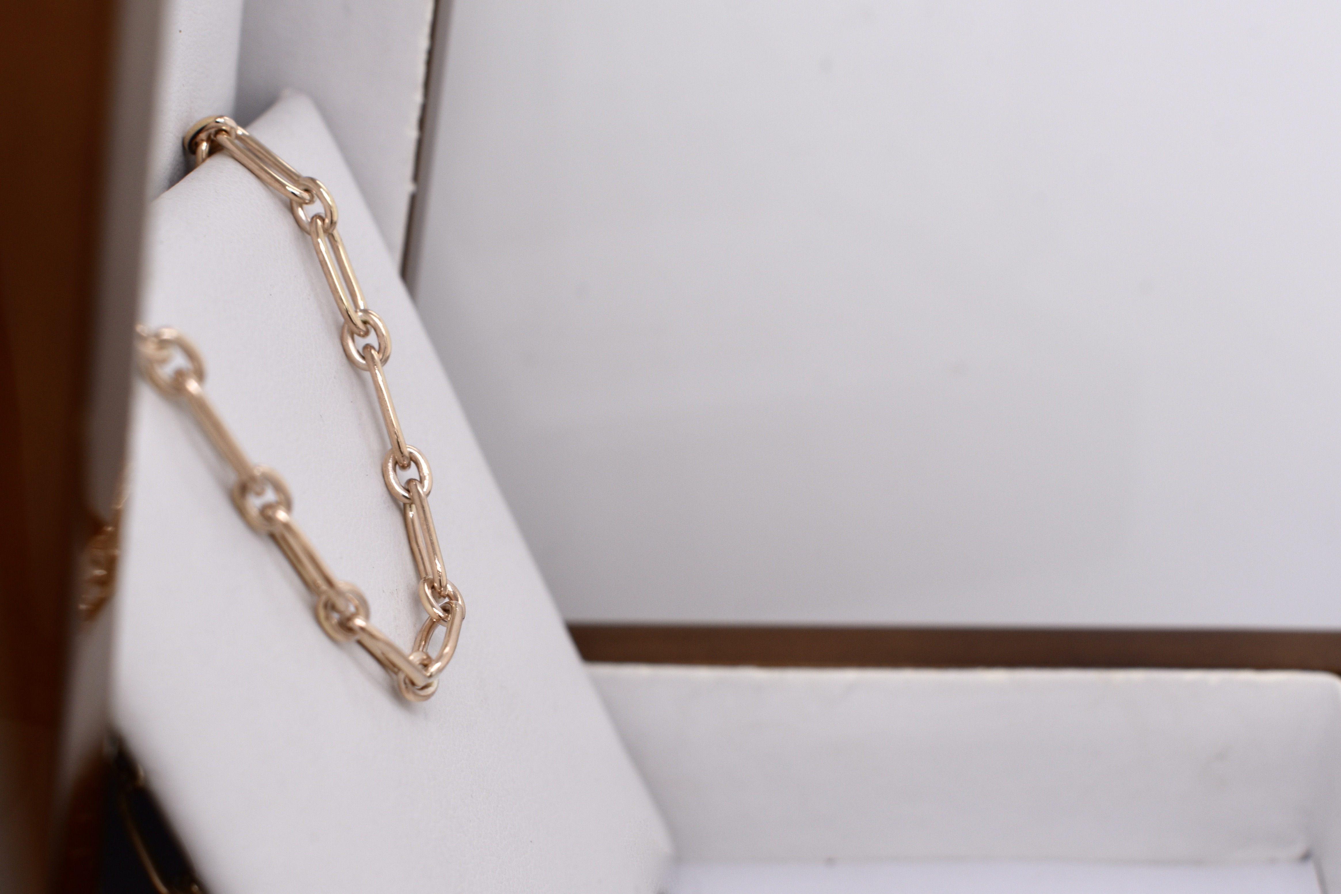 This stunning chain was handmade by our goldsmith in 9ct yellow gold in this pretty 1+1 (1 short, 1 long) cable link. It has two jump rings on the ends, offering great versatility for different clasps, carabiners and brooches. Chain measures 43cm long and weighs 11.5grams. Carabiners are available for separate purchase.