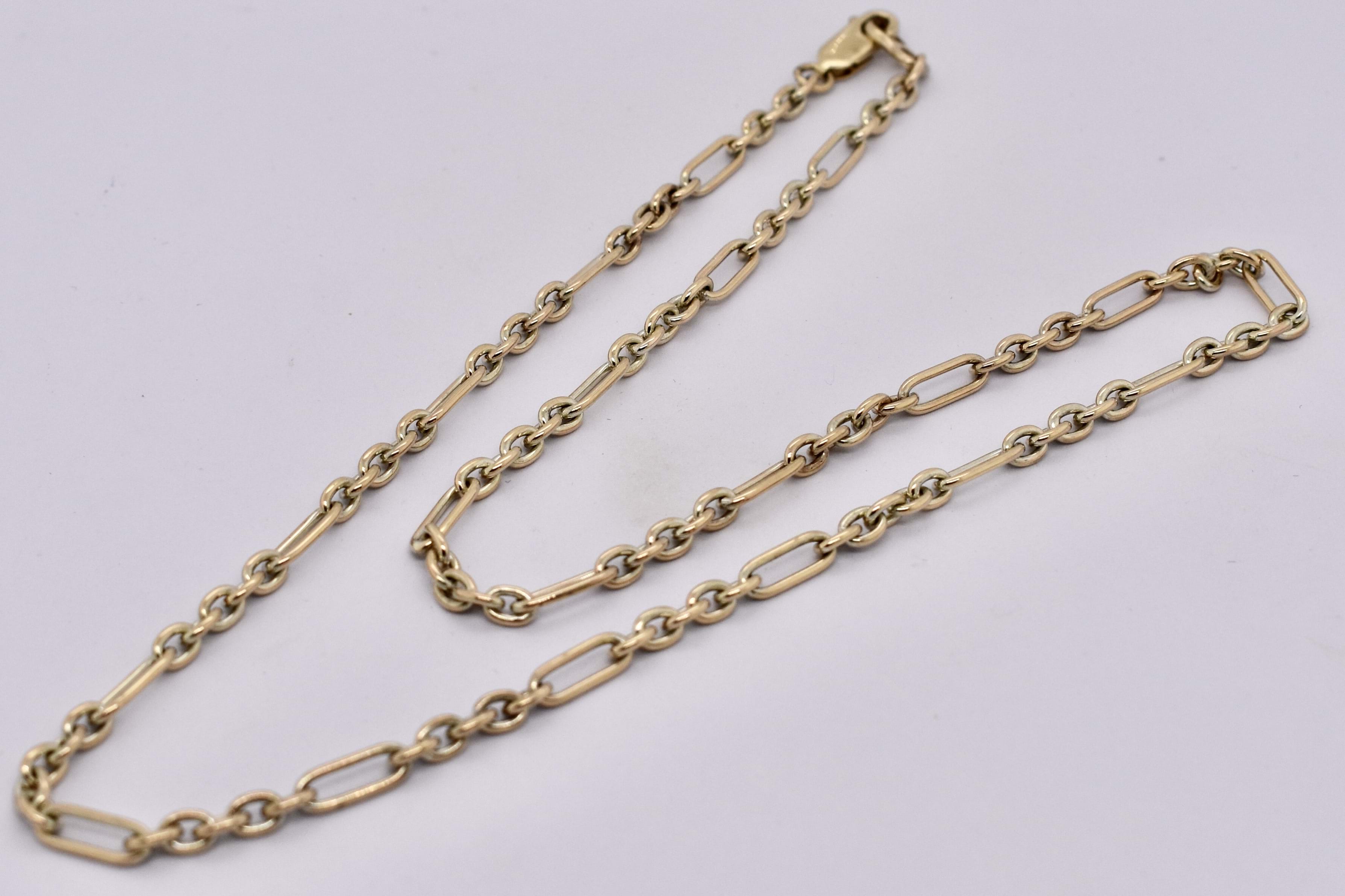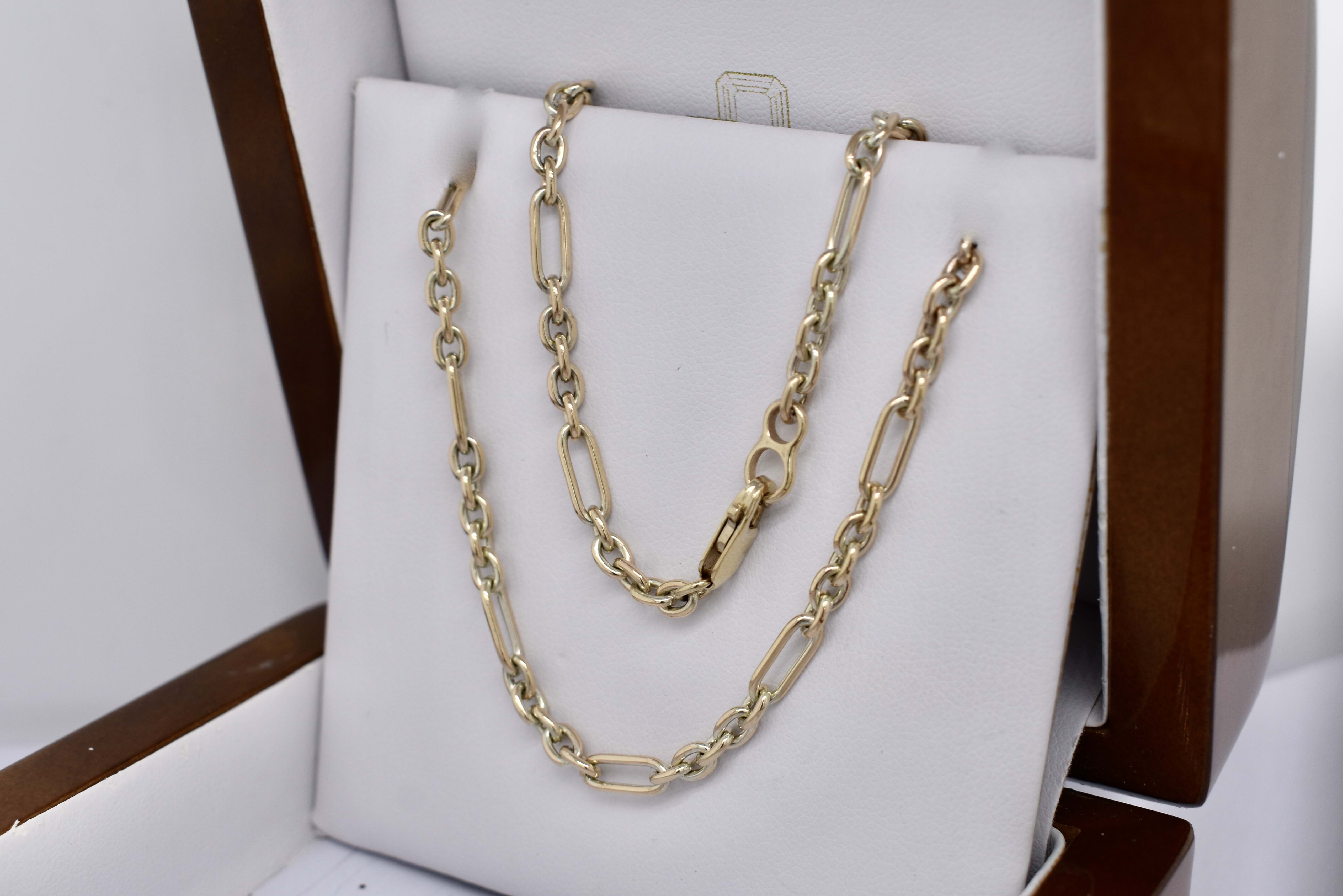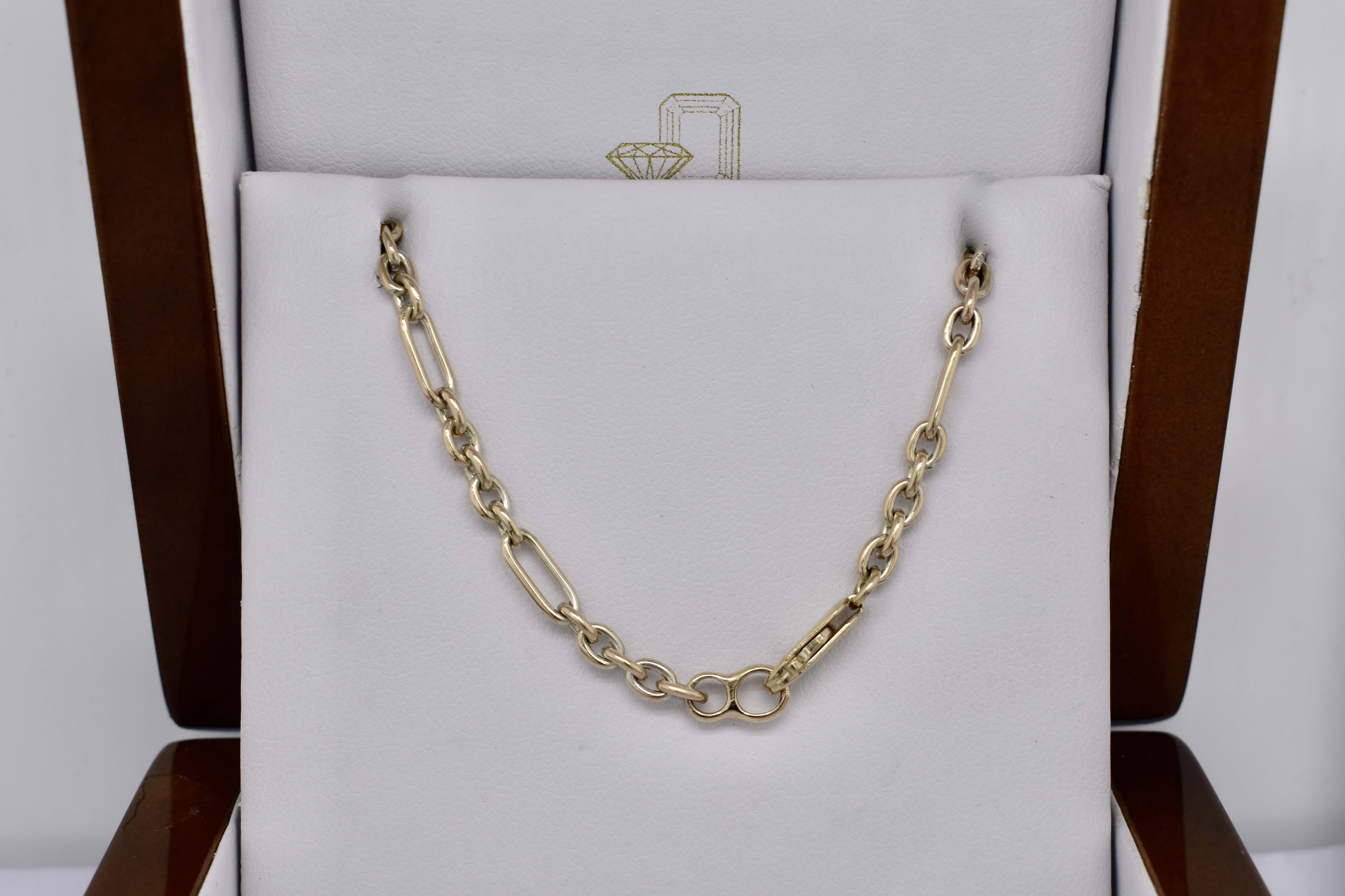Hand crafted by our amazing goldsmith, this 9ct yellow gold 5/1 (5 short, 1 long) cable link chain measures 46.5cm long and is completed with a 11mm parrot clasp. Weighs 13.82grams.